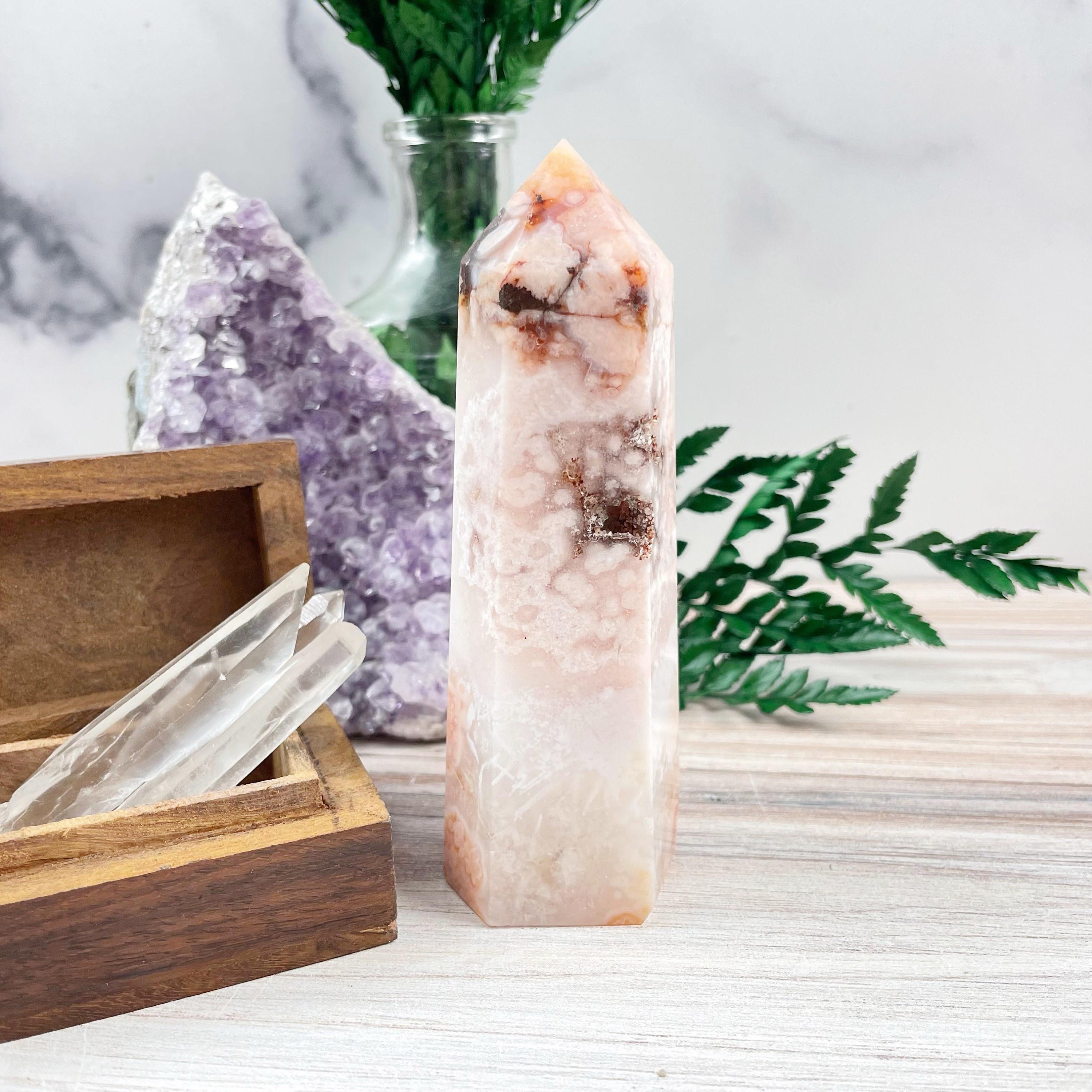 This listing is for one carnelian flower agate tower. This tower is made from a rare combination of two stones. The carnelian and flower agate naturally have grown together to create this beautiful pastel orange and pink stone with flowers.