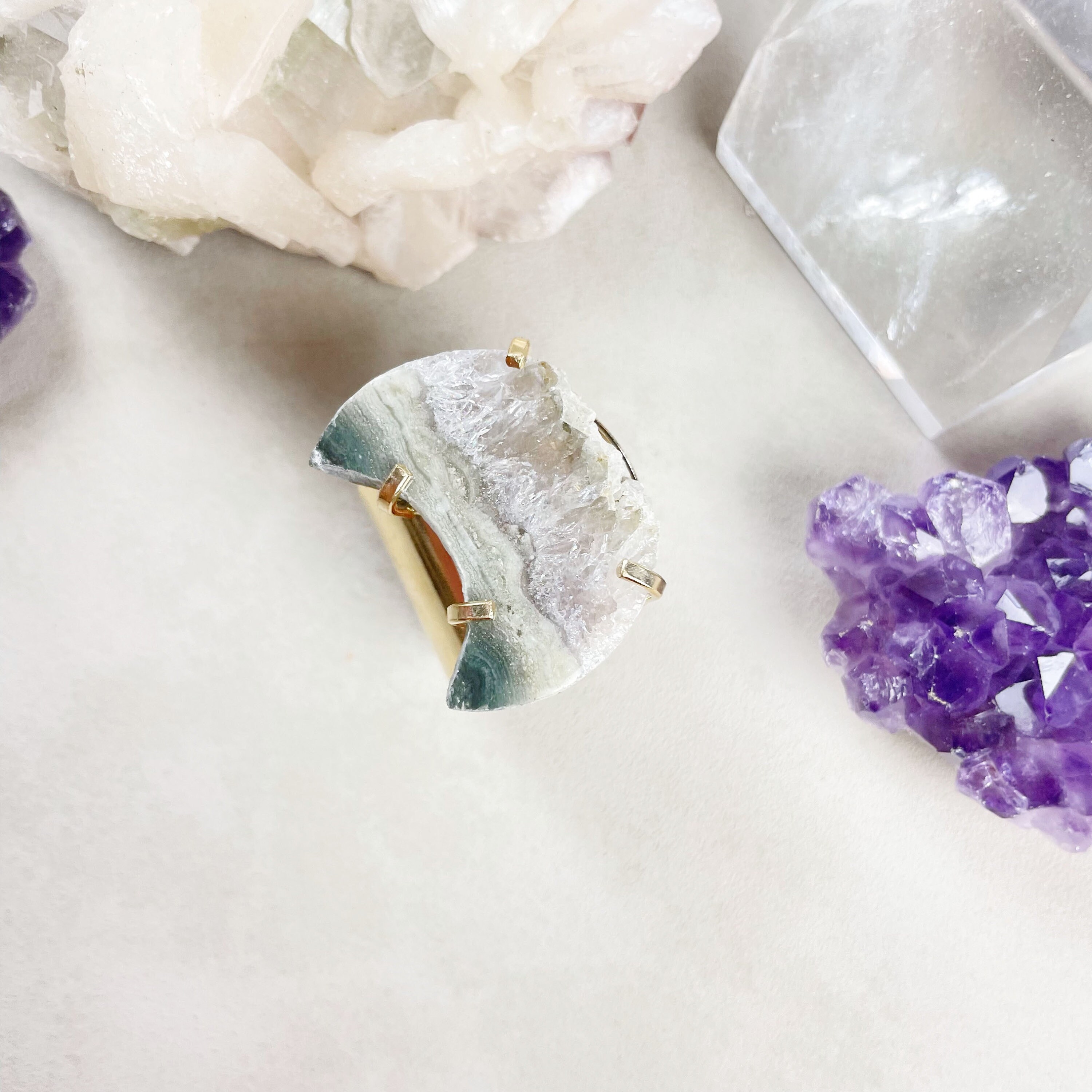 This ring is made from a gold plated brass cuff band. The band has four prongs that hold the stone on the front. The prongs hold a natural amethyst slice. The amethyst slice is cut into a crescent moon shape