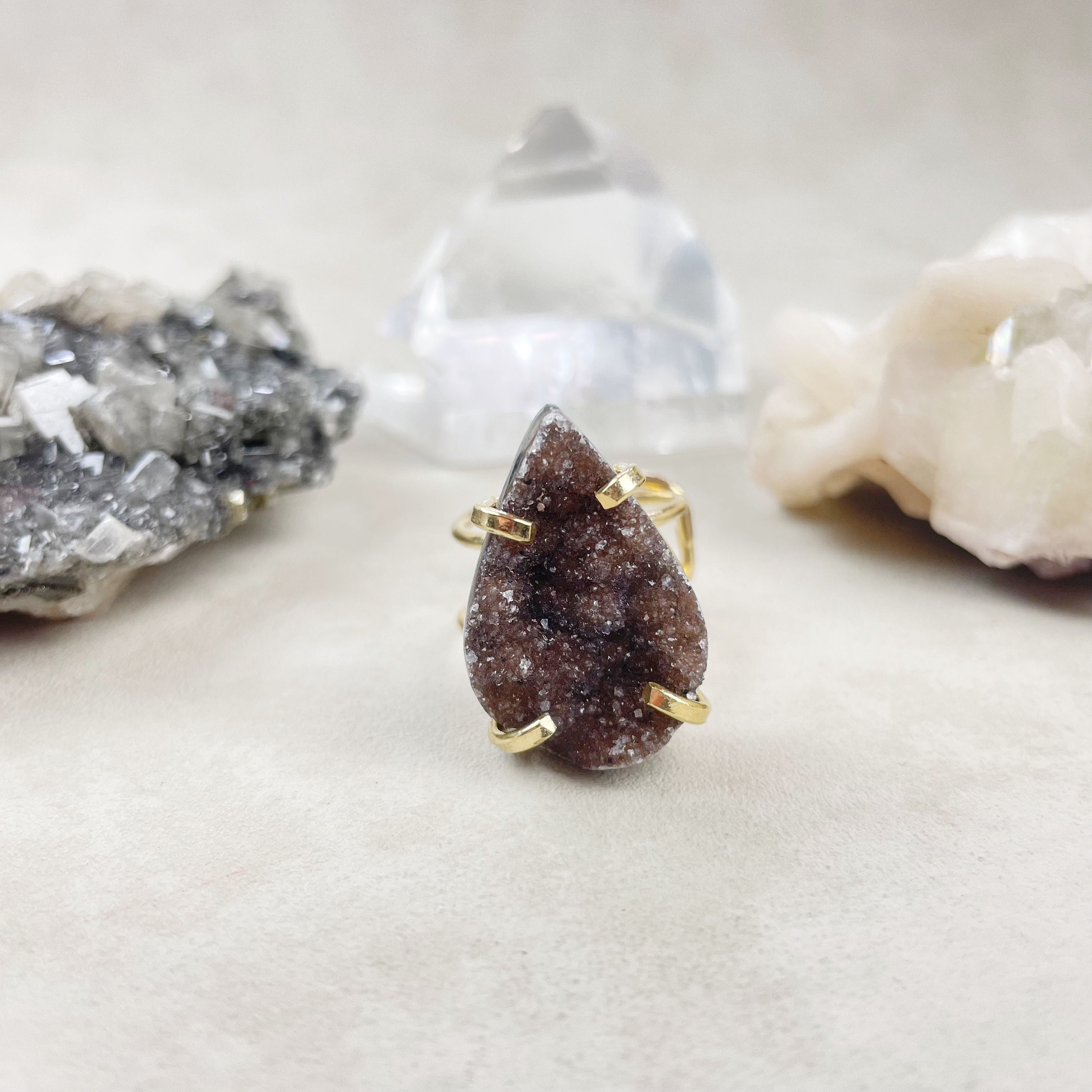 This ring is made from a gold plated brass wire band. The band has four prongs that hold the stone on the front. The prongs hold a natural druzy stone which is cut into a teardrop shape.