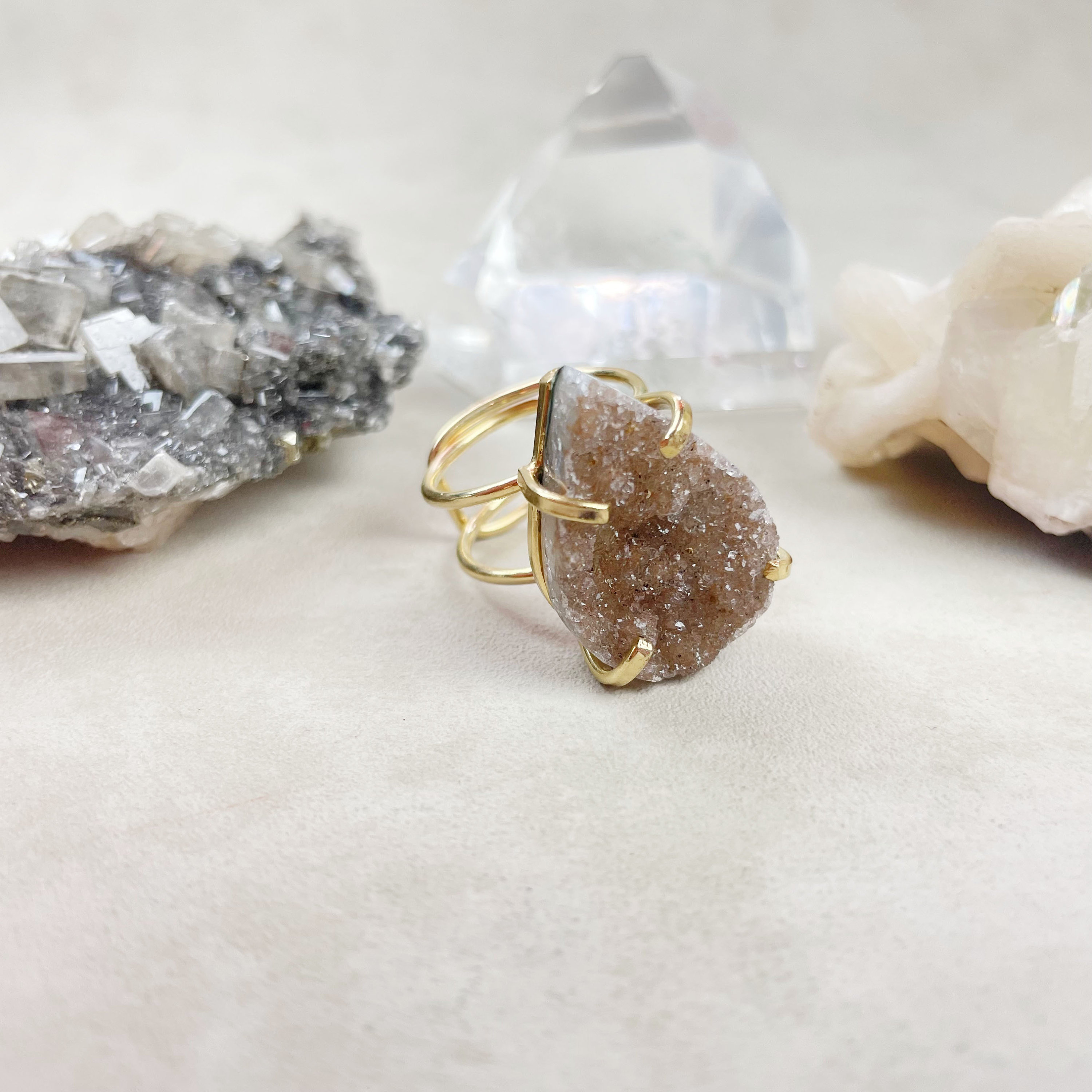 This ring is made from a gold plated brass wire band. The band has four prongs that hold the stone on the front. The prongs hold a natural druzy stone which is cut into a teardrop shape.