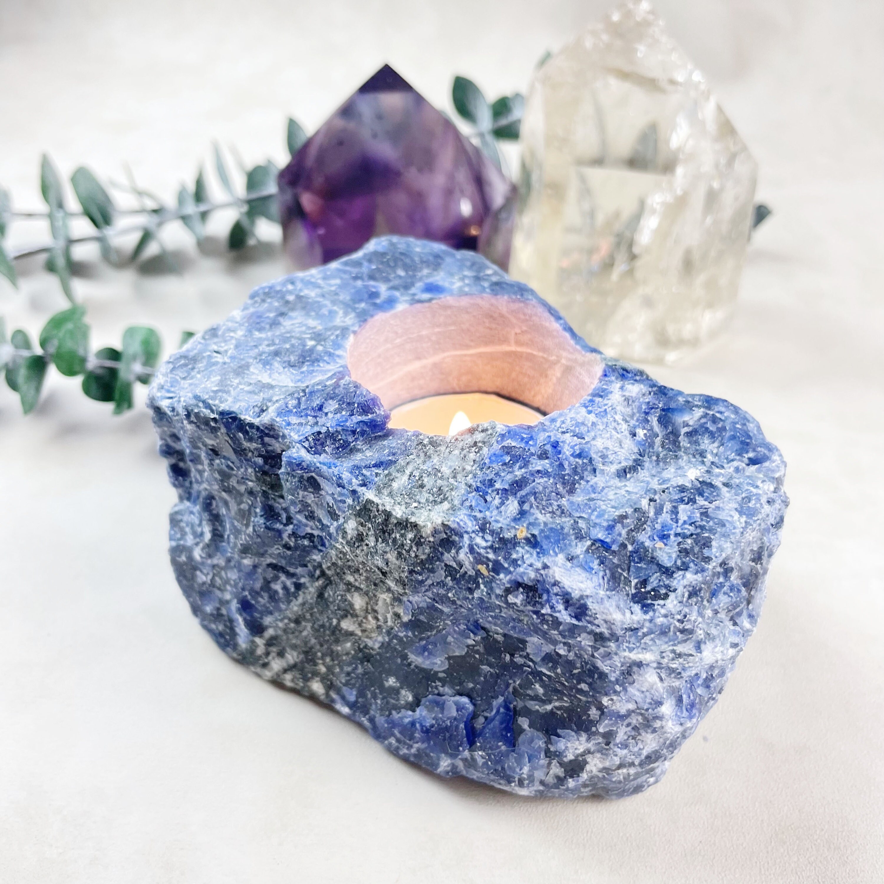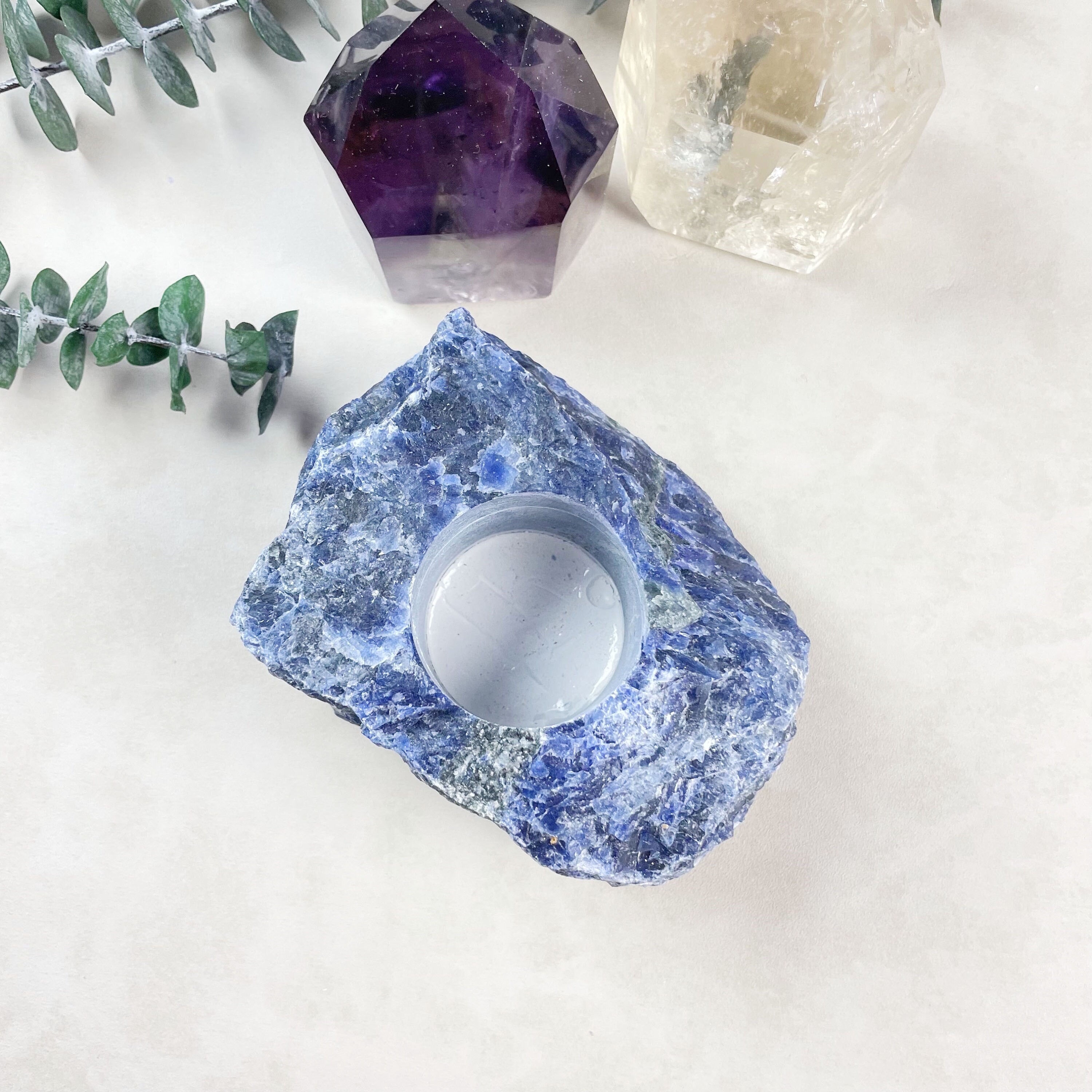 This listing is for one candle holder which is made from a solid piece of sodalite crystal. The candle holder is one big chunk of crystal which has natural colors and inclusions.