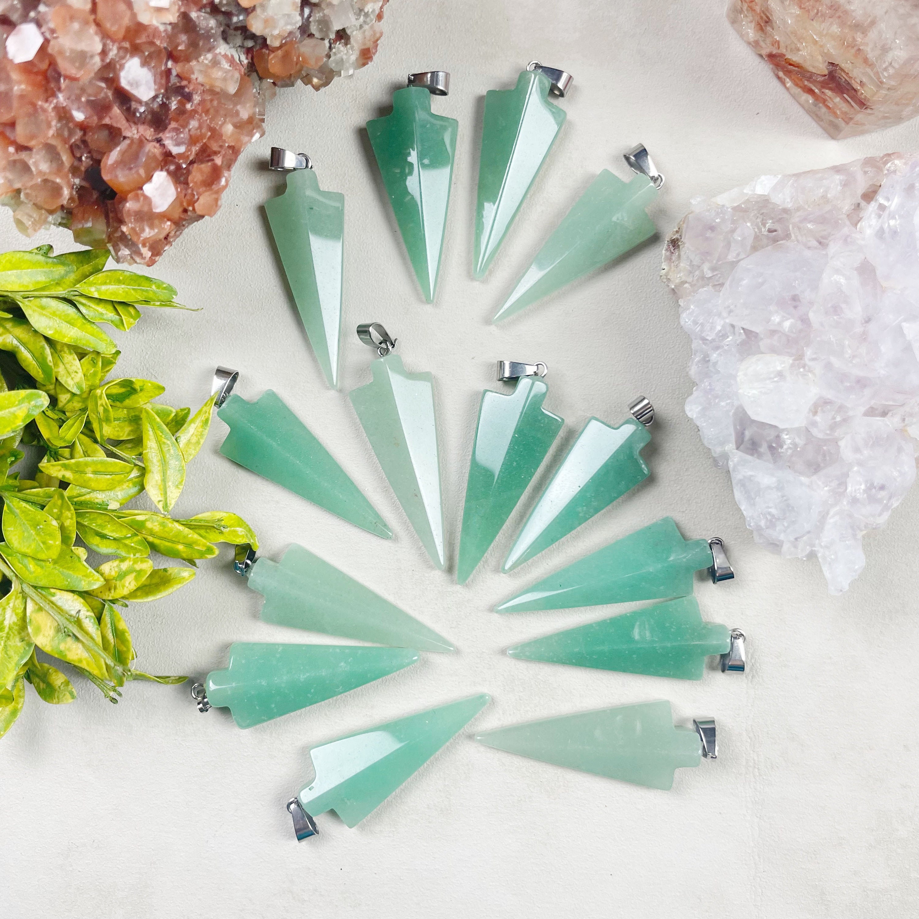 This necklace is made from a green aventurine stone which has been cut into a arrowhead pendant. The arrowhead has a silver steel bail. The pendant hangs from a stainless steel cable chain.