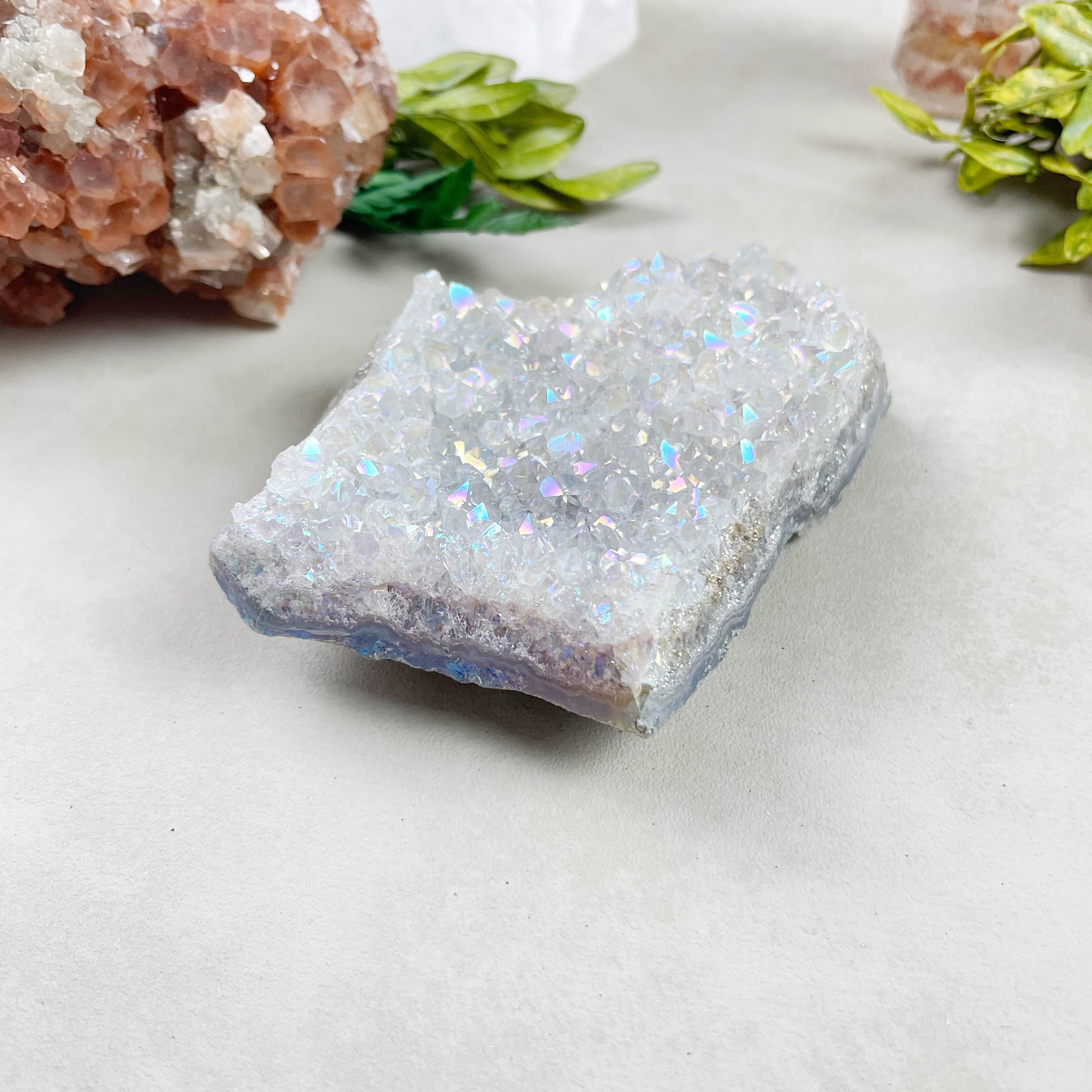 This listing is for one natural aura cluster. The cluster is a natural pale amethyst with beautiful druzy and clusters. The amethyst cluster is coated with titanium to create an aura coating. The aura gives the stone beautiful rainbow iridescent coloring.