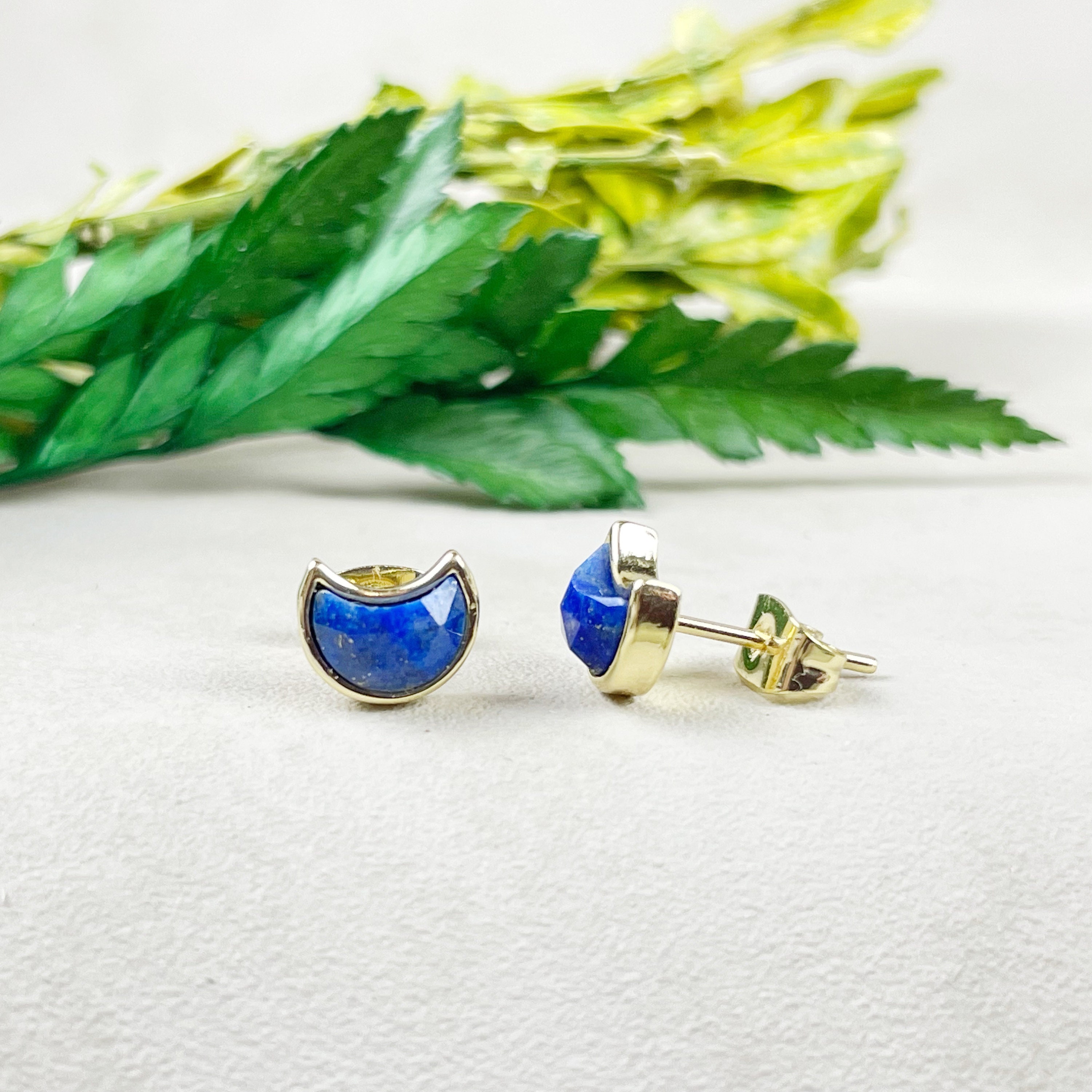These earrings are made from natural lapis lazuli stone which have been cut into faceted crescent moon shapes. The stones are set inside gold plated bezels.