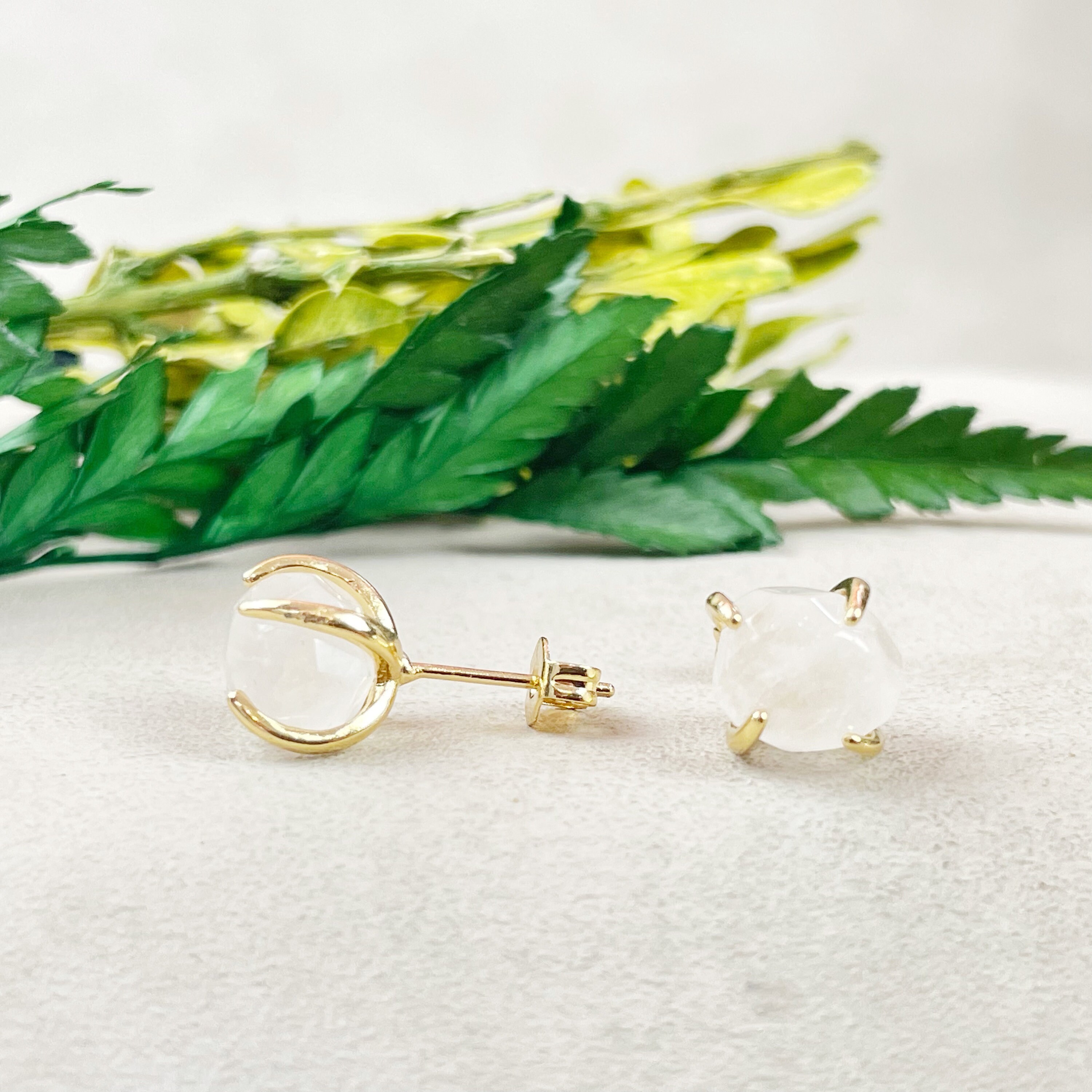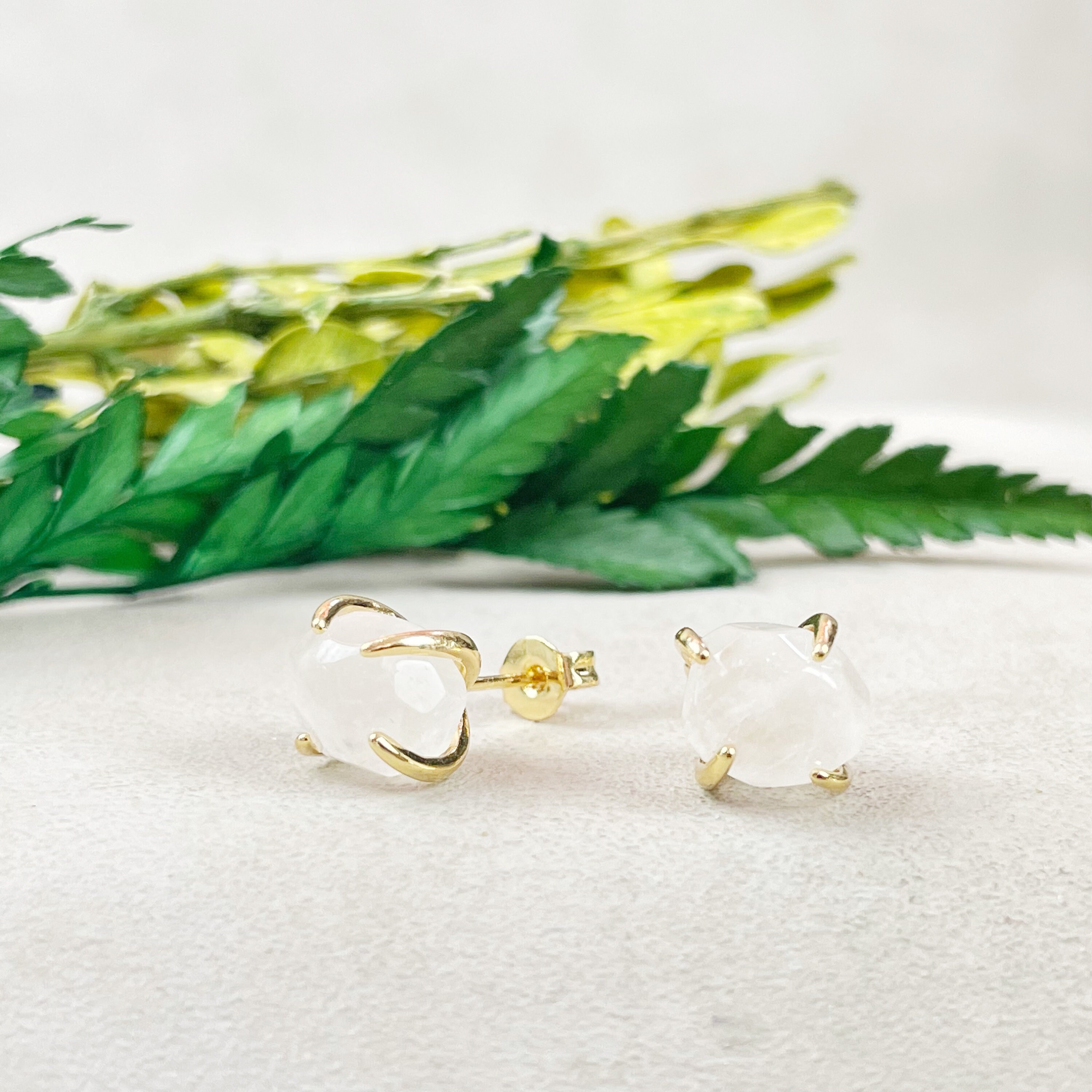 These rings are made from natural clear quartz which are polished into a nugget shape. The stones are set inside four prong studs posts. The earrings are gold plated.