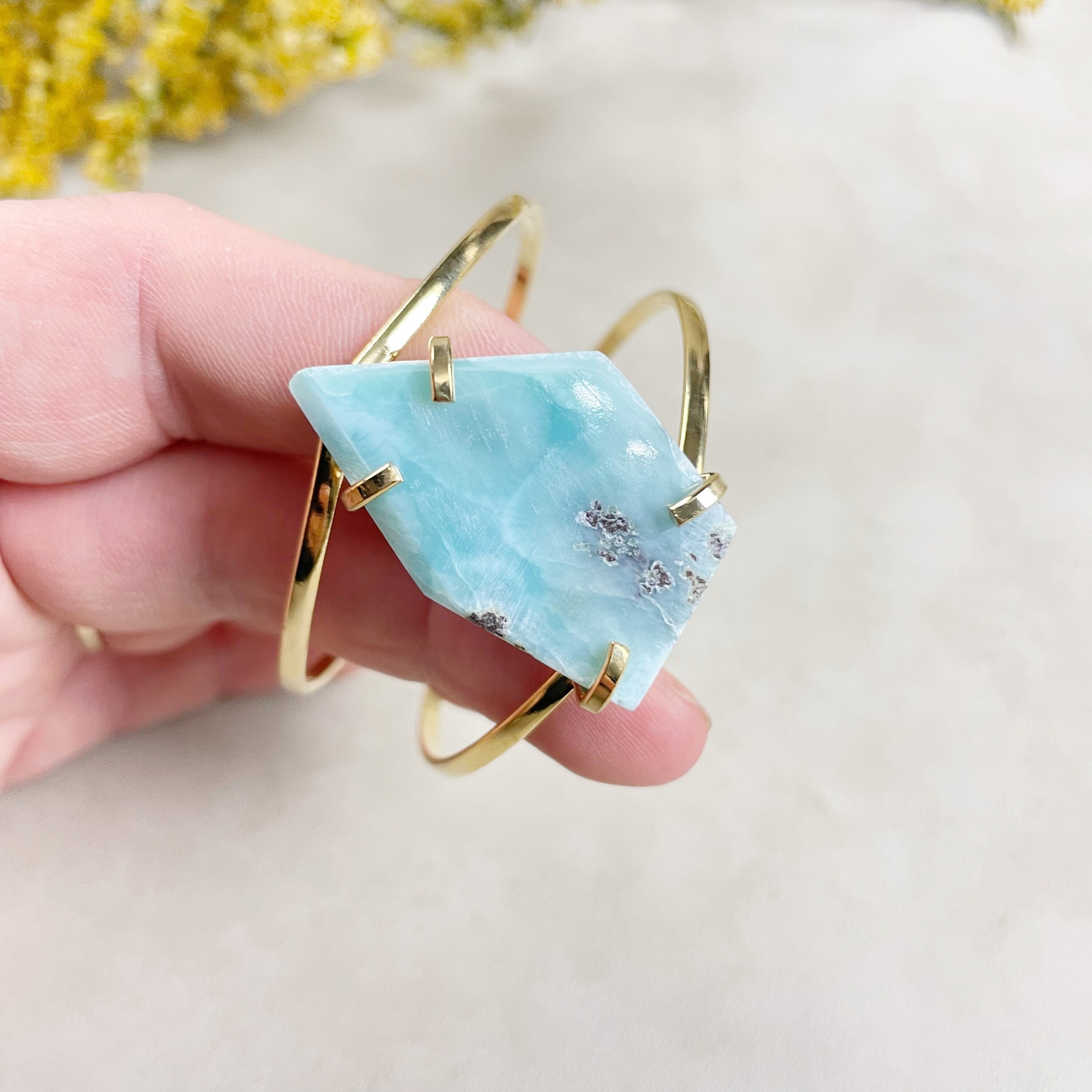 This listing is for one arc cuff bracelet with a polished larimar stone. The larimar is cut into a freeform shape. The stone is set on top of the arc cuff with four prongs.