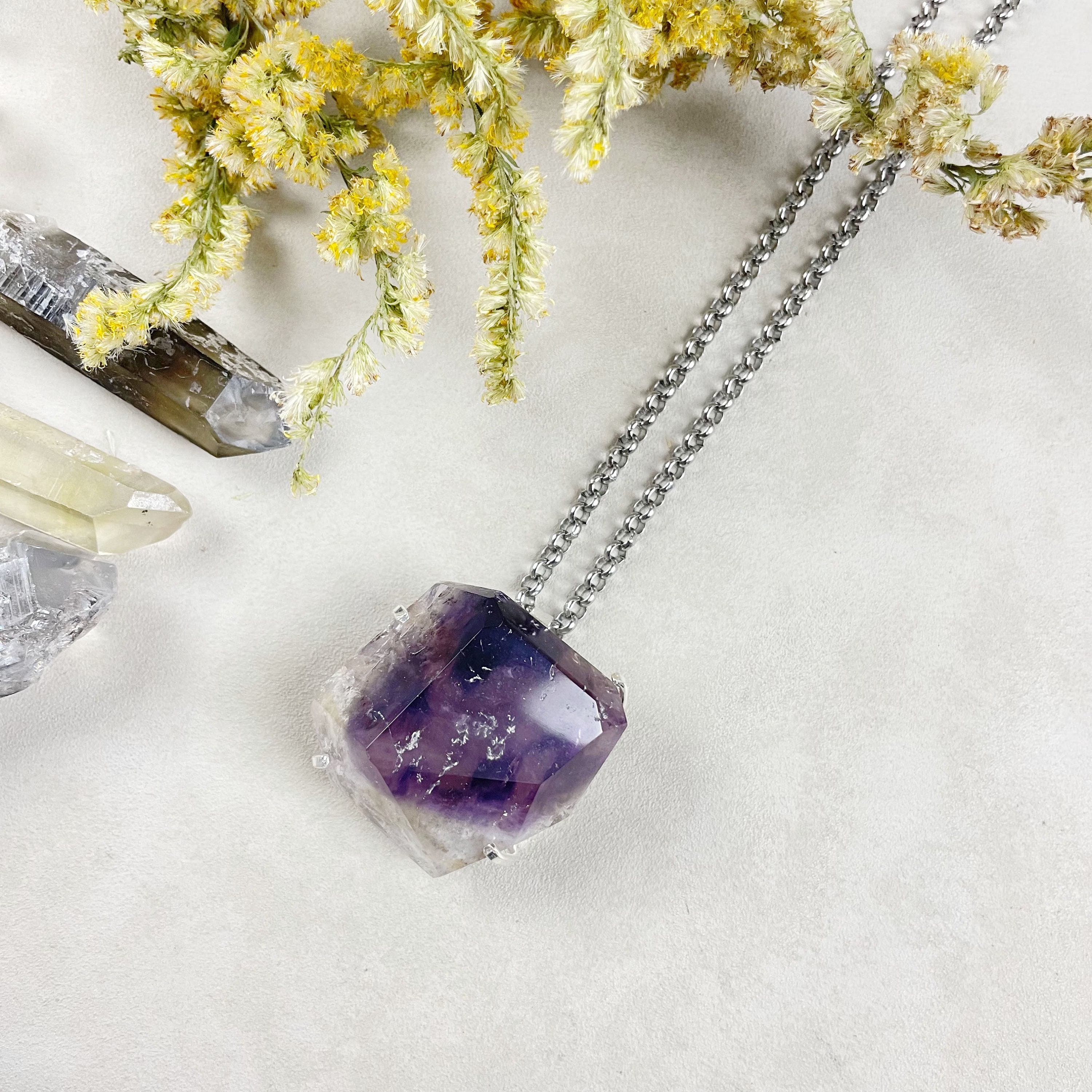 This necklace is made from a natural dreamcoat amethyst stone. Dreamcoat is a trade name for amethyst which has traces of hematite, iron, quartz in amethyst. Hematite is what gives the red coloring. Iron in quartz is what makes the stone yellow and is called golden healer. The clear is quartz and purple is amethyst.The stone is cut into geometric shapes and set inside a four prong setting. The setting is silver plated. The necklace is finished off with a stainless steel rolo chain.