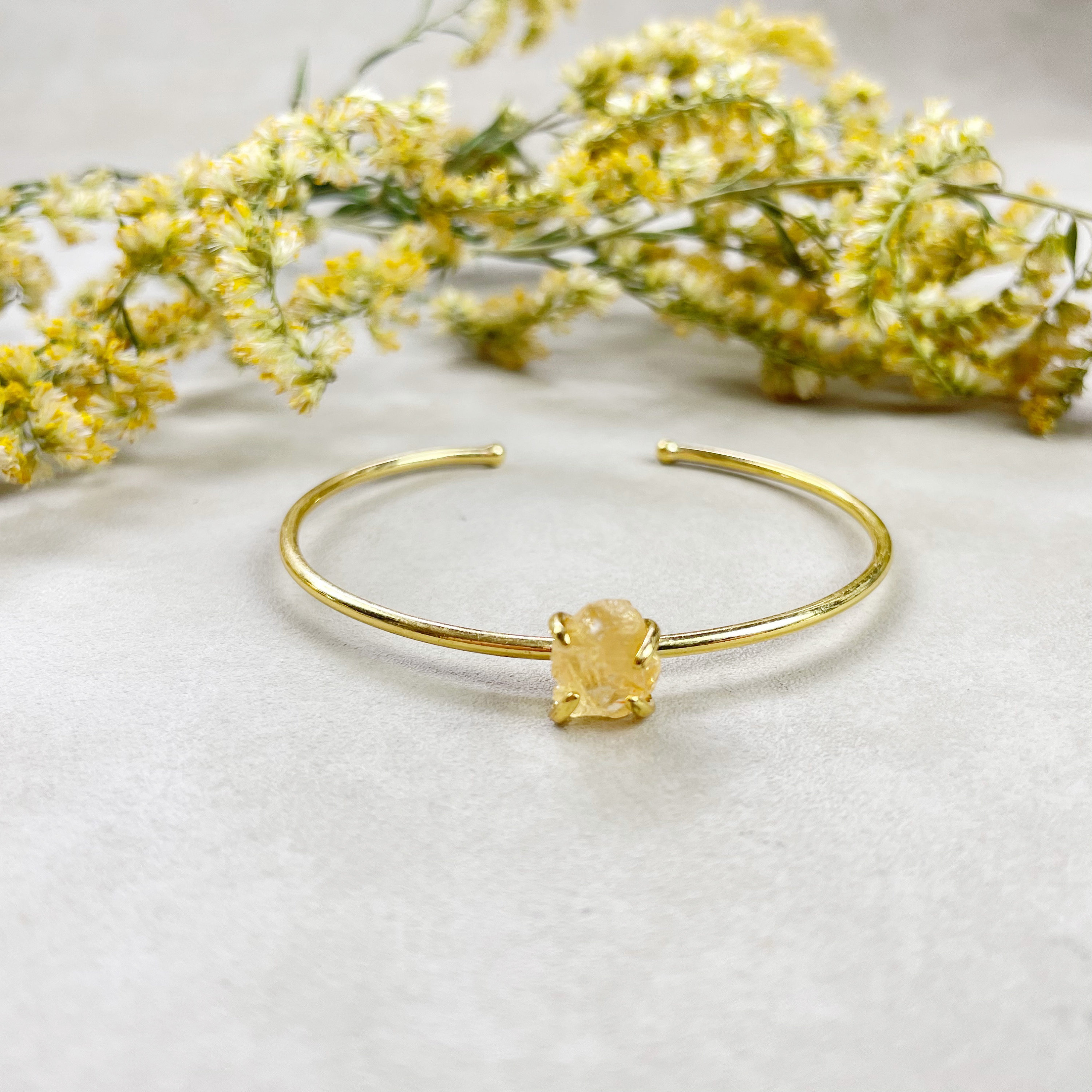 These bracelets are made from gold plated cuffs which have a center stone. The center of the bracelet has four prongs which holds the golden amethyst citrine gemstone nuggets. The center stones are rough little nuggets.