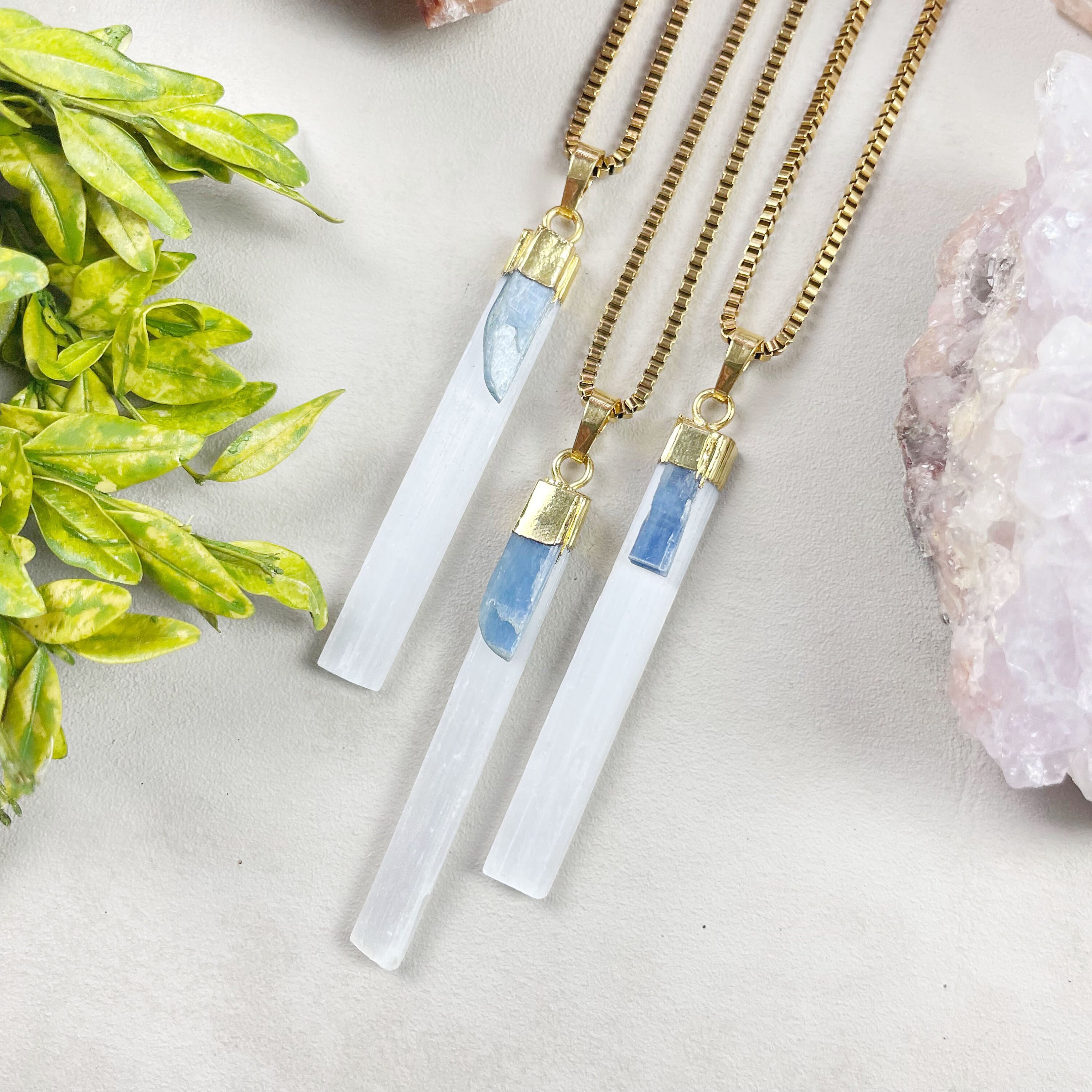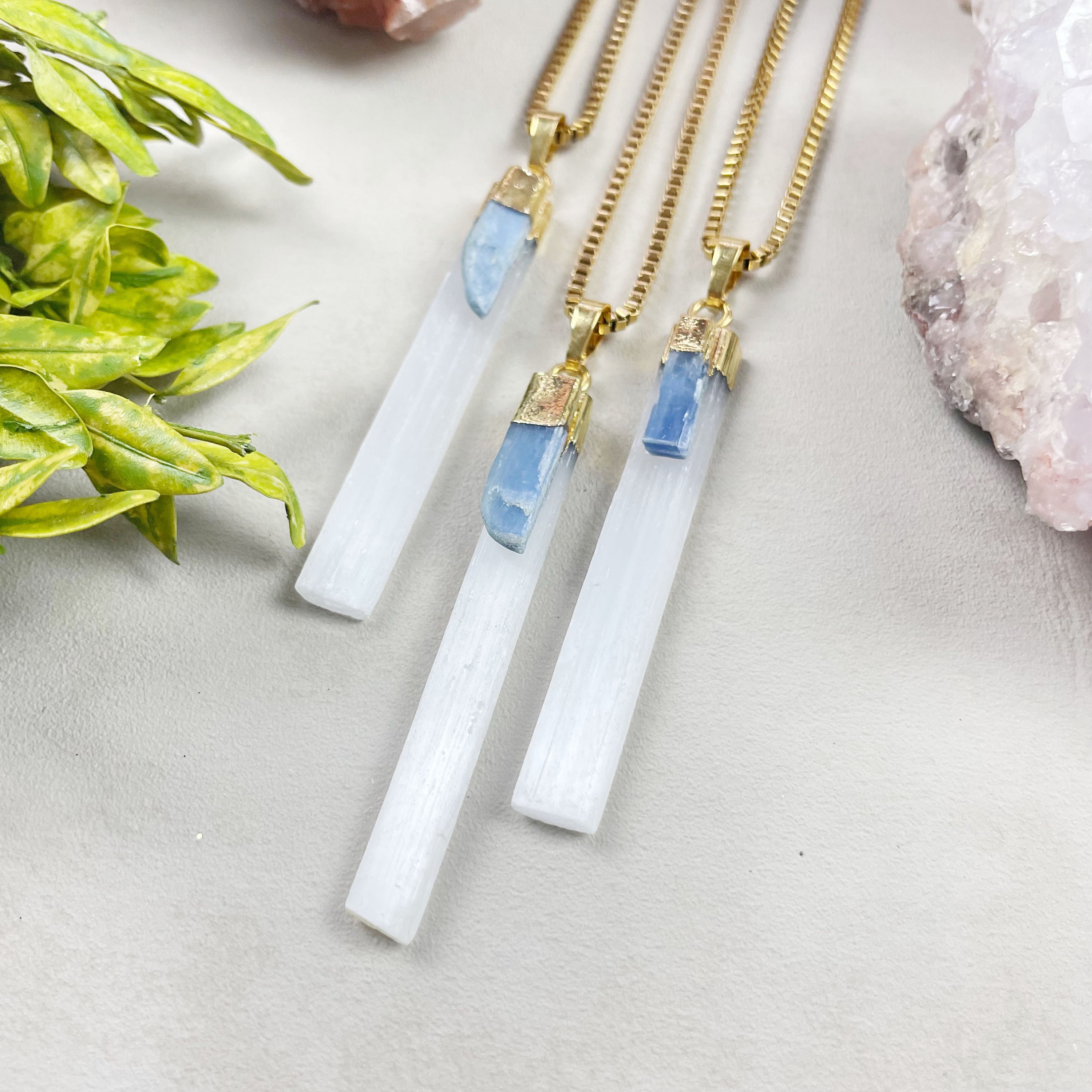 This necklace is made from a natural selenite stone. The selenite is matched with a small blue kyanite stone. The stone is gold plated at the top and made into a pendant. The pendant hangs from a gold plated stainless steel chain.