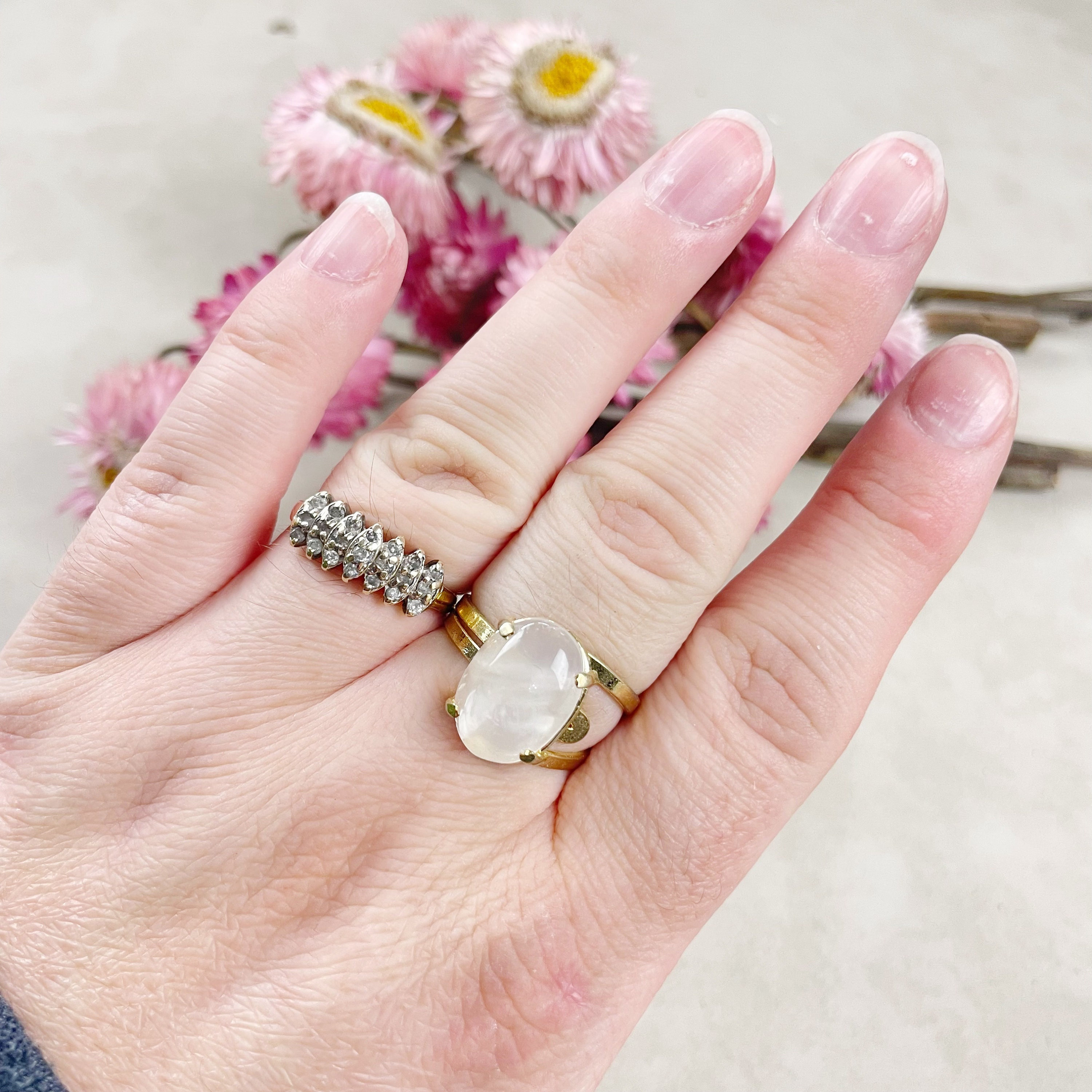 This listing is for one cabochon ring. The ring features a beautiful girasol quartz oval cabochon. The cabochon is set on top of a gold plated brass ring base. The stone is held with prongs.