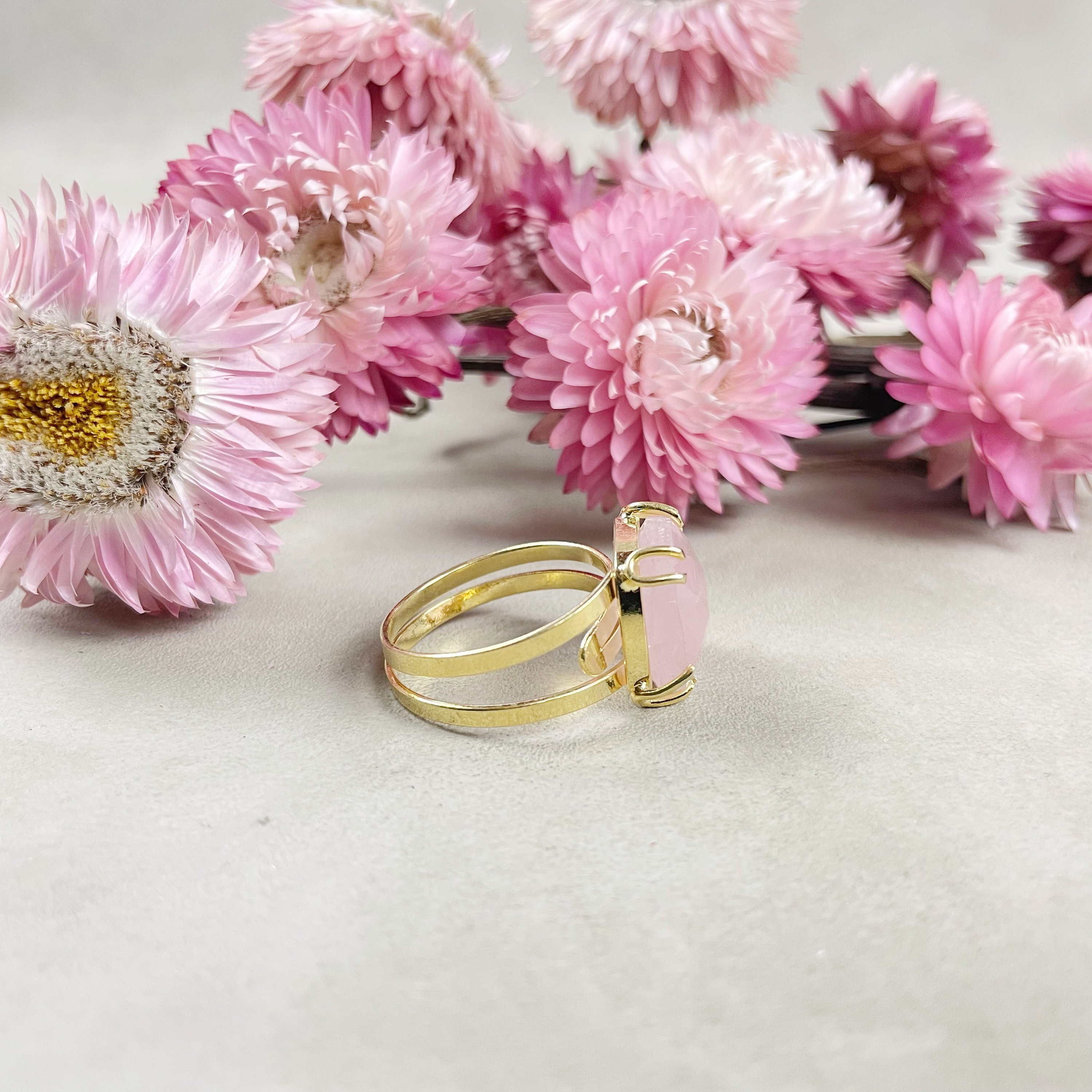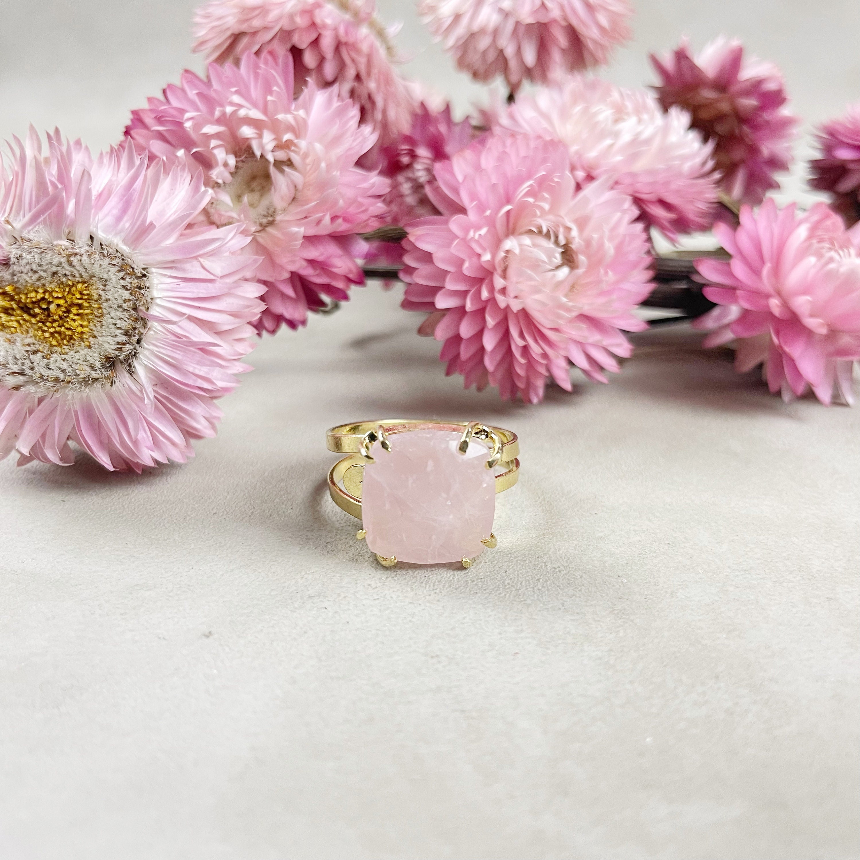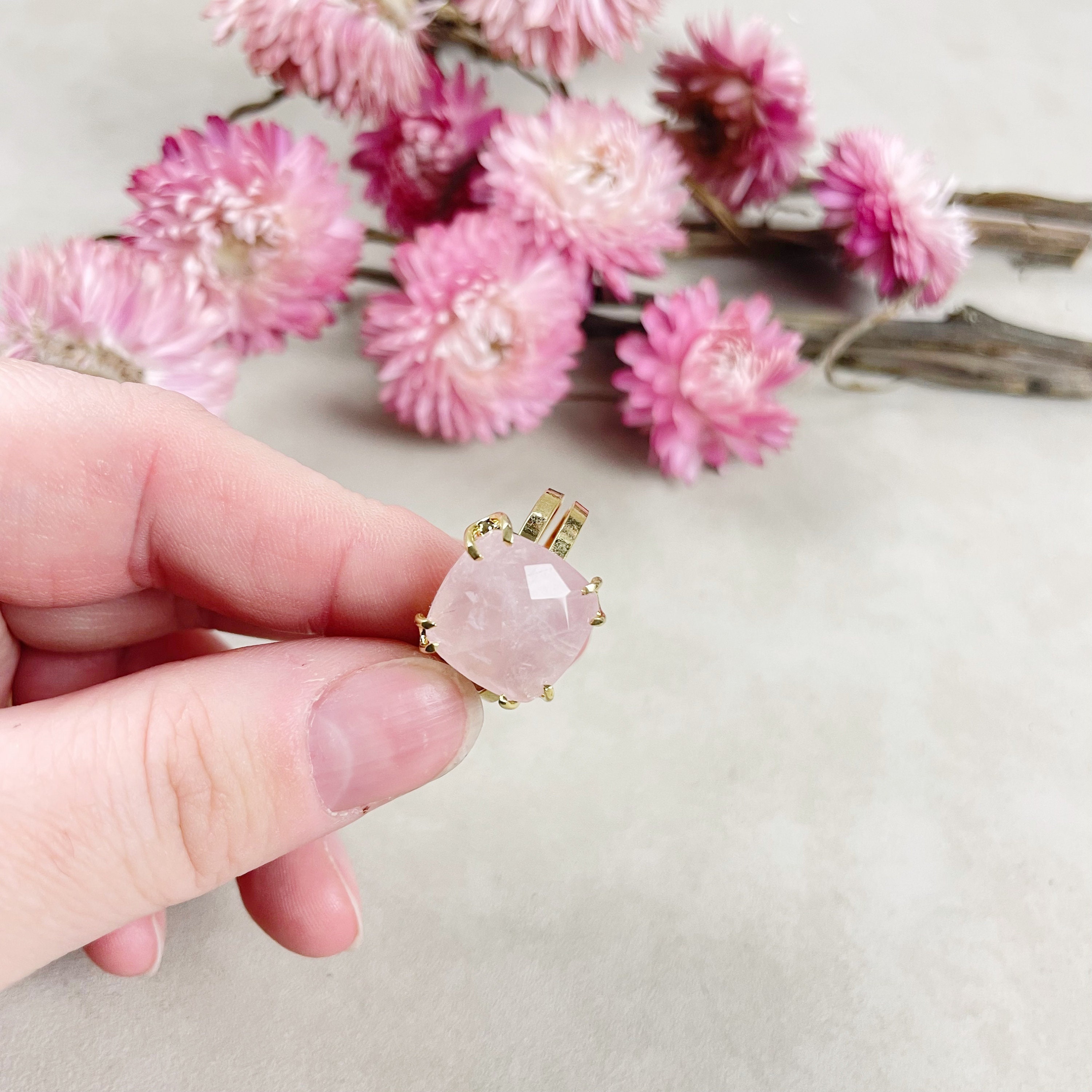 This listing is for one cabochon ring. The ring features a beautiful faceted rose quartz cushion cabochon. The cabochon is set on top of a gold plated brass ring base. The stone is held with prongs.