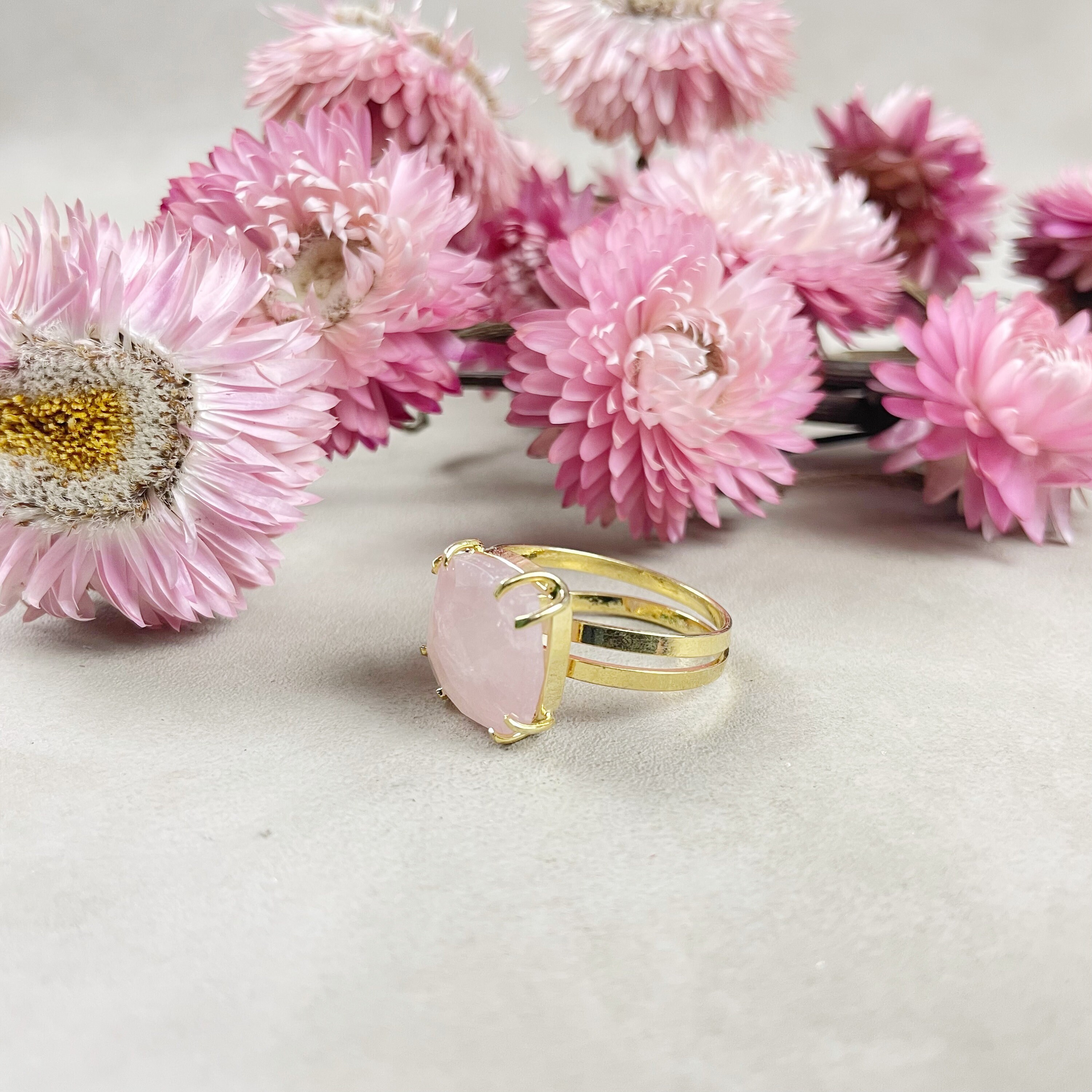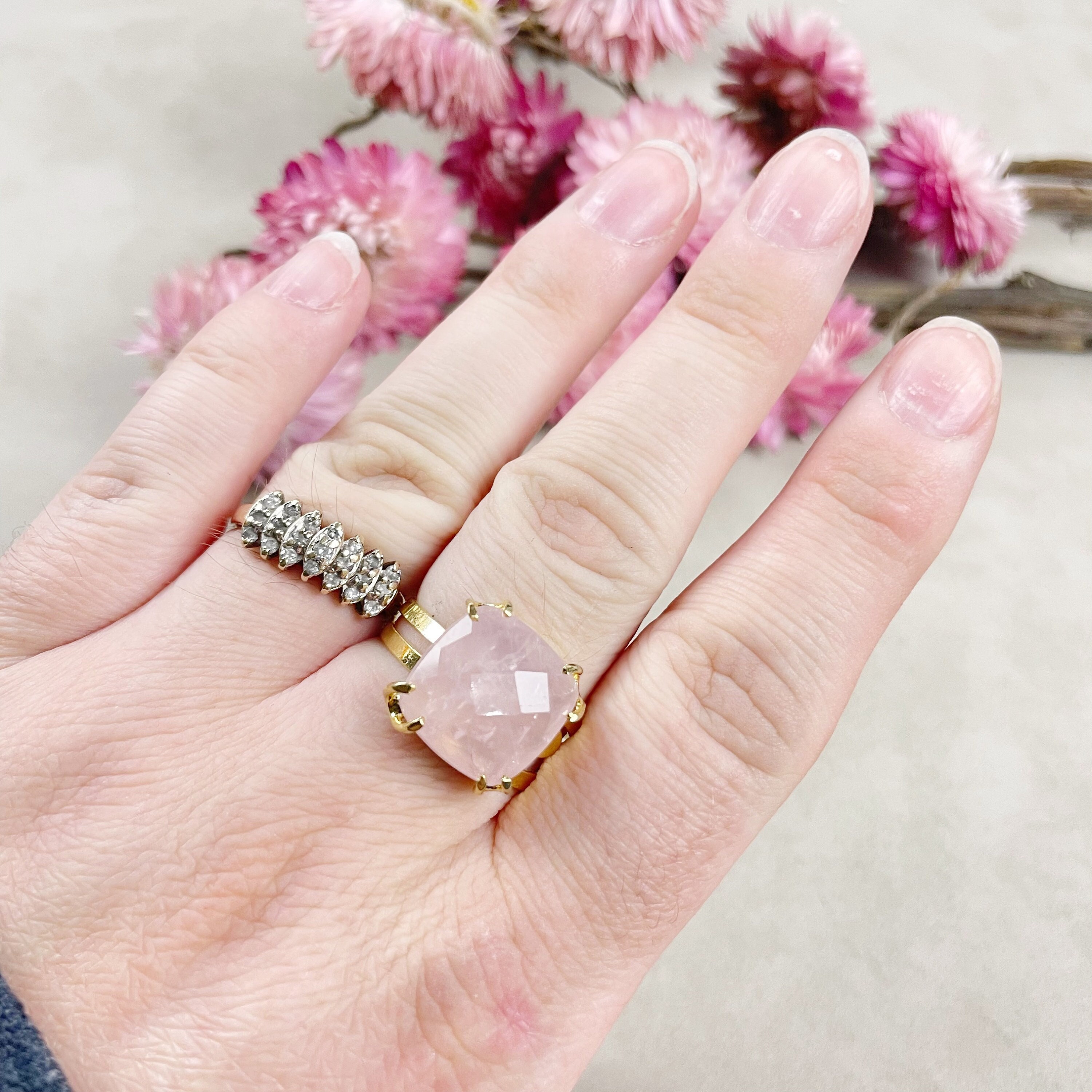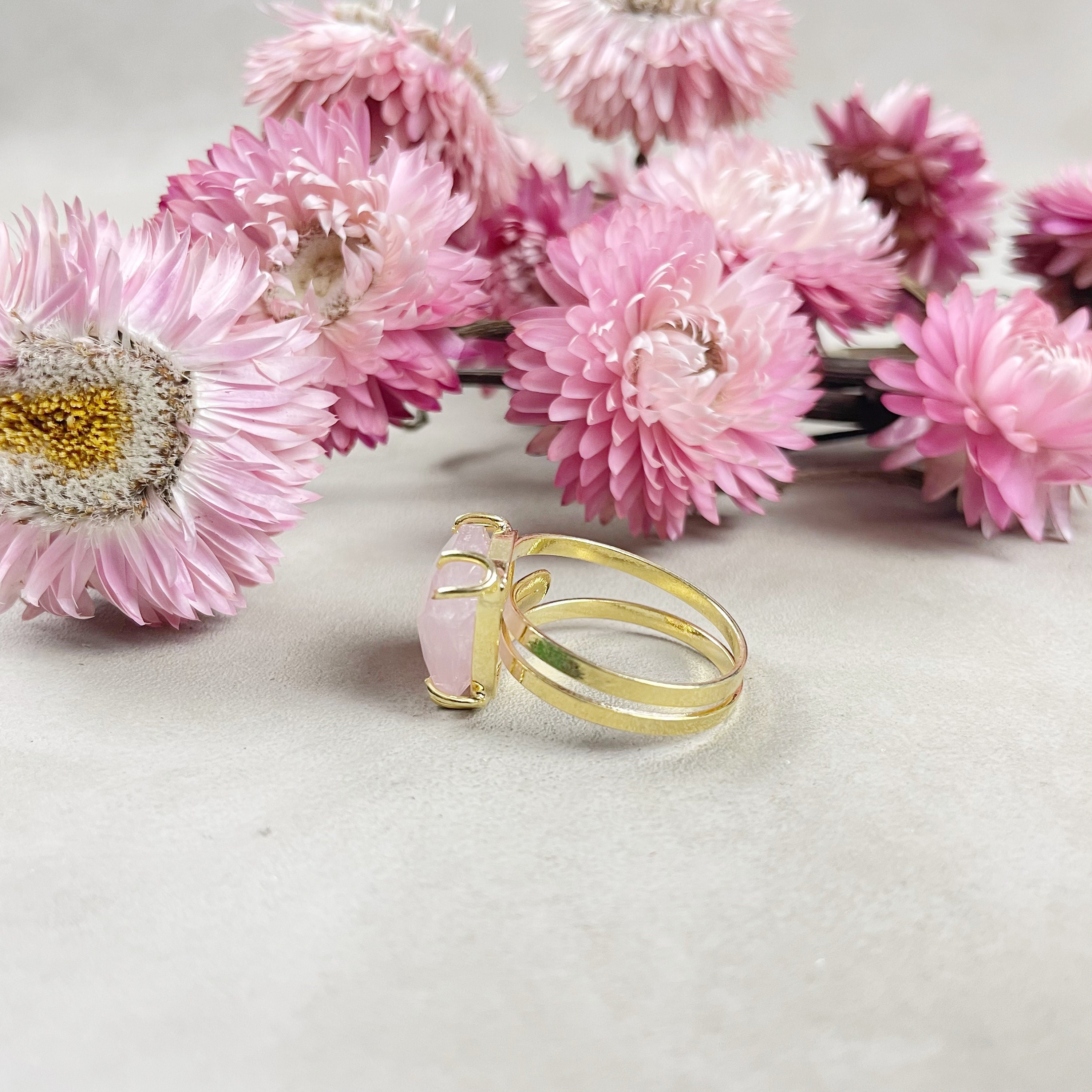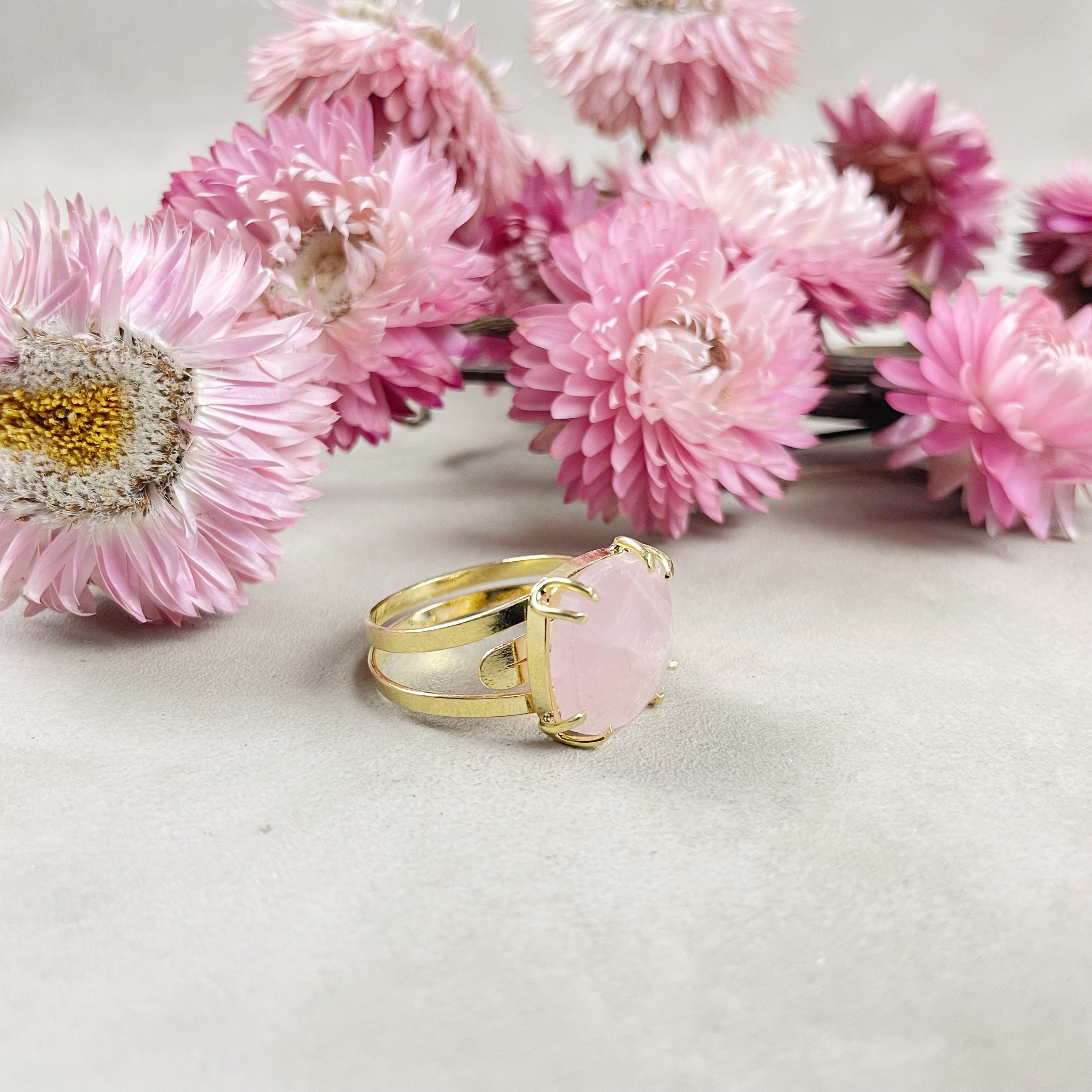 This listing is for one cabochon ring. The ring features a beautiful faceted rose quartz cushion cabochon. The cabochon is set on top of a gold plated brass ring base. The stone is held with prongs.