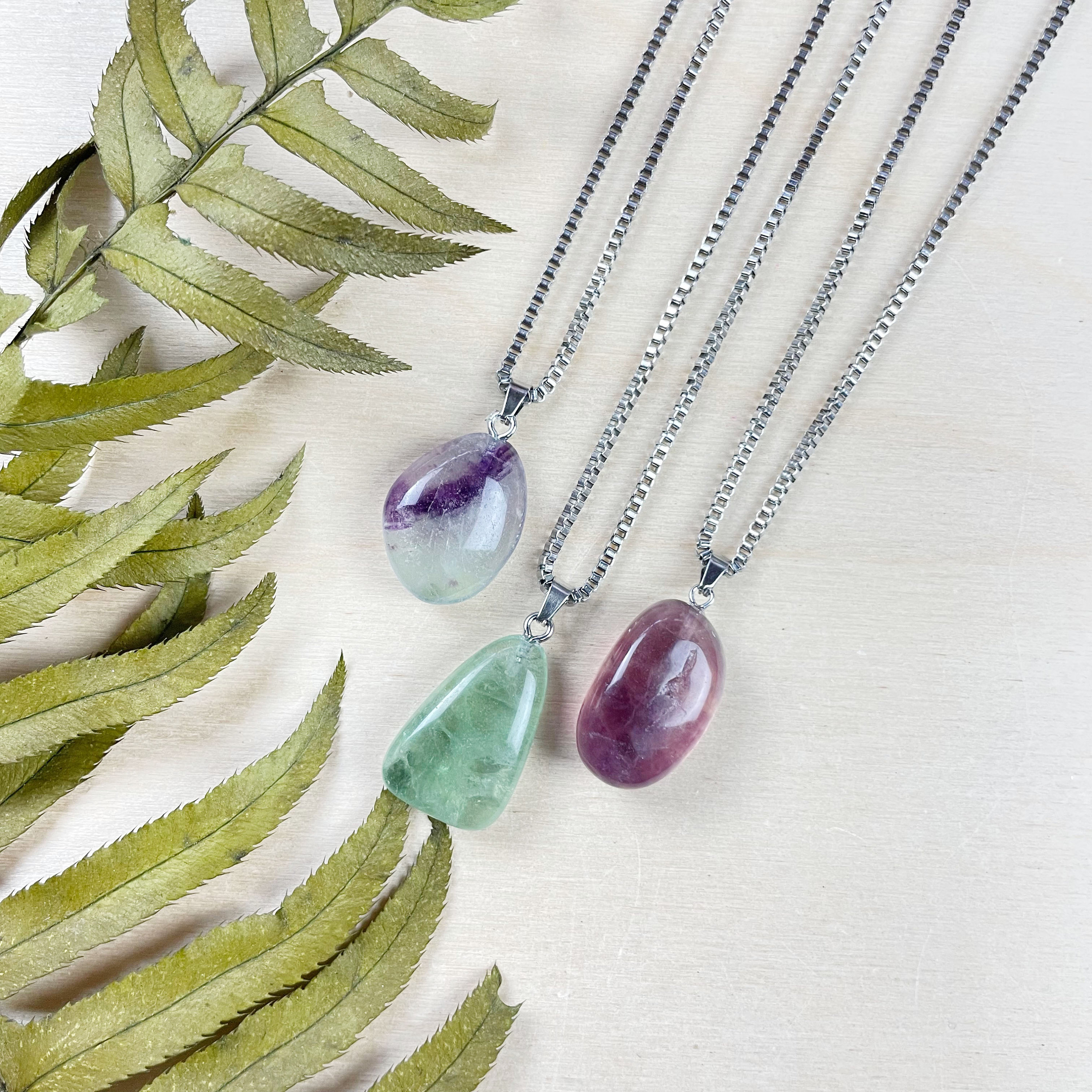 This necklace is made from a rainbow fluorite stone. The fluorite is a tumbled little nugget which range in shape, size and color. The colors range from green to purple and a mix of both. The stone hangs from a stainless steel chain.