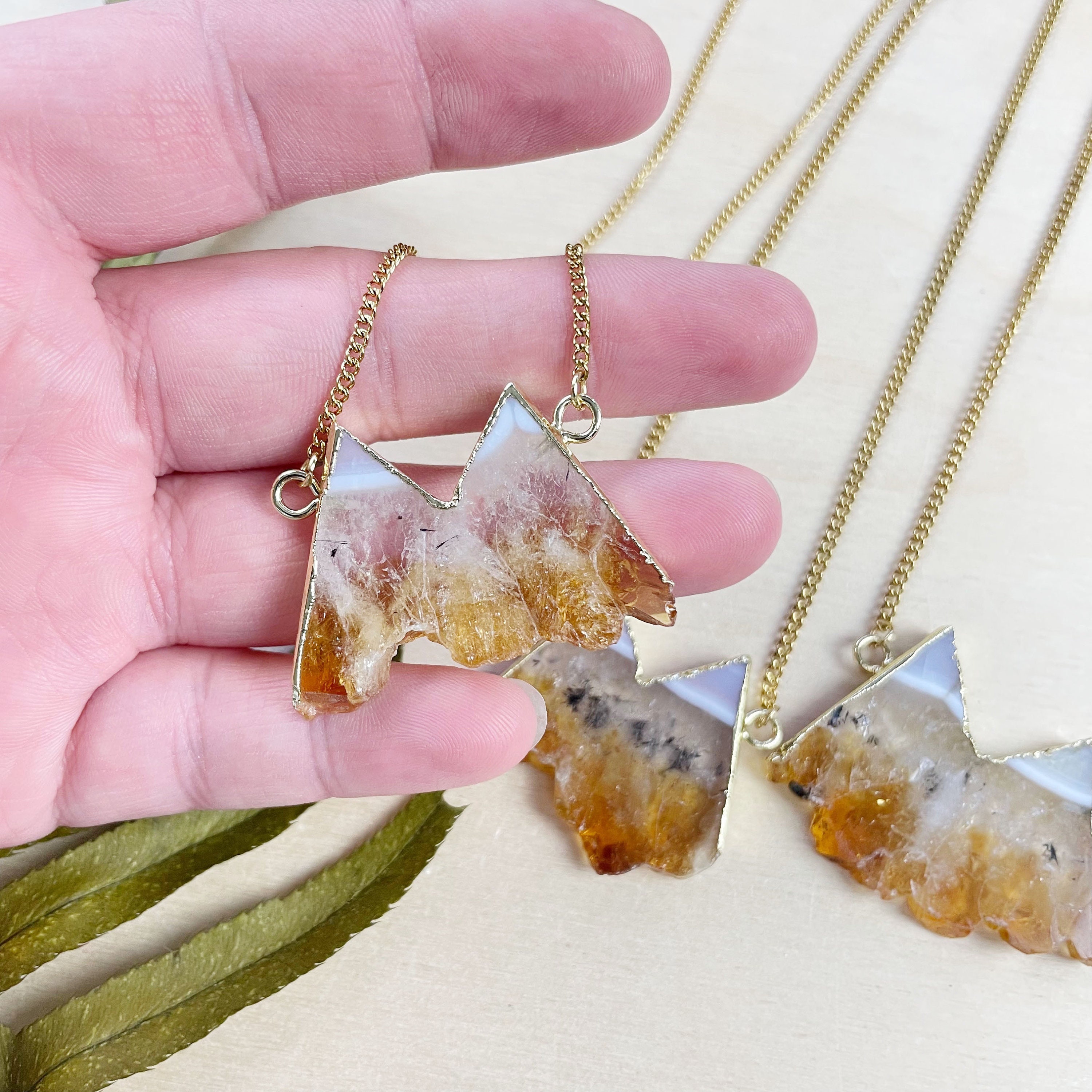 This necklace is made from natural amethyst slice stones. The amethyst is heated to create the golden citrine coloring. The golden amethyst stones are cut into mountain shapes and are gold plated on the cut sides. The necklace is finished off with a gold plated stainless steel chain.