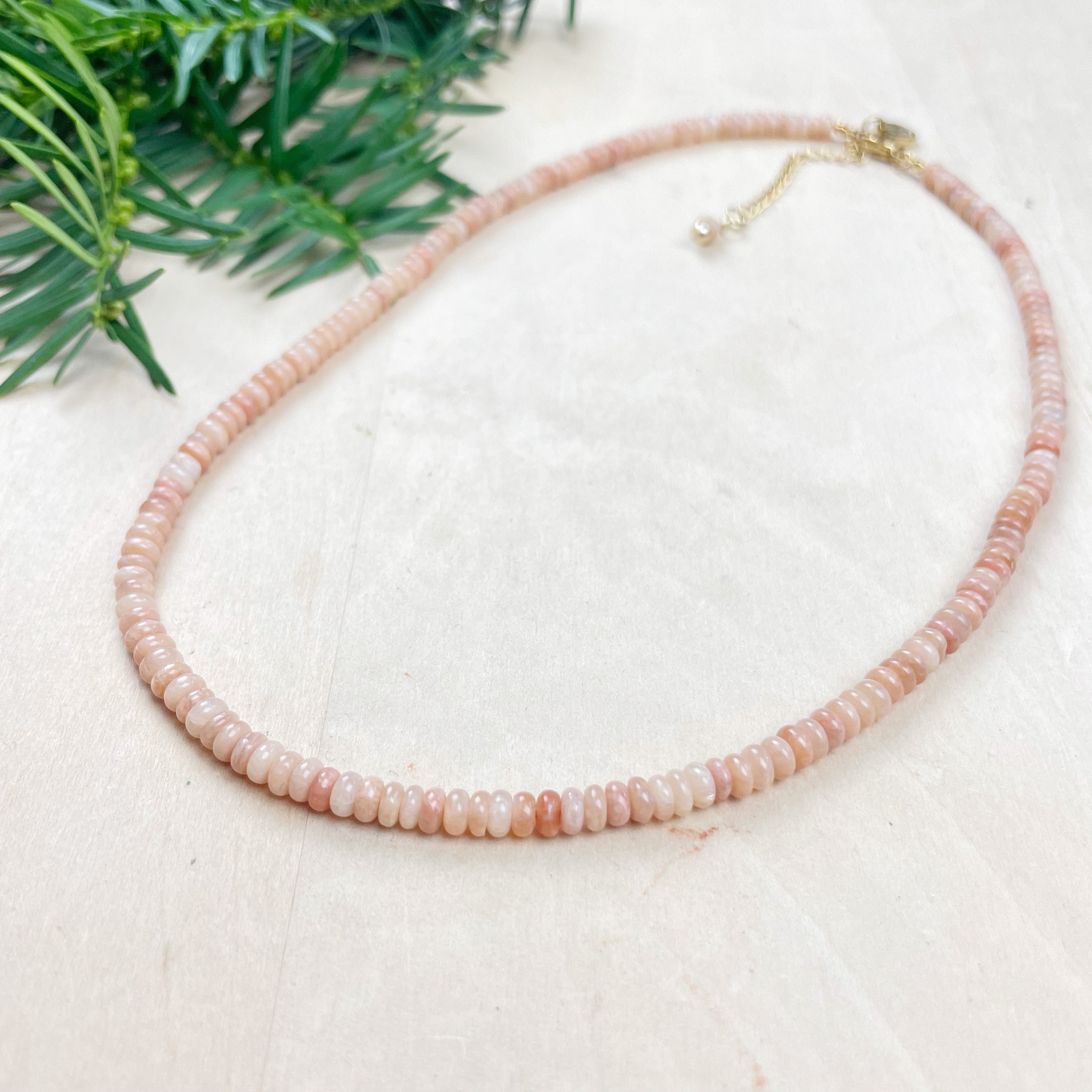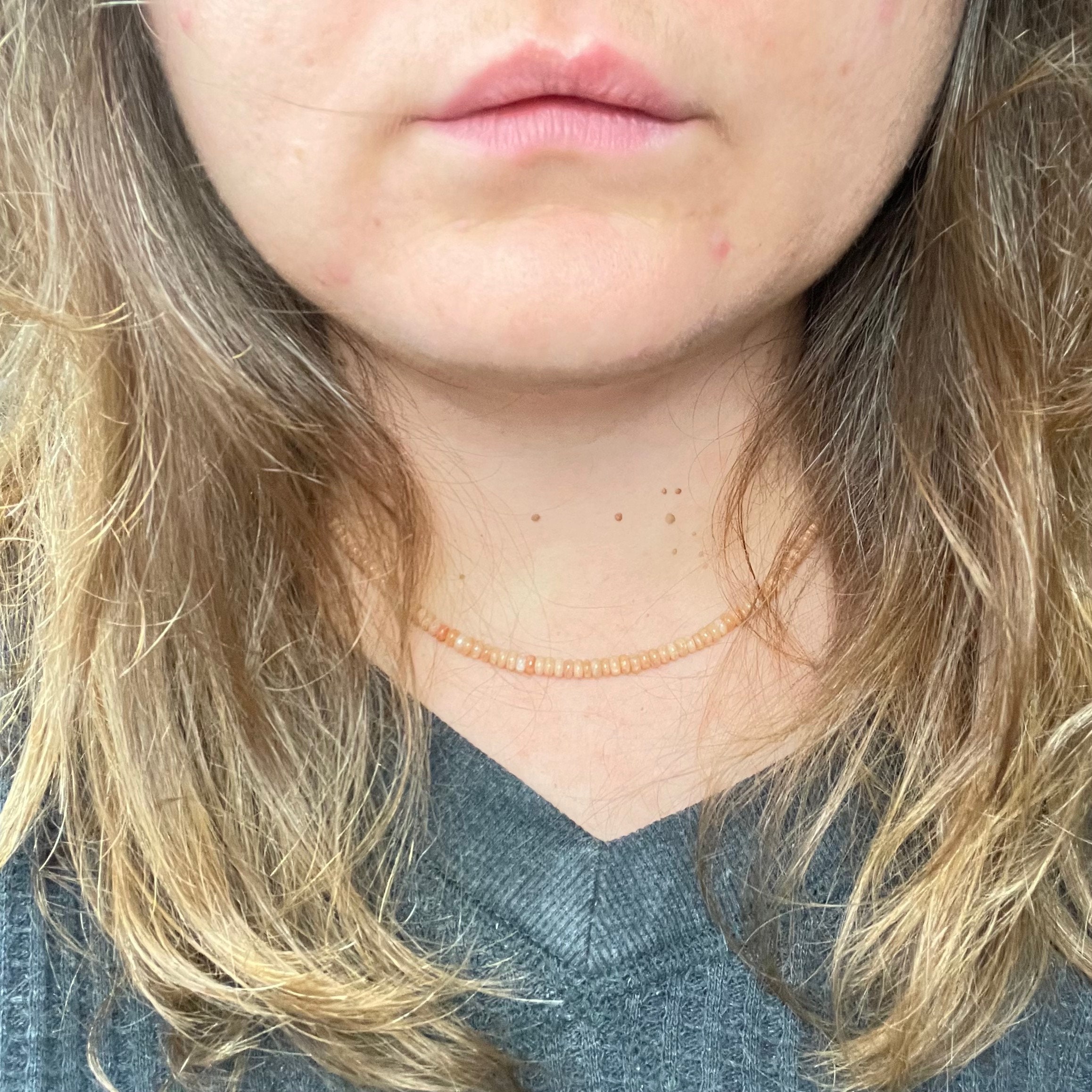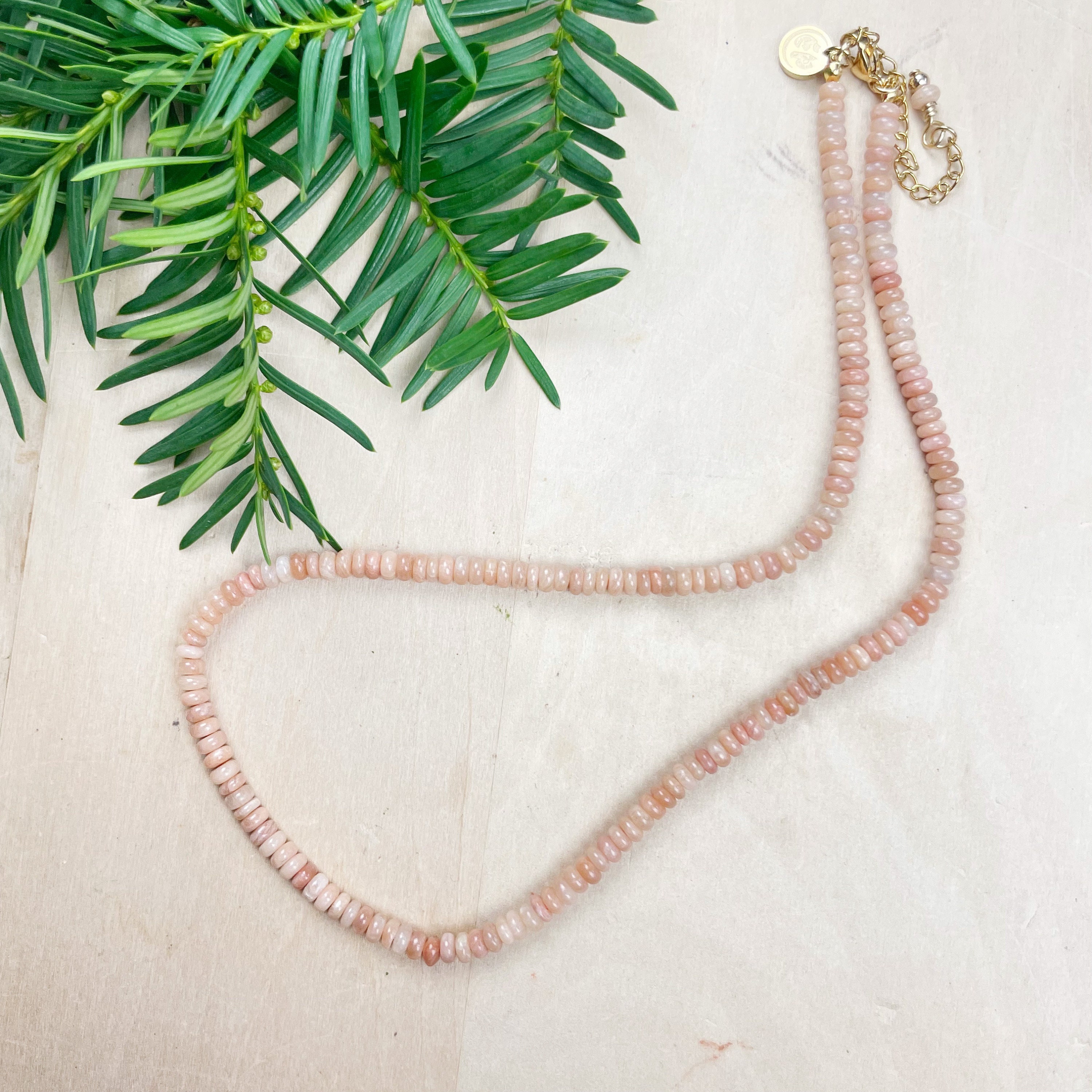 This necklace is made from natural sunstone stone beads. The beads are smooth rondelles that are 2x4mm in size. Each bead is strung on a 100% nylon cord. The necklace is finished off with a gold plated stainless steel chain, clasp and logo charm.
