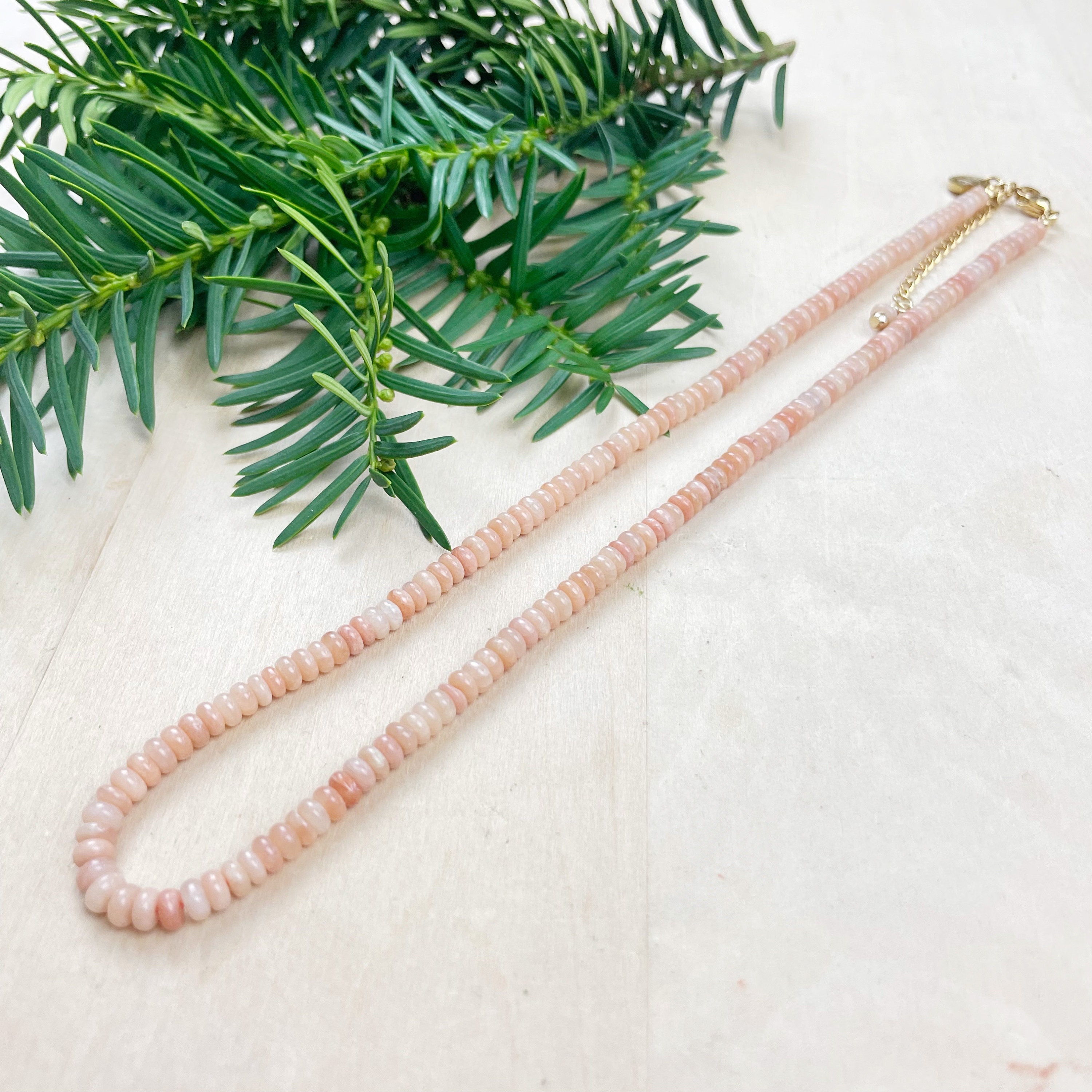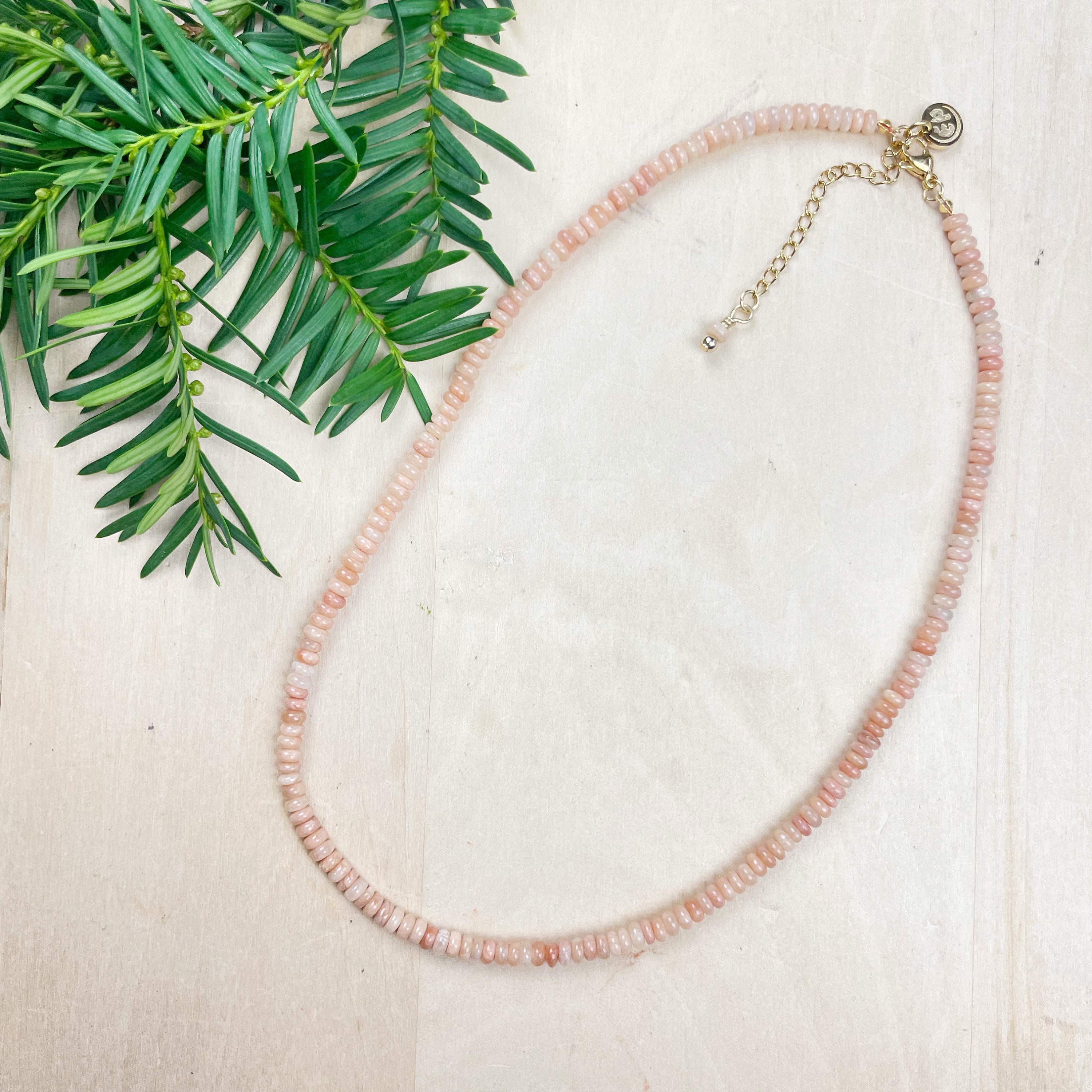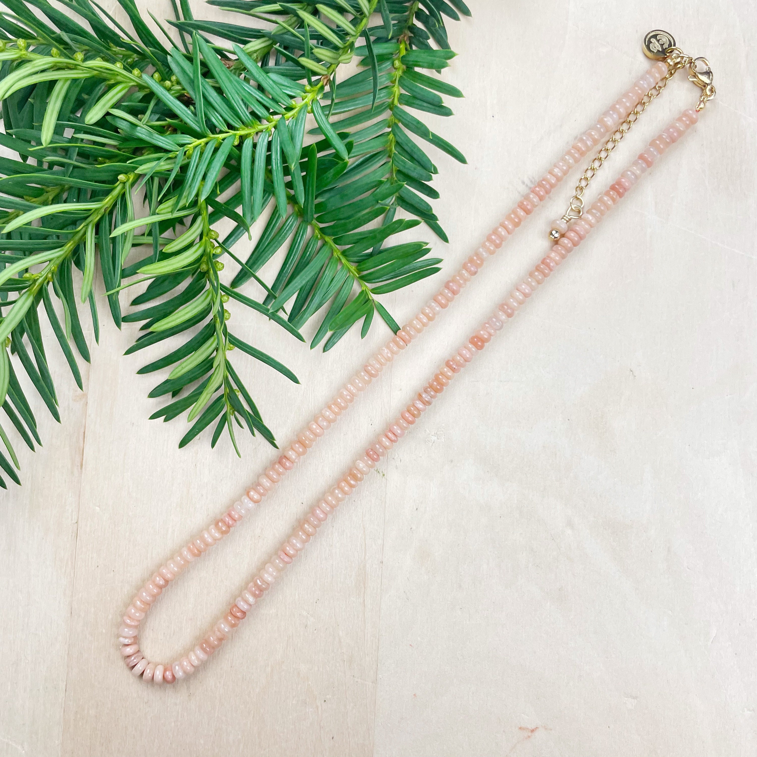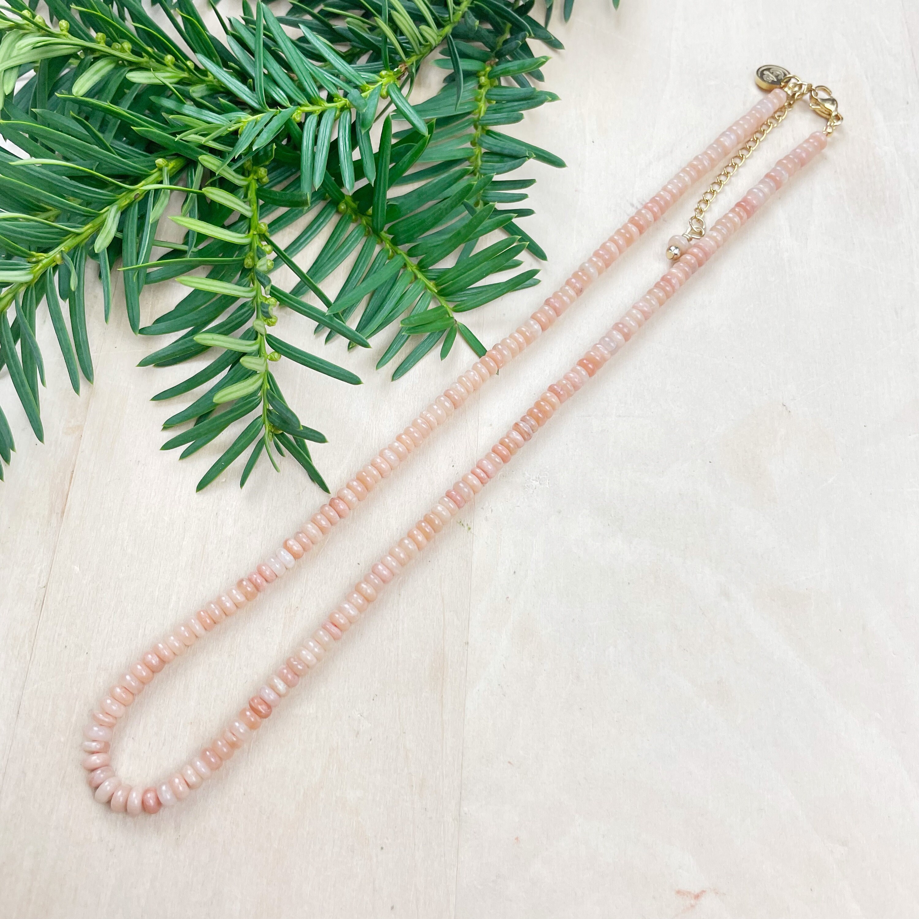 This necklace is made from natural sunstone stone beads. The beads are smooth rondelles that are 2x4mm in size. Each bead is strung on a 100% nylon cord. The necklace is finished off with a gold plated stainless steel chain, clasp and logo charm.