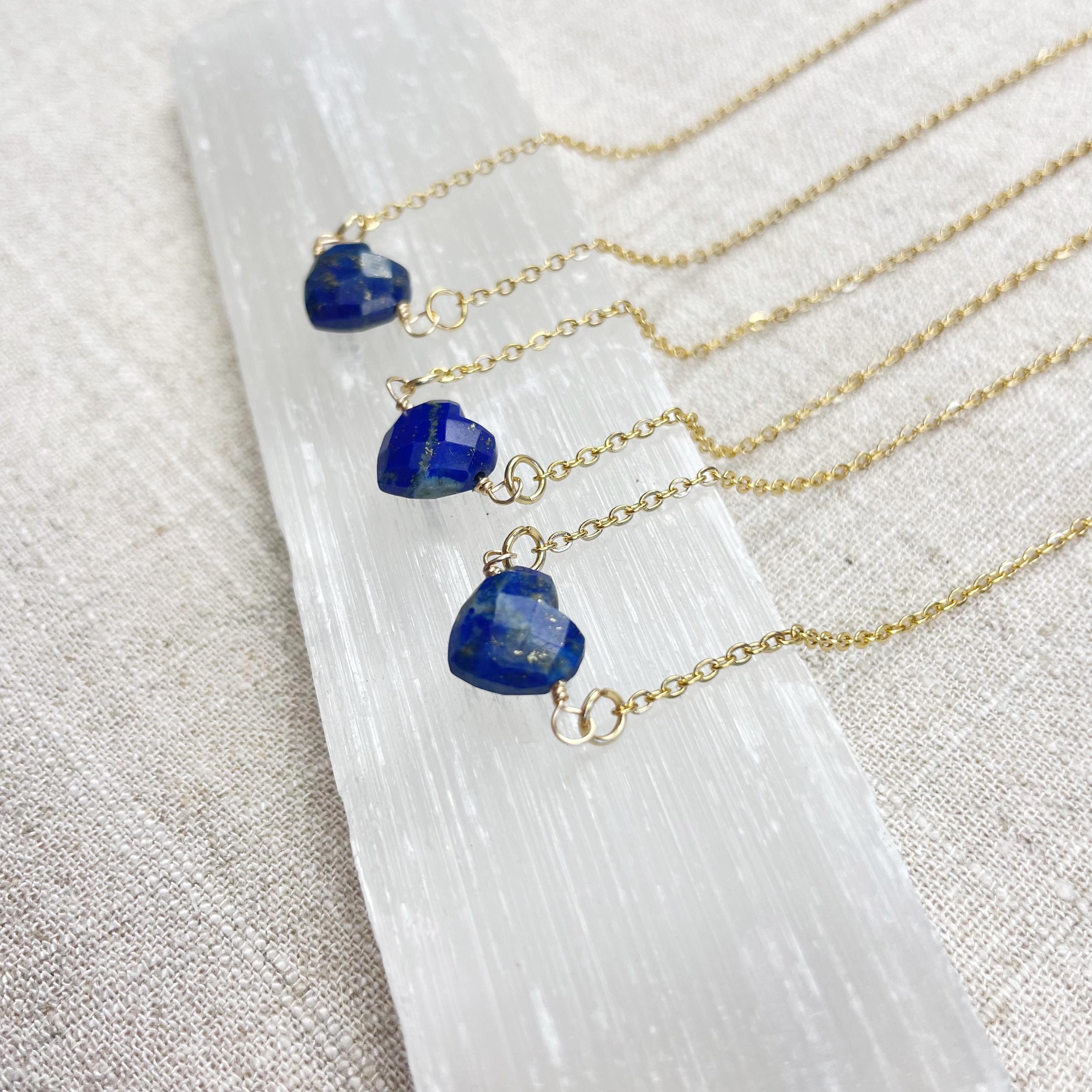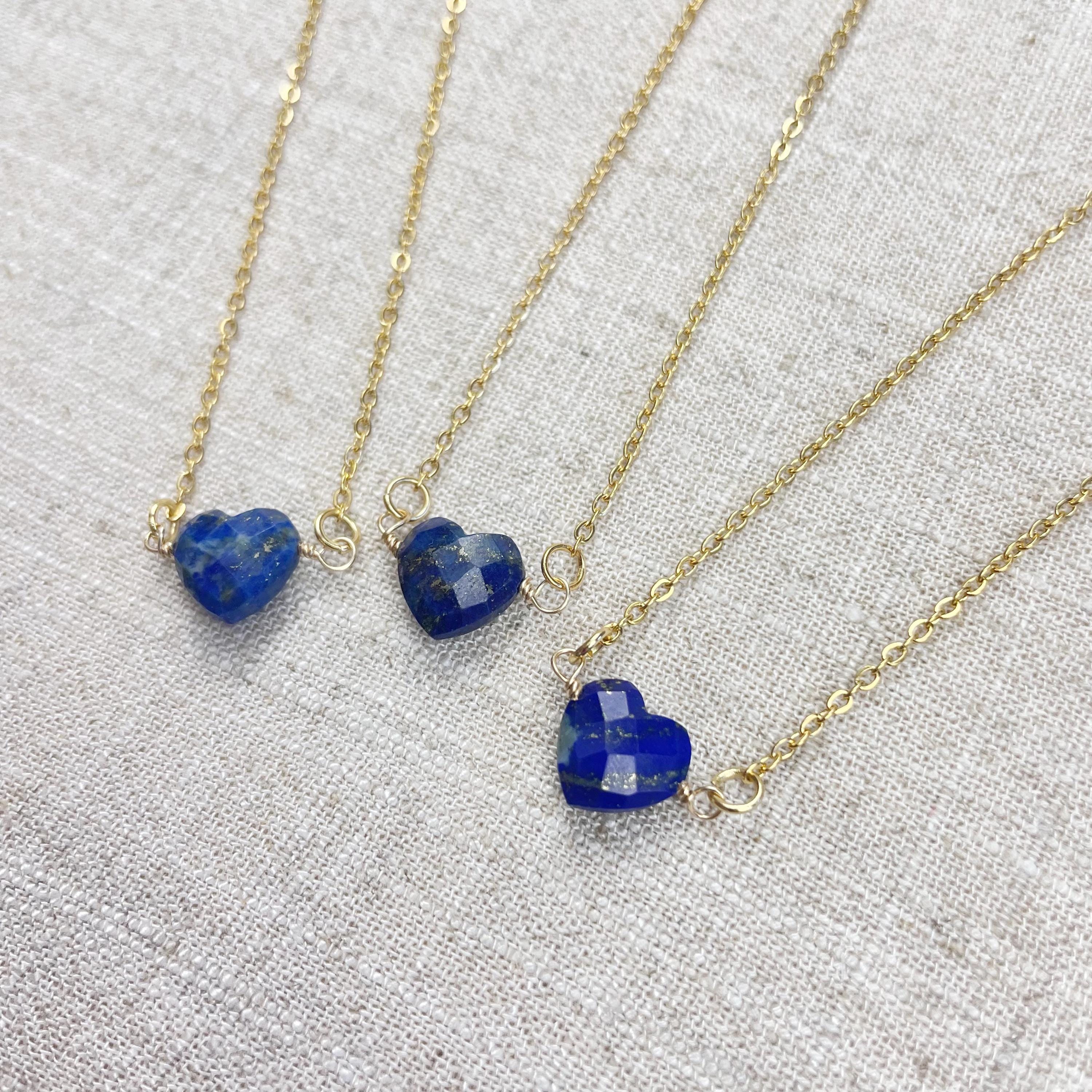 This necklace is made from a lapis lazuli stone. The lapis is cut into a faceted heart shape. The heart is wire wrapped with gold filled wire to create a pendant. The pendant hangs from a delicate gold plated stainless steel chain.