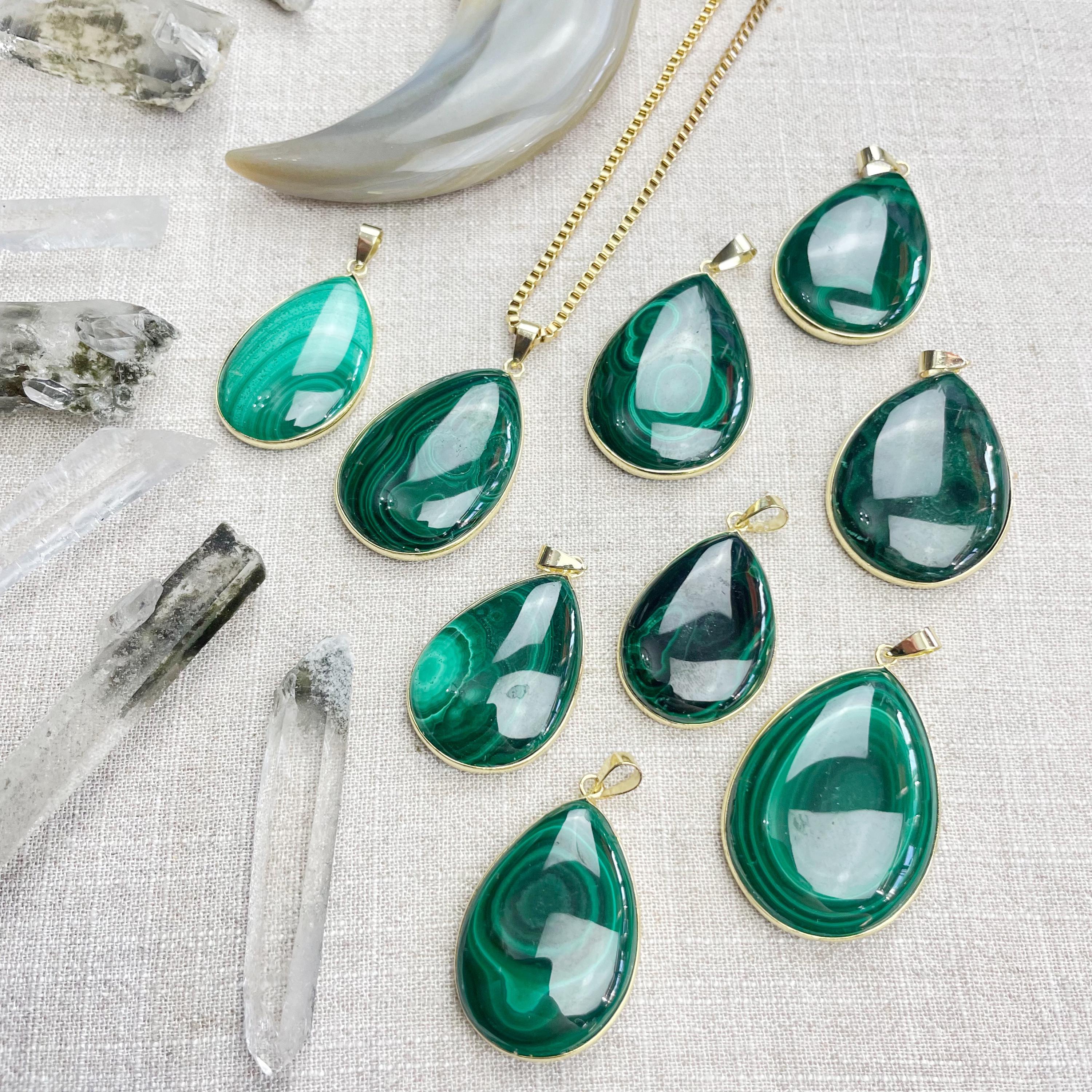 This necklace is made from natural malachite. The malachite has been cut into teardrop shapes. The stones are set inside gold plated bezels.