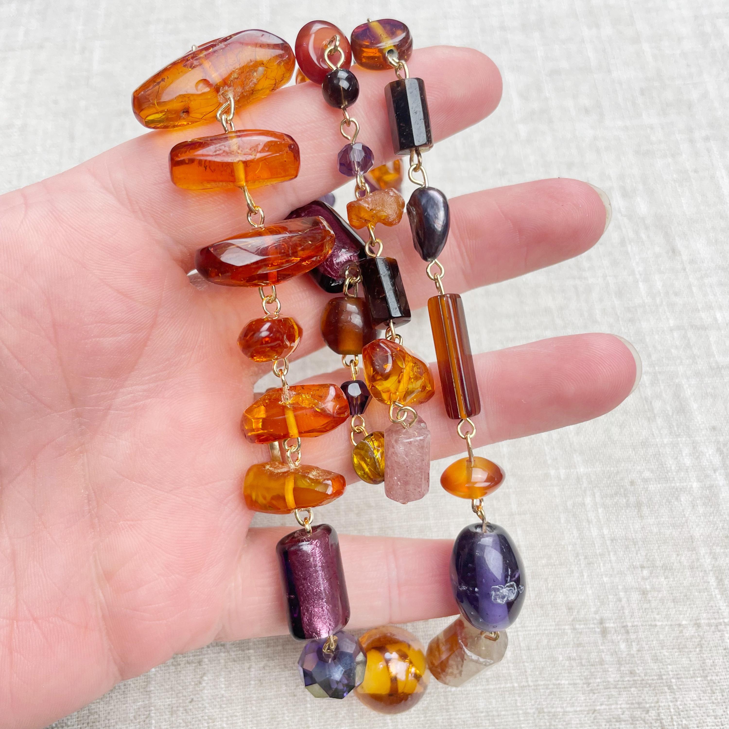 This necklace is made with a variety of beads which are glass, crystal, gemstone, wood, ceramic, lucite, plastic, rubber and pearl. The beads are all different from necklace to necklace. Each bead has its own unique coloring, shape and size. The beads are all hand wrapped with gold plated wire to create a rosary like chain. The necklace is finished off with a gold plated stainless steel chain, clasp and logo charm.