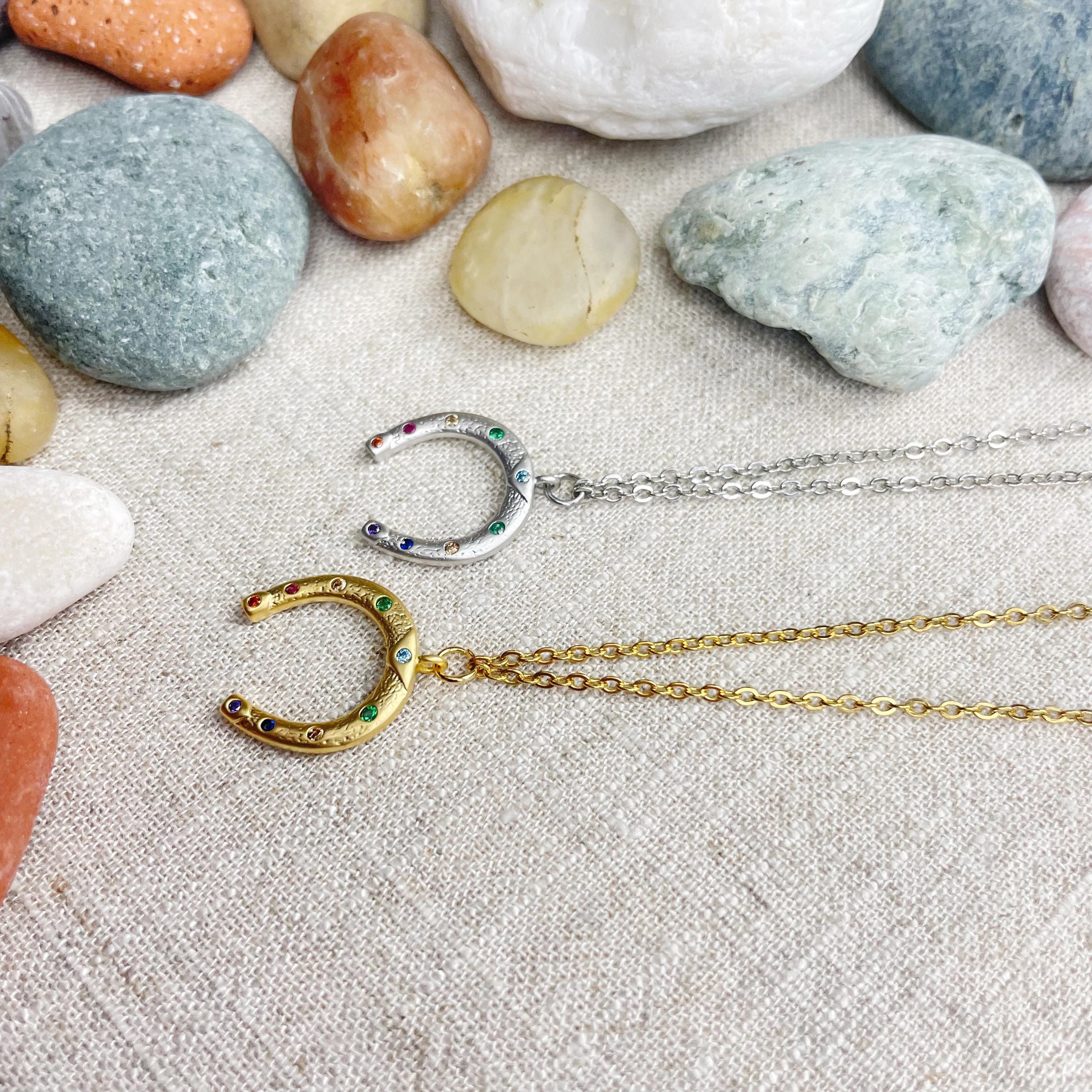 This necklace is made from a gold or silver plated charm. The charm has a matte finish. The charms have colorful pave crystals embedded in the horseshoe.