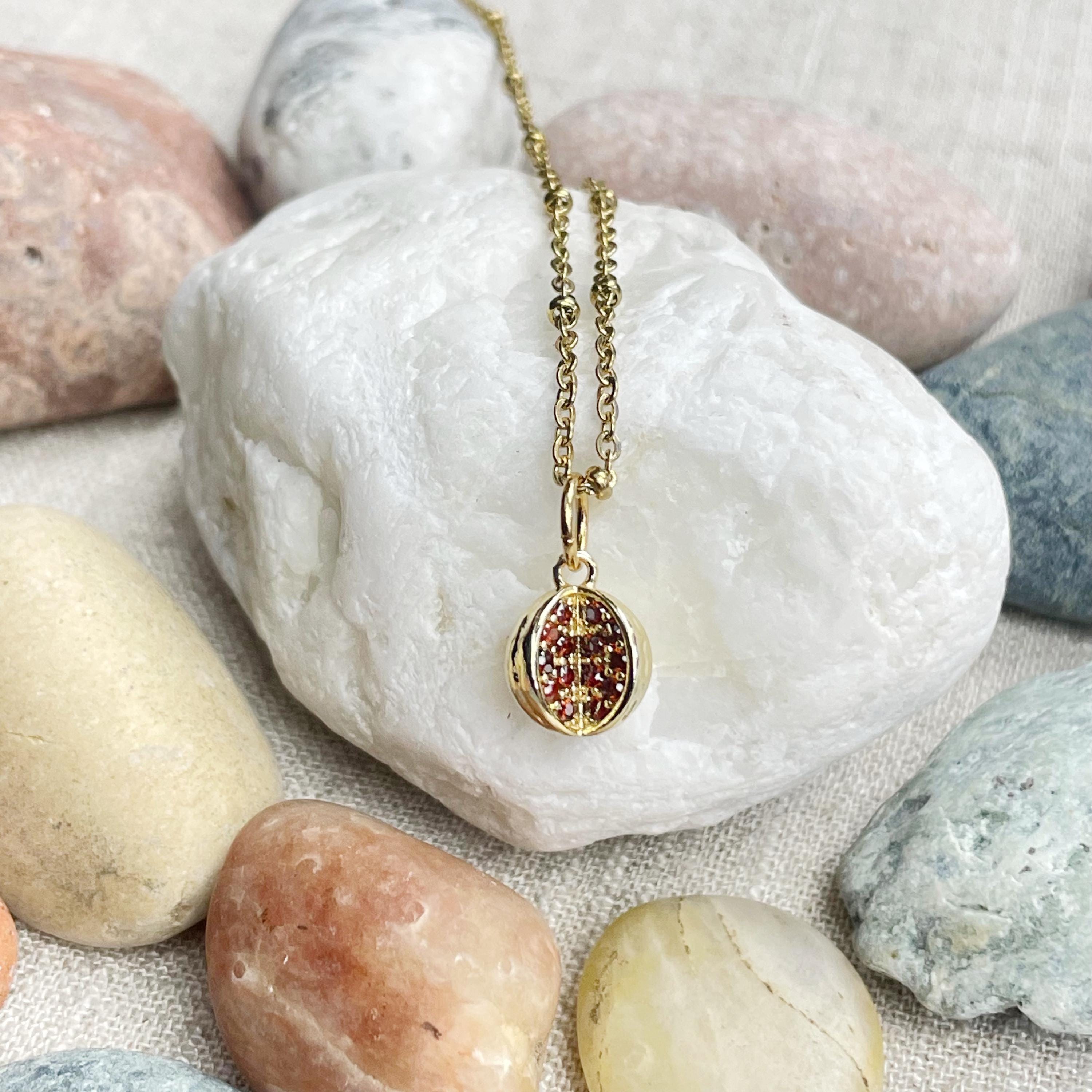 This necklace is made from a gold plated charm. The charm is a pomegranate shape with a red crystal embedded into a side of the pomegranate. The pomegranate is a 3d shape.