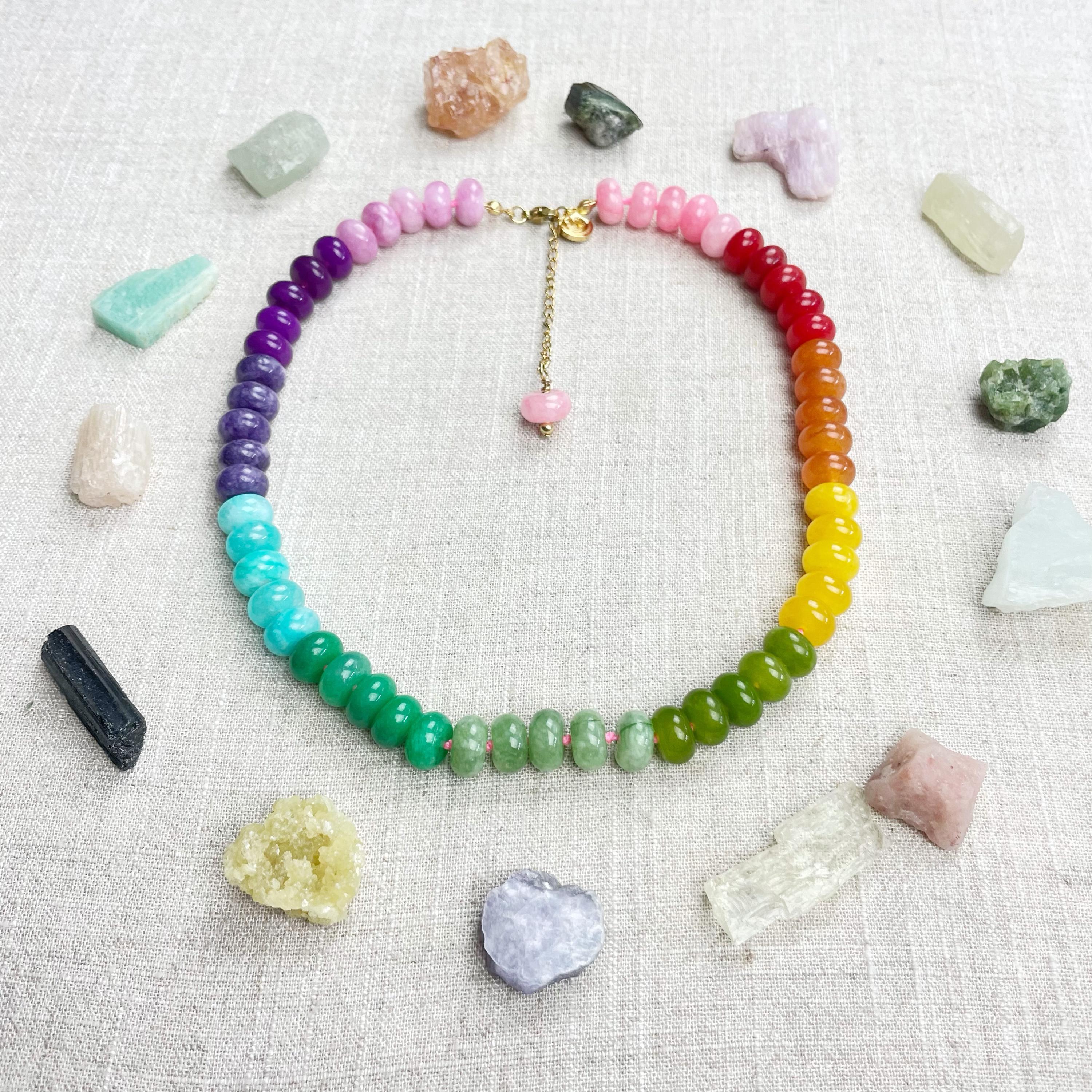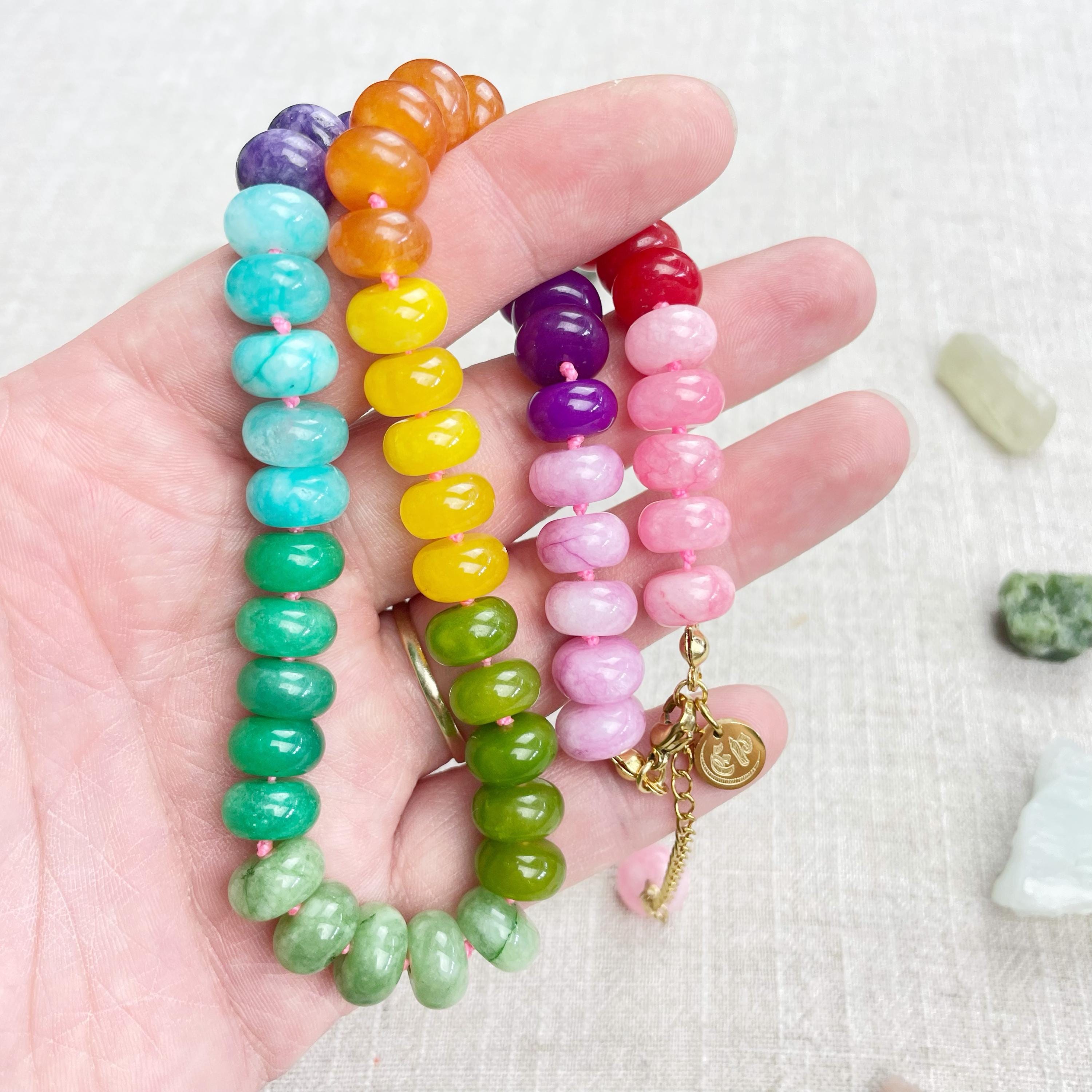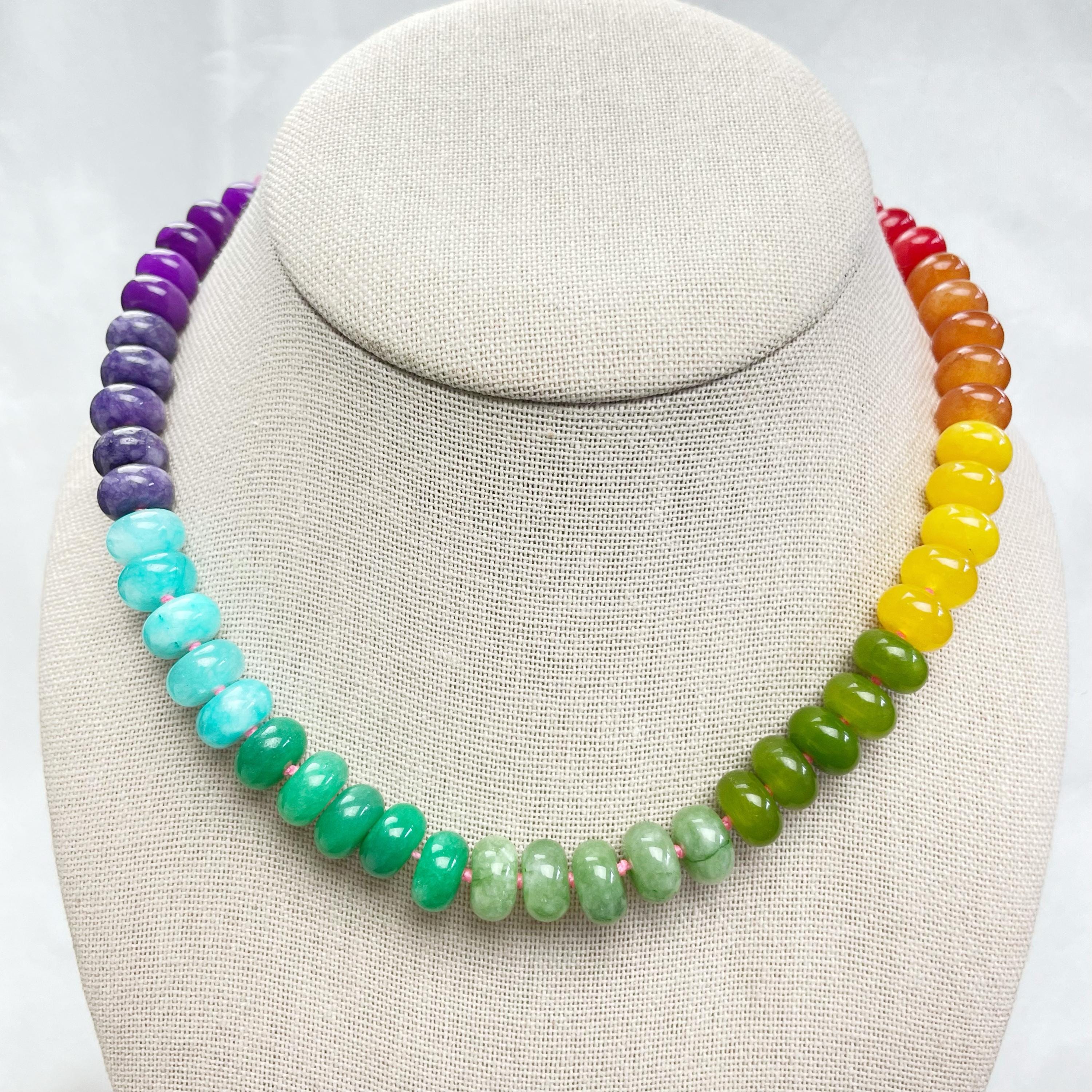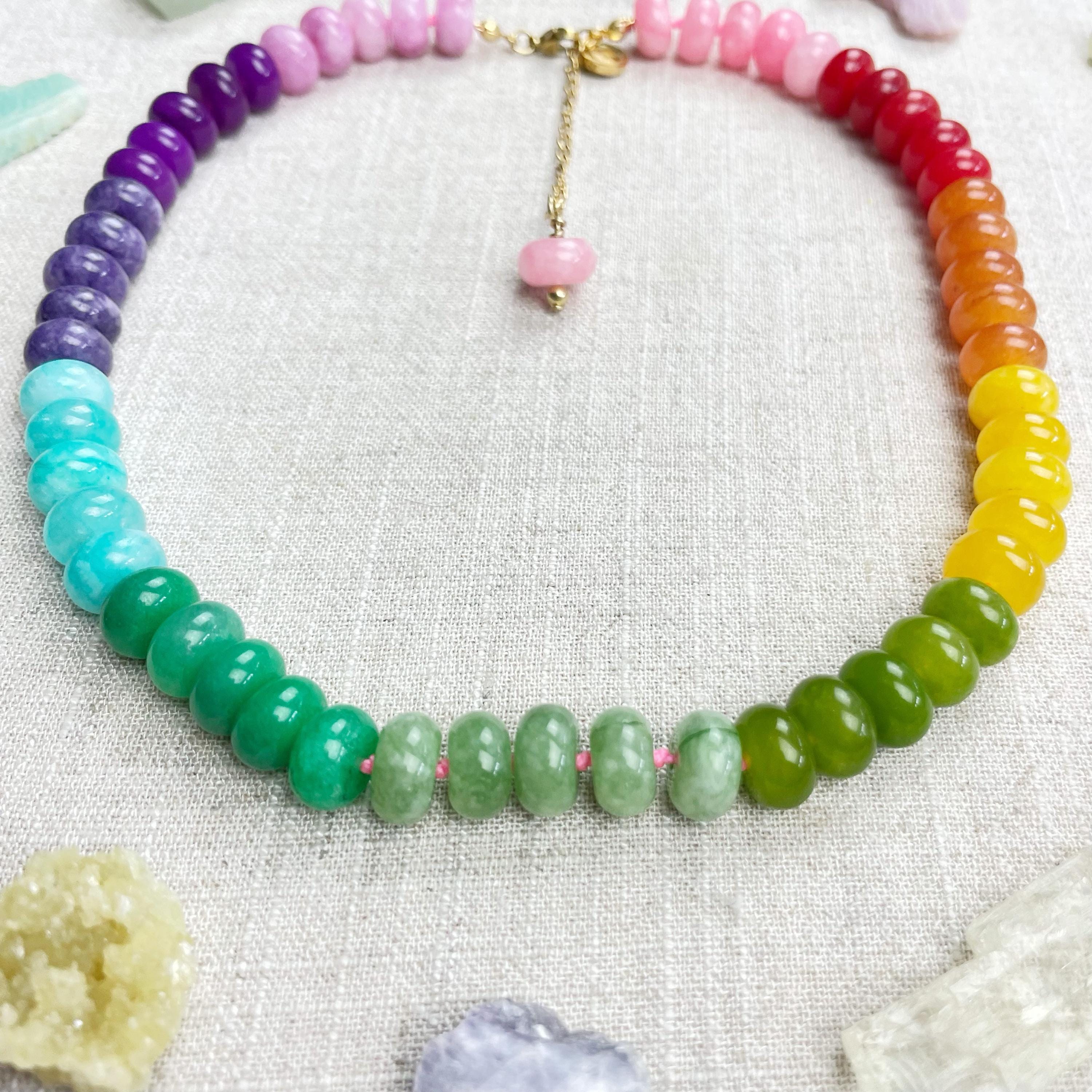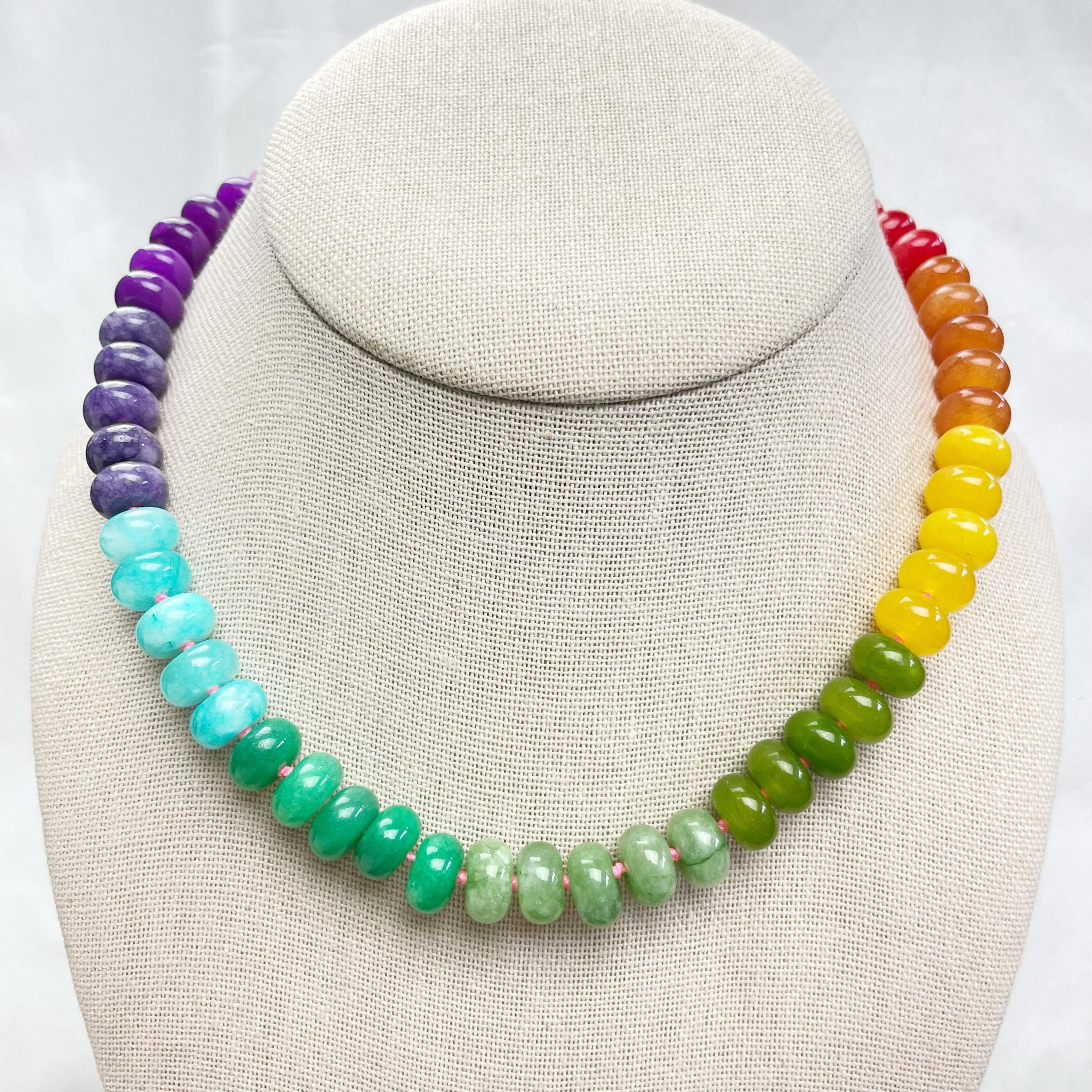 This necklace is made with gemstone beads. The beads are about 6x10mm. The bead are natural jade which has been dyed a different colors.
