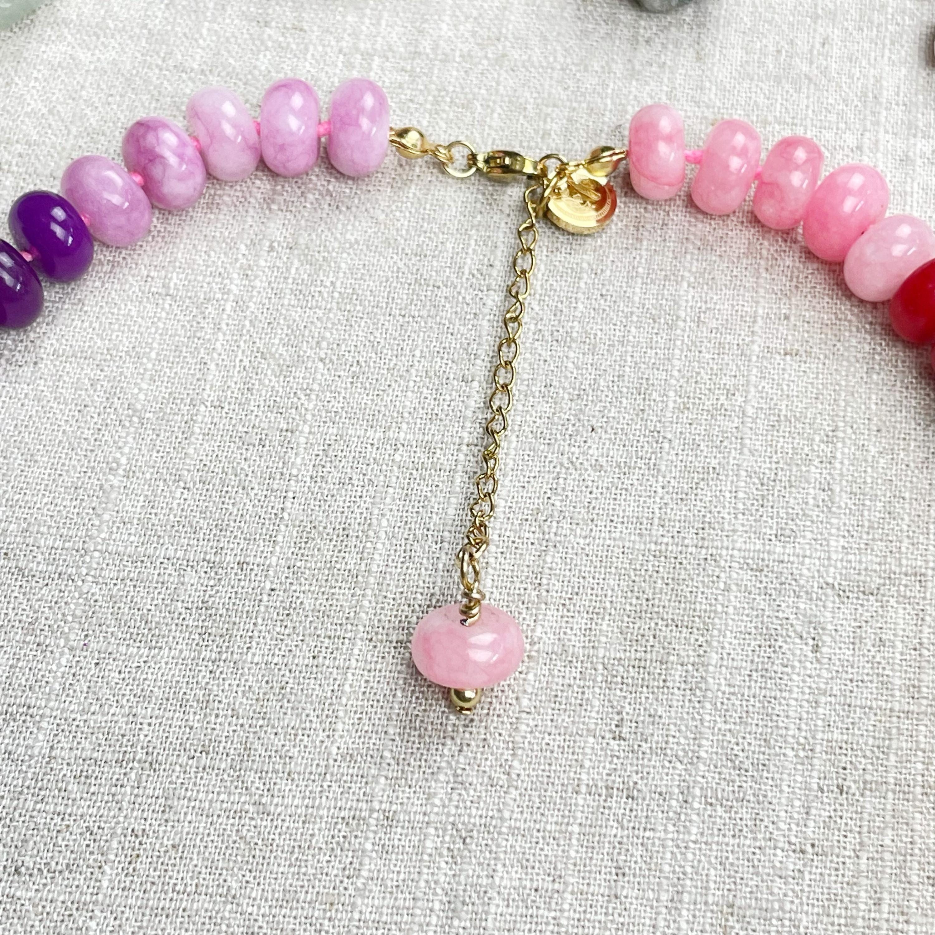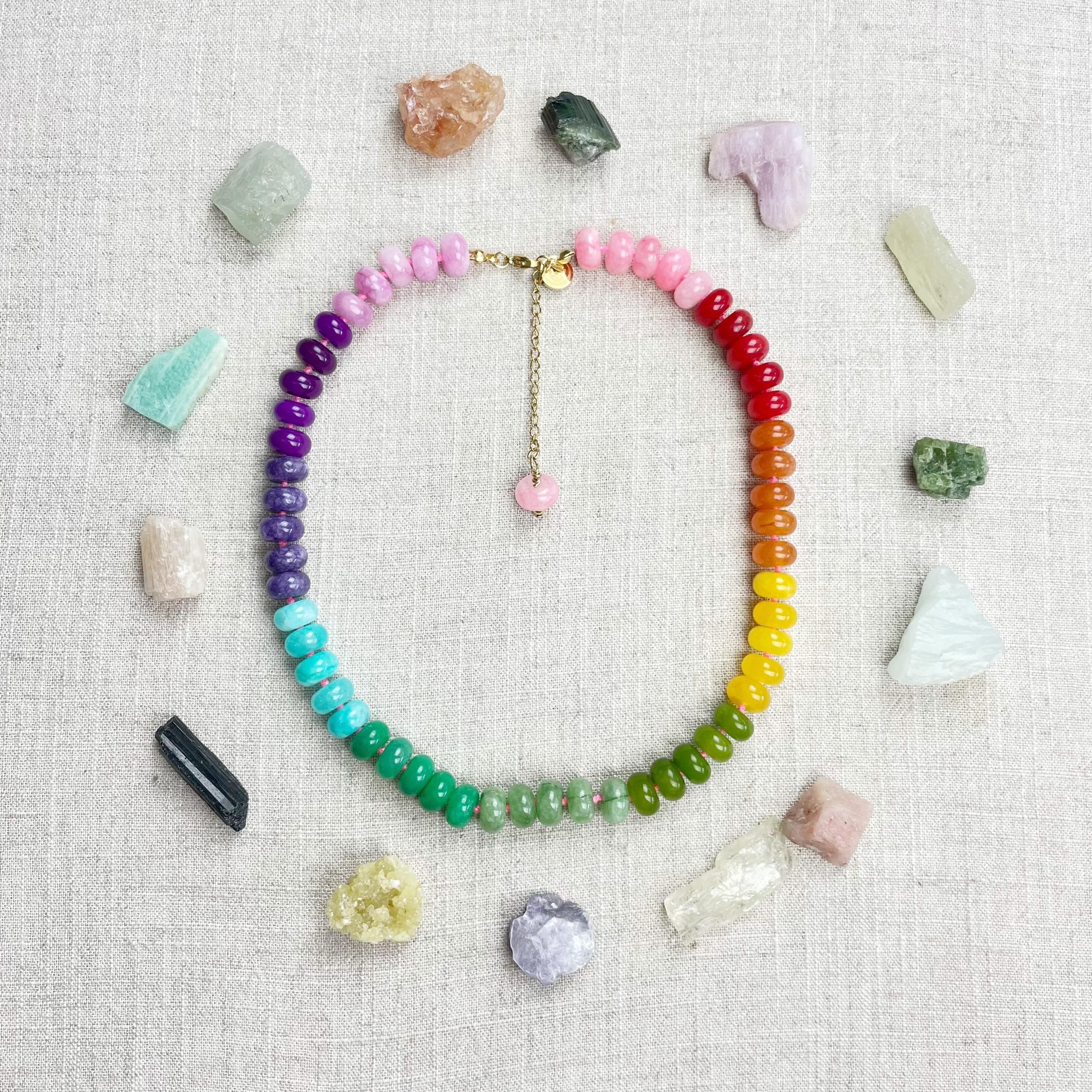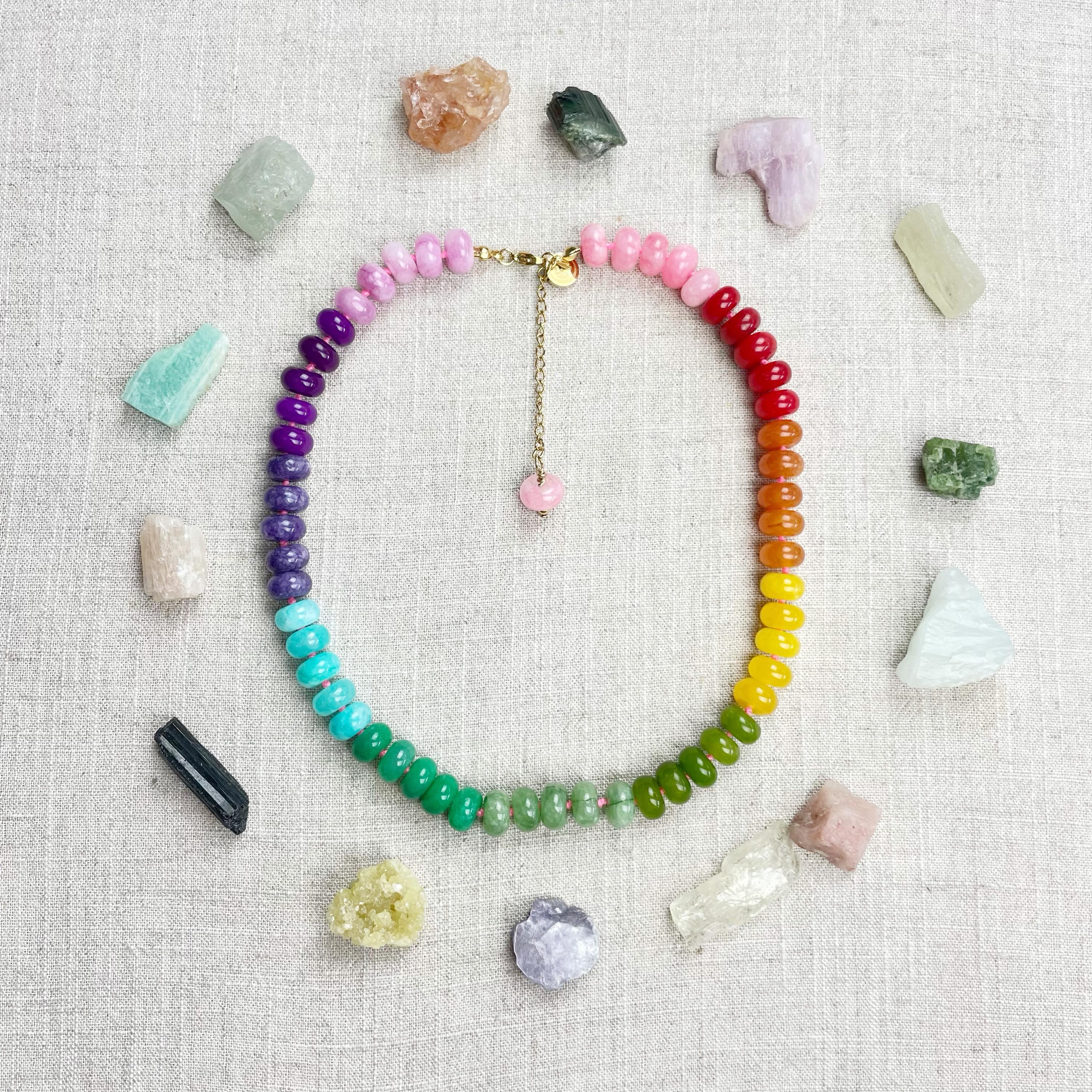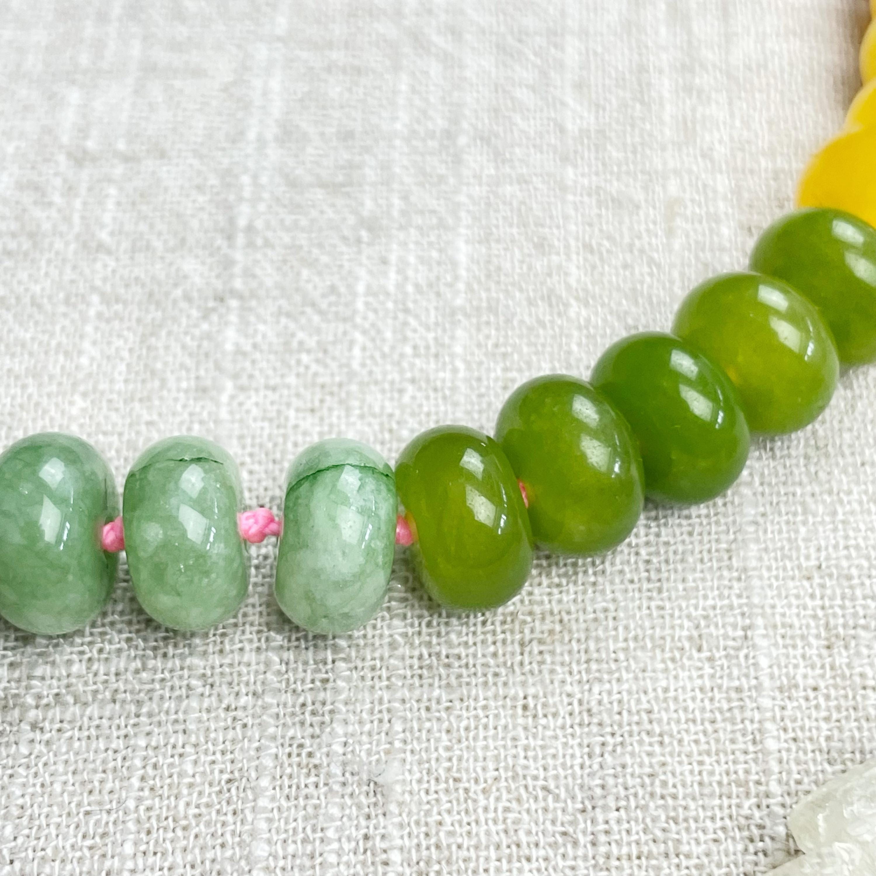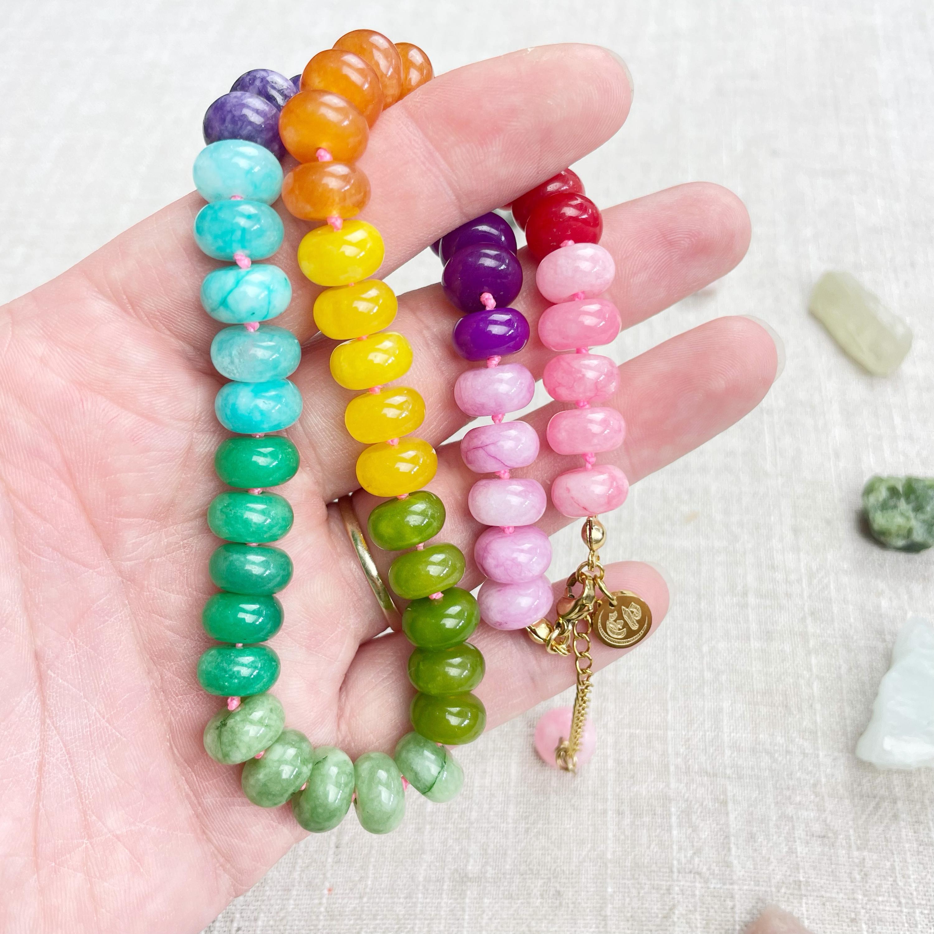 This necklace is made with gemstone beads. The beads are about 6x10mm. The bead are natural jade which has been dyed a different colors.