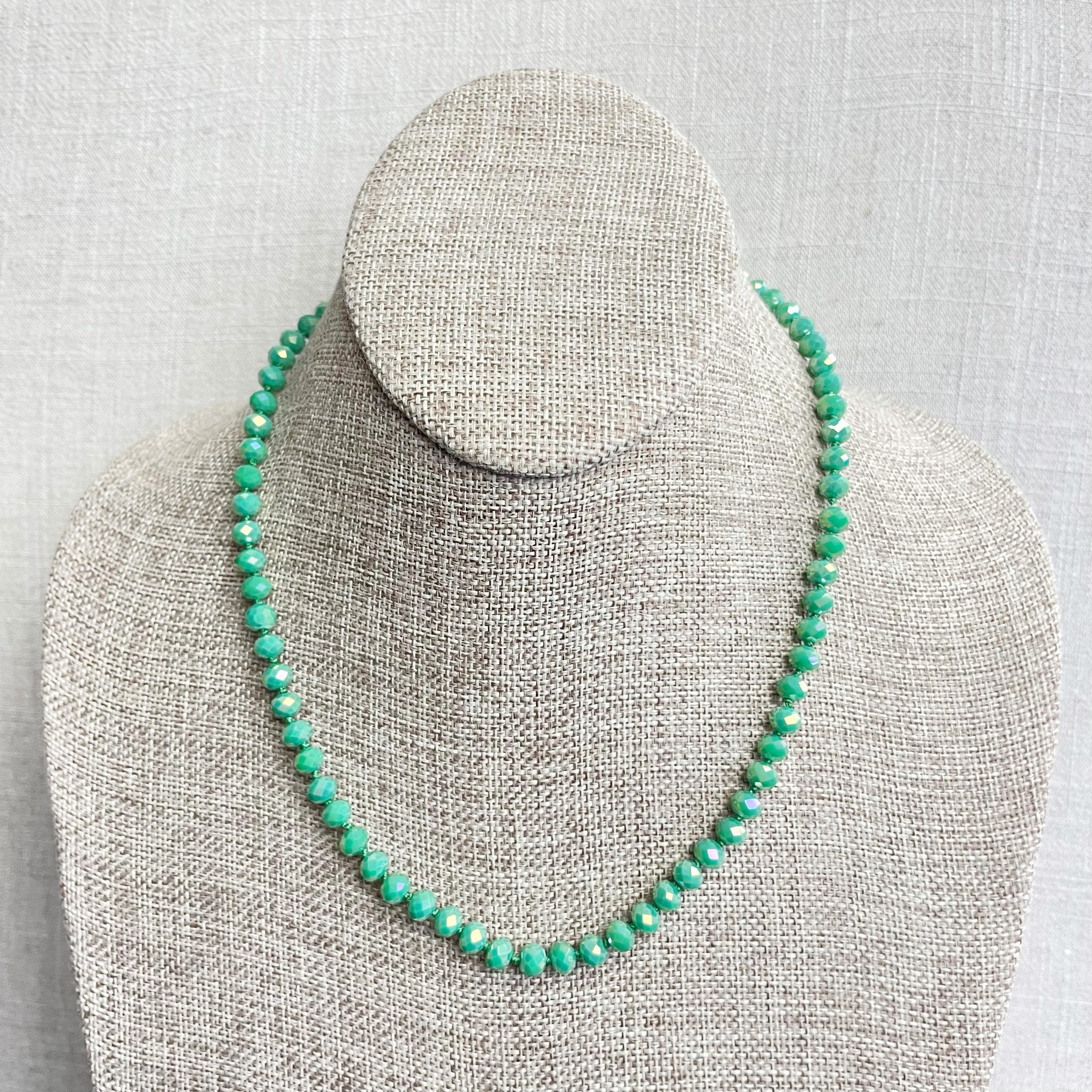 This necklace is made with glass crystal beads which are a green color with an iridescent shiny coating. The beads are 6mm faceted rondelle beads. Each bead is hand knotted with 100% nylon cord. The hand knotting in between each beads takes time to do but looks gorgeous making the necklace also very easy to wear. The necklace is finished off with a gold plated stainless steel chain, clasp and logo charm.