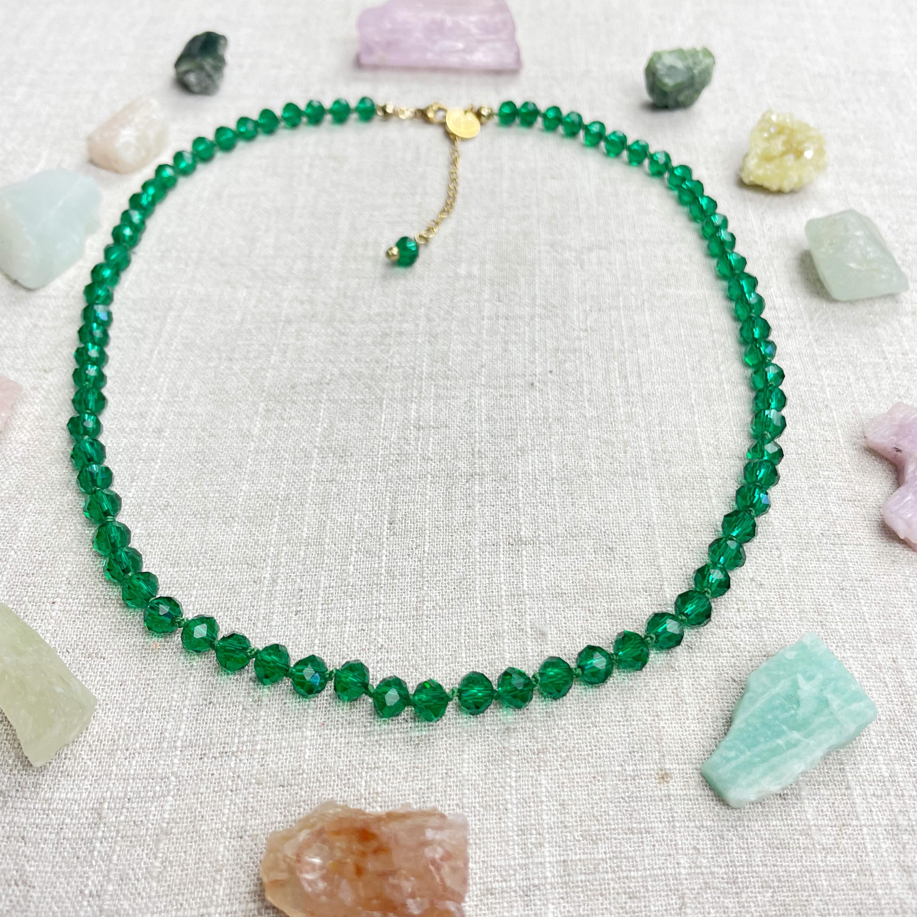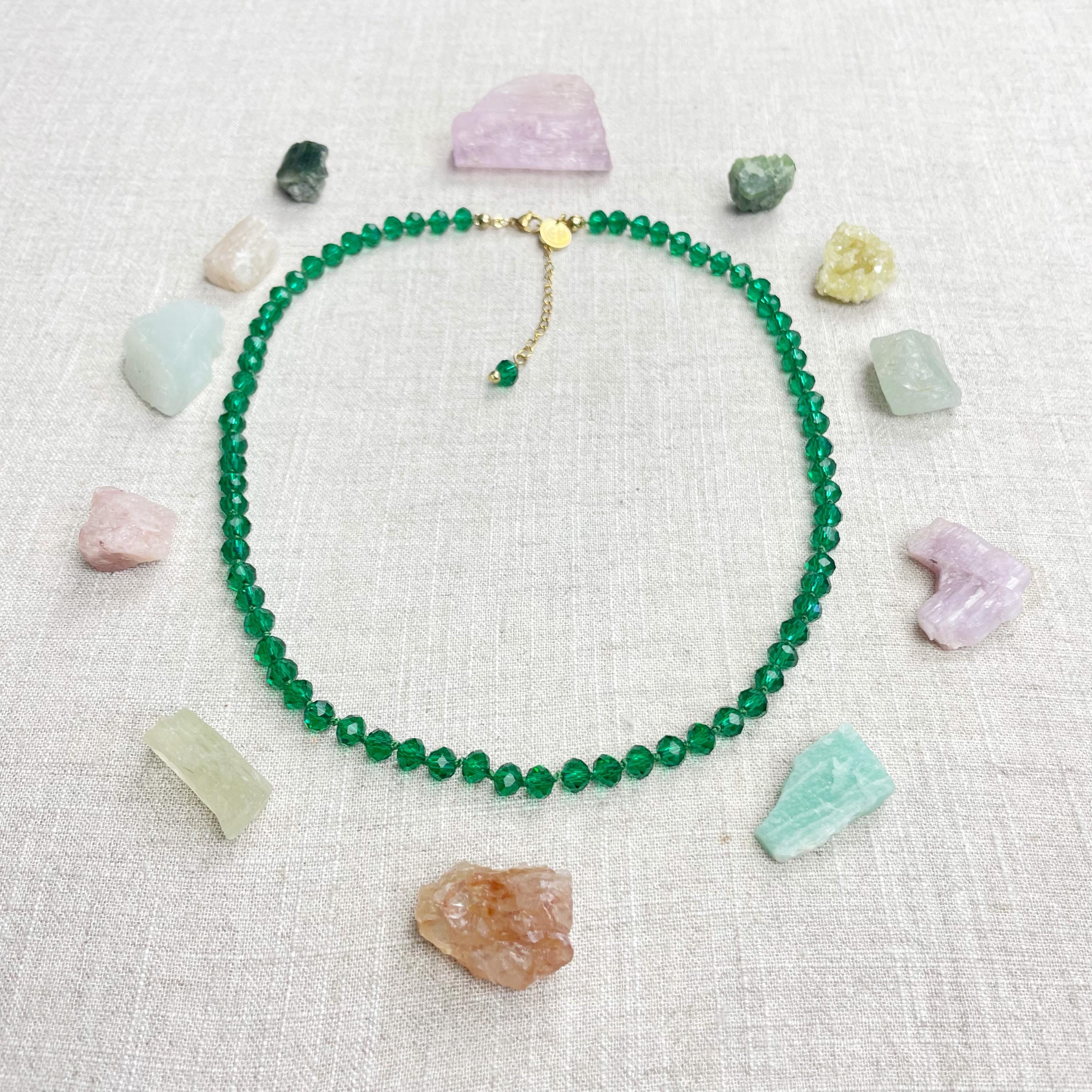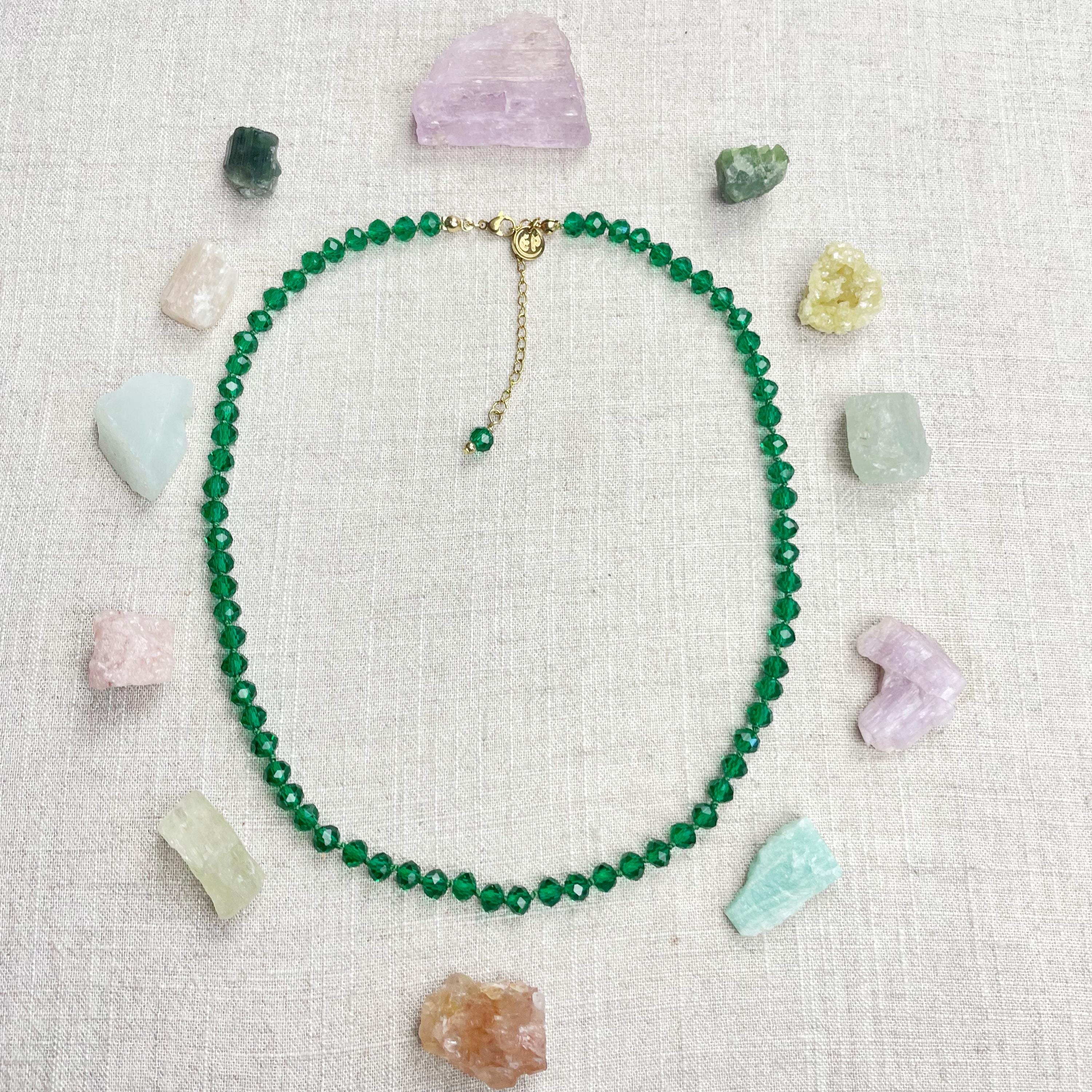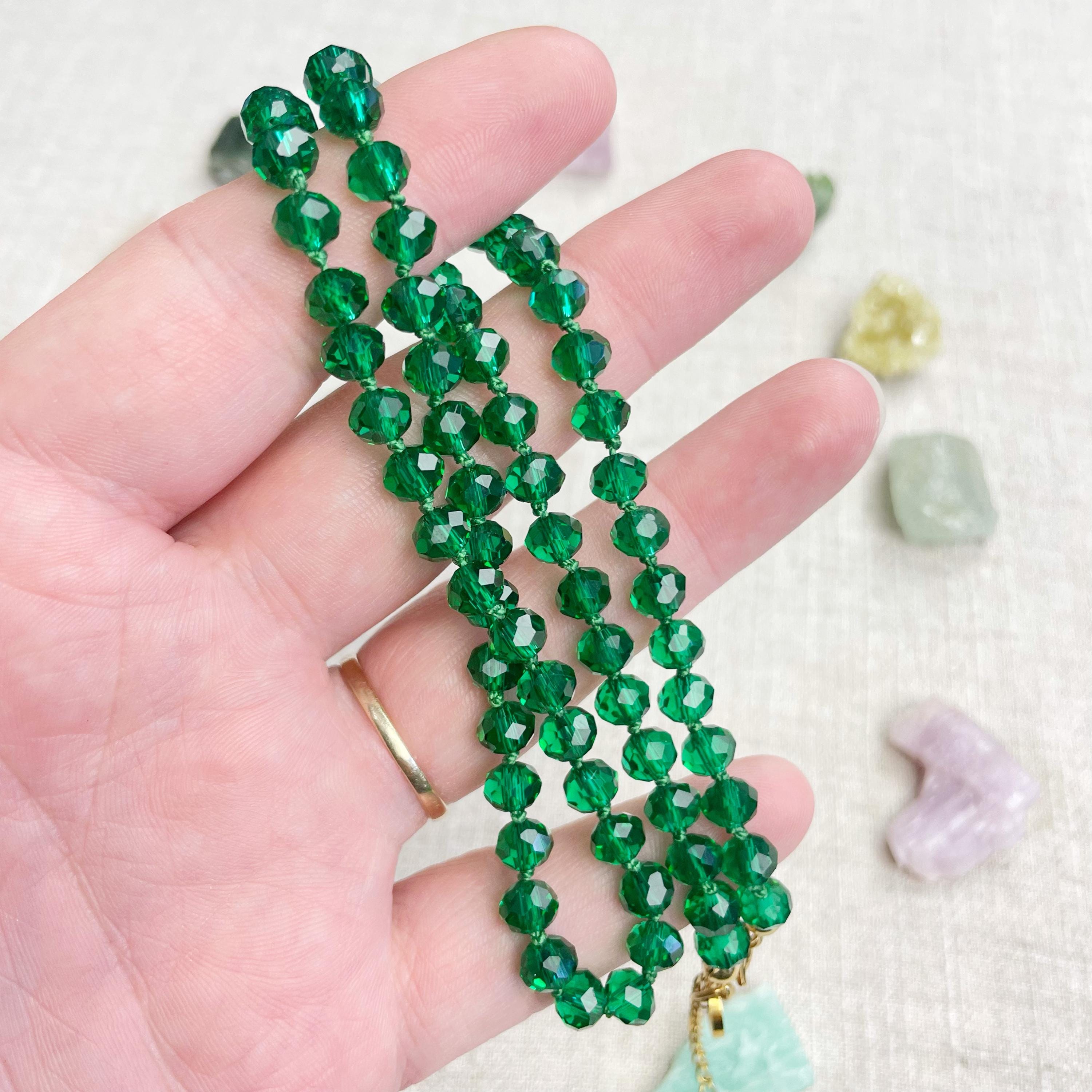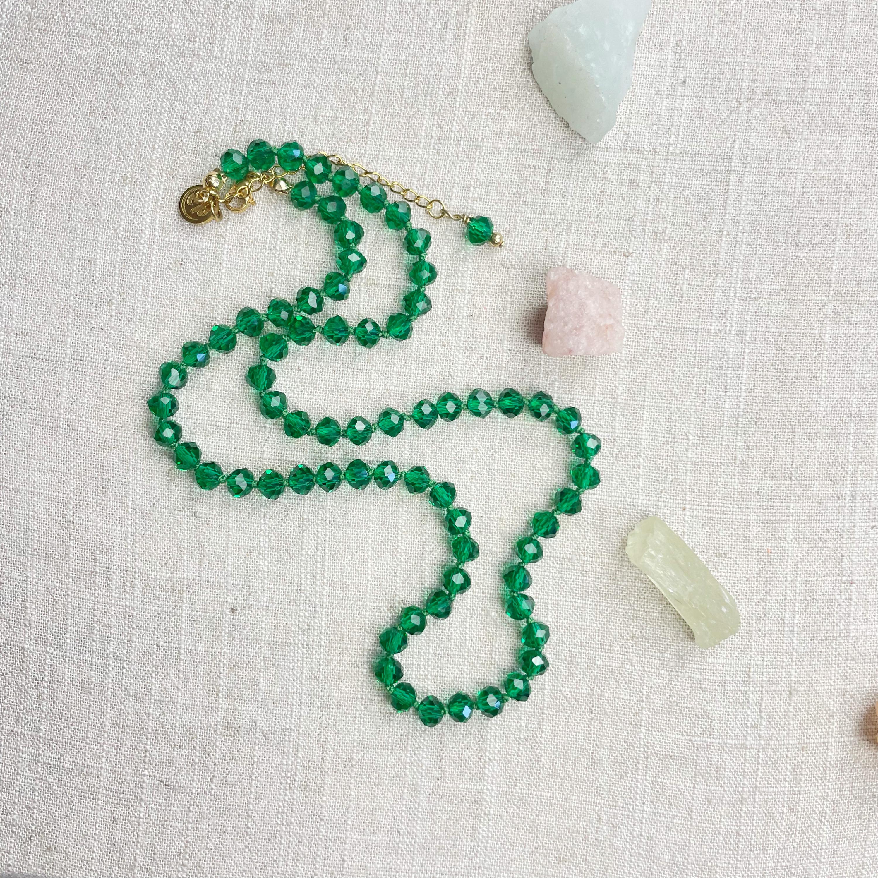 This necklace is made with glass crystal beads which are a translucent emerald green color. The beads are 6mm faceted rondelle beads. Each bead is hand knotted with 100% nylon cord. The hand knotting in between each beads takes time to do but looks gorgeous making the necklace also very easy to wear. The necklace is finished off with a gold plated stainless steel chain, clasp and logo charm.
