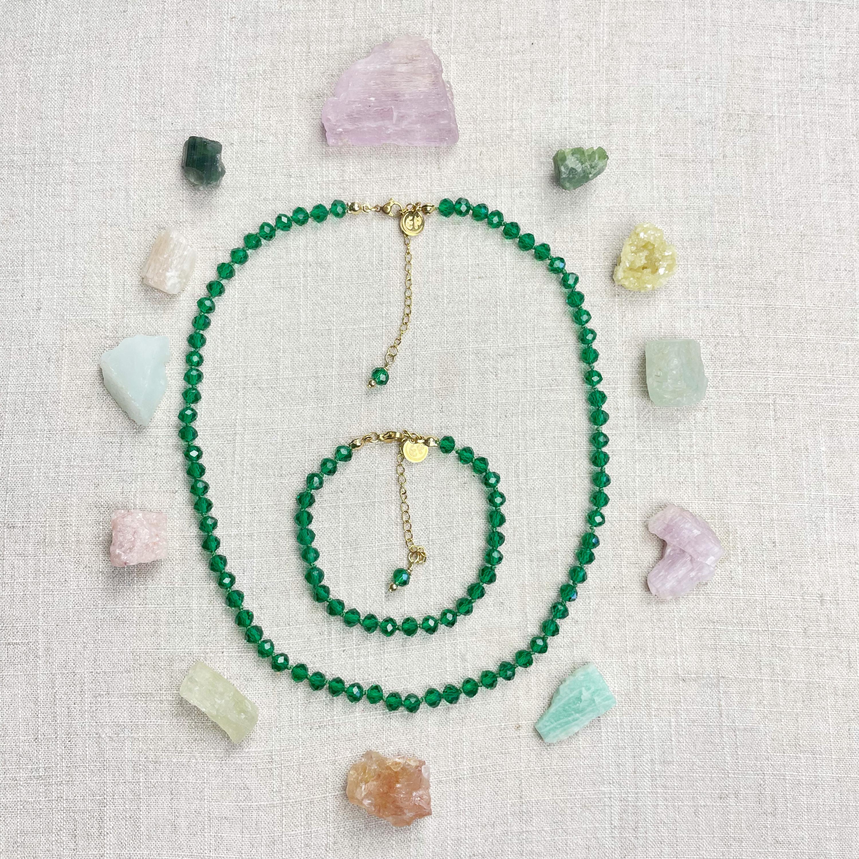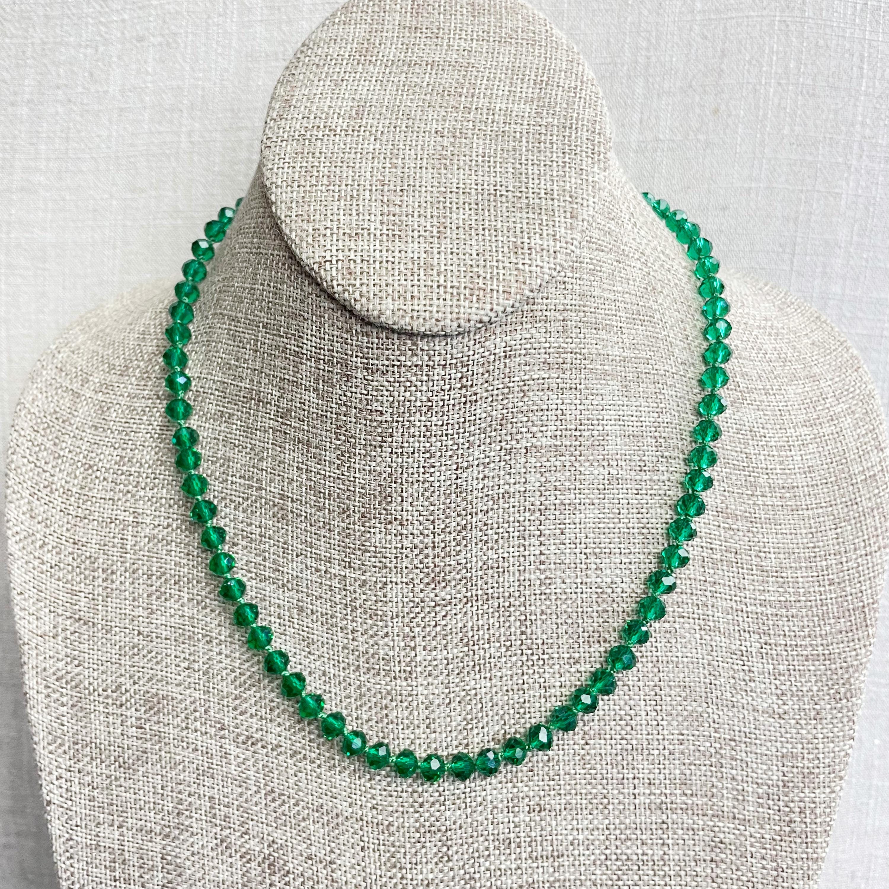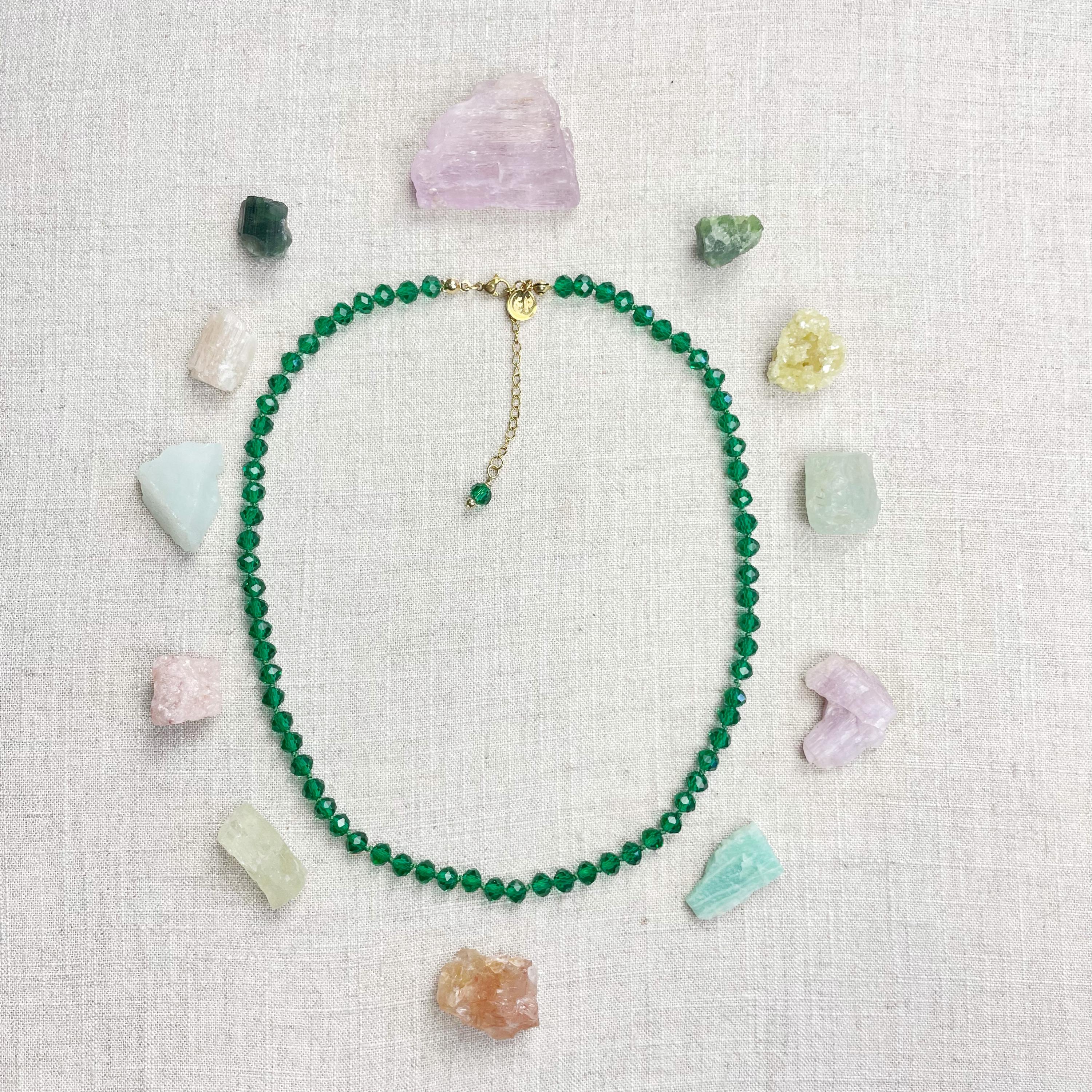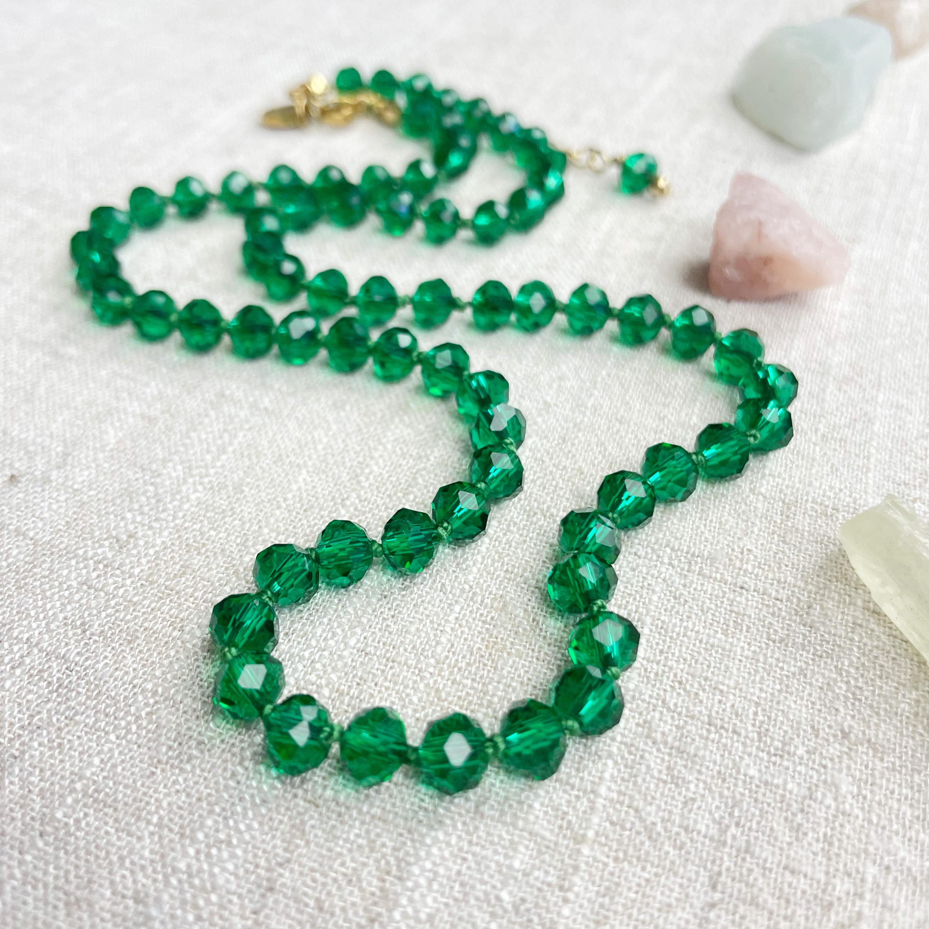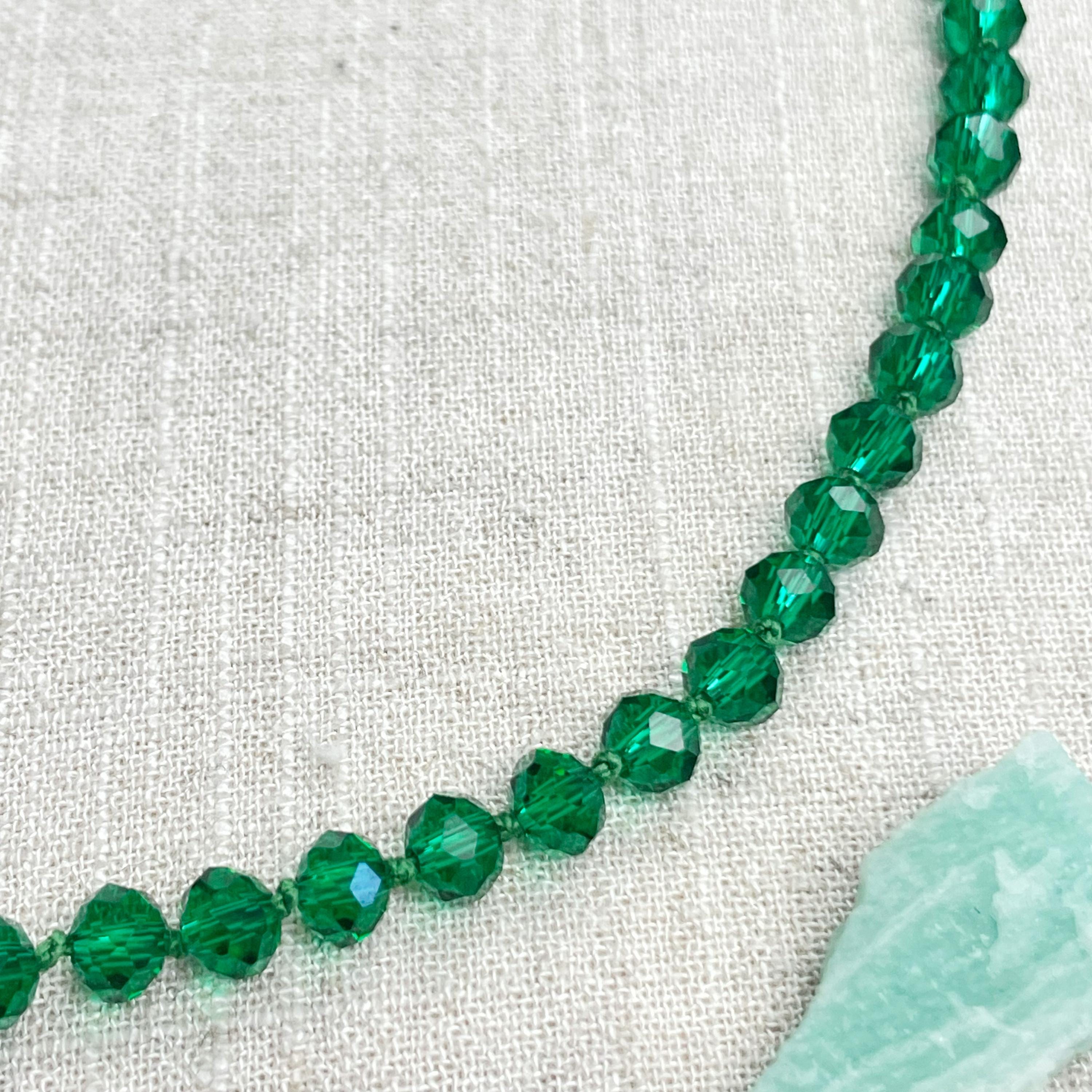 This necklace is made with glass crystal beads which are a translucent emerald green color. The beads are 6mm faceted rondelle beads. Each bead is hand knotted with 100% nylon cord. The hand knotting in between each beads takes time to do but looks gorgeous making the necklace also very easy to wear. The necklace is finished off with a gold plated stainless steel chain, clasp and logo charm.
