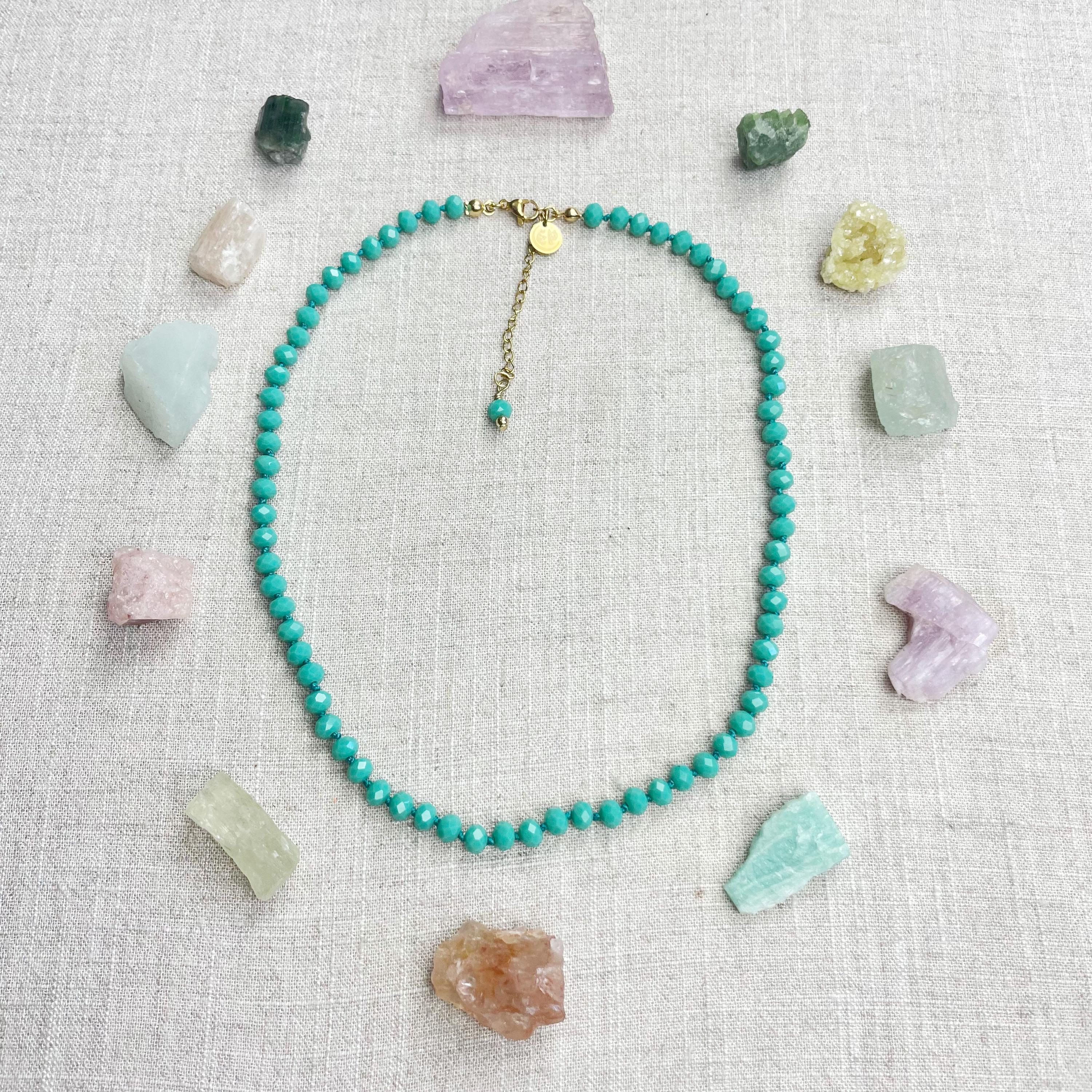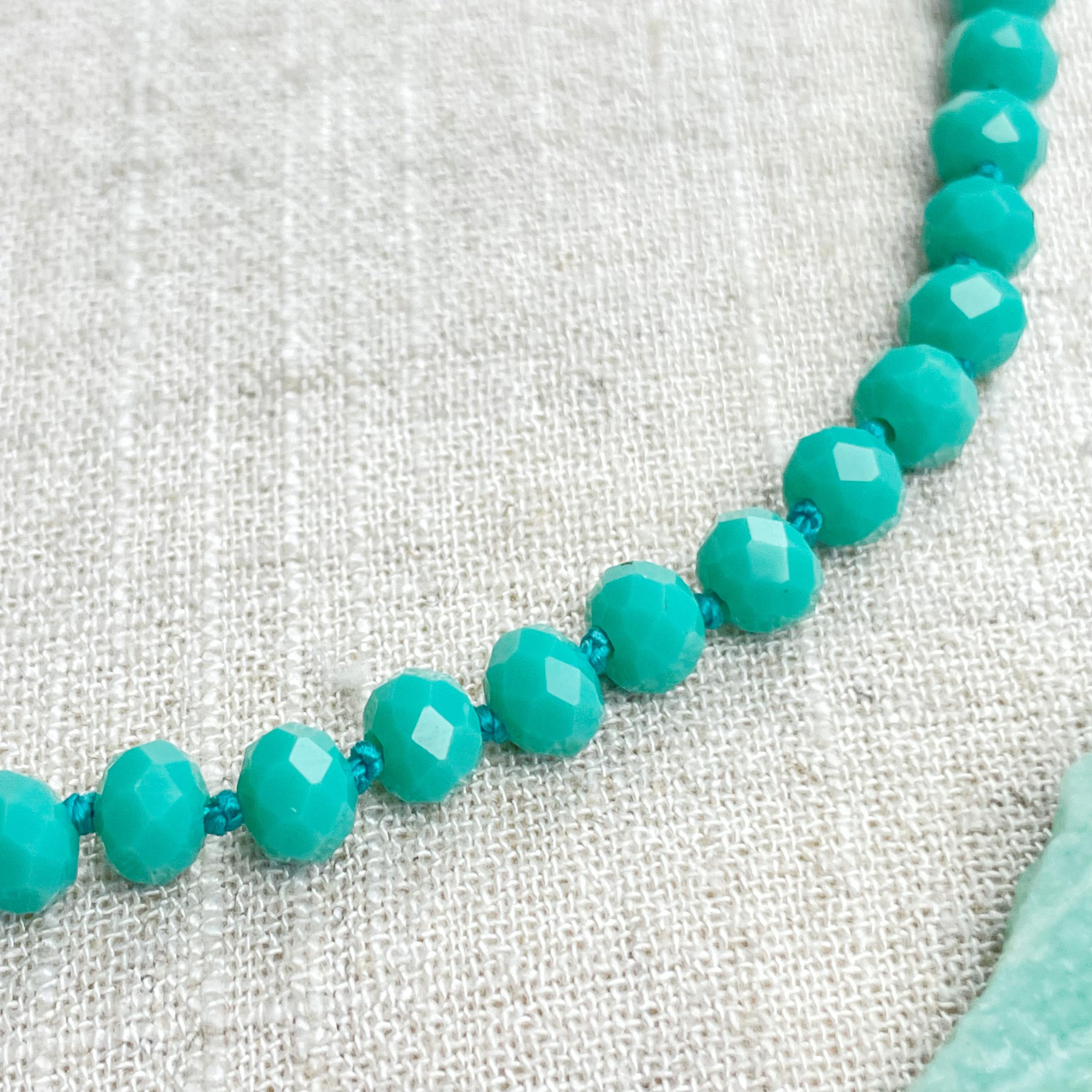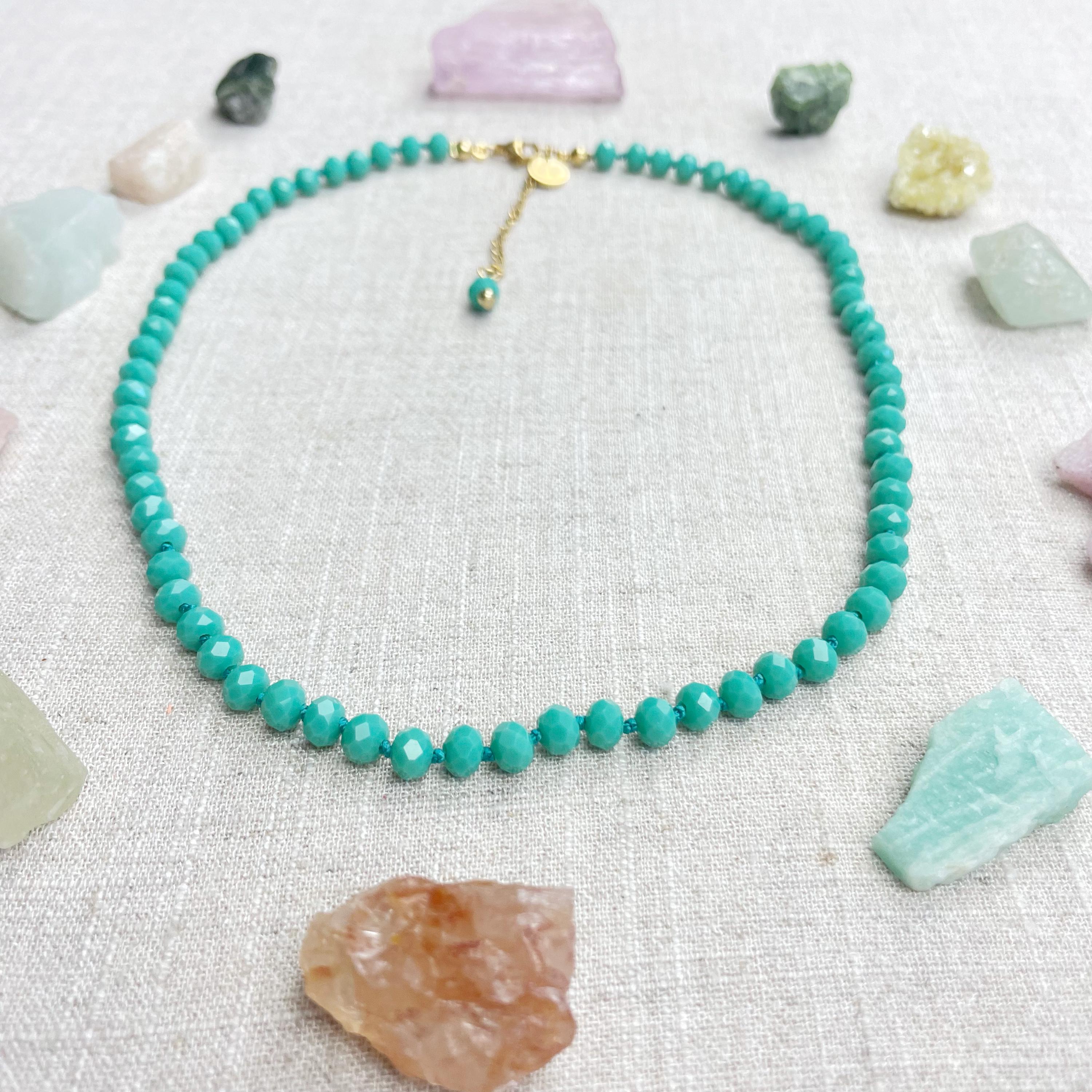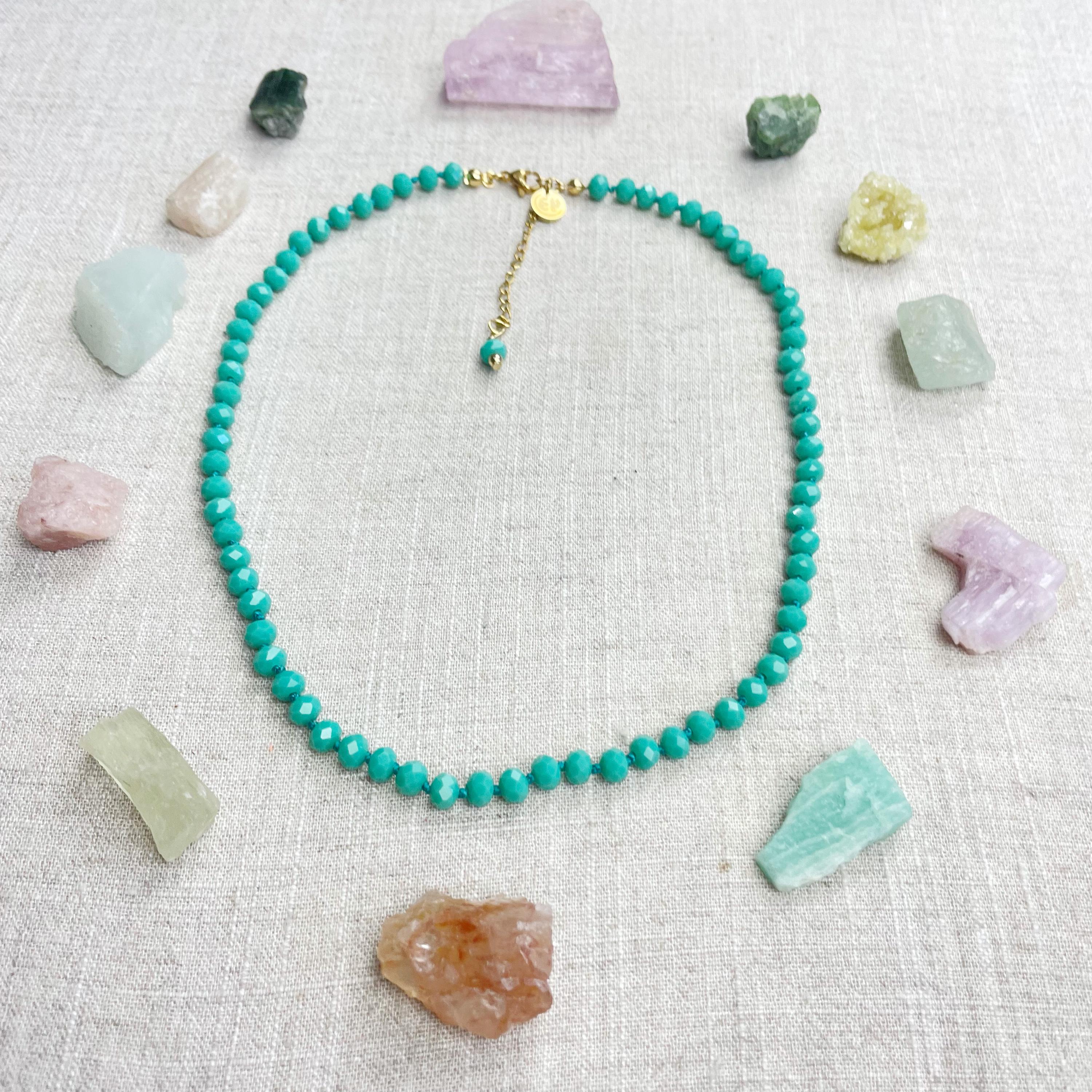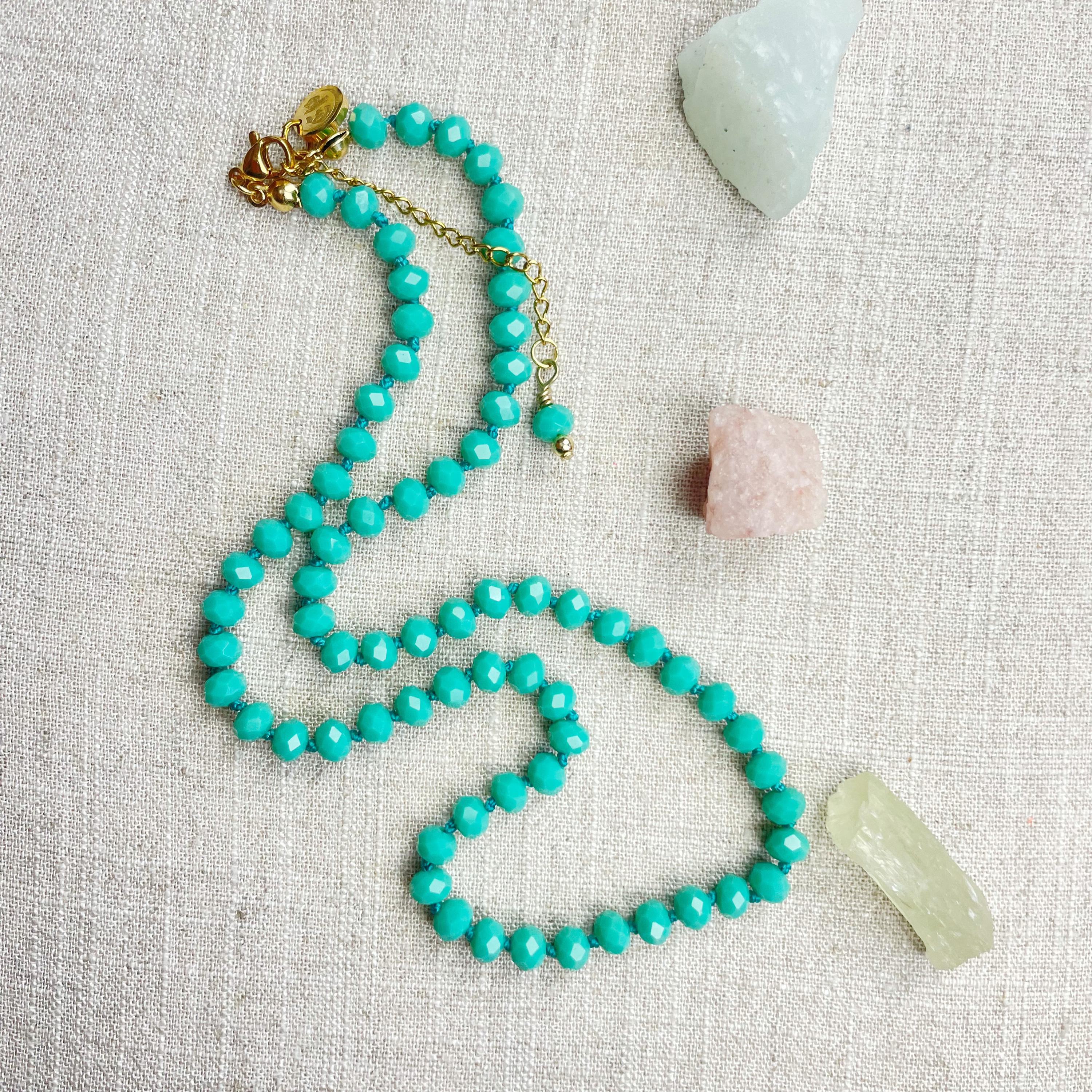 This necklace is made with glass crystal beads which are an opaque turquoise color. The beads are 6mm faceted rondelle beads. Each bead is hand knotted with 100% nylon cord. The hand knotting in between each beads takes time to do but looks gorgeous making the necklace also very easy to wear. The necklace is finished off with a gold plated stainless steel chain, clasp and logo charm.