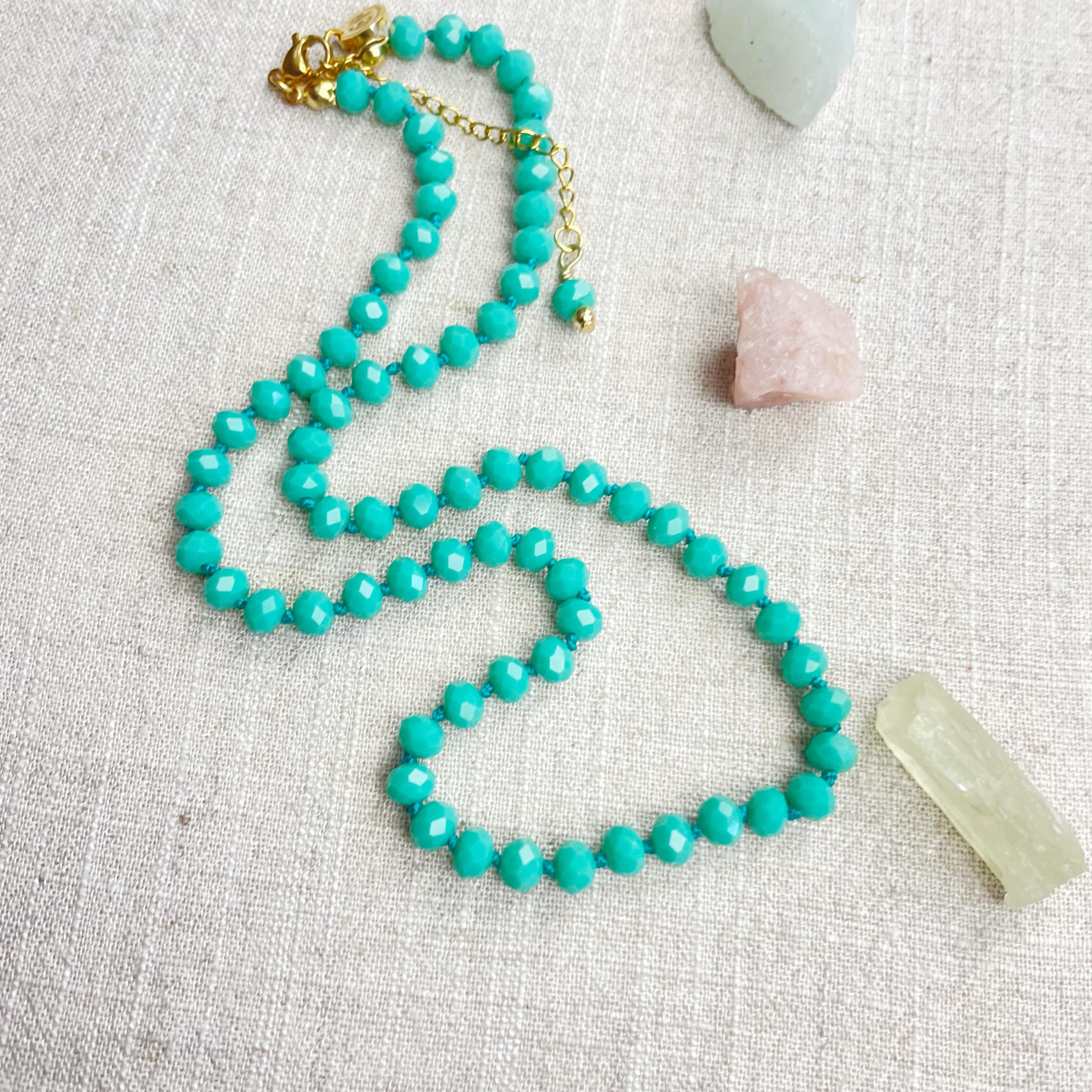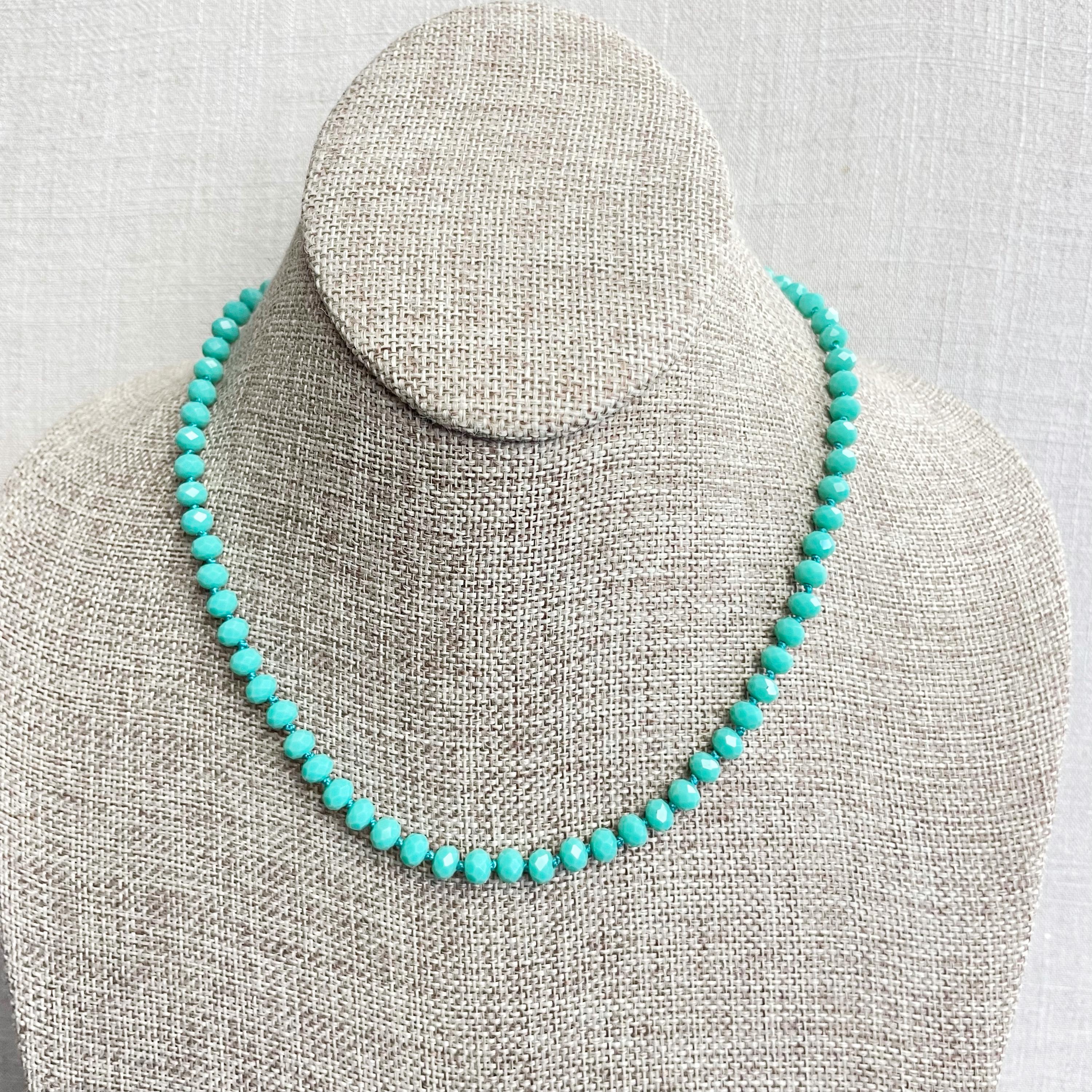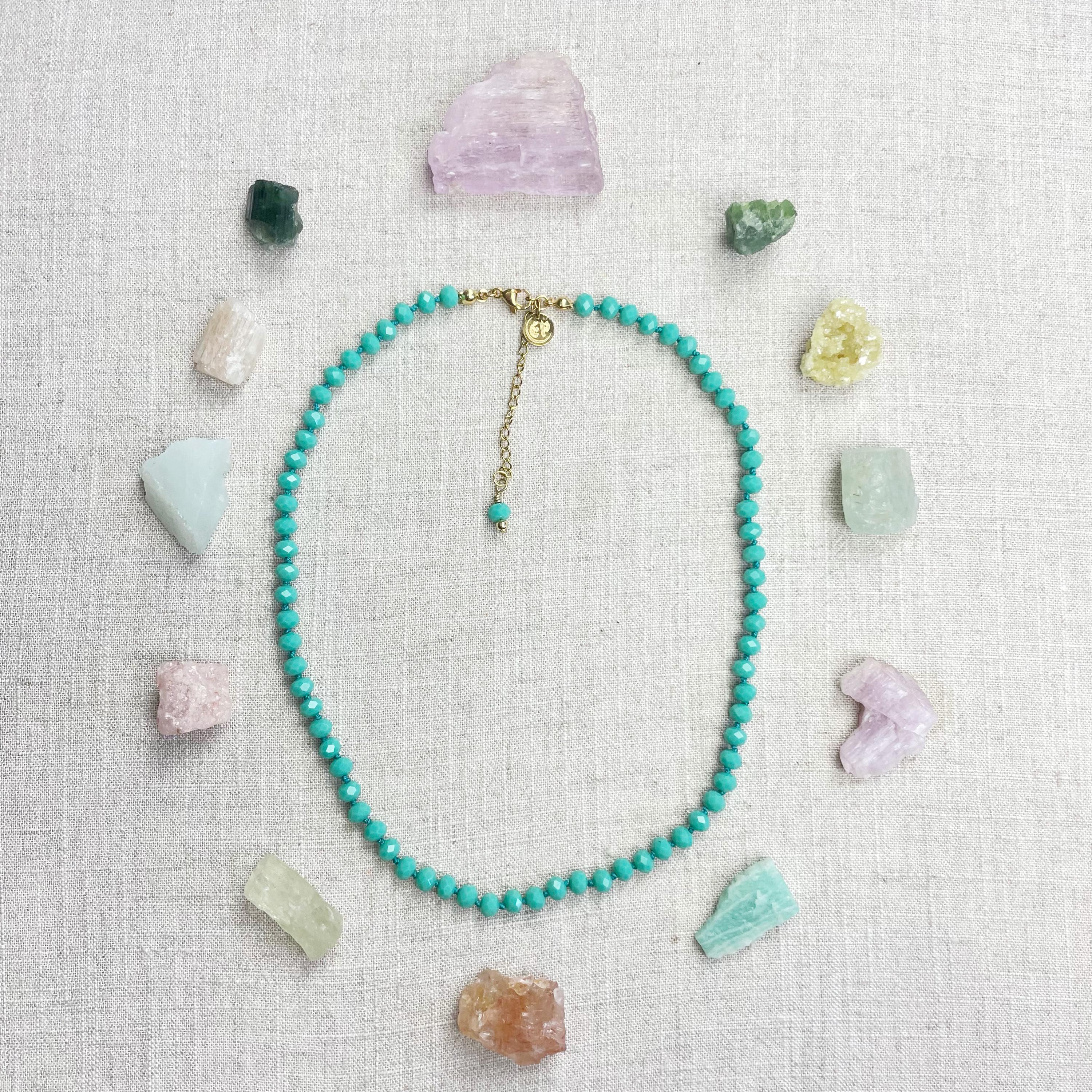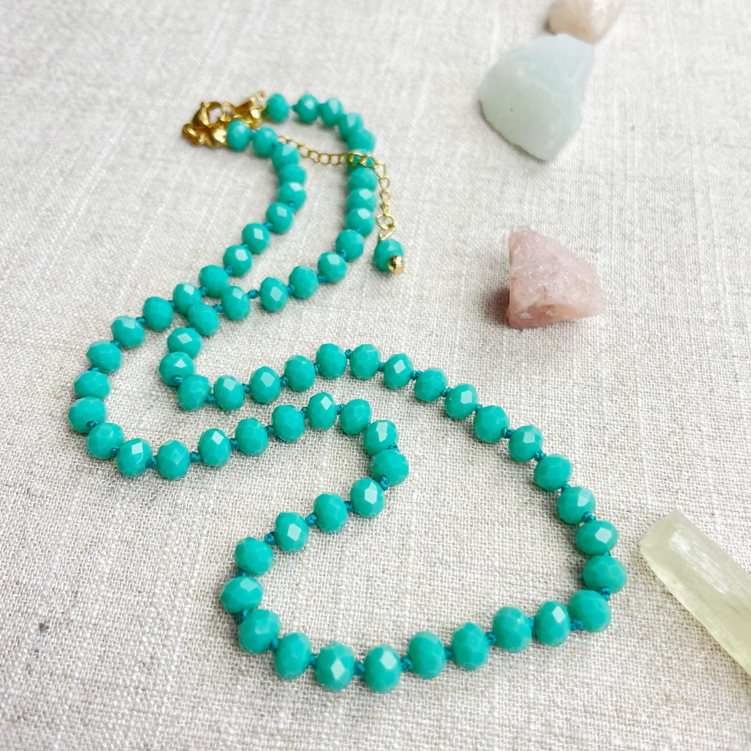 This necklace is made with glass crystal beads which are an opaque turquoise color. The beads are 6mm faceted rondelle beads. Each bead is hand knotted with 100% nylon cord. The hand knotting in between each beads takes time to do but looks gorgeous making the necklace also very easy to wear. The necklace is finished off with a gold plated stainless steel chain, clasp and logo charm.