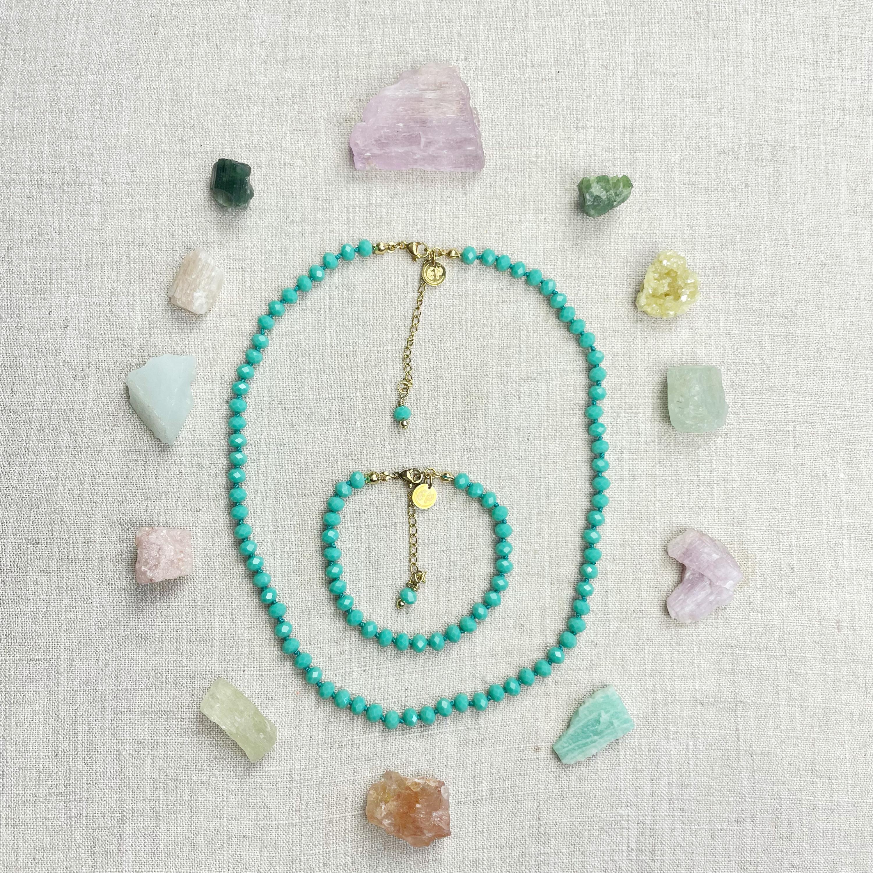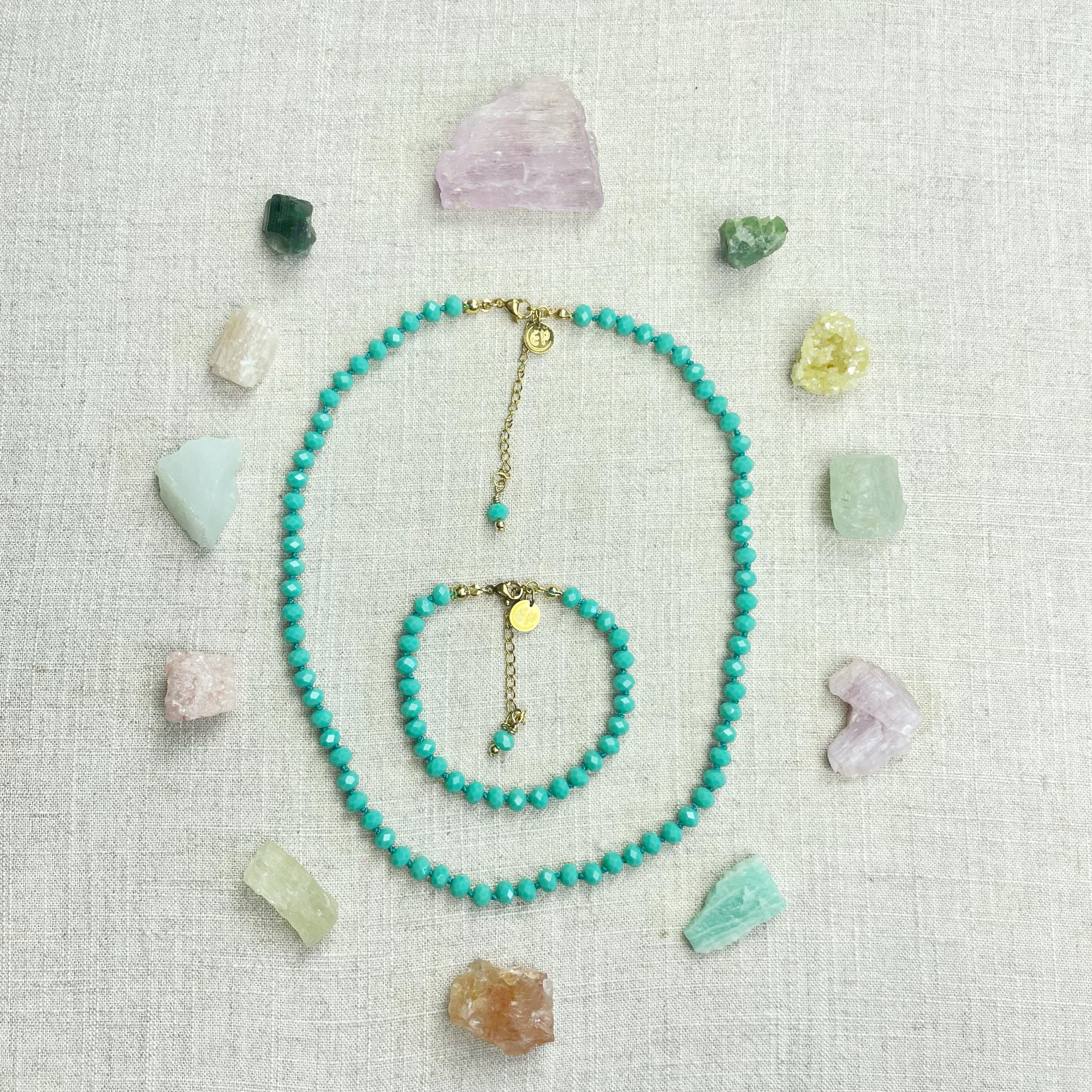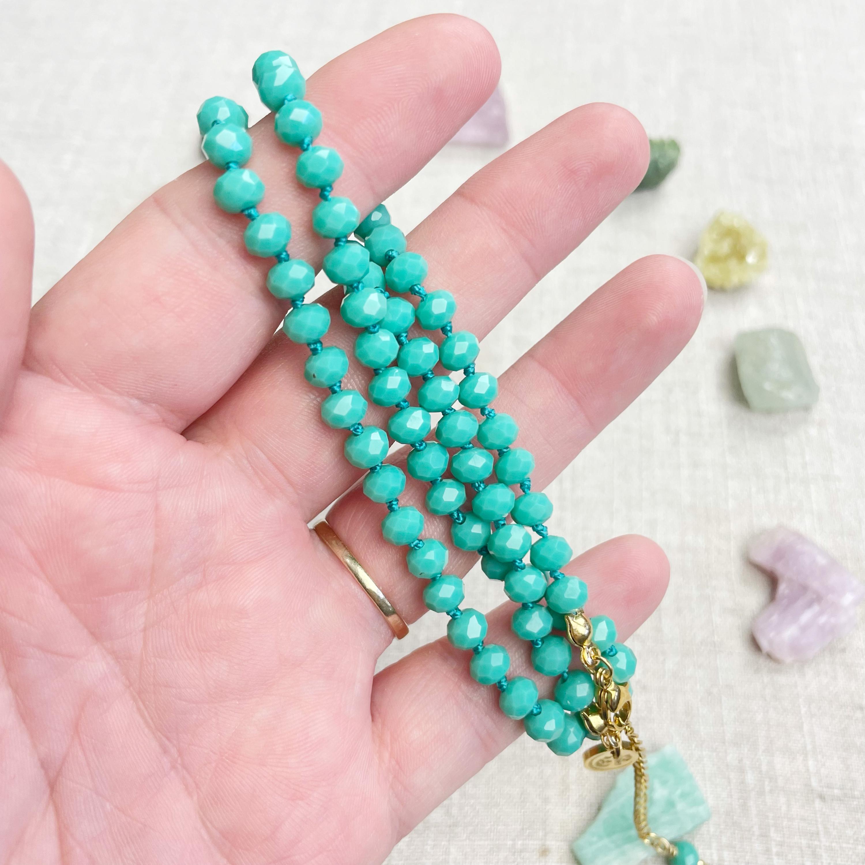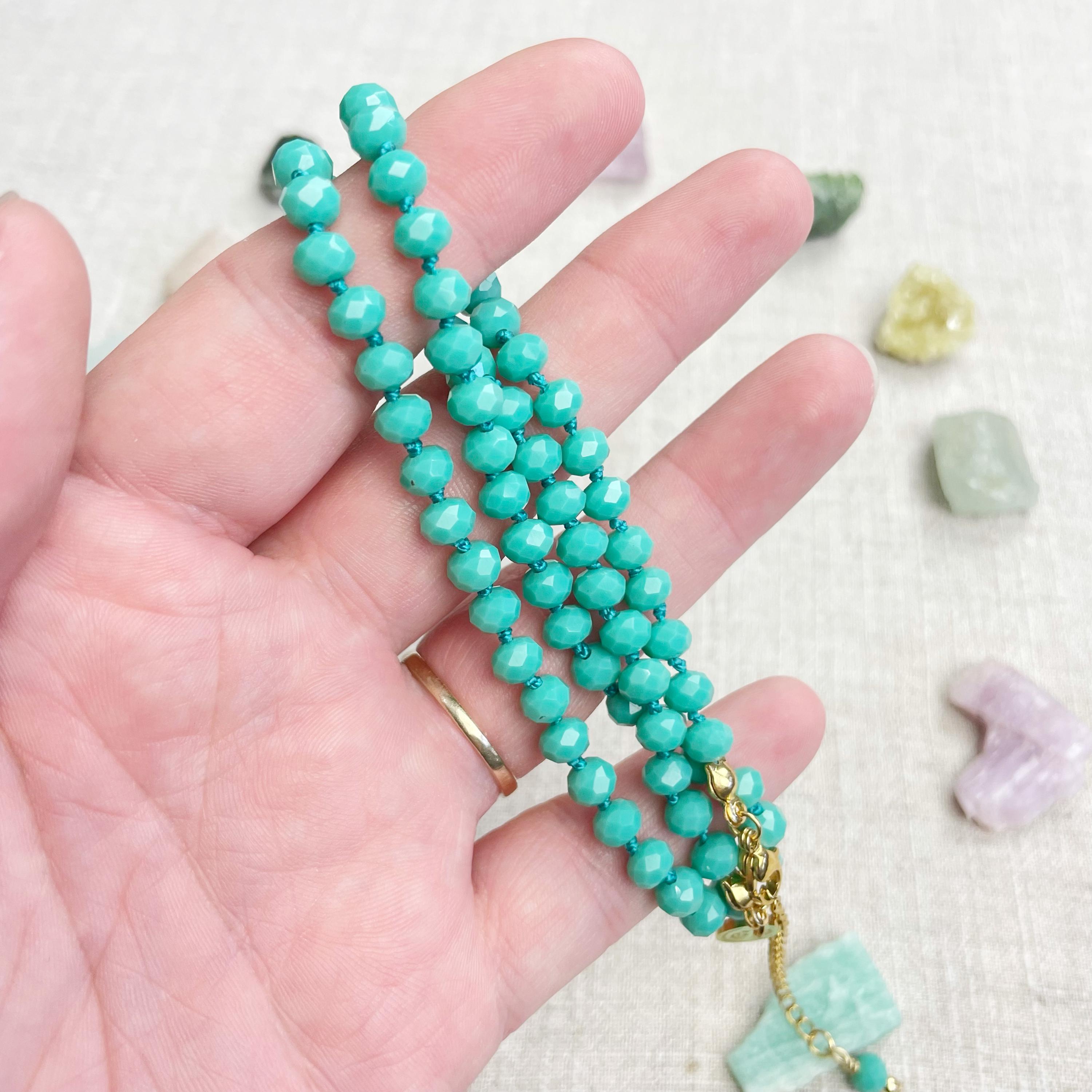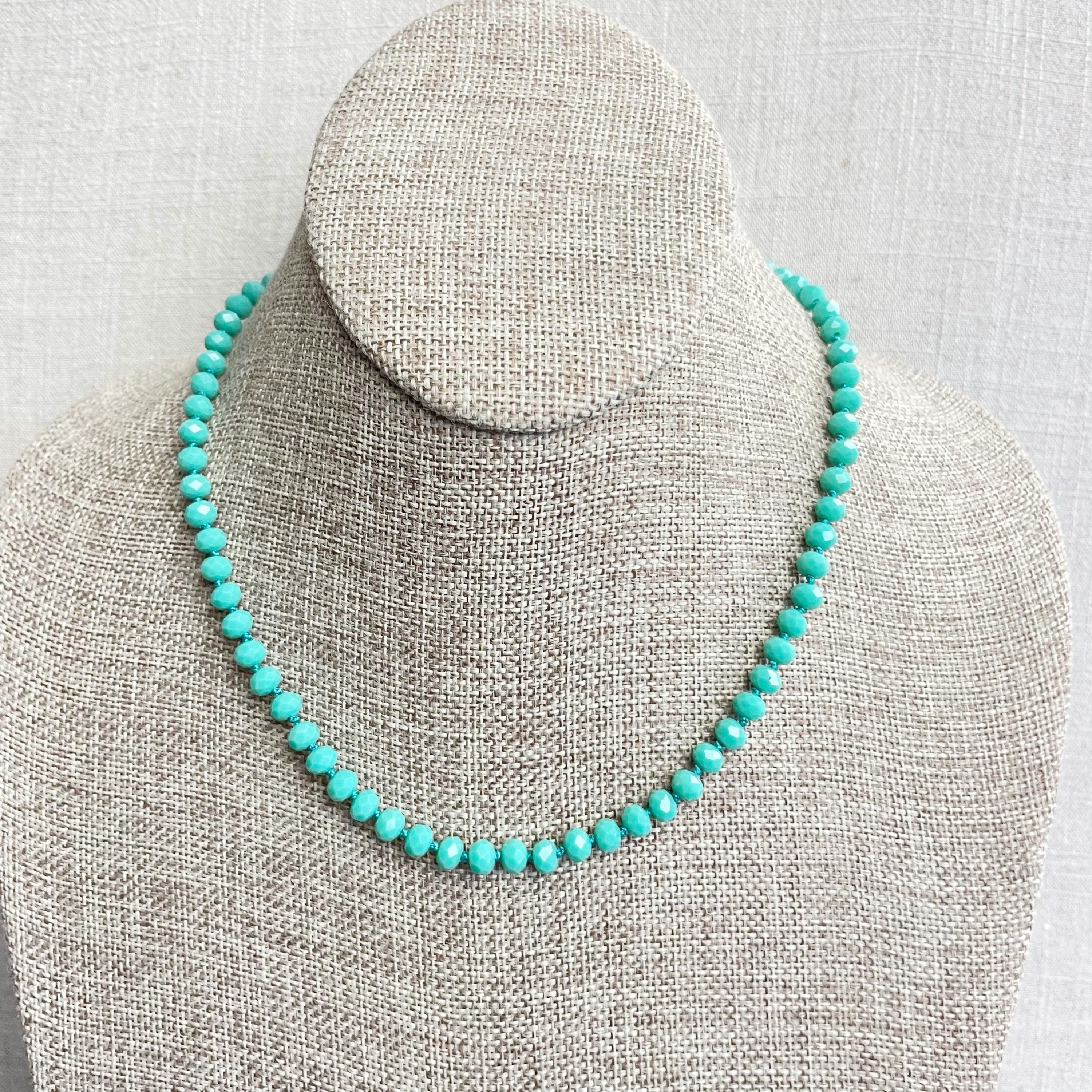 This necklace is made with glass crystal beads which are an opaque turquoise color. The beads are 6mm faceted rondelle beads. Each bead is hand knotted with 100% nylon cord. The hand knotting in between each beads takes time to do but looks gorgeous making the necklace also very easy to wear. The necklace is finished off with a gold plated stainless steel chain, clasp and logo charm.