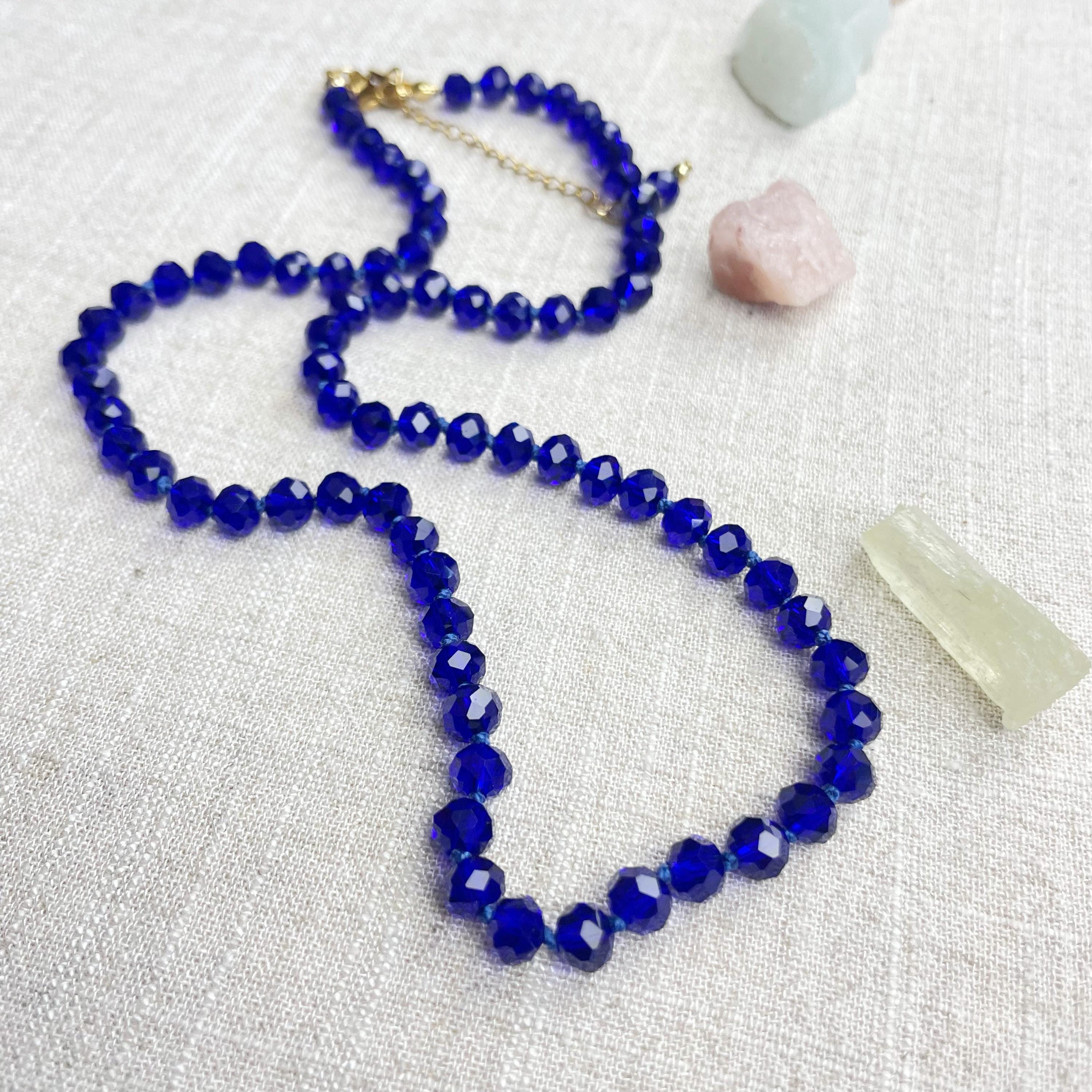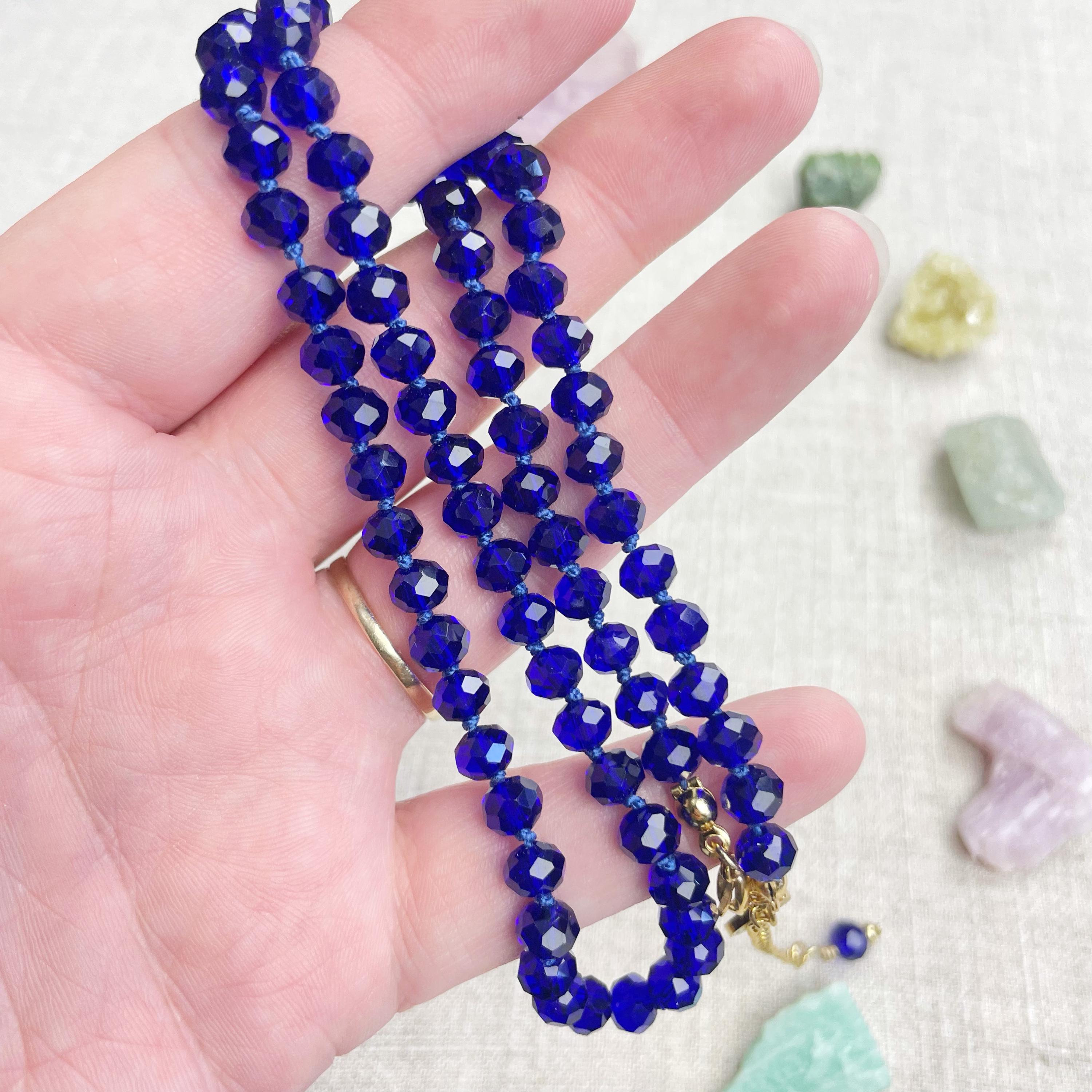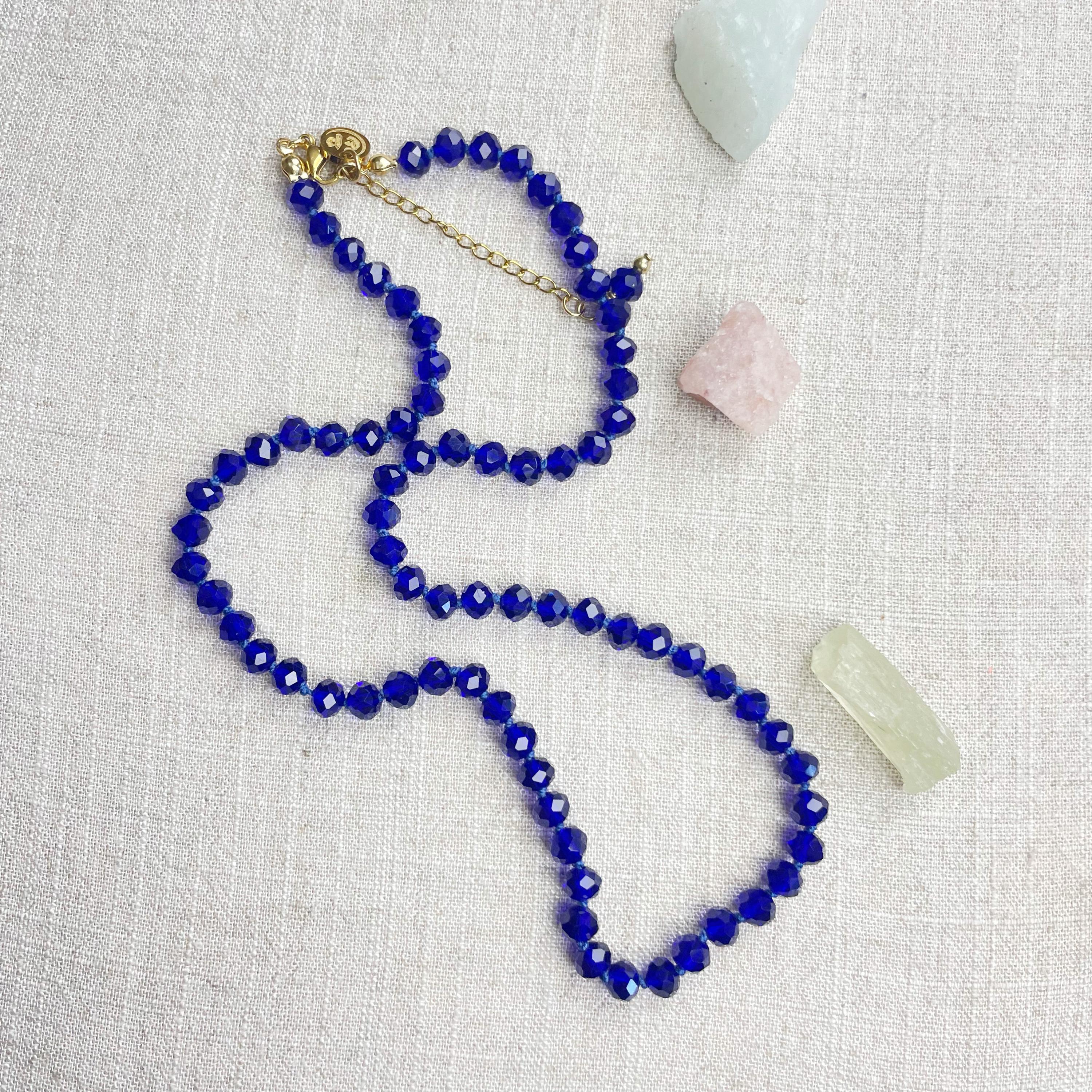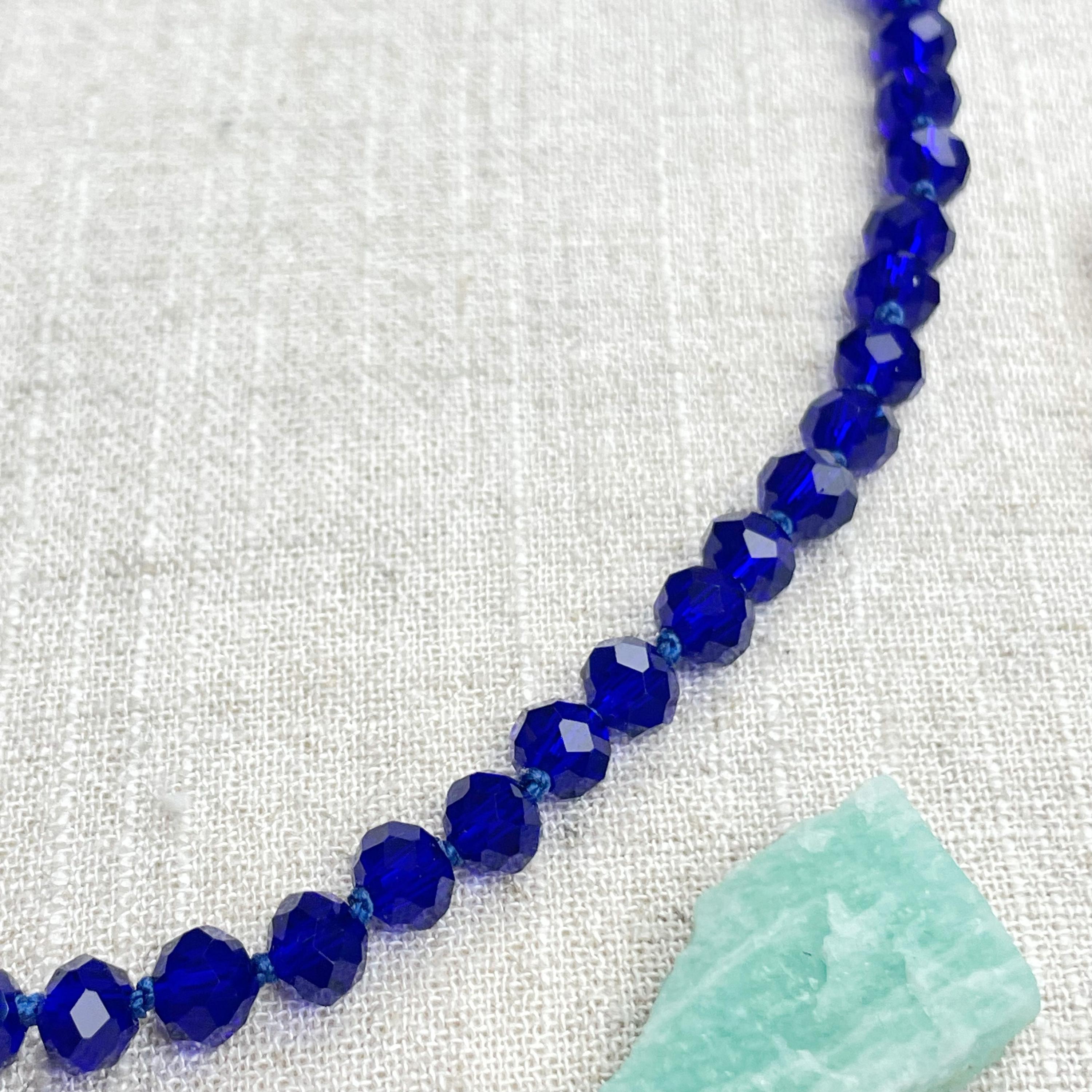 This necklace is made with glass crystal beads which are a translucent dark blue color. The beads are 6mm faceted rondelle beads. Each bead is hand knotted with 100% nylon cord. The hand knotting in between each beads takes time to do but looks gorgeous making the necklace also very easy to wear. The necklace is finished off with a gold plated stainless steel chain, clasp and logo charm.