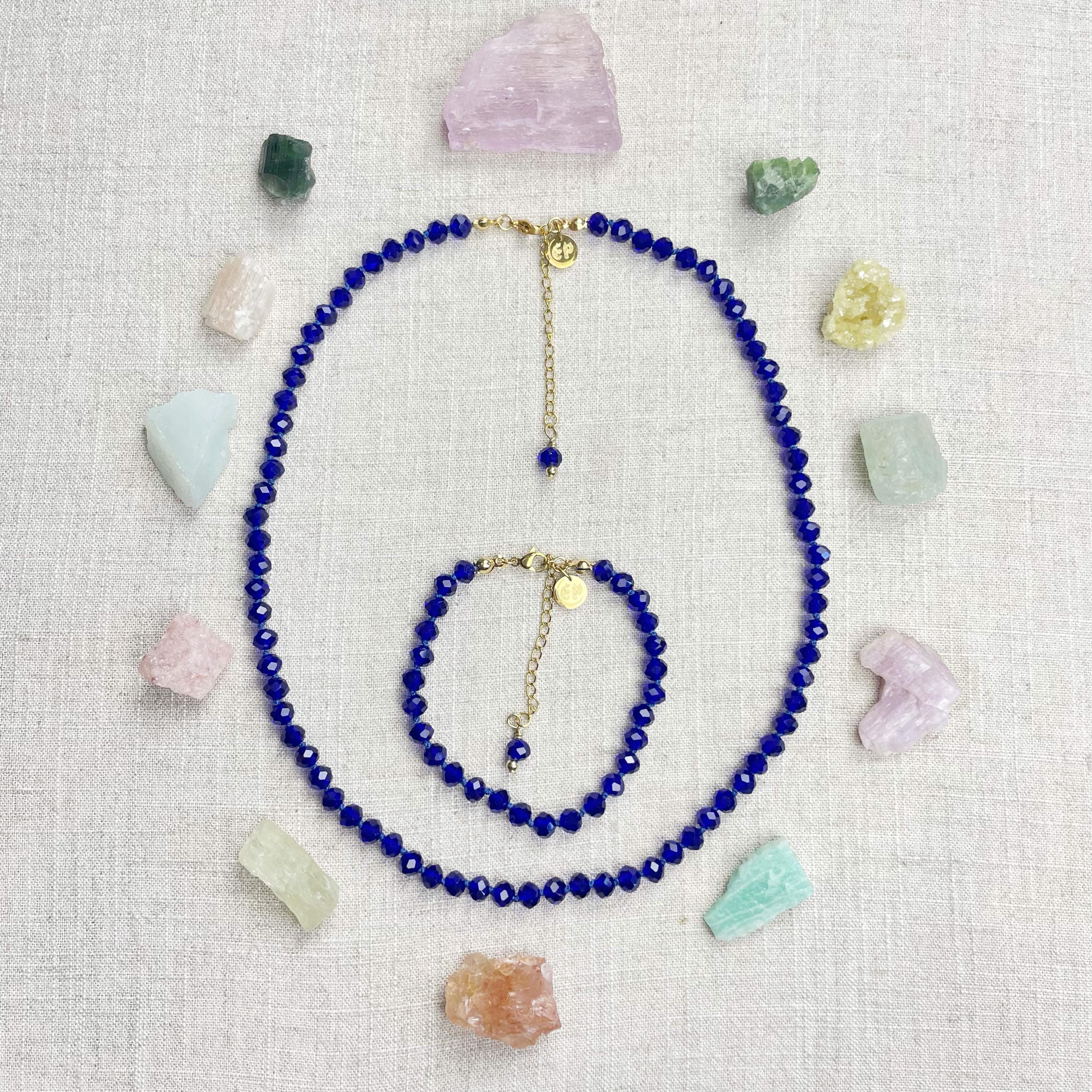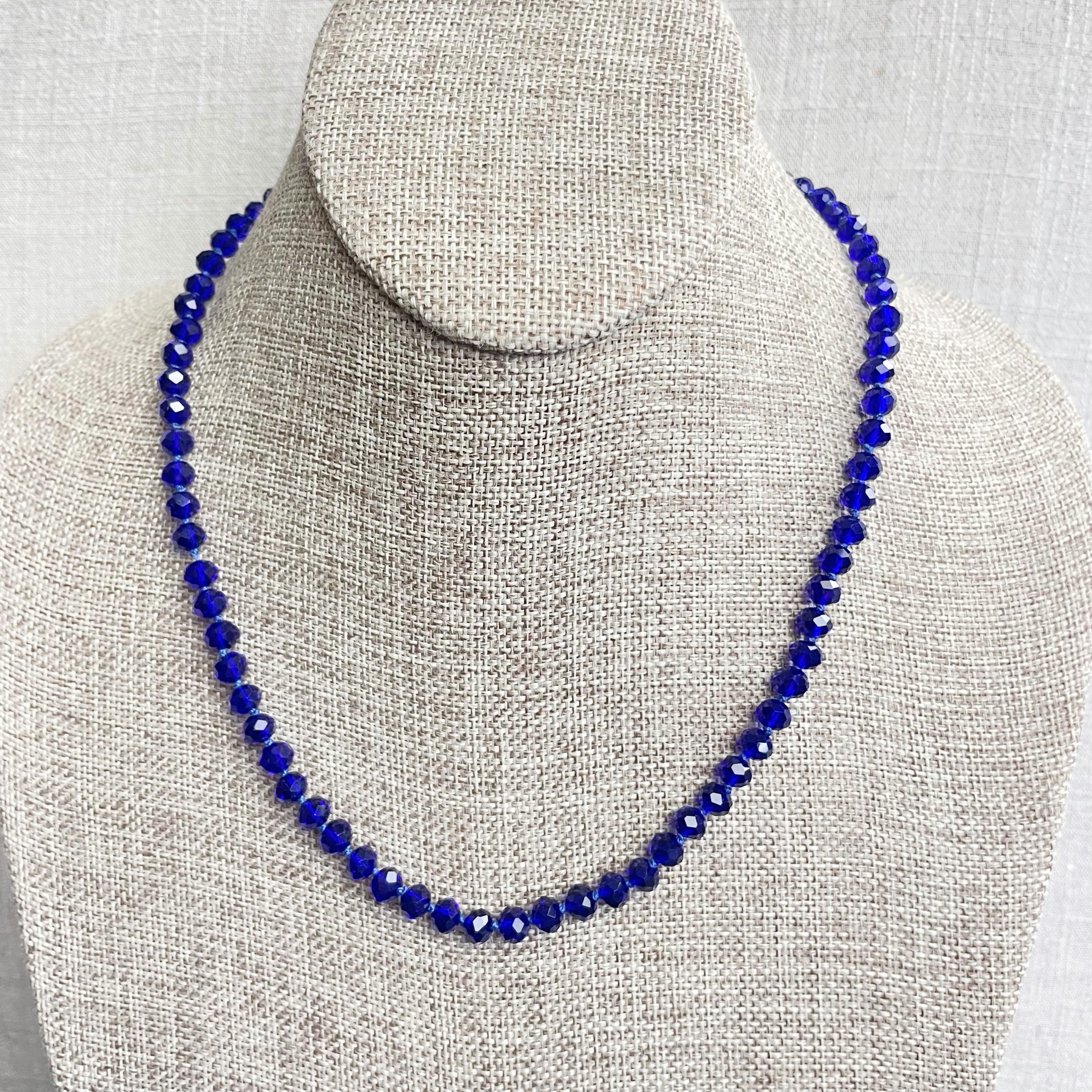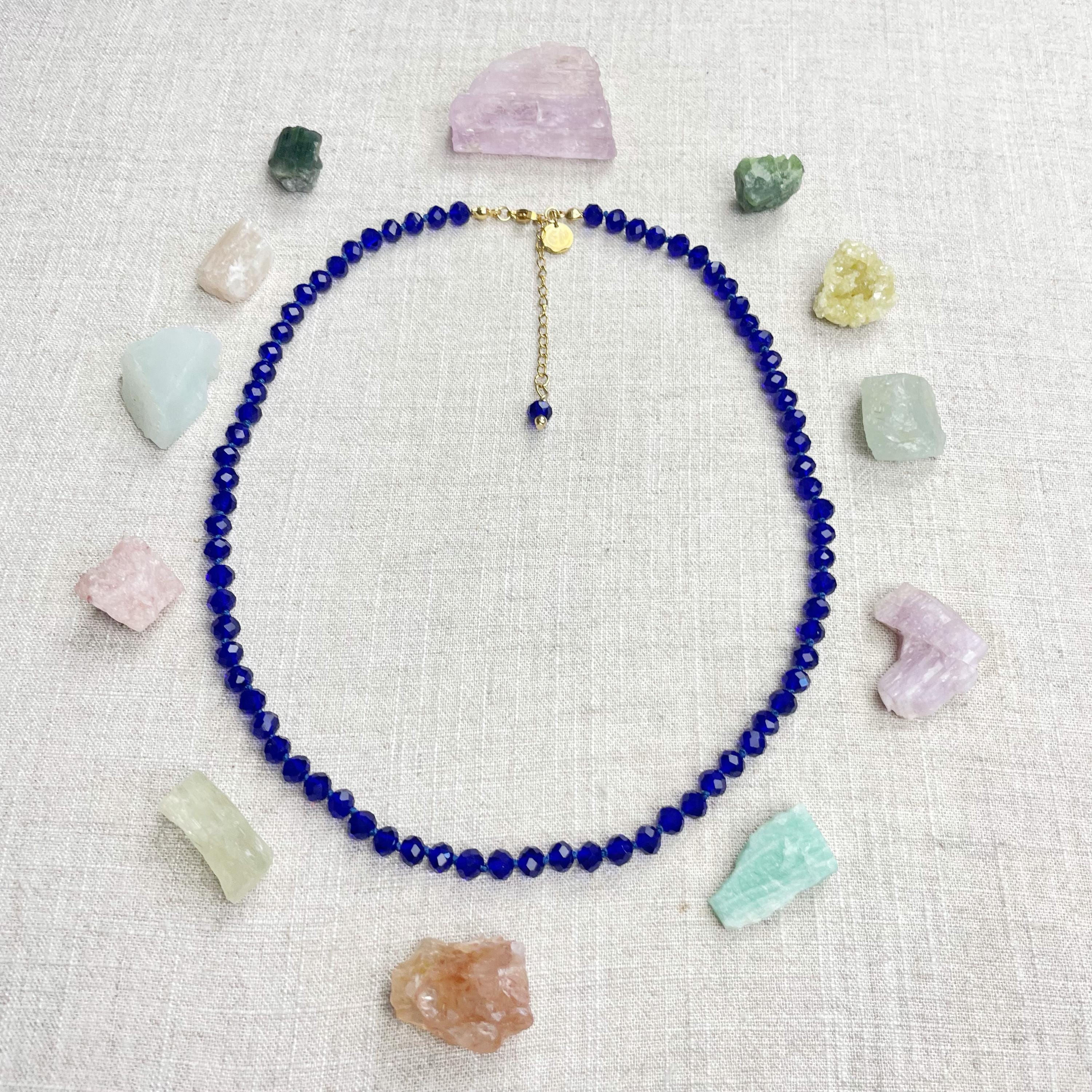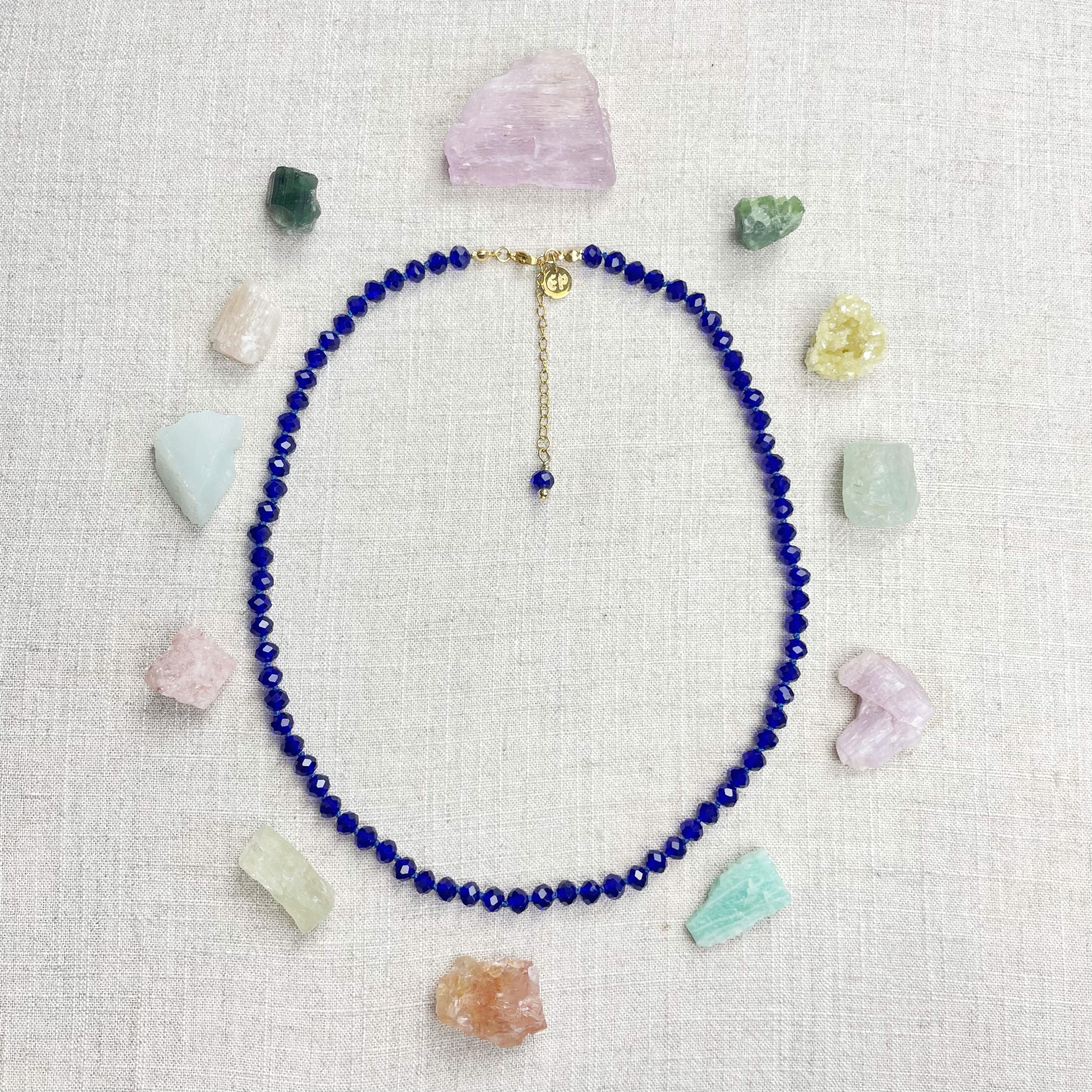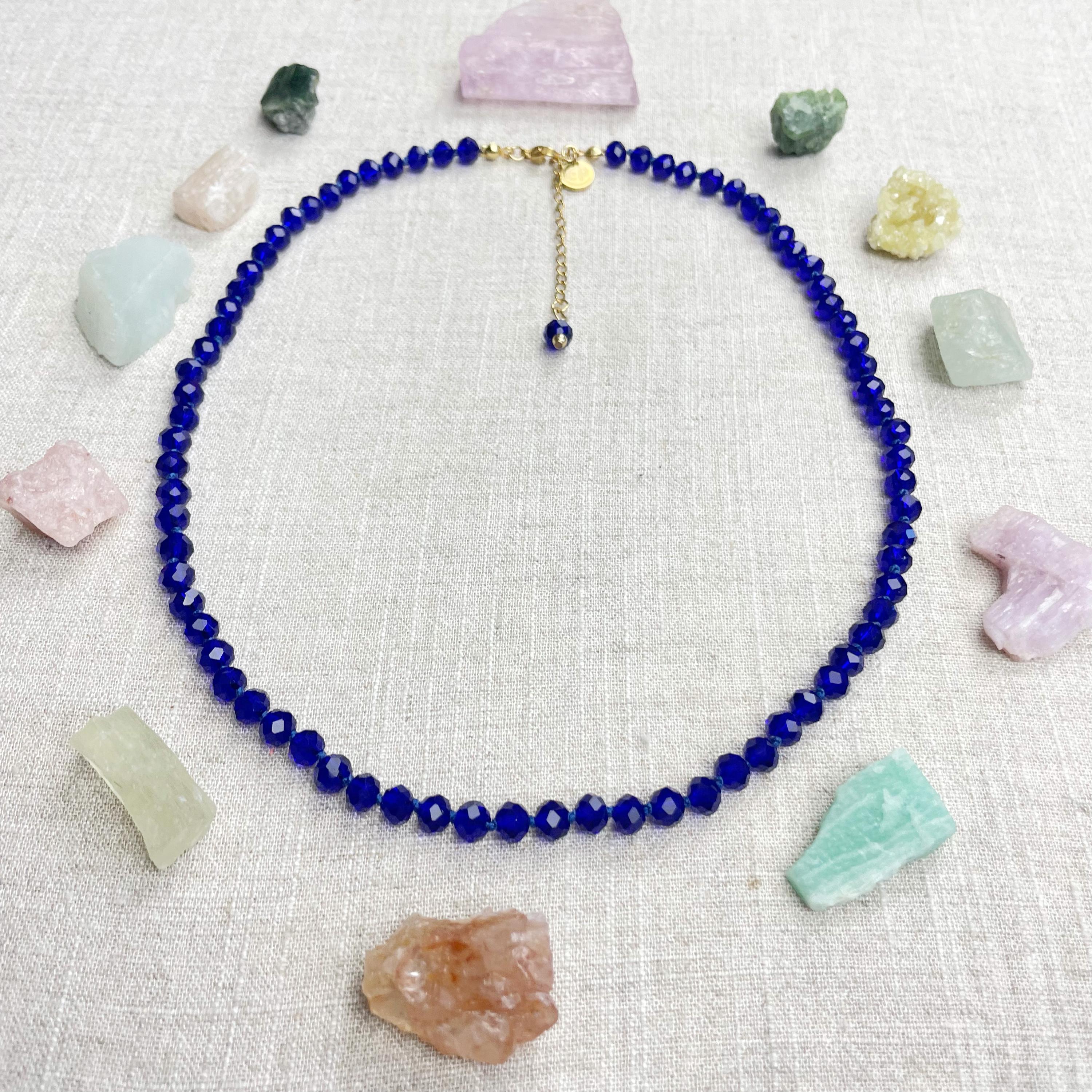 This necklace is made with glass crystal beads which are a translucent dark blue color. The beads are 6mm faceted rondelle beads. Each bead is hand knotted with 100% nylon cord. The hand knotting in between each beads takes time to do but looks gorgeous making the necklace also very easy to wear. The necklace is finished off with a gold plated stainless steel chain, clasp and logo charm.