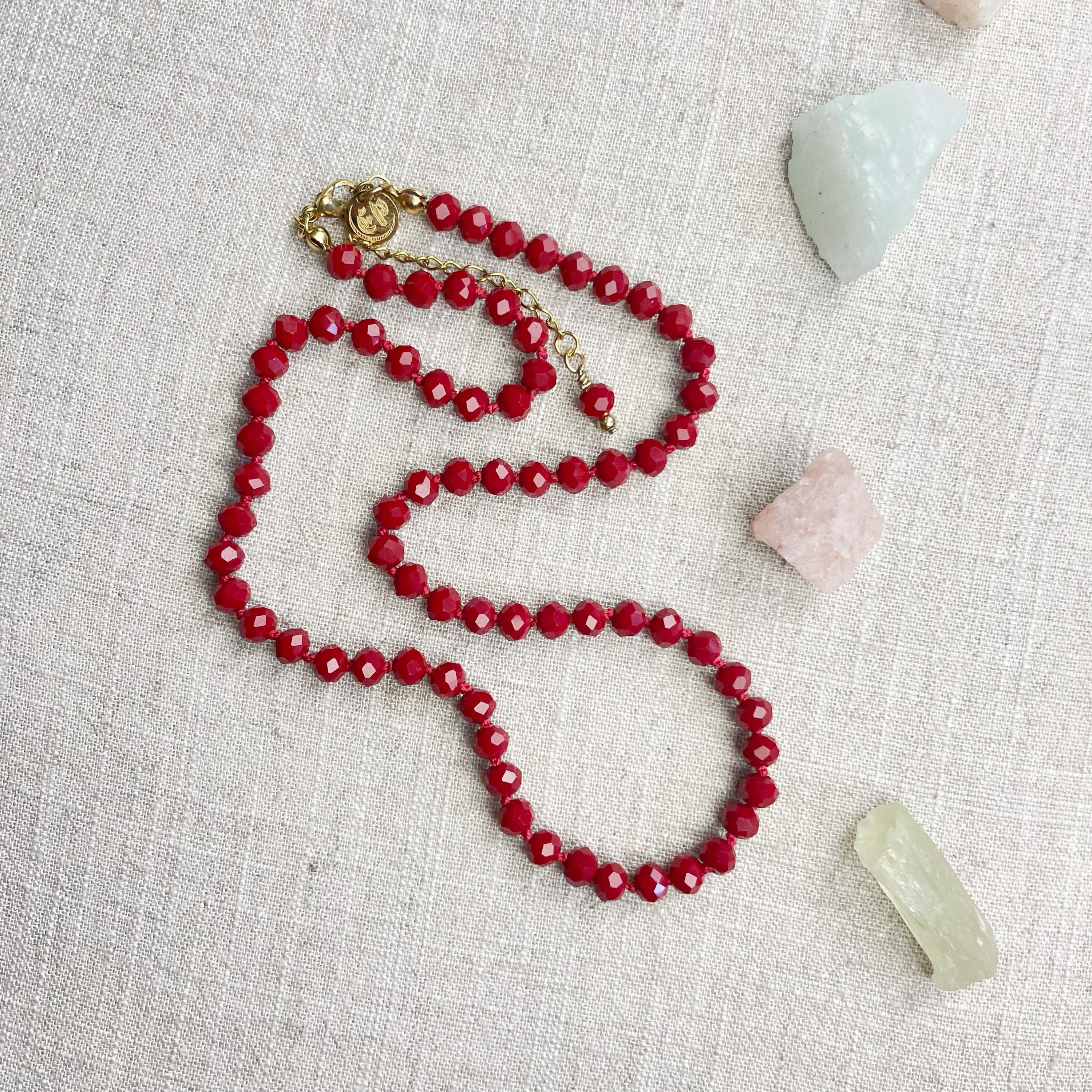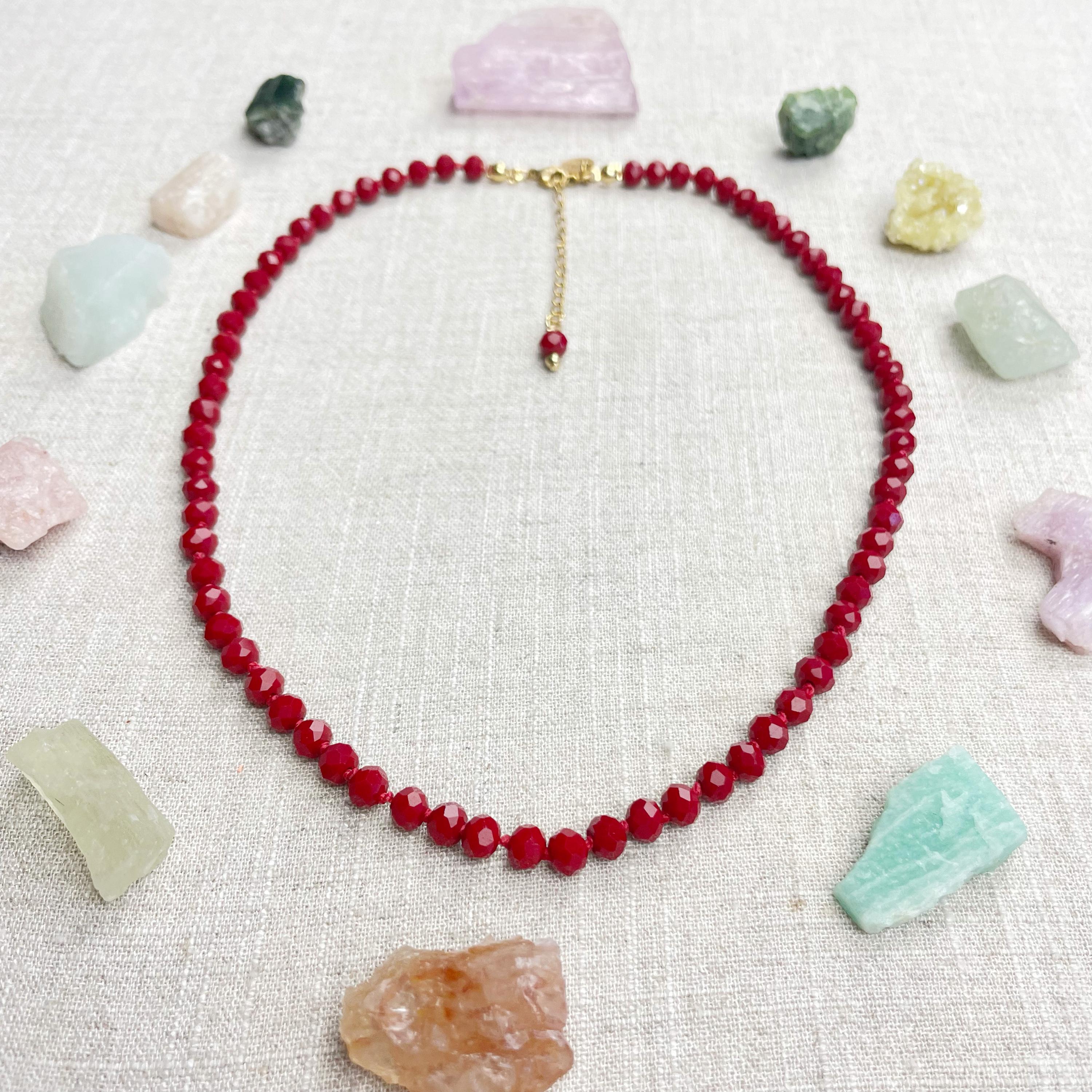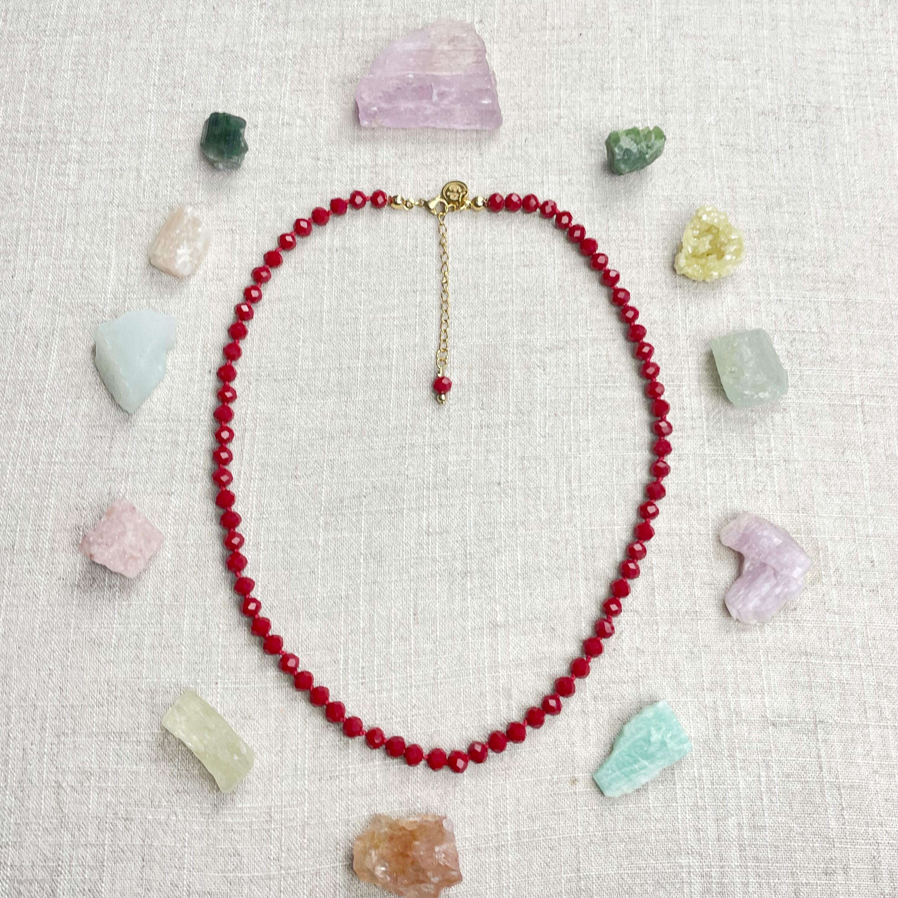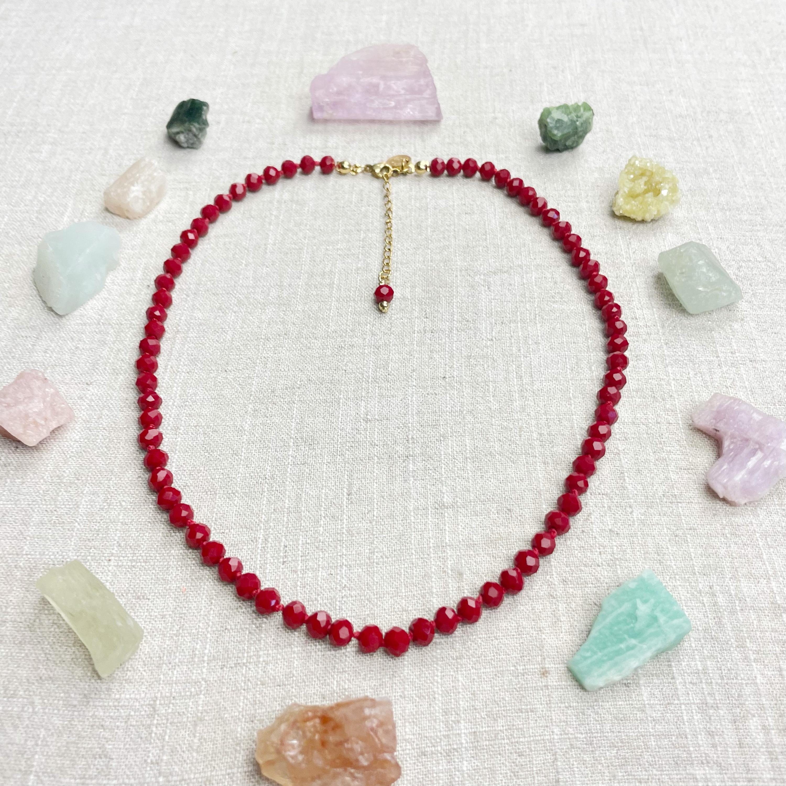 This necklace is made with glass crystal beads which are an opaque maroon color. The beads are 6mm faceted rondelle beads. Each bead is hand knotted with 100% nylon cord. The hand knotting in between each beads takes time to do but looks gorgeous making the necklace also very easy to wear. The necklace is finished off with a gold plated stainless steel chain, clasp and logo charm.