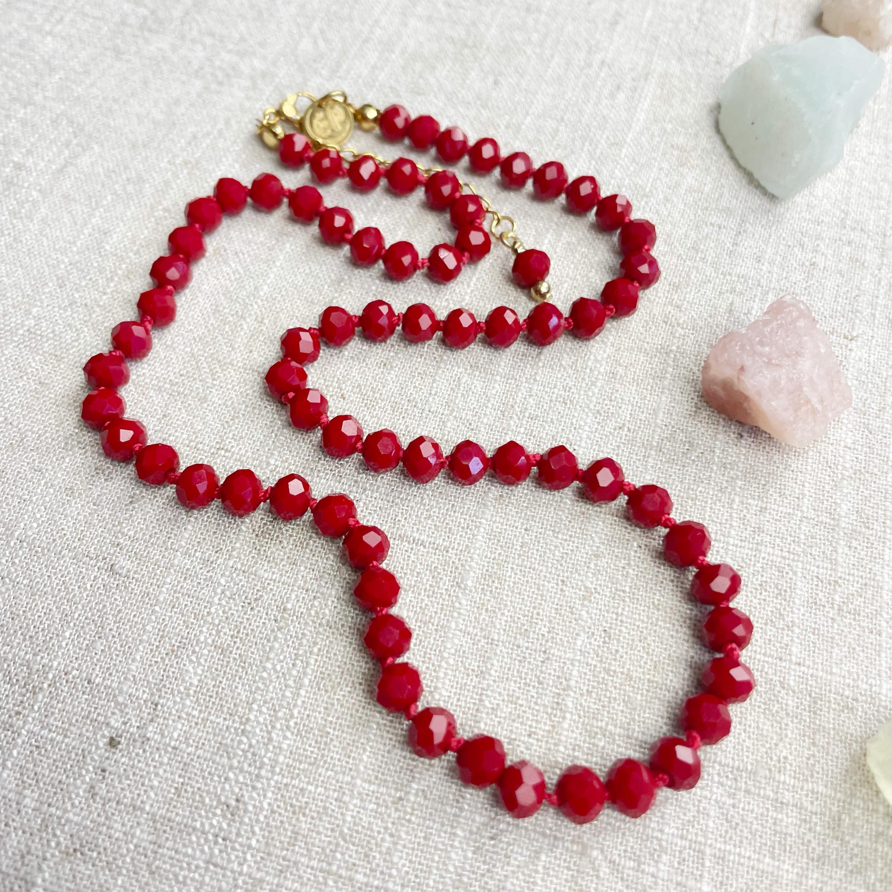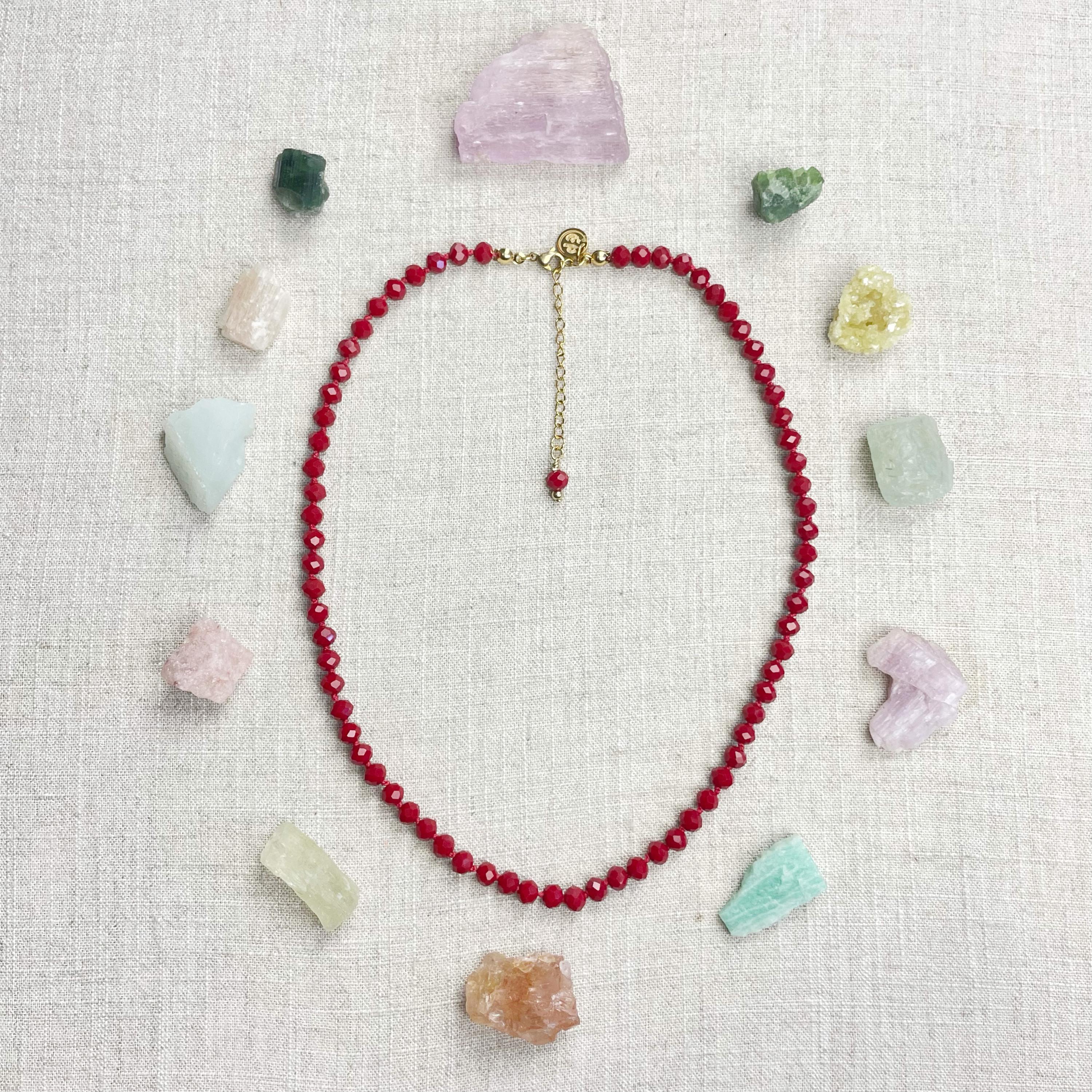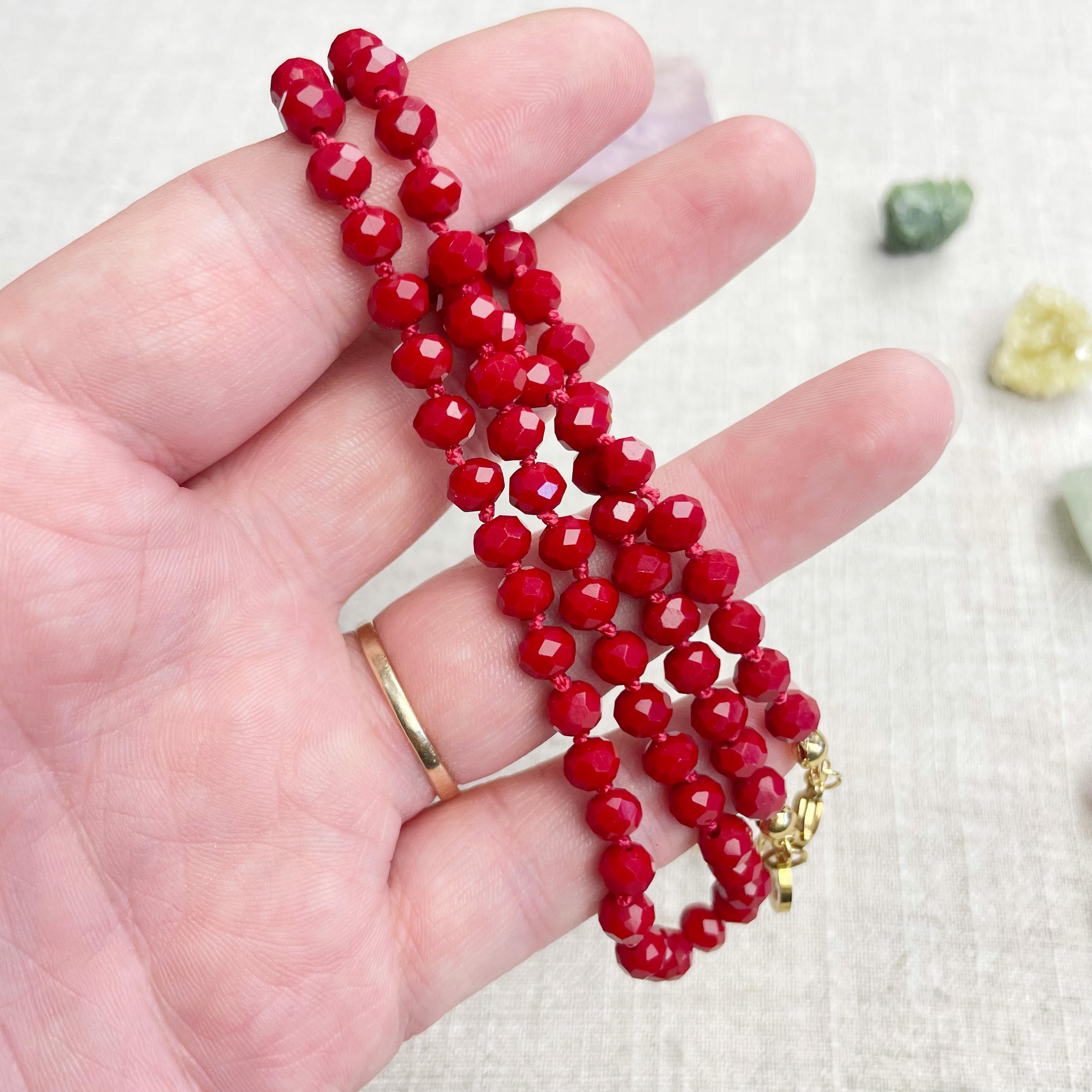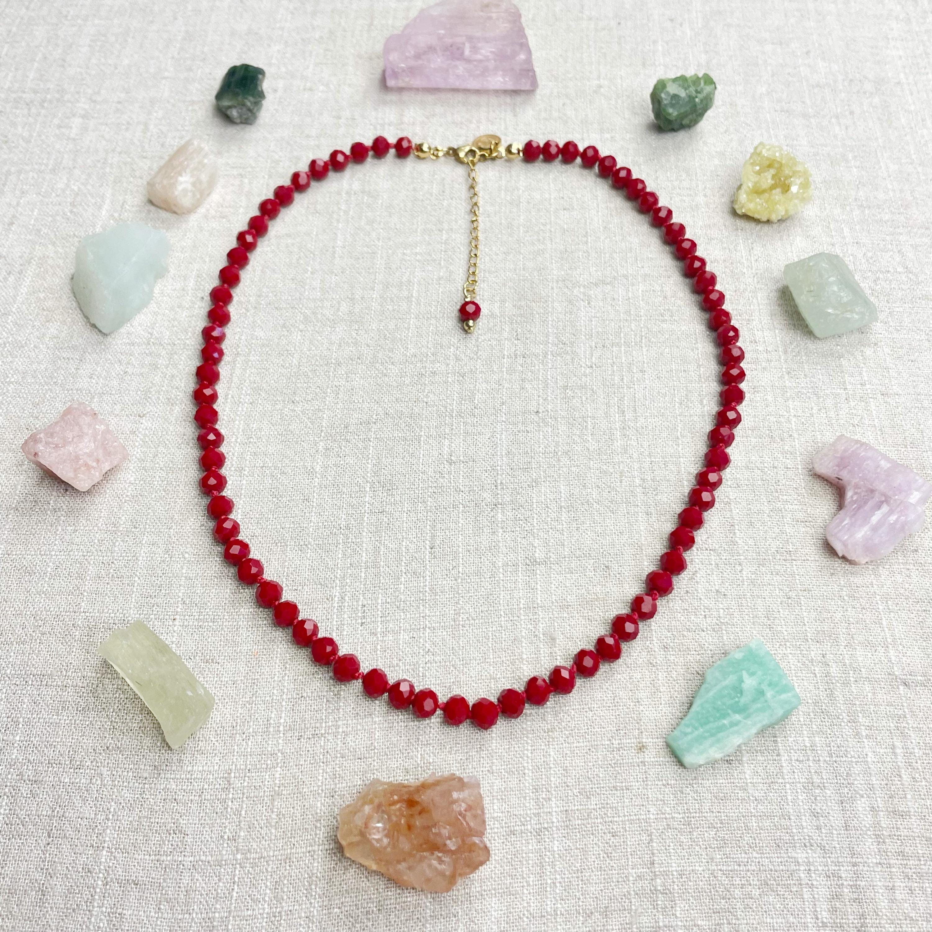This necklace is made with glass crystal beads which are an opaque maroon color. The beads are 6mm faceted rondelle beads. Each bead is hand knotted with 100% nylon cord. The hand knotting in between each beads takes time to do but looks gorgeous making the necklace also very easy to wear. The necklace is finished off with a gold plated stainless steel chain, clasp and logo charm.
