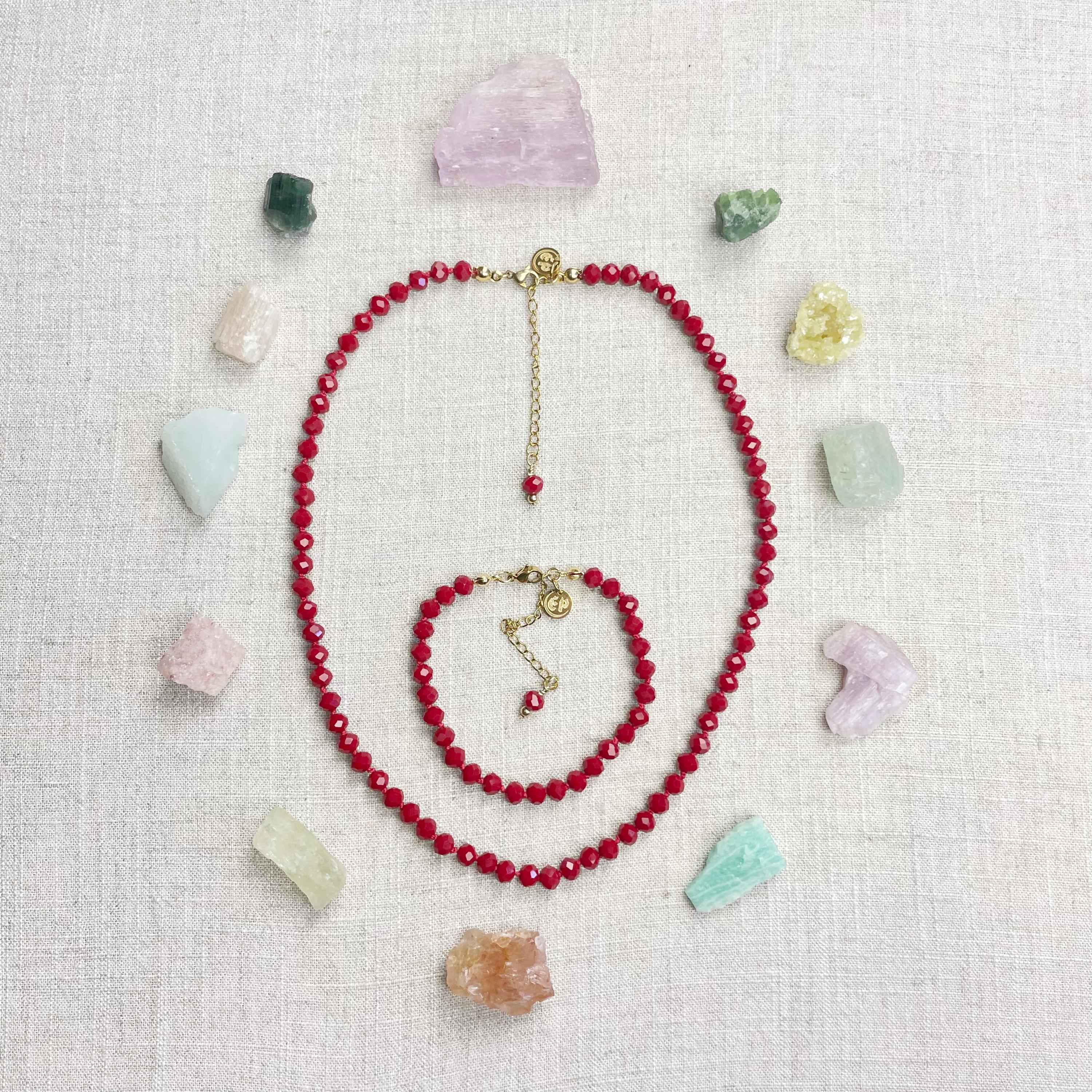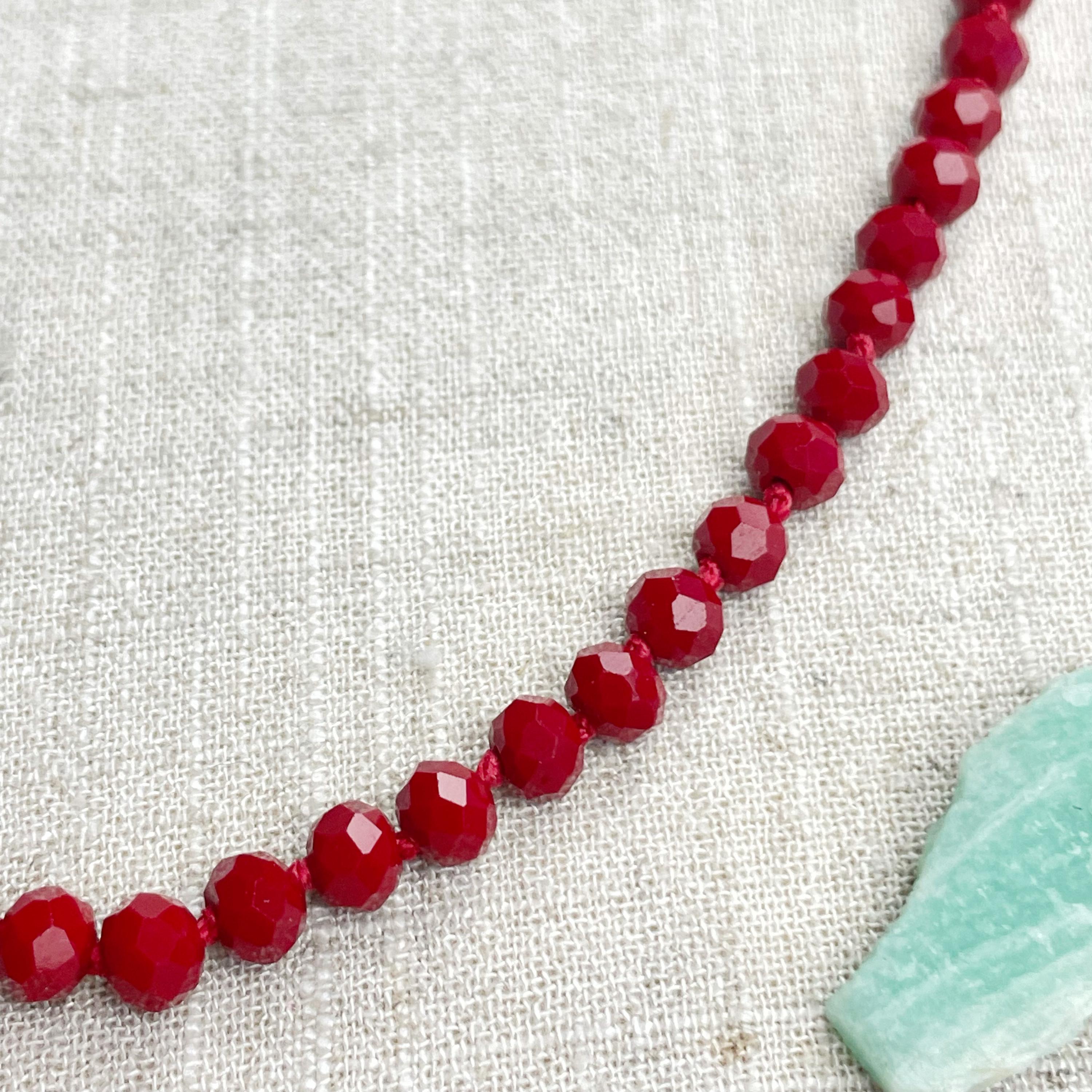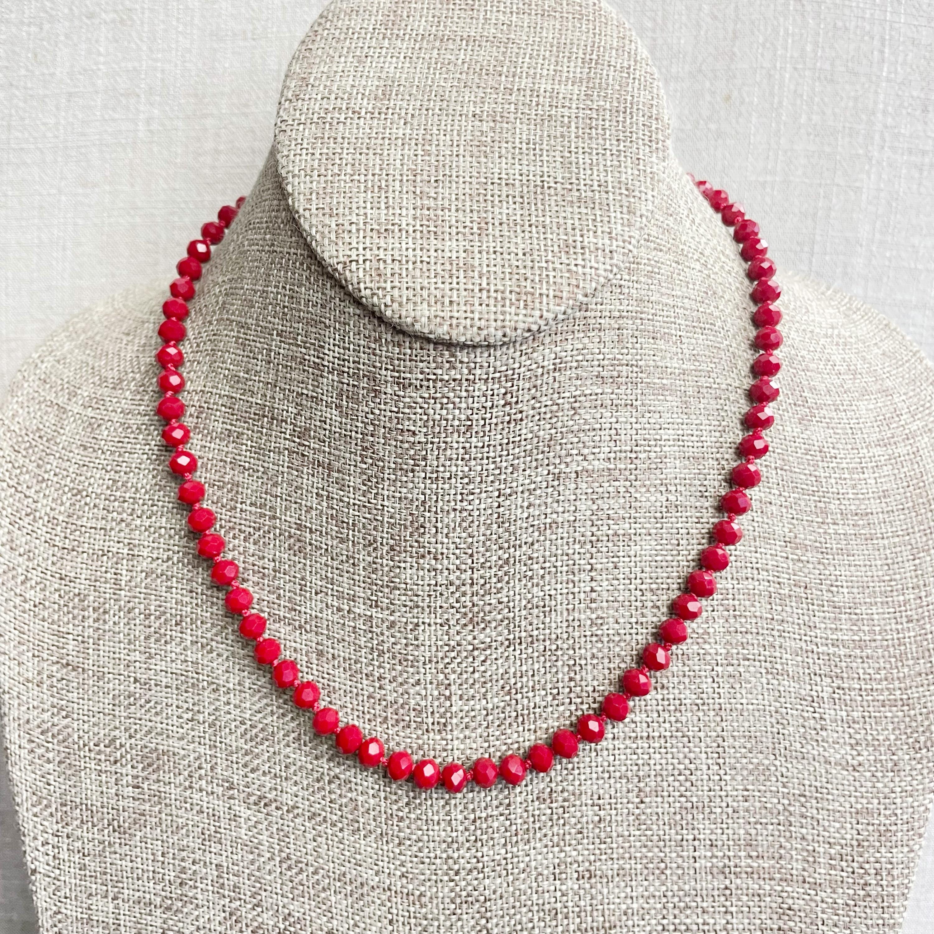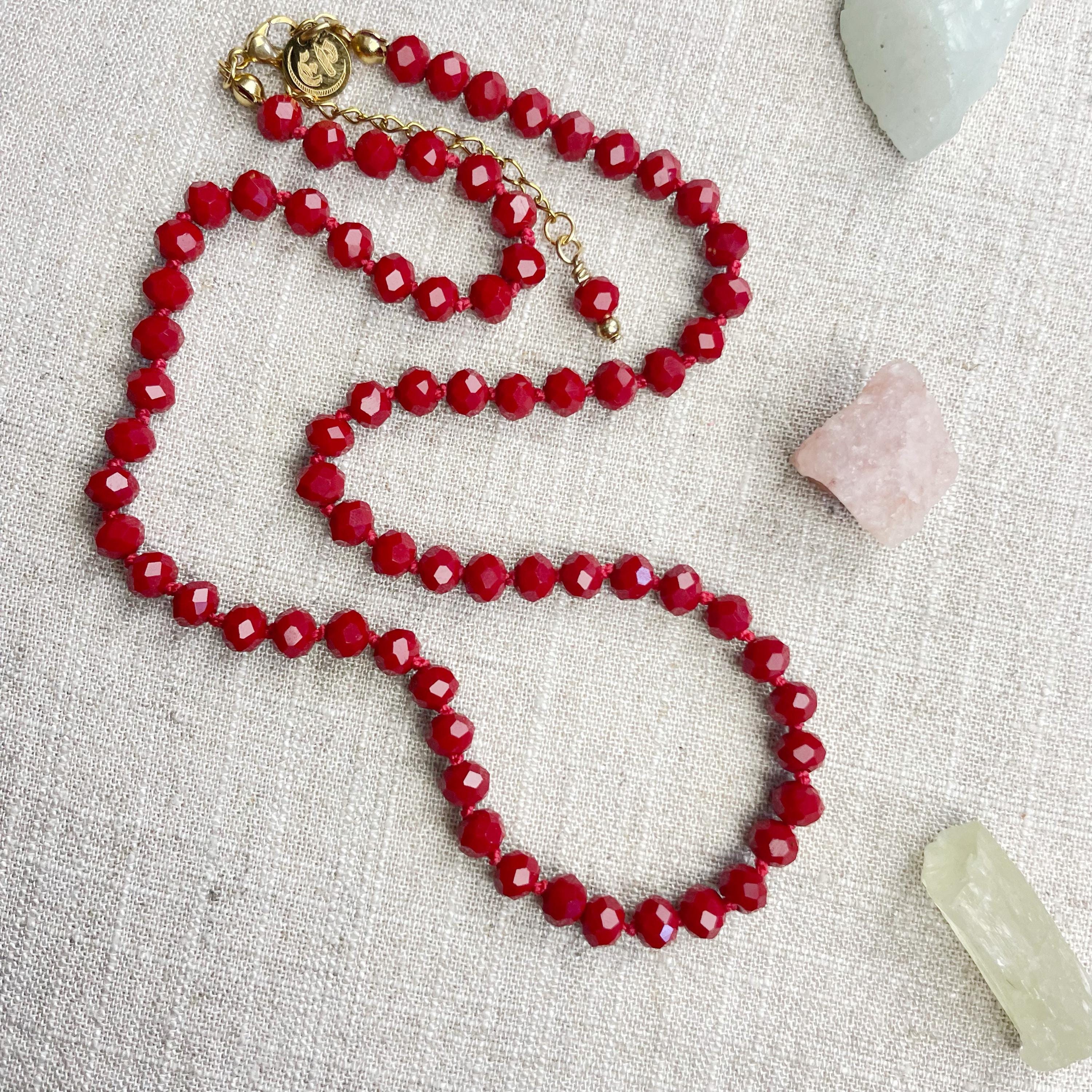 This necklace is made with glass crystal beads which are an opaque maroon color. The beads are 6mm faceted rondelle beads. Each bead is hand knotted with 100% nylon cord. The hand knotting in between each beads takes time to do but looks gorgeous making the necklace also very easy to wear. The necklace is finished off with a gold plated stainless steel chain, clasp and logo charm.