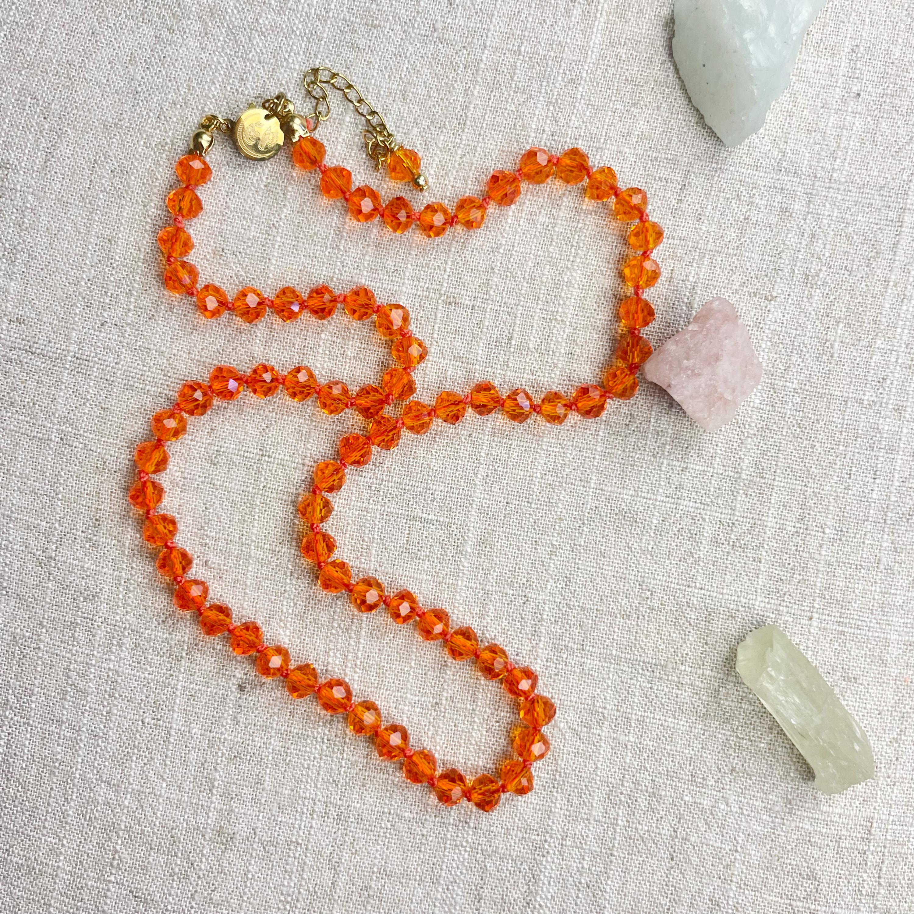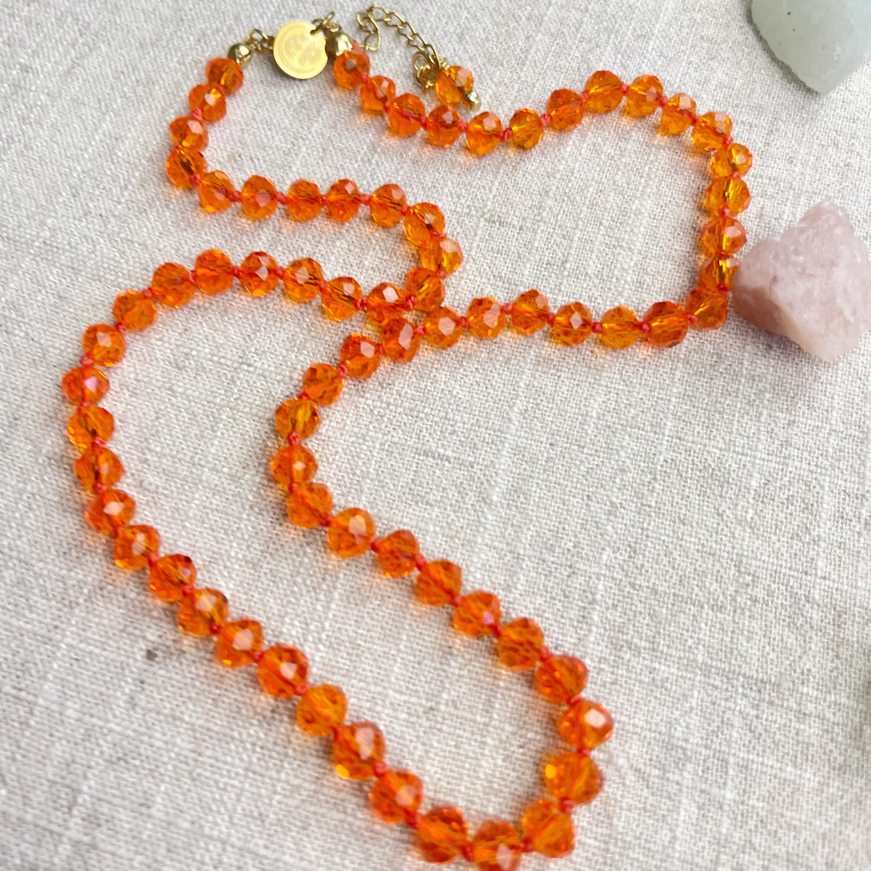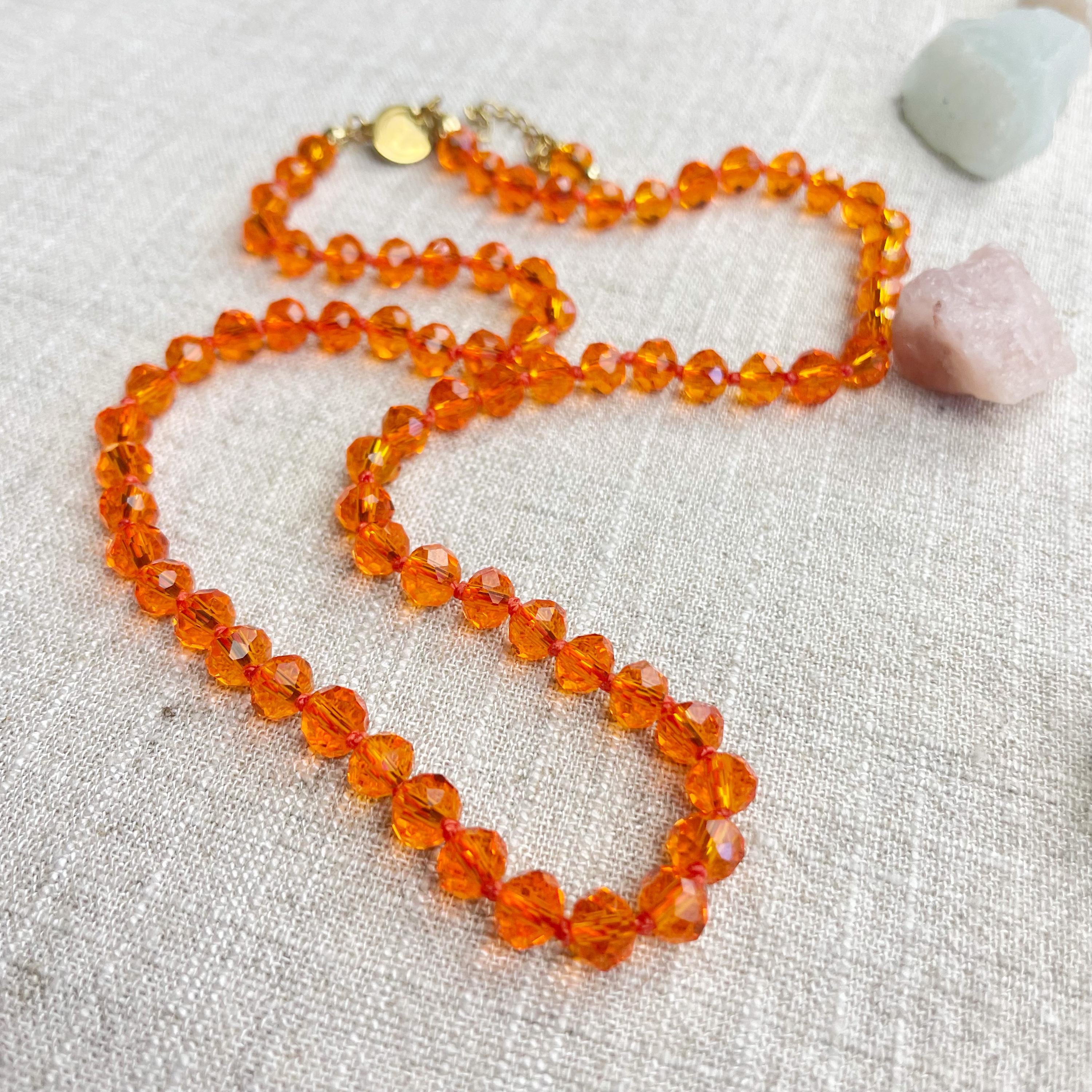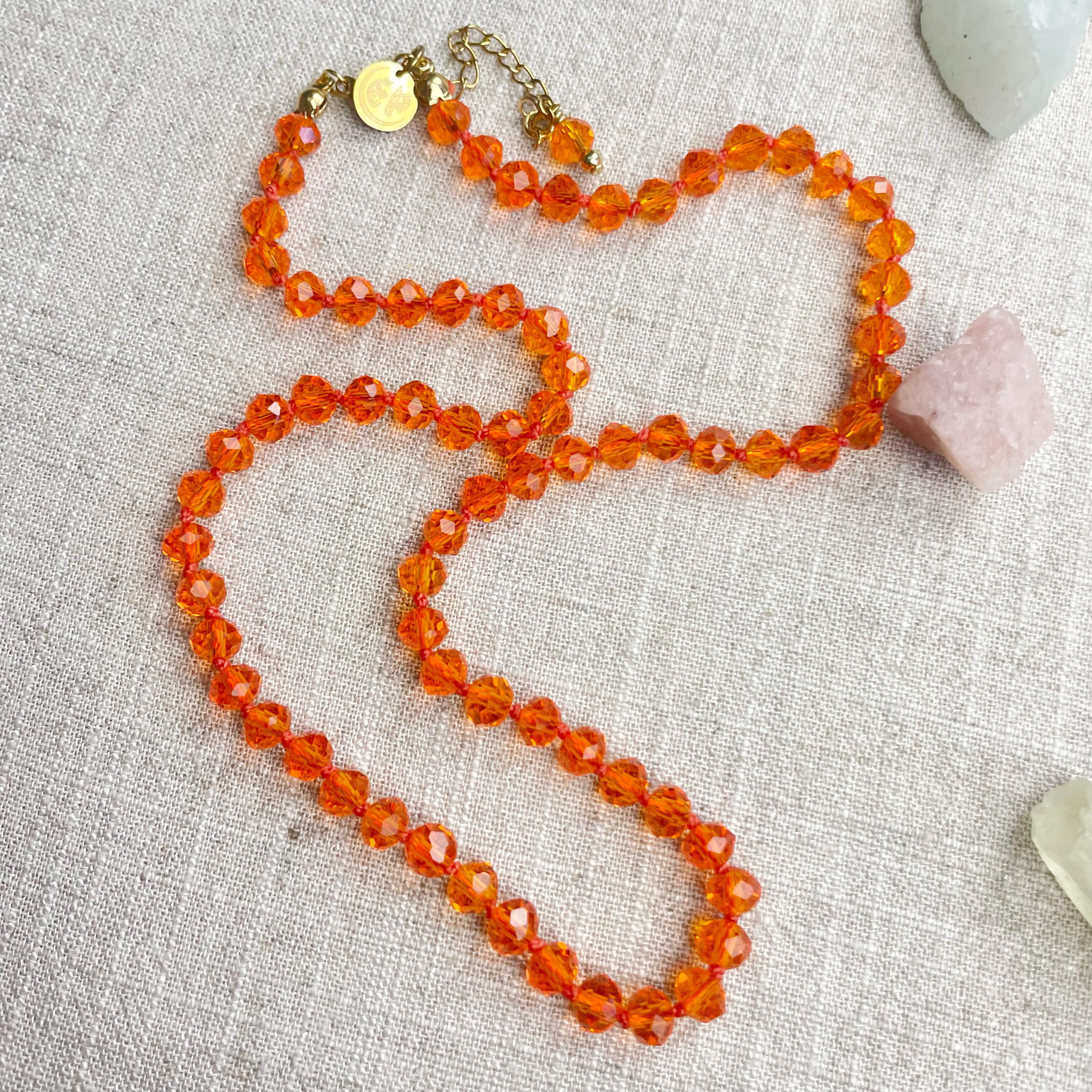 This necklace is made with glass crystal beads which are a translucent orange color. The beads are 6mm faceted rondelle beads. Each bead is hand knotted with 100% nylon cord. The hand knotting in between each beads takes time to do but looks gorgeous making the necklace also very easy to wear. The necklace is finished off with a gold plated stainless steel chain, clasp and logo charm.
