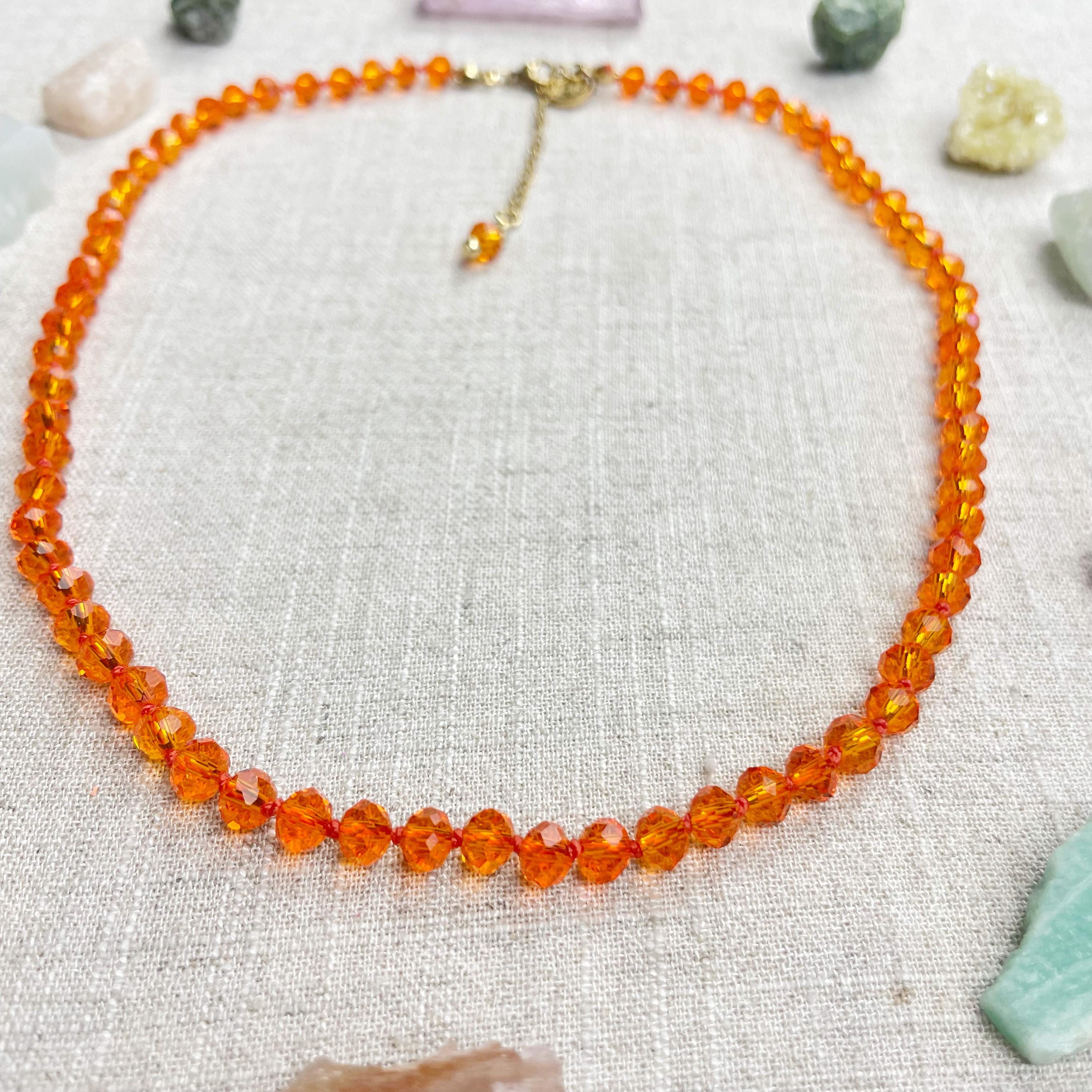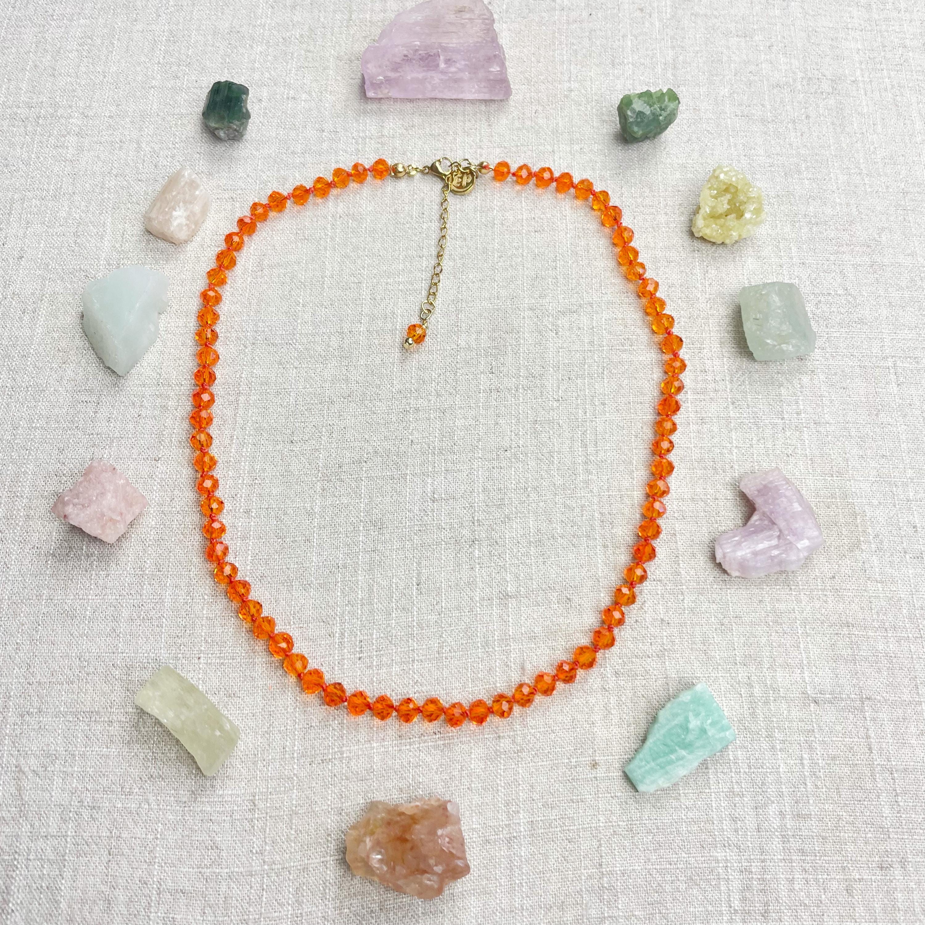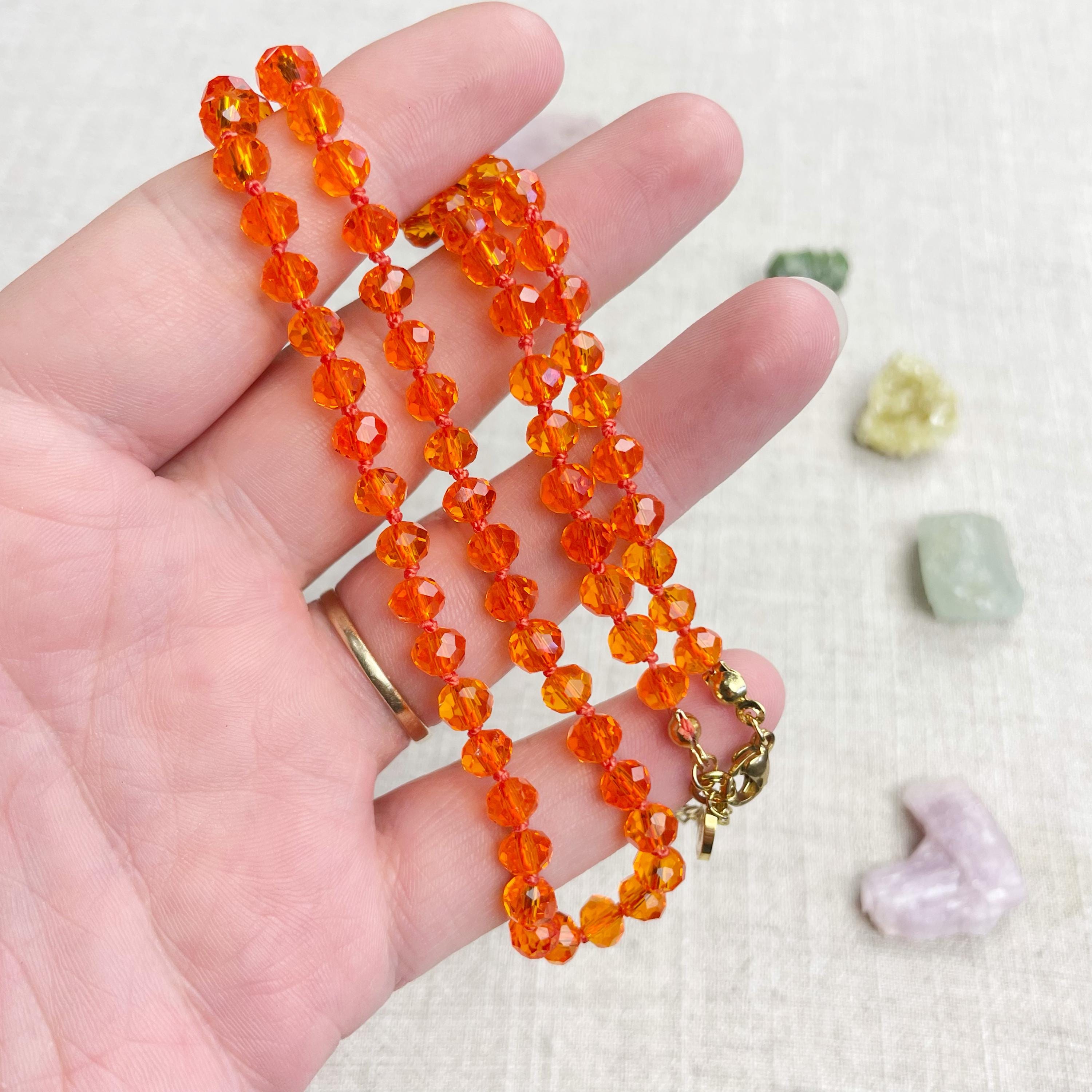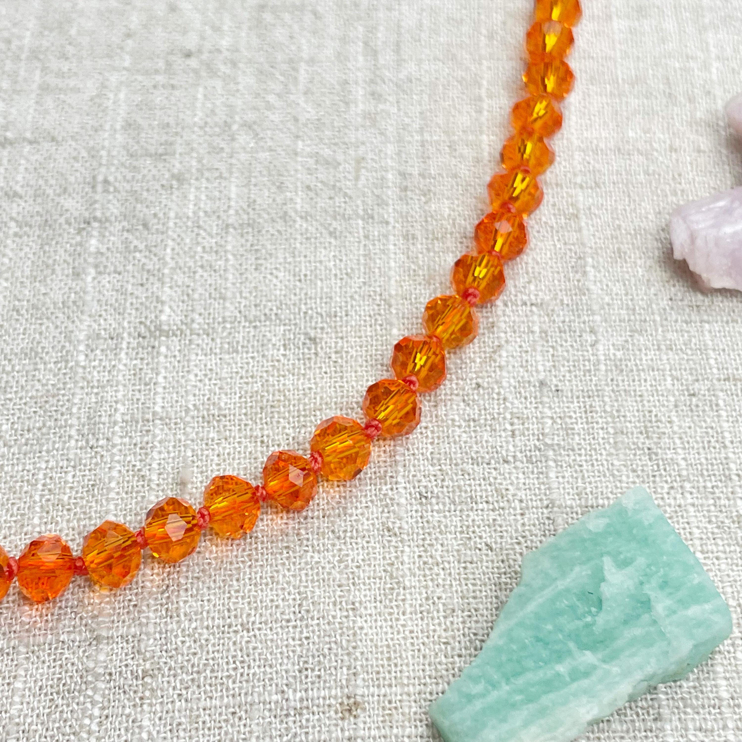This necklace is made with glass crystal beads which are a translucent orange color. The beads are 6mm faceted rondelle beads. Each bead is hand knotted with 100% nylon cord. The hand knotting in between each beads takes time to do but looks gorgeous making the necklace also very easy to wear. The necklace is finished off with a gold plated stainless steel chain, clasp and logo charm.