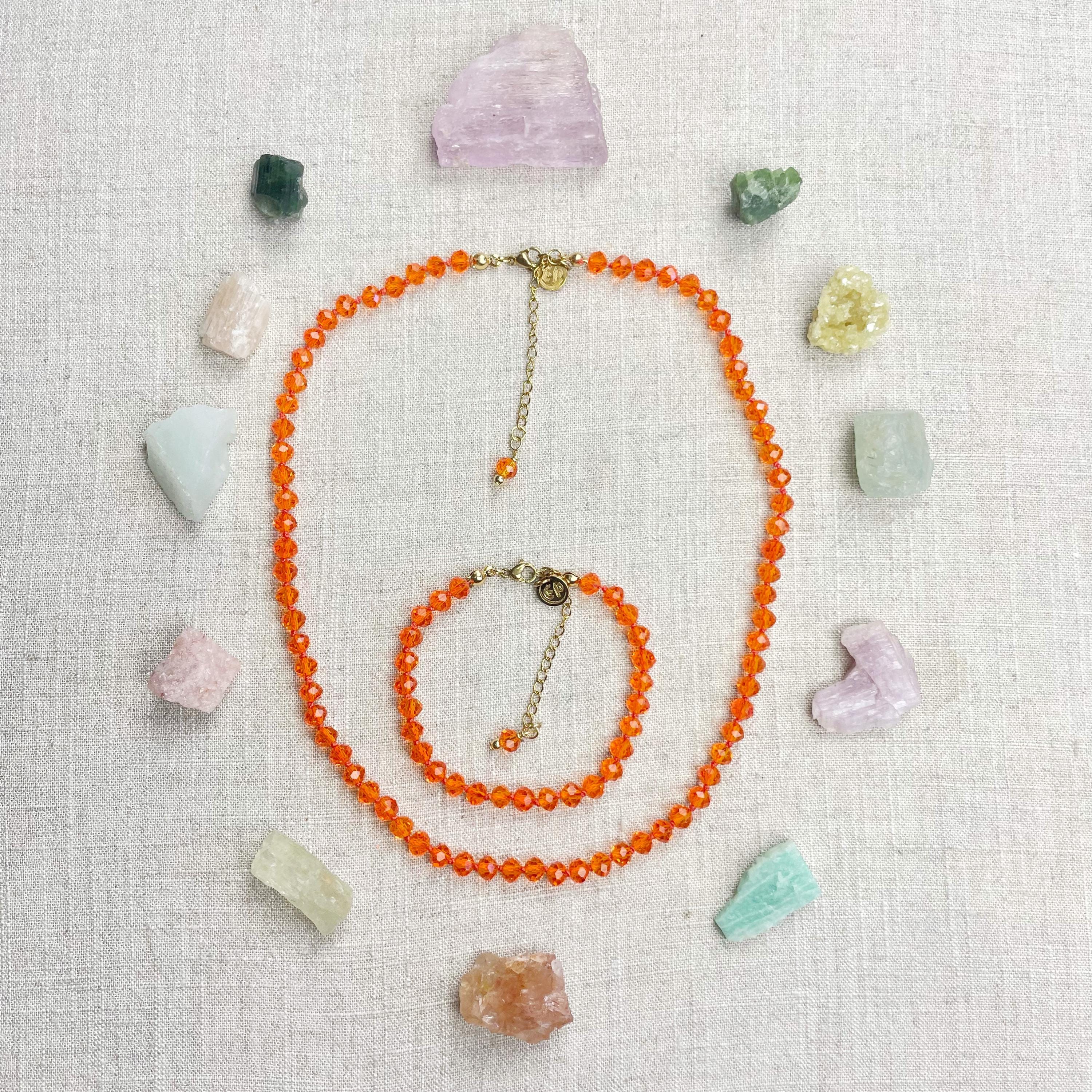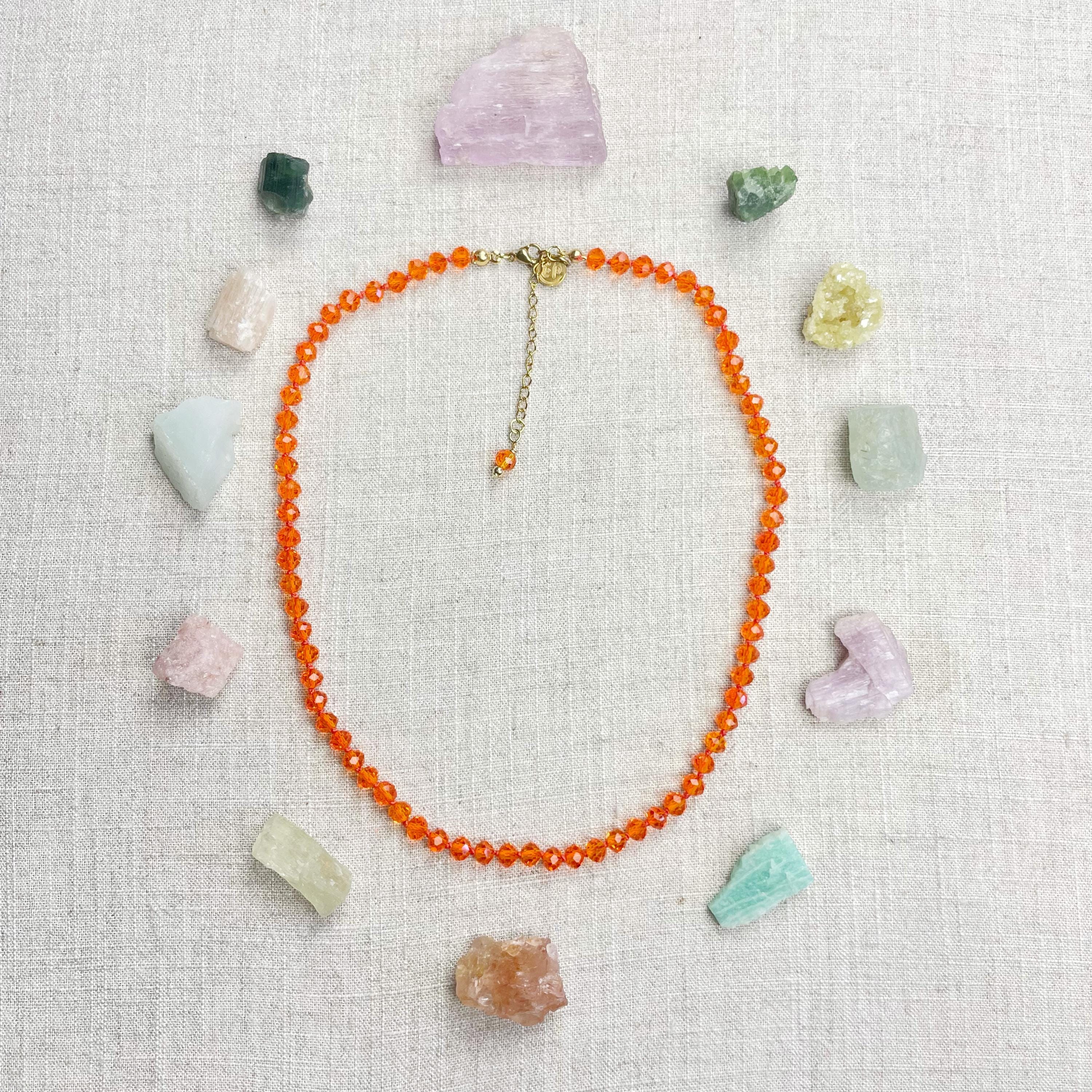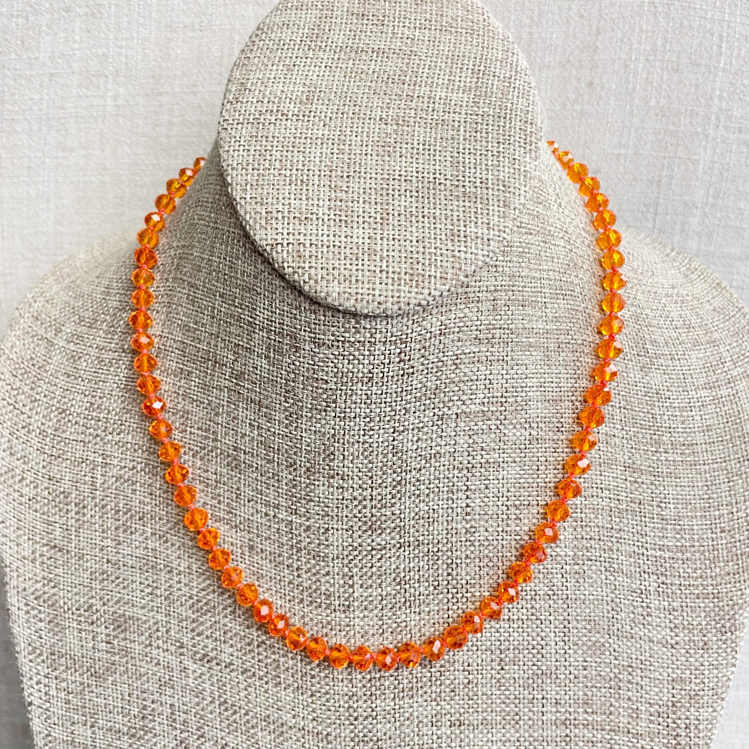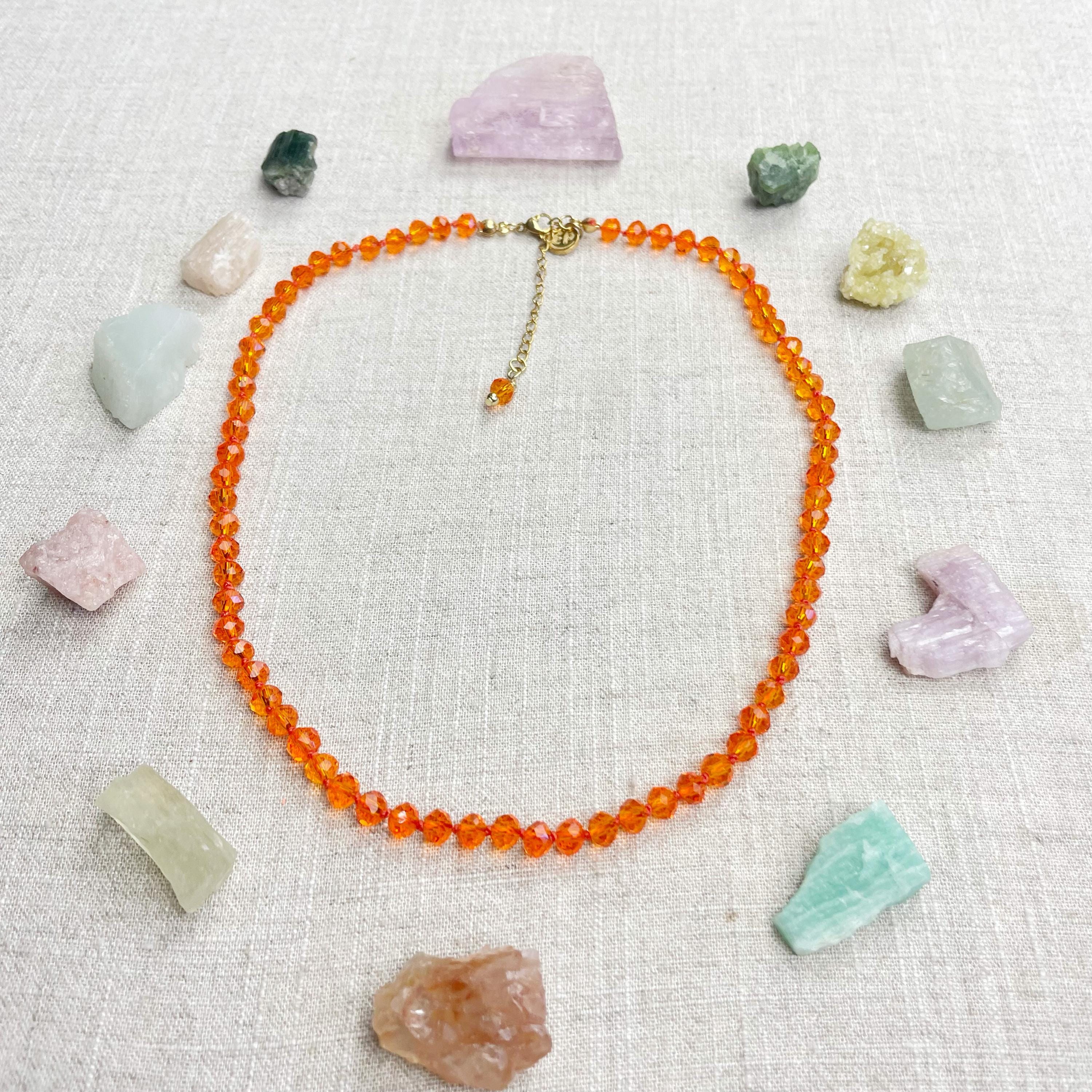 This necklace is made with glass crystal beads which are a translucent orange color. The beads are 6mm faceted rondelle beads. Each bead is hand knotted with 100% nylon cord. The hand knotting in between each beads takes time to do but looks gorgeous making the necklace also very easy to wear. The necklace is finished off with a gold plated stainless steel chain, clasp and logo charm.