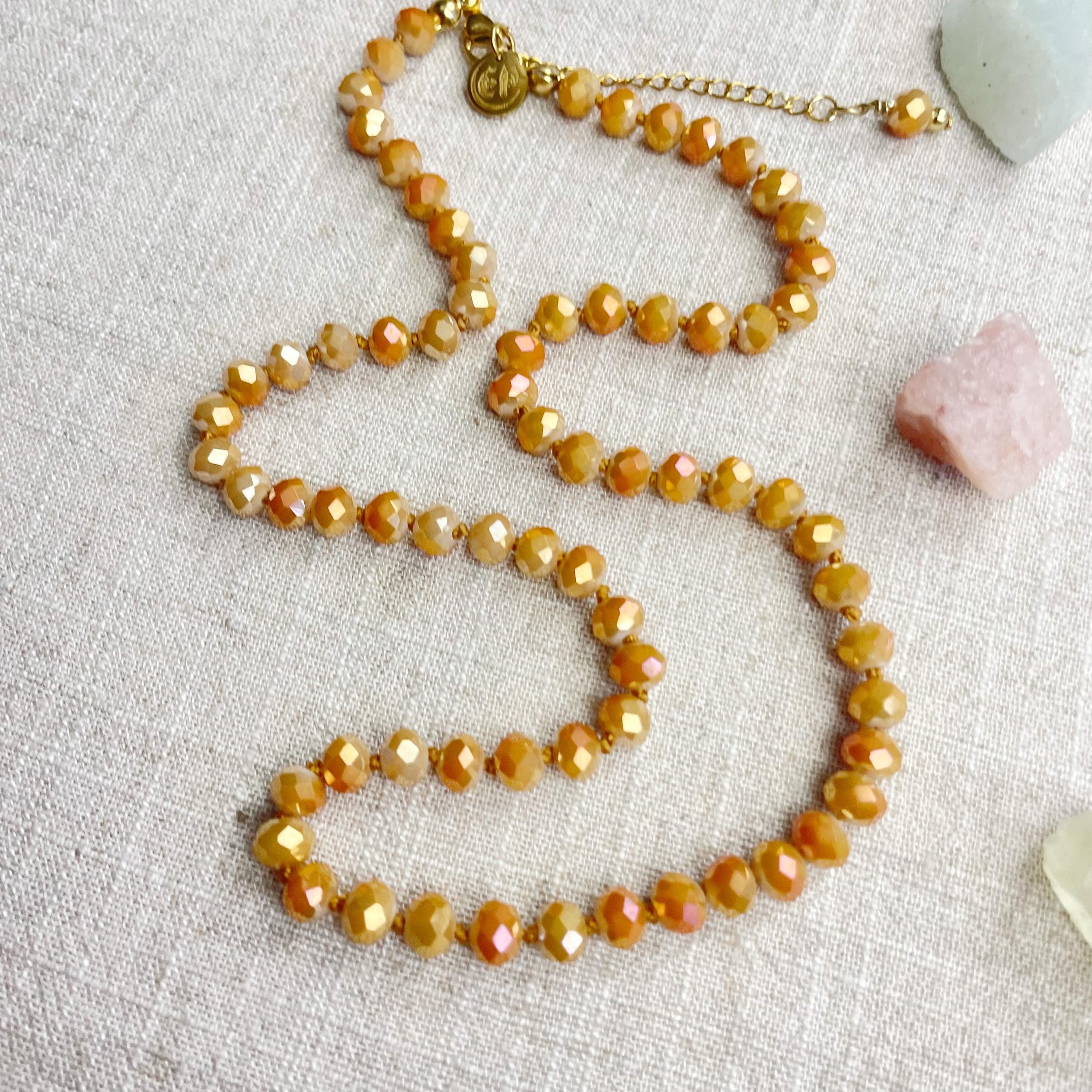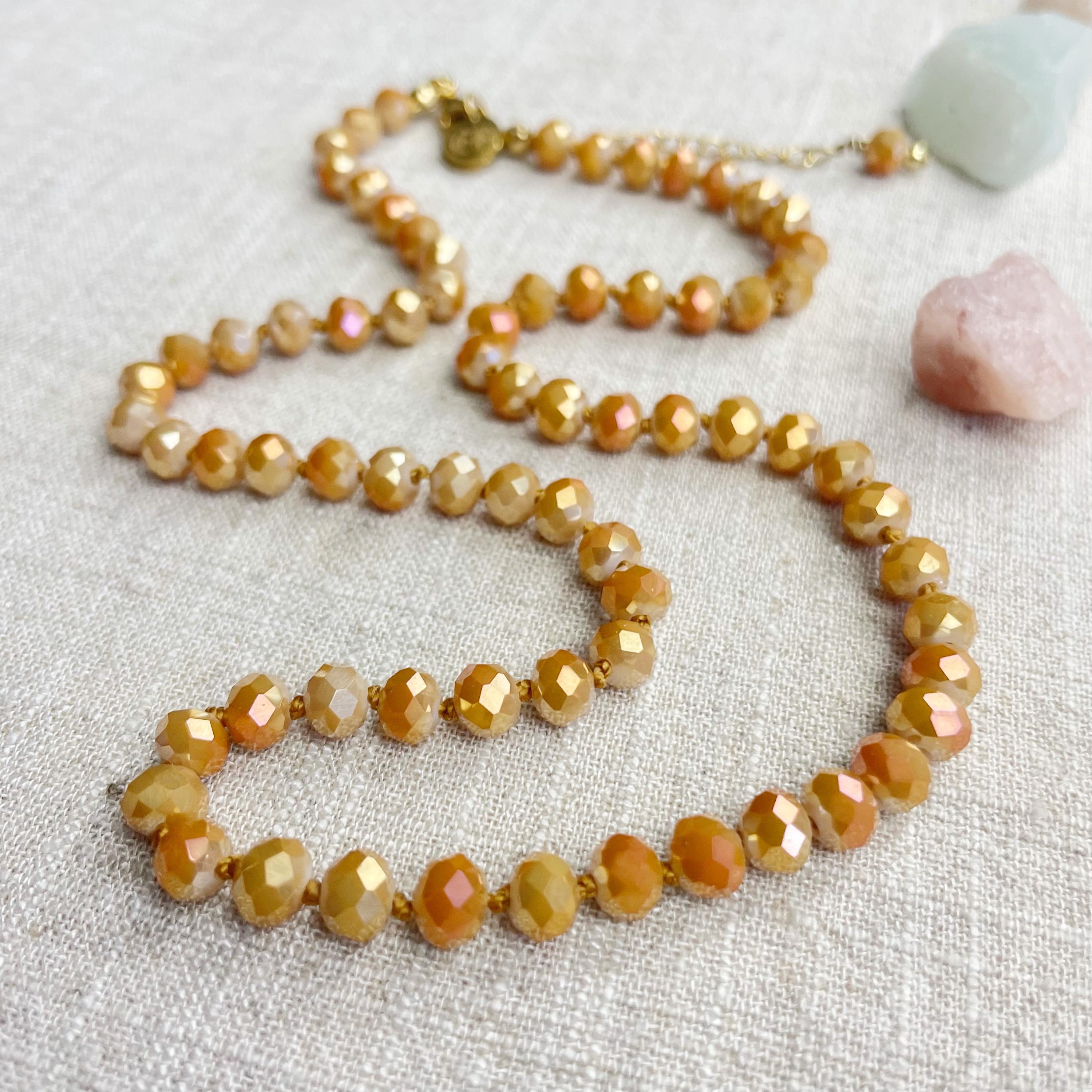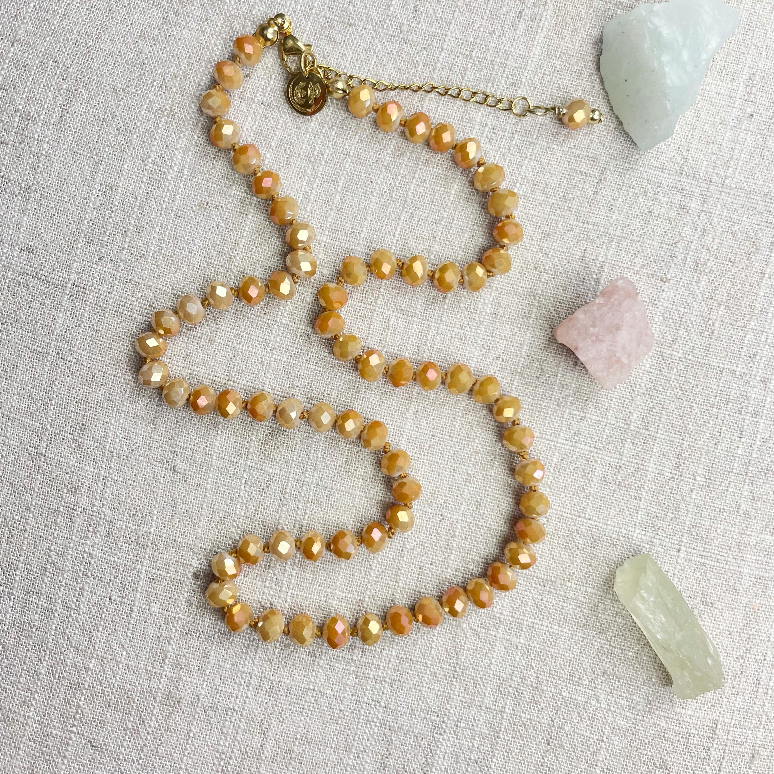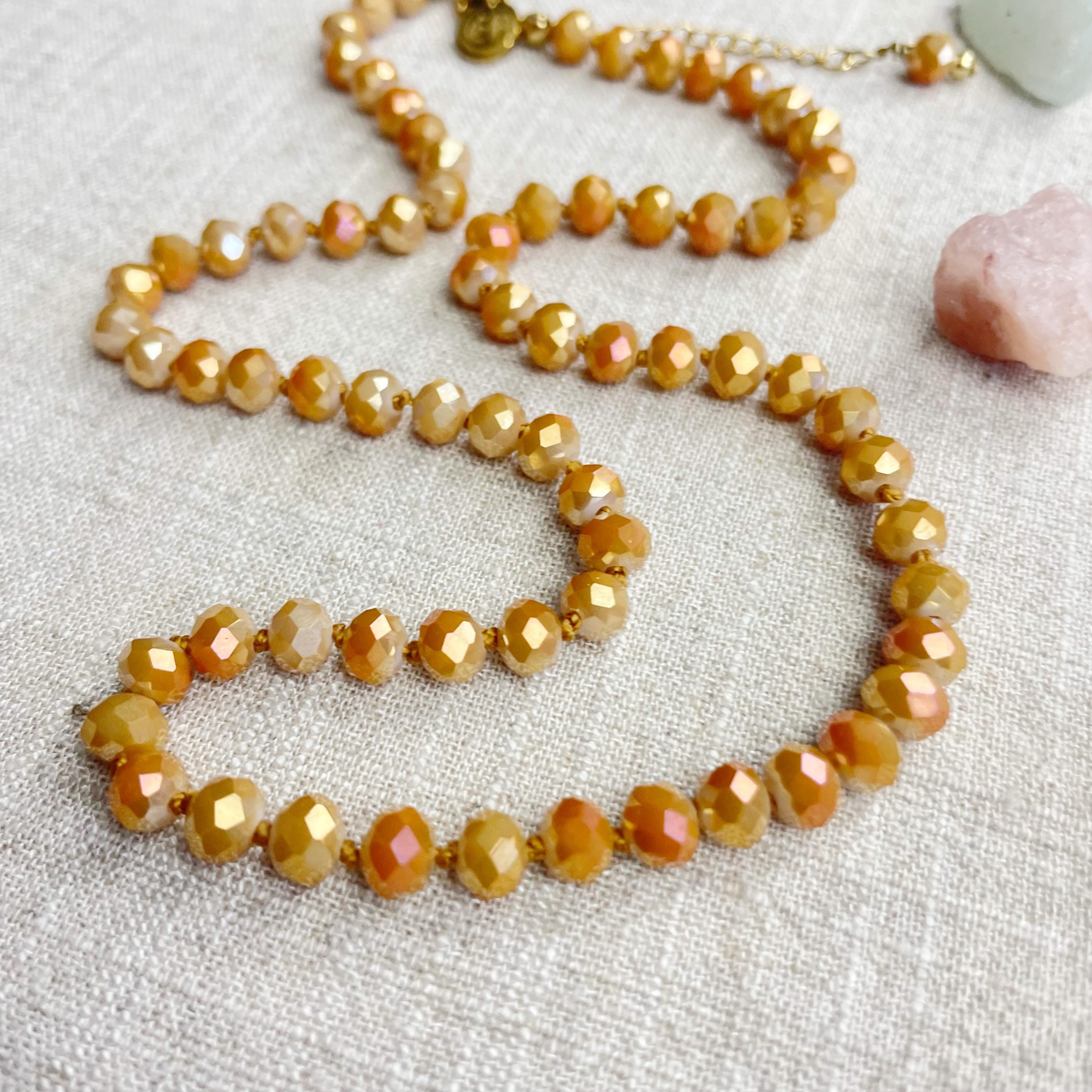 This necklace is made with glass crystal beads which are a caramel color with an iridescent shiny coating. The beads are 6mm faceted rondelle beads. Each bead is hand knotted with 100% nylon cord. The hand knotting in between each beads takes time to do but looks gorgeous making the necklace also very easy to wear. The necklace is finished off with a gold plated stainless steel chain, clasp and logo charm.