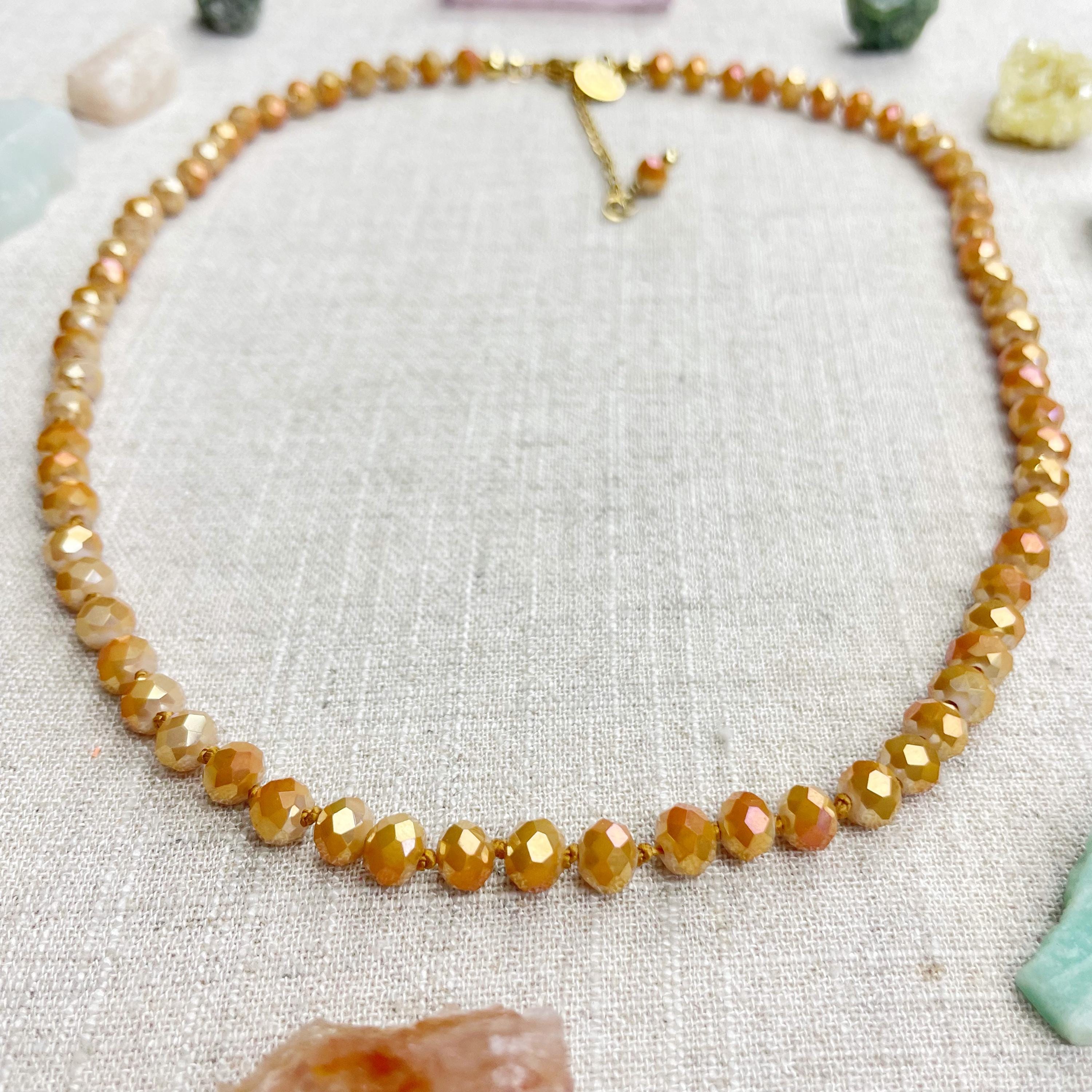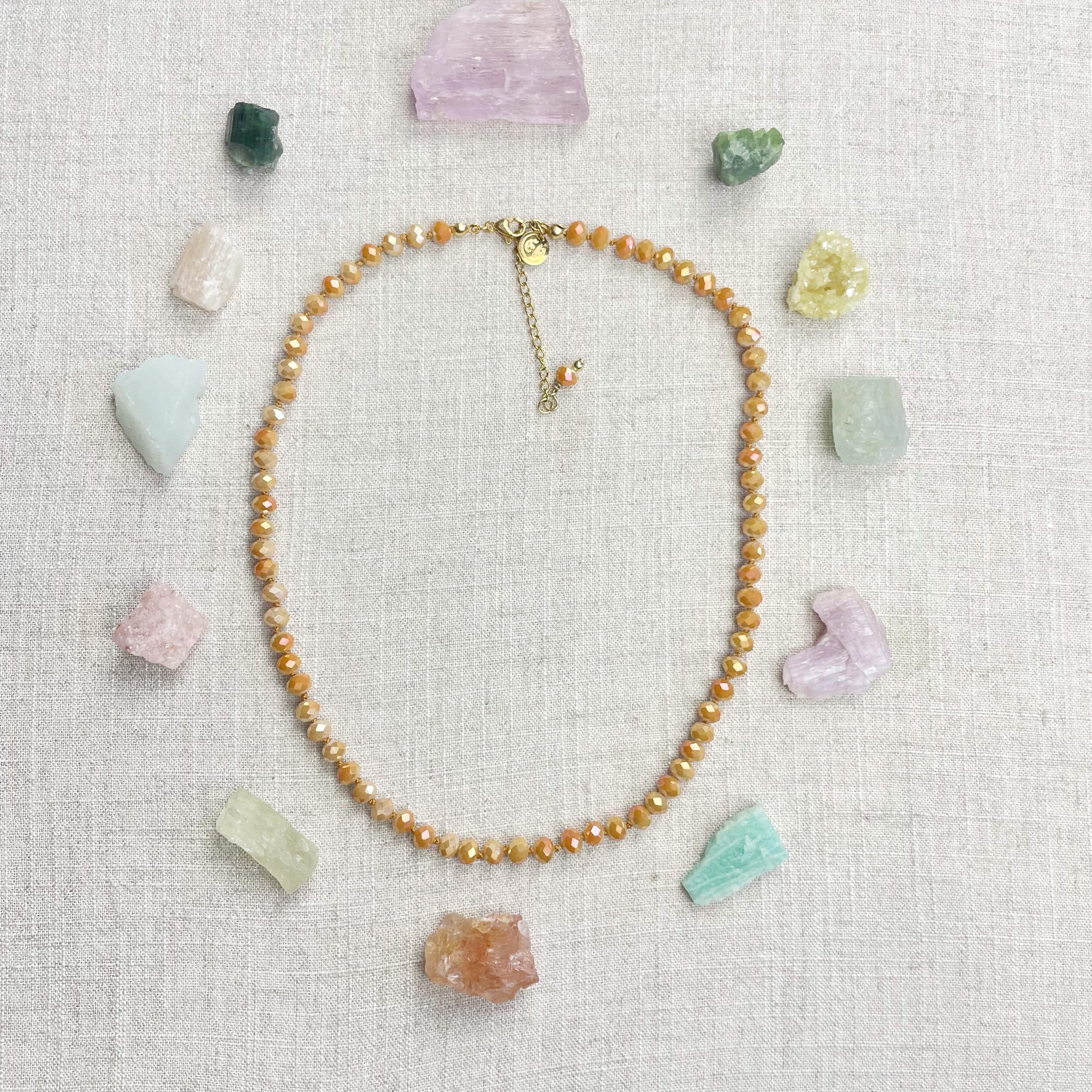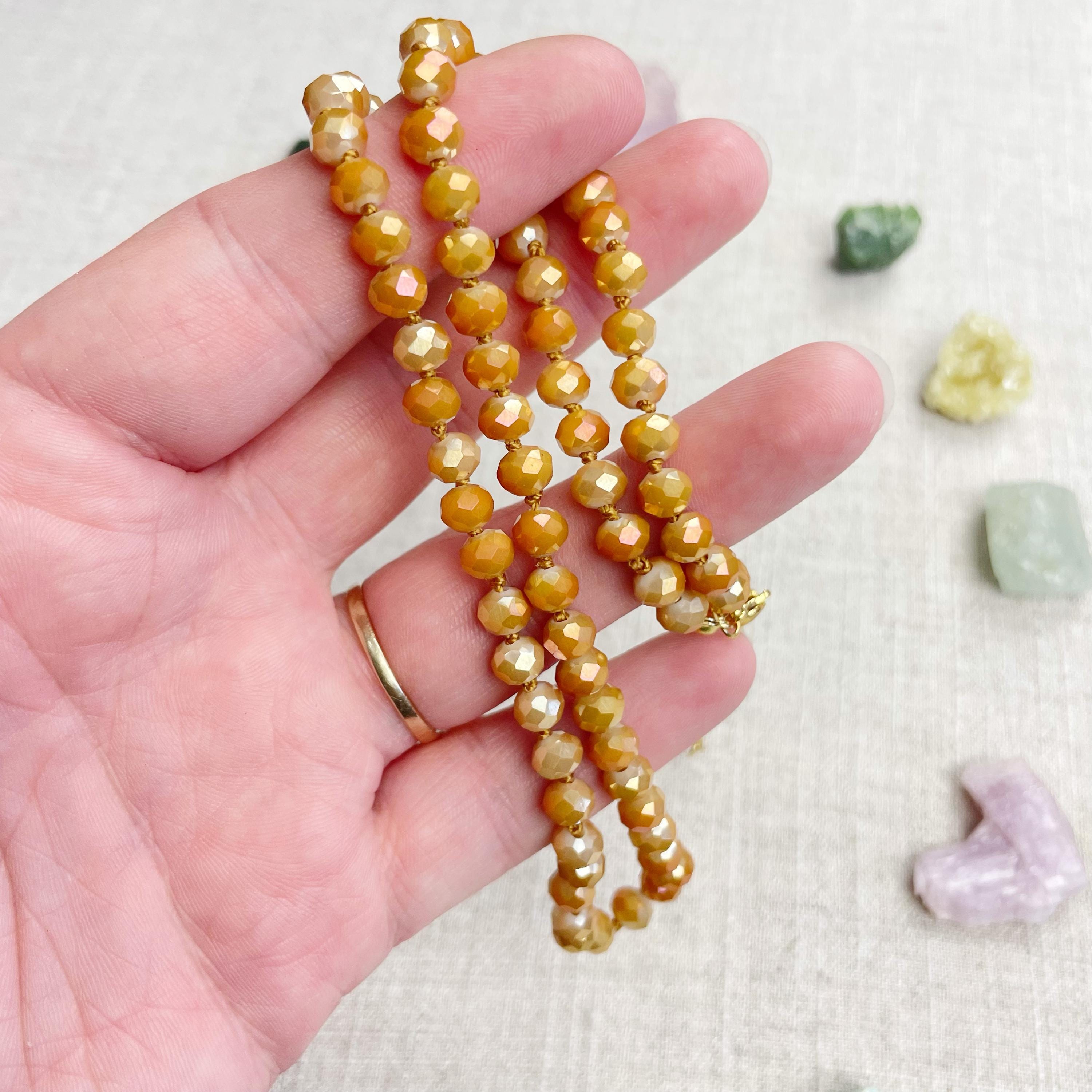 This necklace is made with glass crystal beads which are a caramel color with an iridescent shiny coating. The beads are 6mm faceted rondelle beads. Each bead is hand knotted with 100% nylon cord. The hand knotting in between each beads takes time to do but looks gorgeous making the necklace also very easy to wear. The necklace is finished off with a gold plated stainless steel chain, clasp and logo charm.