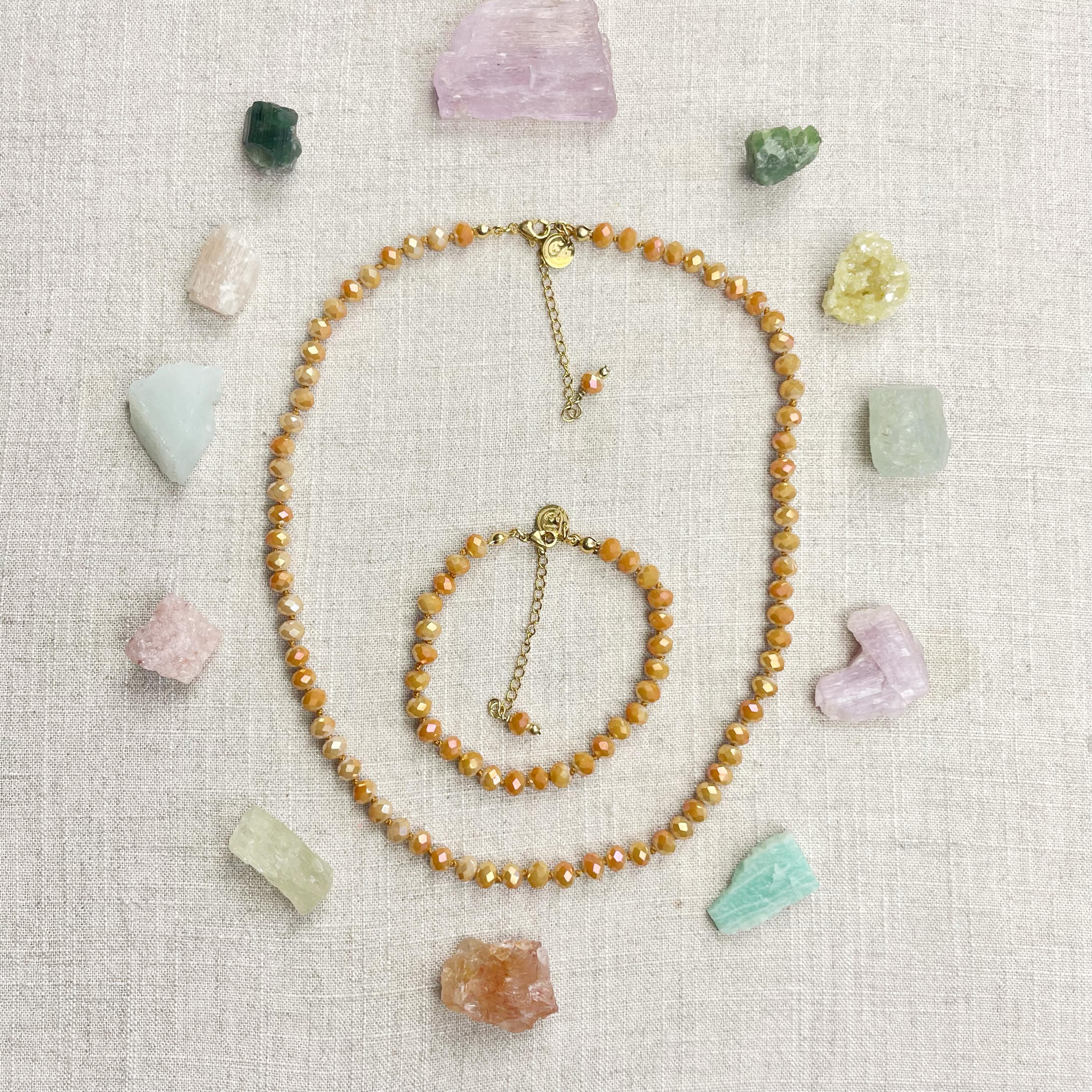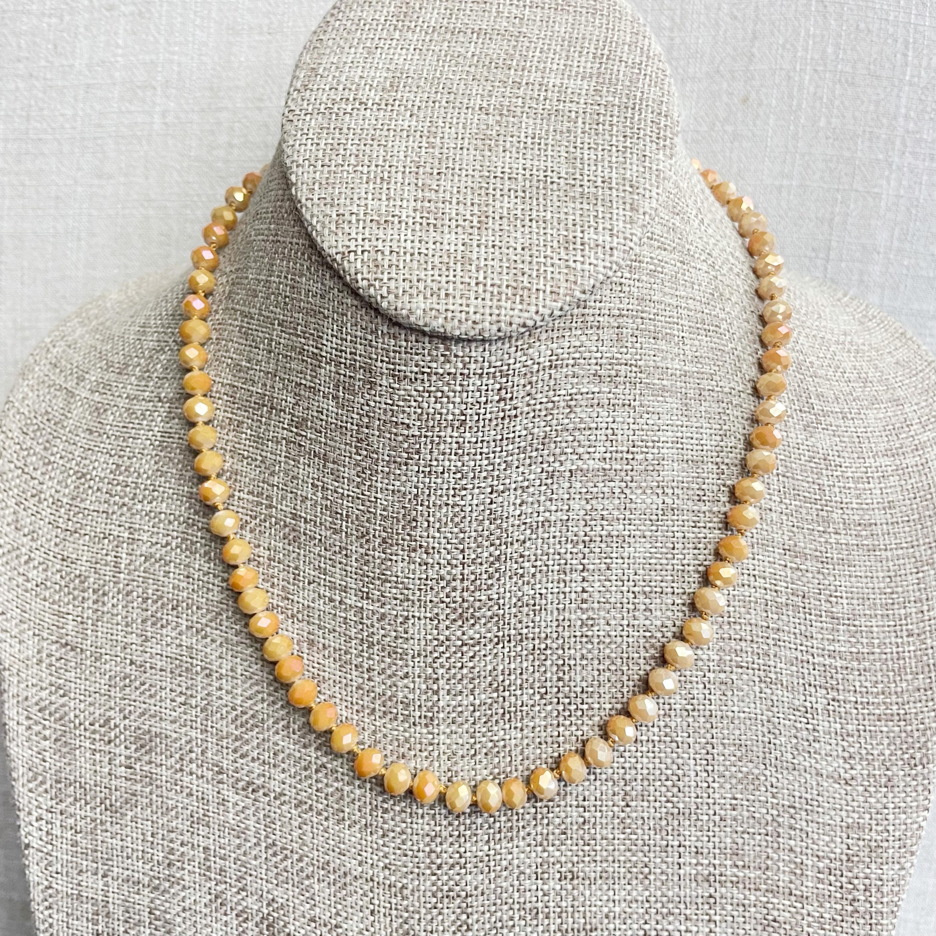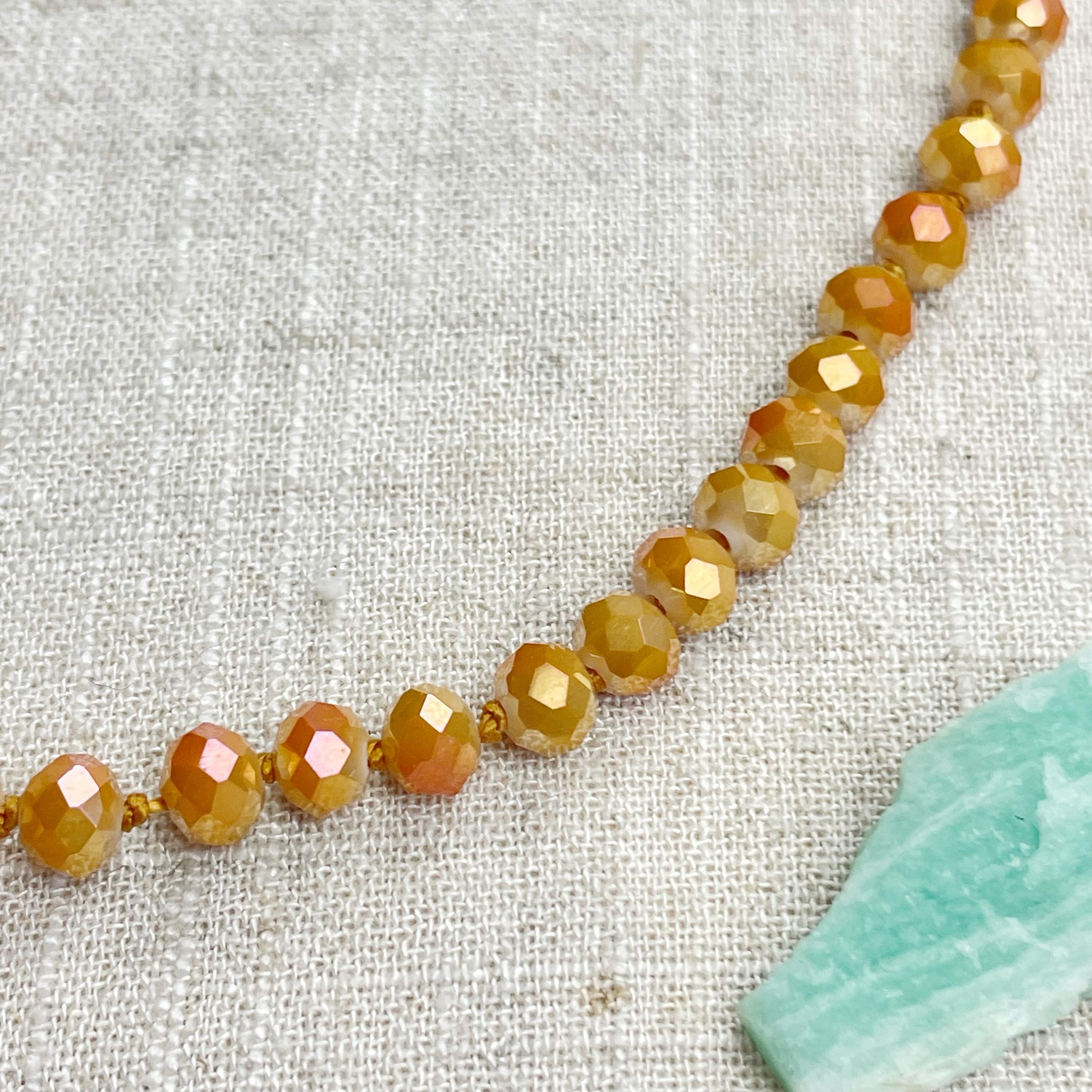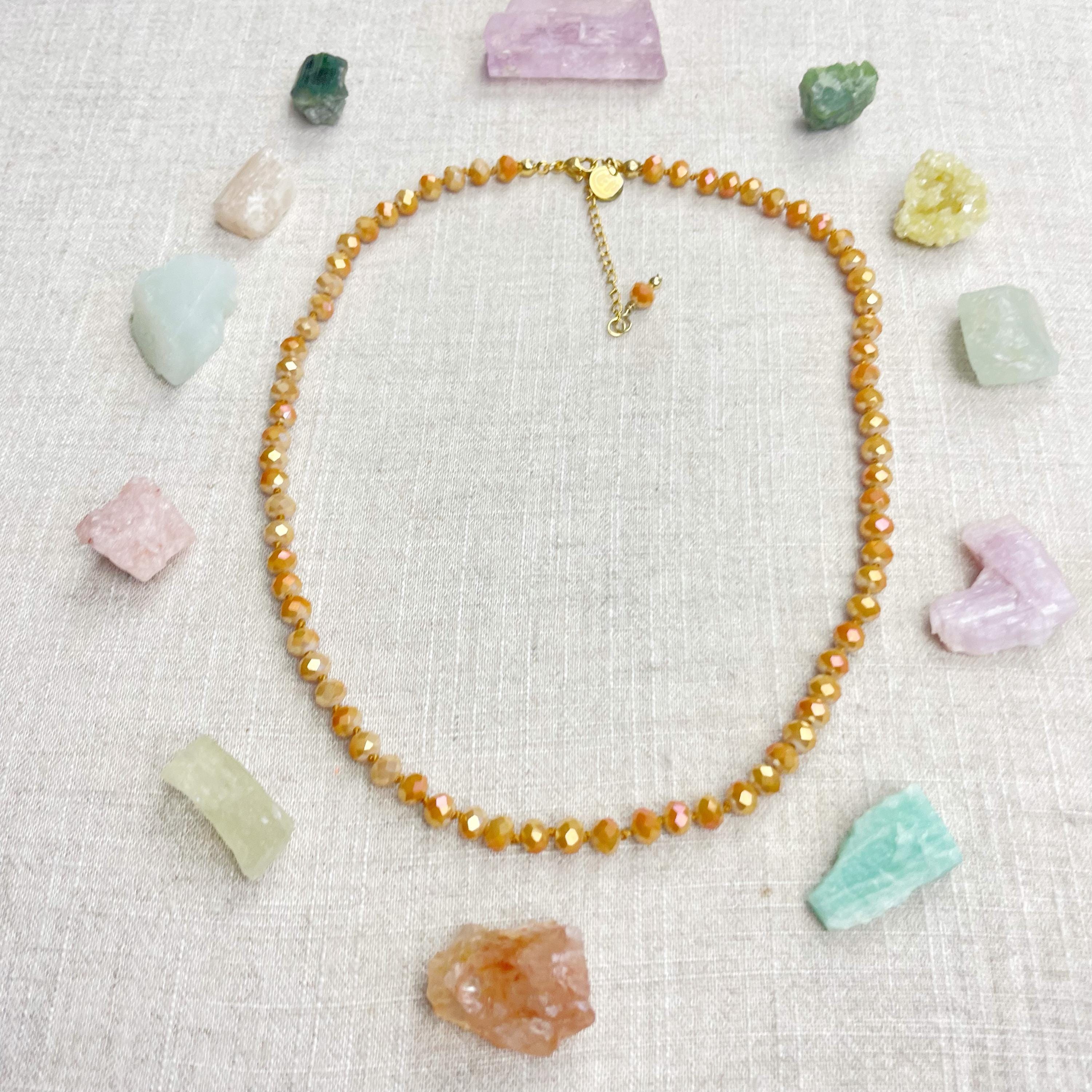 This necklace is made with glass crystal beads which are a caramel color with an iridescent shiny coating. The beads are 6mm faceted rondelle beads. Each bead is hand knotted with 100% nylon cord. The hand knotting in between each beads takes time to do but looks gorgeous making the necklace also very easy to wear. The necklace is finished off with a gold plated stainless steel chain, clasp and logo charm.