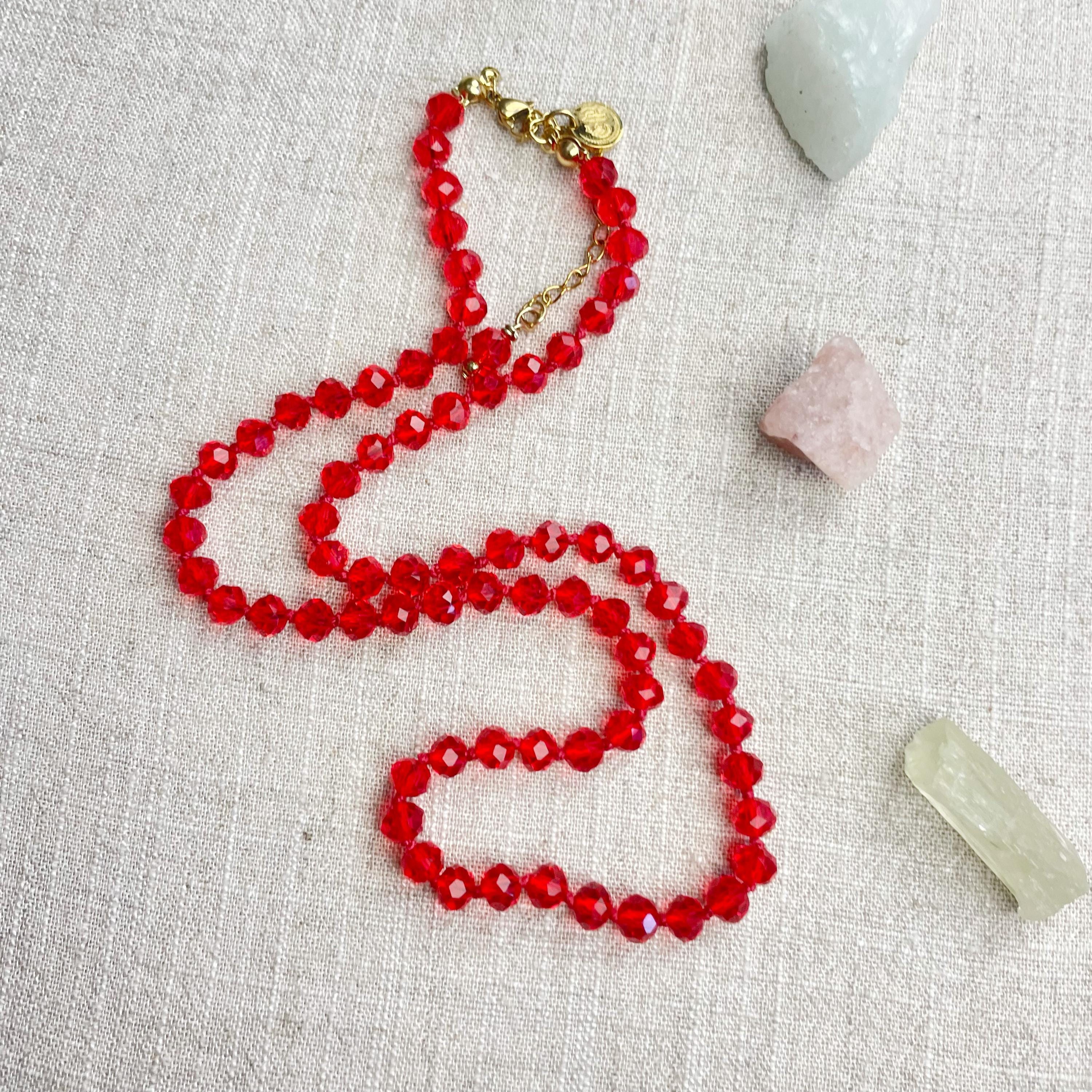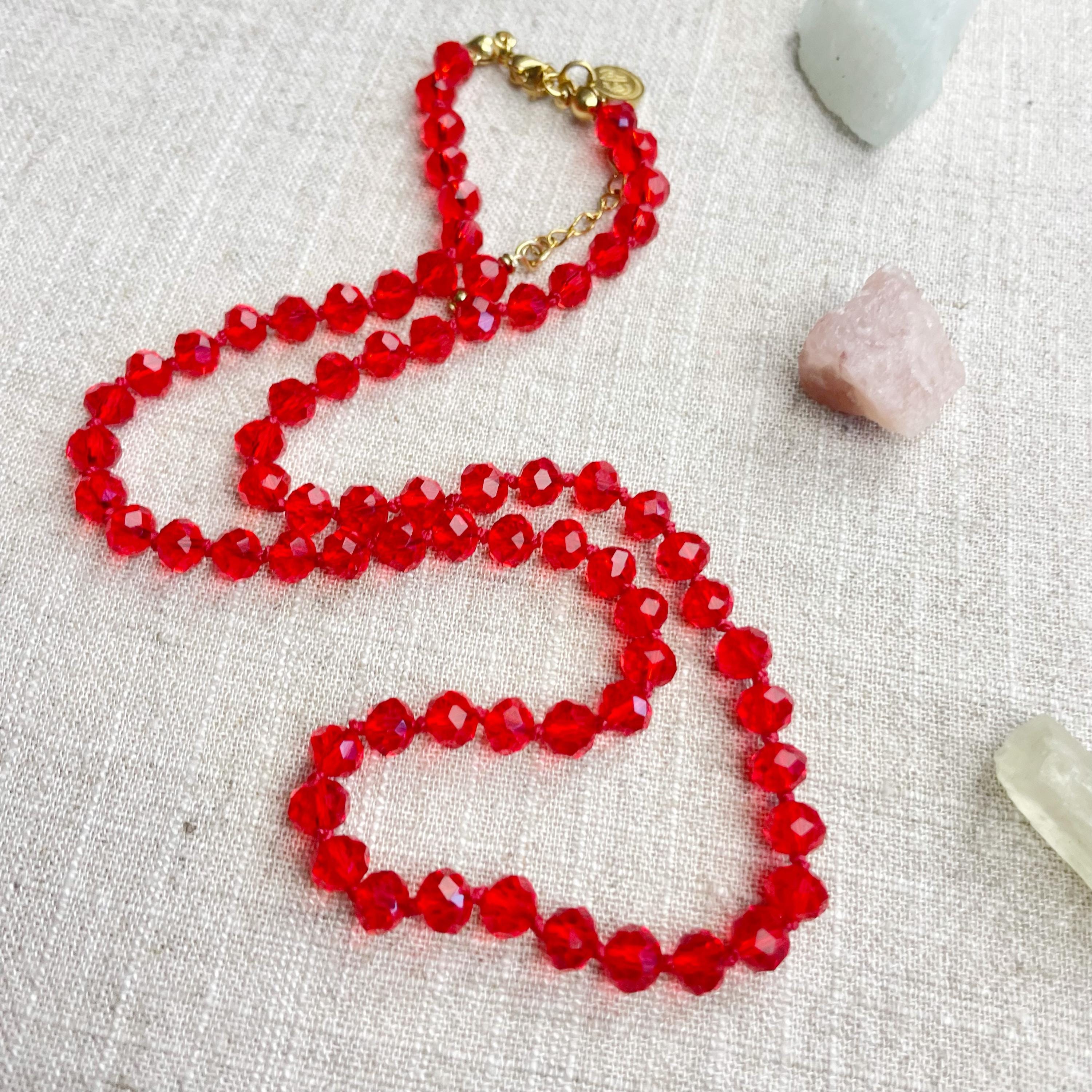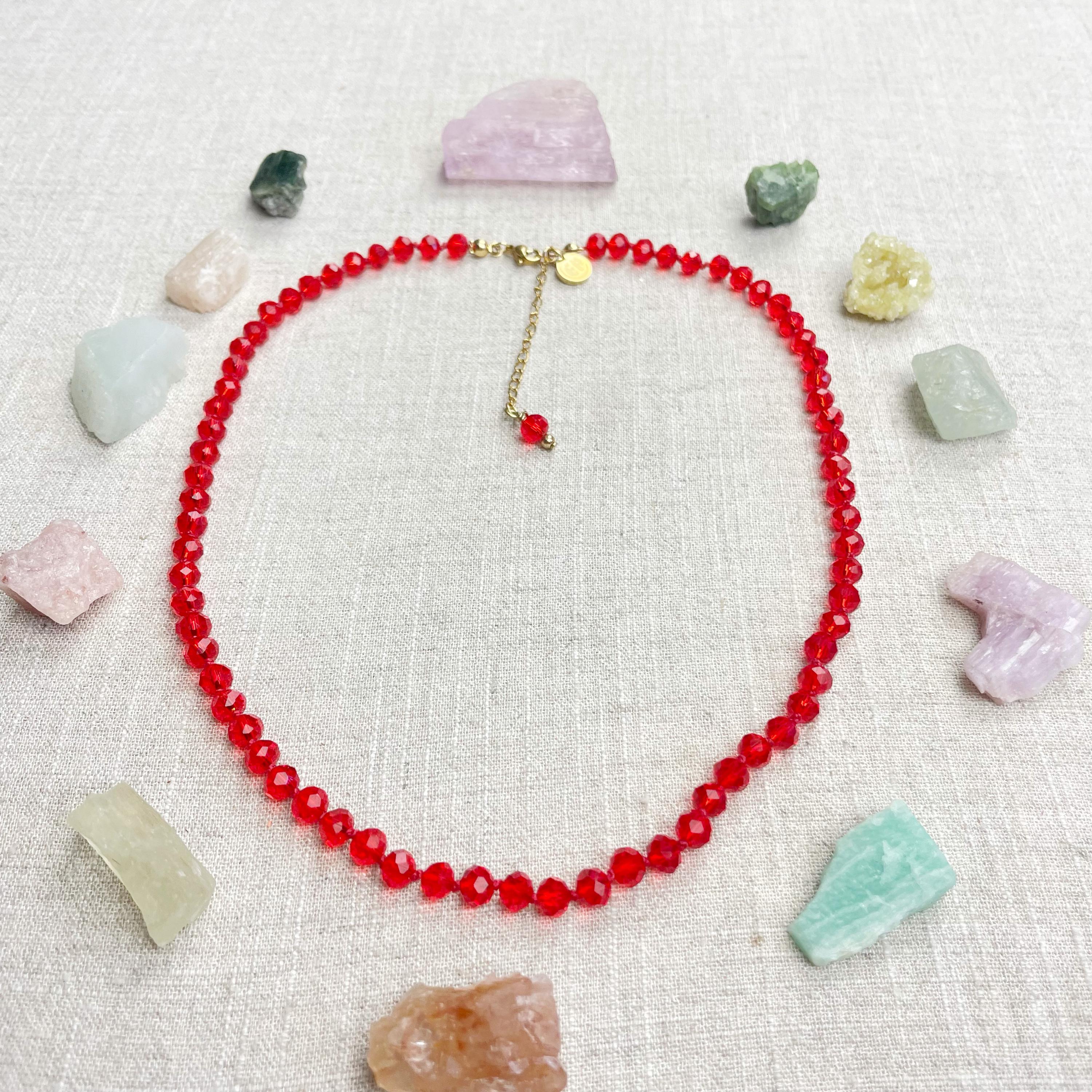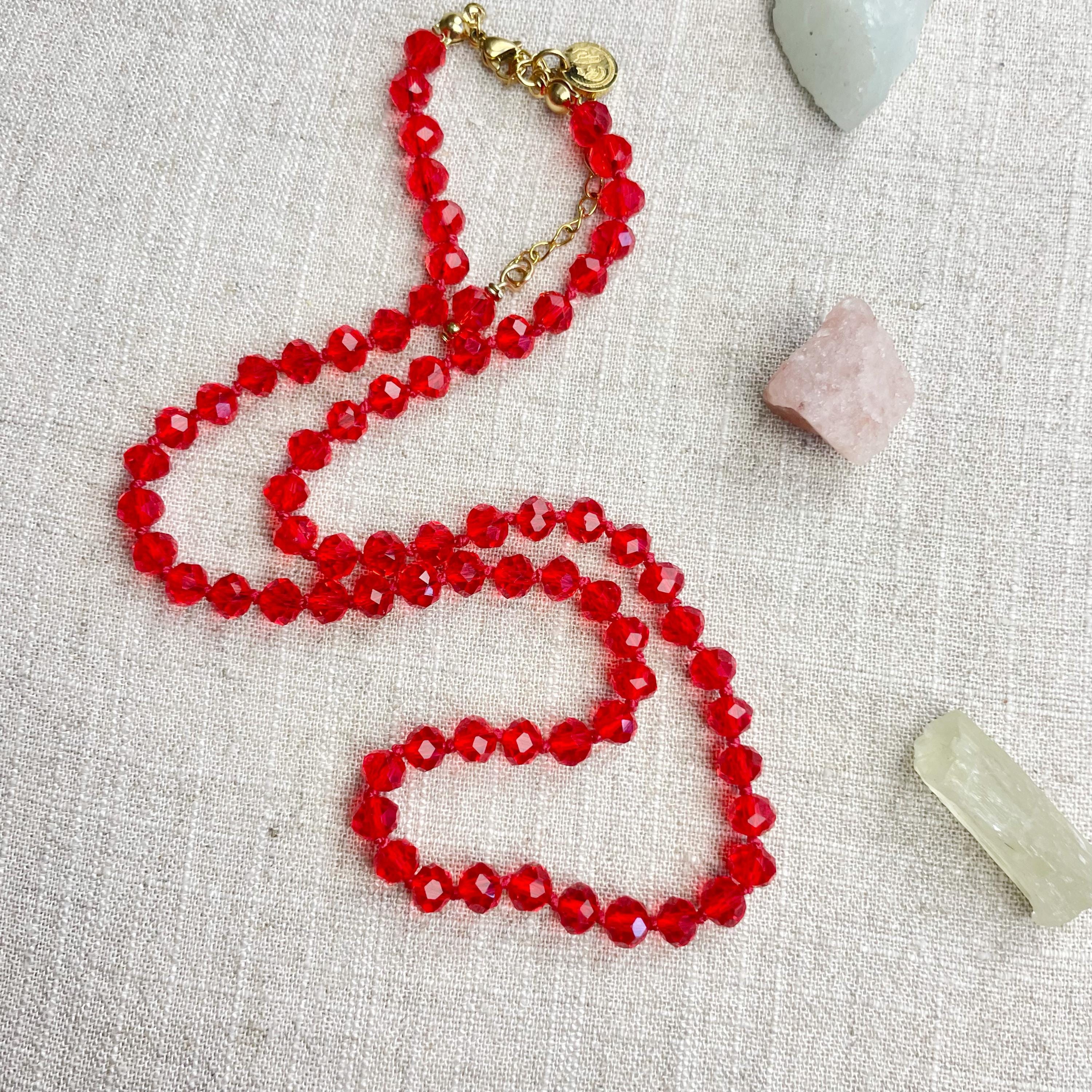 This necklace is made with glass crystal beads which are a translucent scarlet red color. The beads are 6mm faceted rondelle beads. Each bead is hand knotted with 100% nylon cord. The hand knotting in between each beads takes time to do but looks gorgeous making the necklace also very easy to wear. The necklace is finished off with a gold plated stainless steel chain, clasp and logo charm.