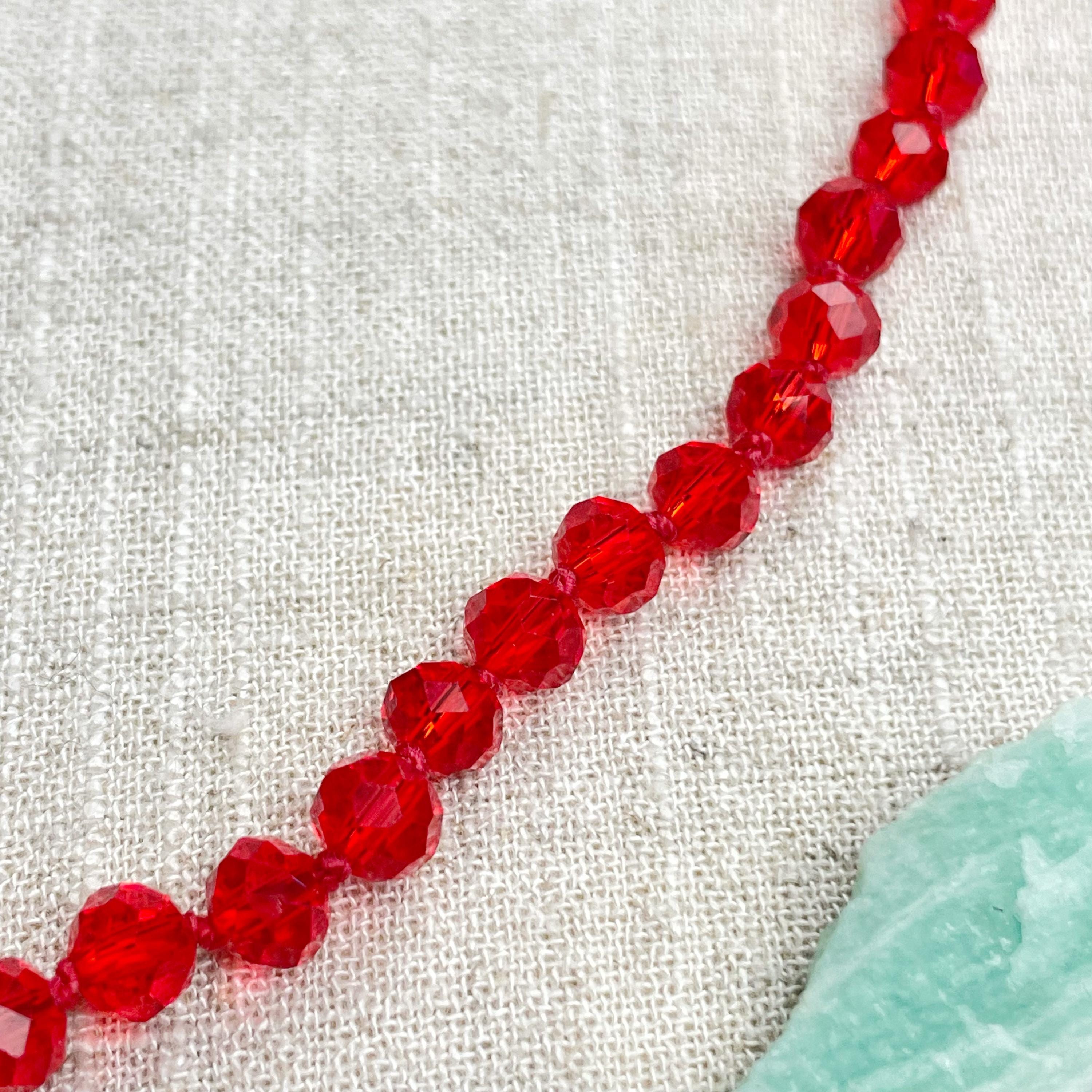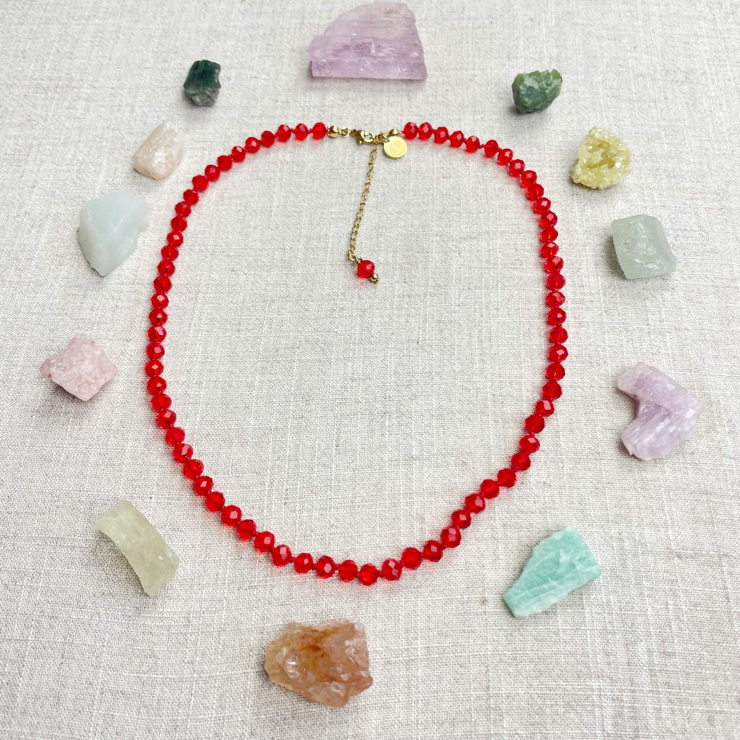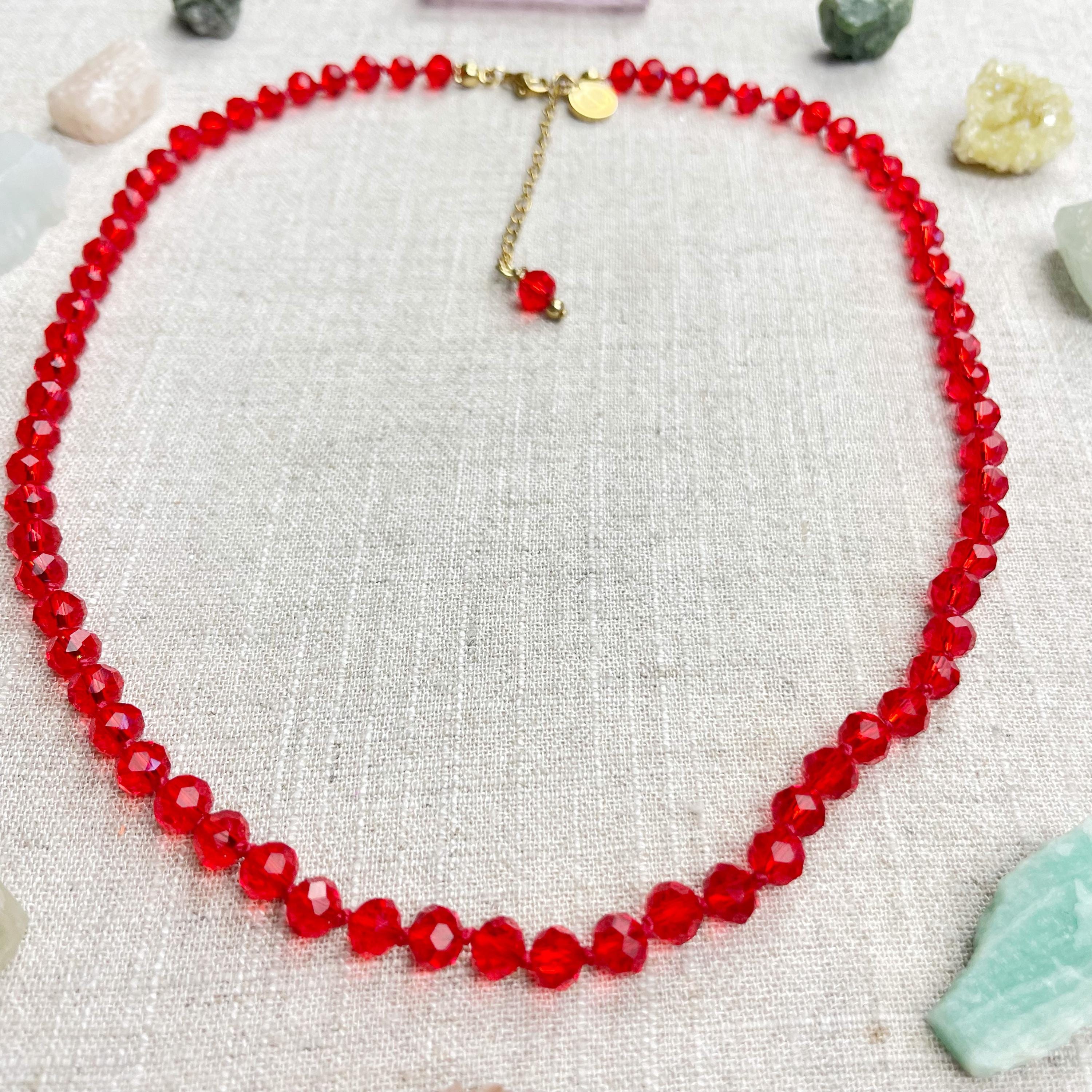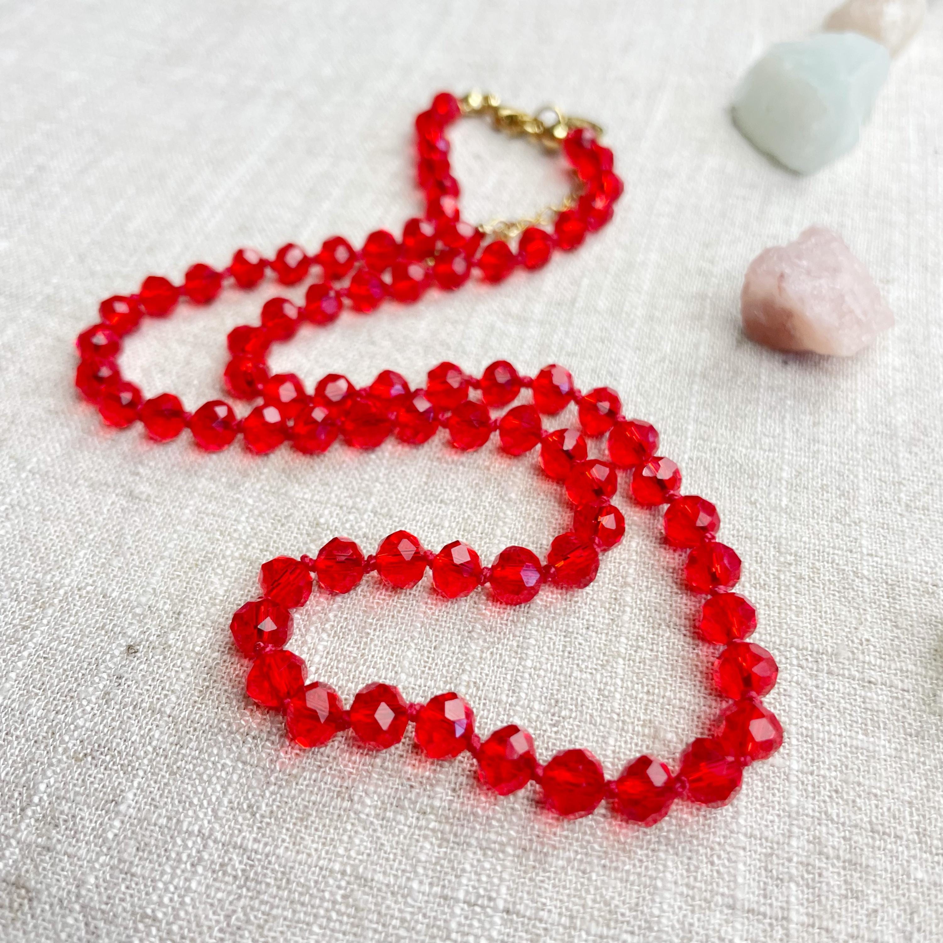 This necklace is made with glass crystal beads which are a translucent scarlet red color. The beads are 6mm faceted rondelle beads. Each bead is hand knotted with 100% nylon cord. The hand knotting in between each beads takes time to do but looks gorgeous making the necklace also very easy to wear. The necklace is finished off with a gold plated stainless steel chain, clasp and logo charm.