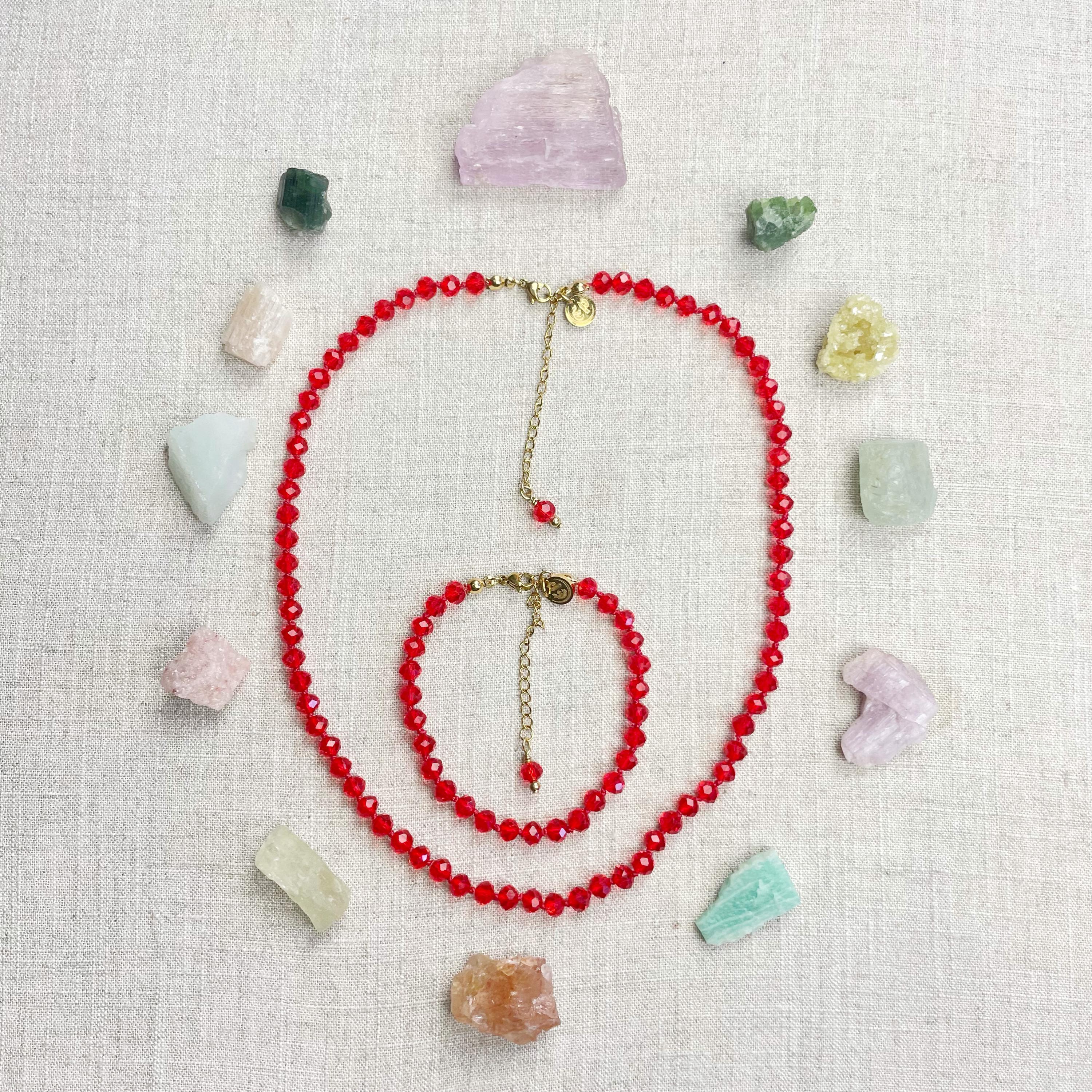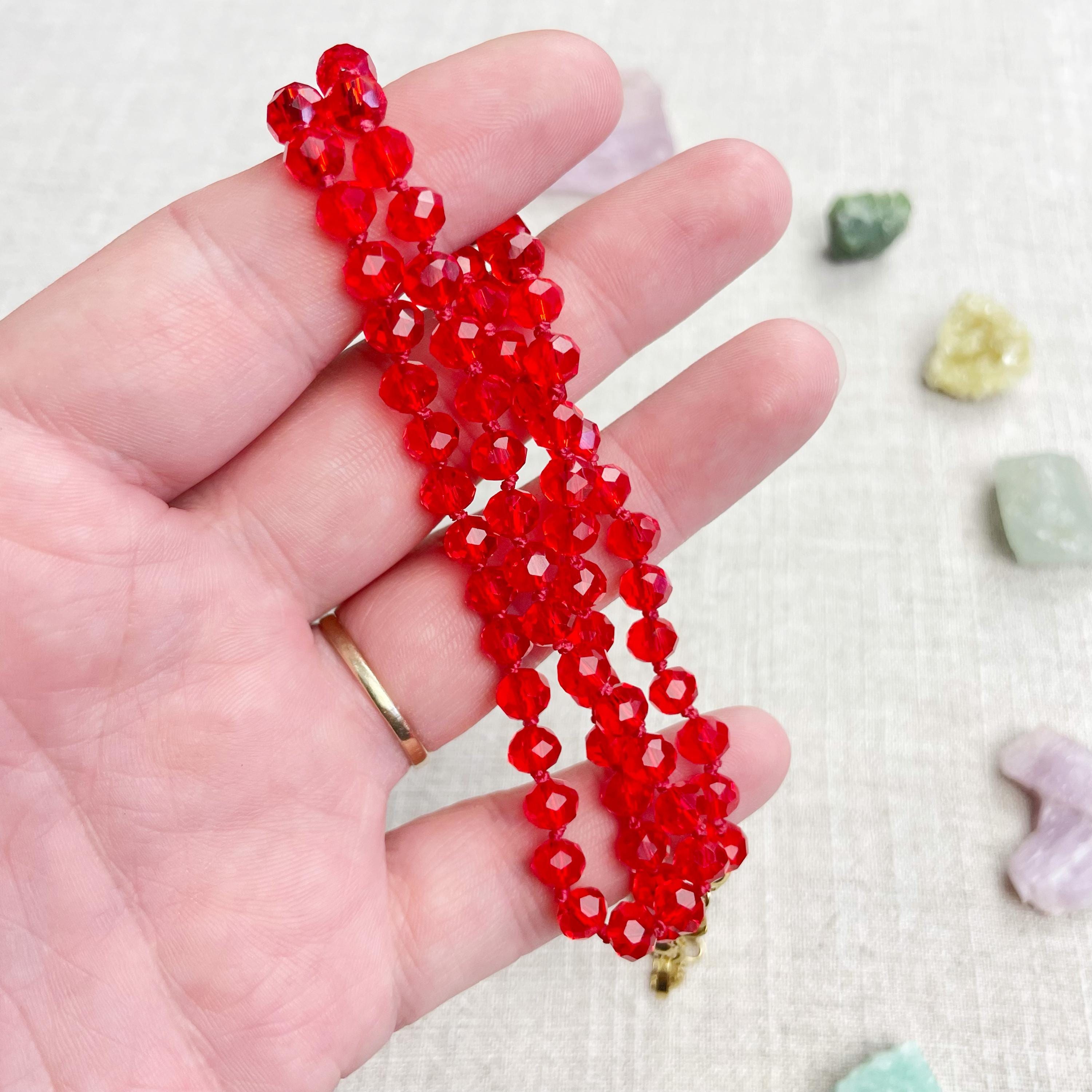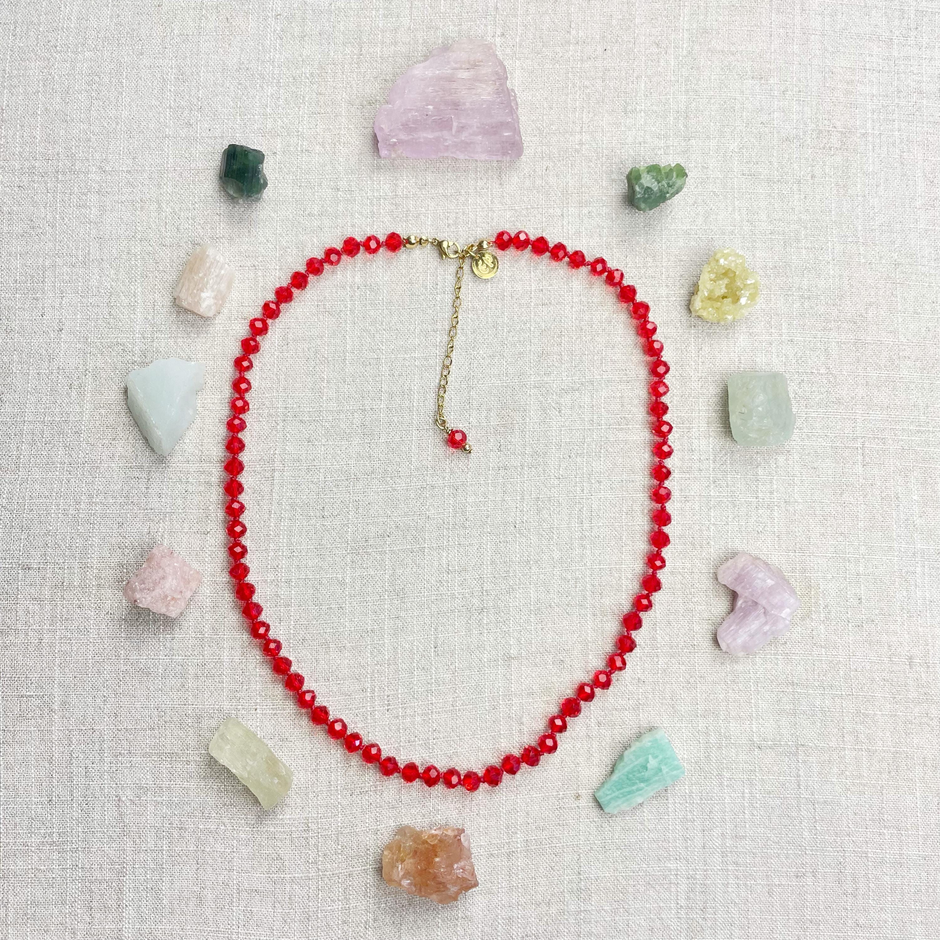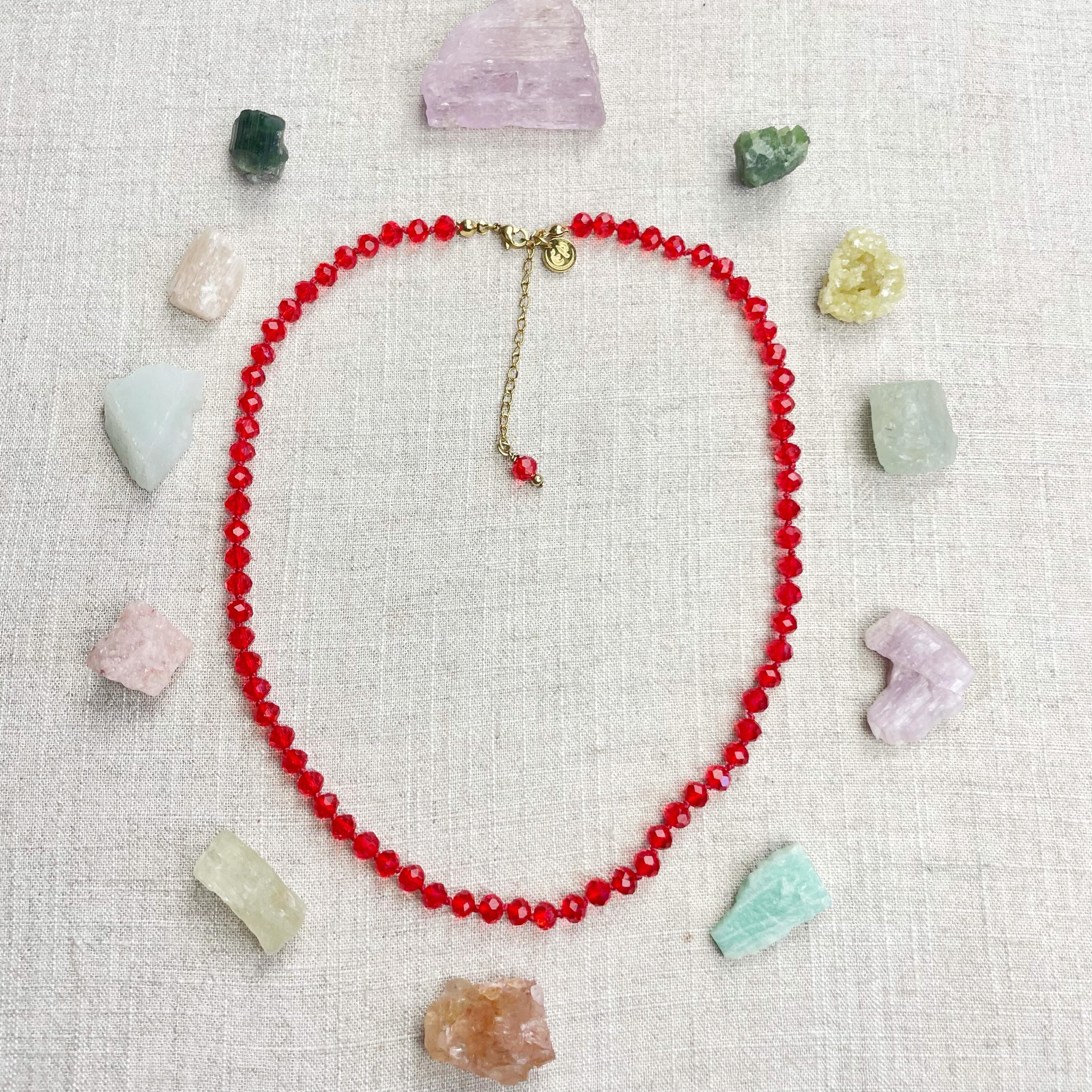 This necklace is made with glass crystal beads which are a translucent scarlet red color. The beads are 6mm faceted rondelle beads. Each bead is hand knotted with 100% nylon cord. The hand knotting in between each beads takes time to do but looks gorgeous making the necklace also very easy to wear. The necklace is finished off with a gold plated stainless steel chain, clasp and logo charm.