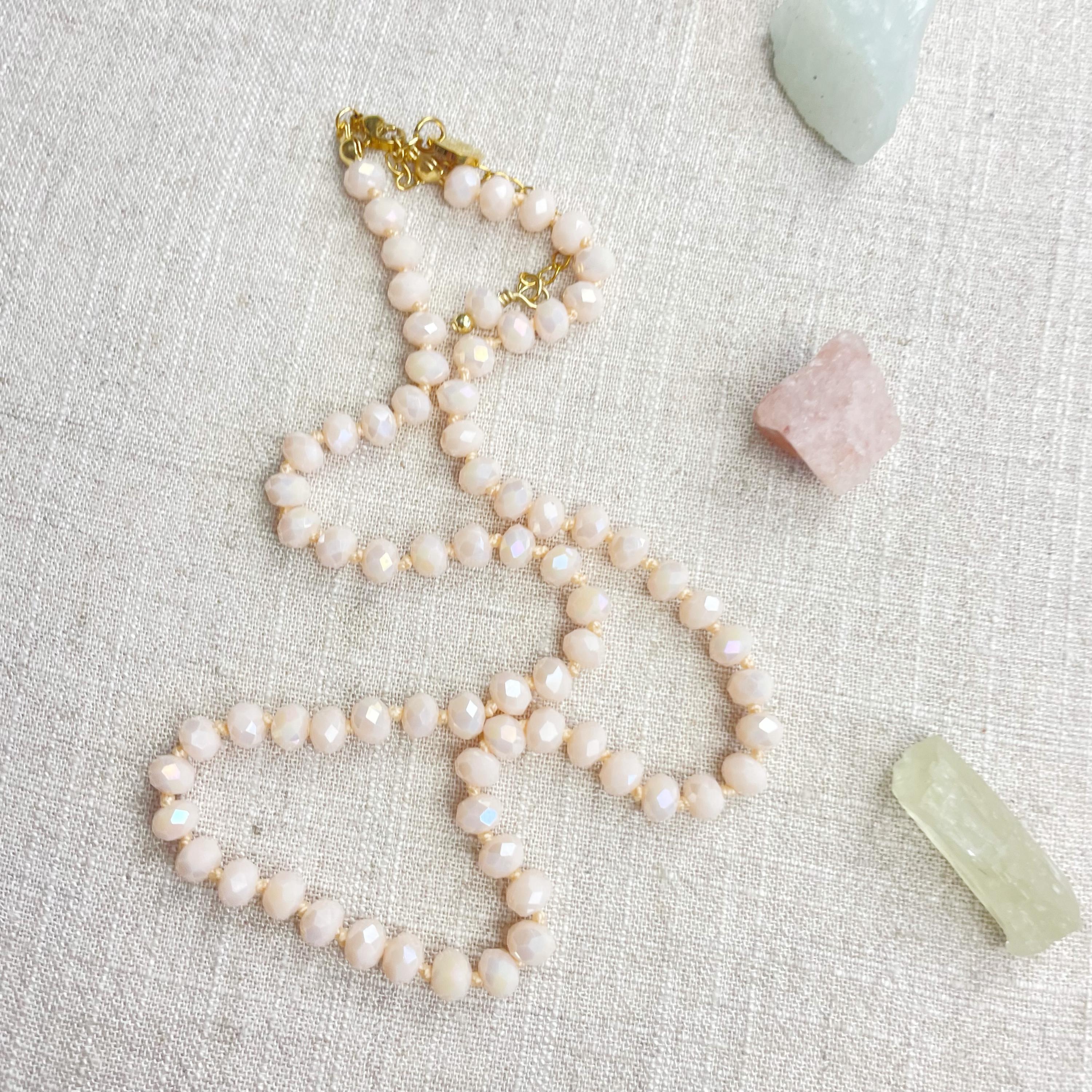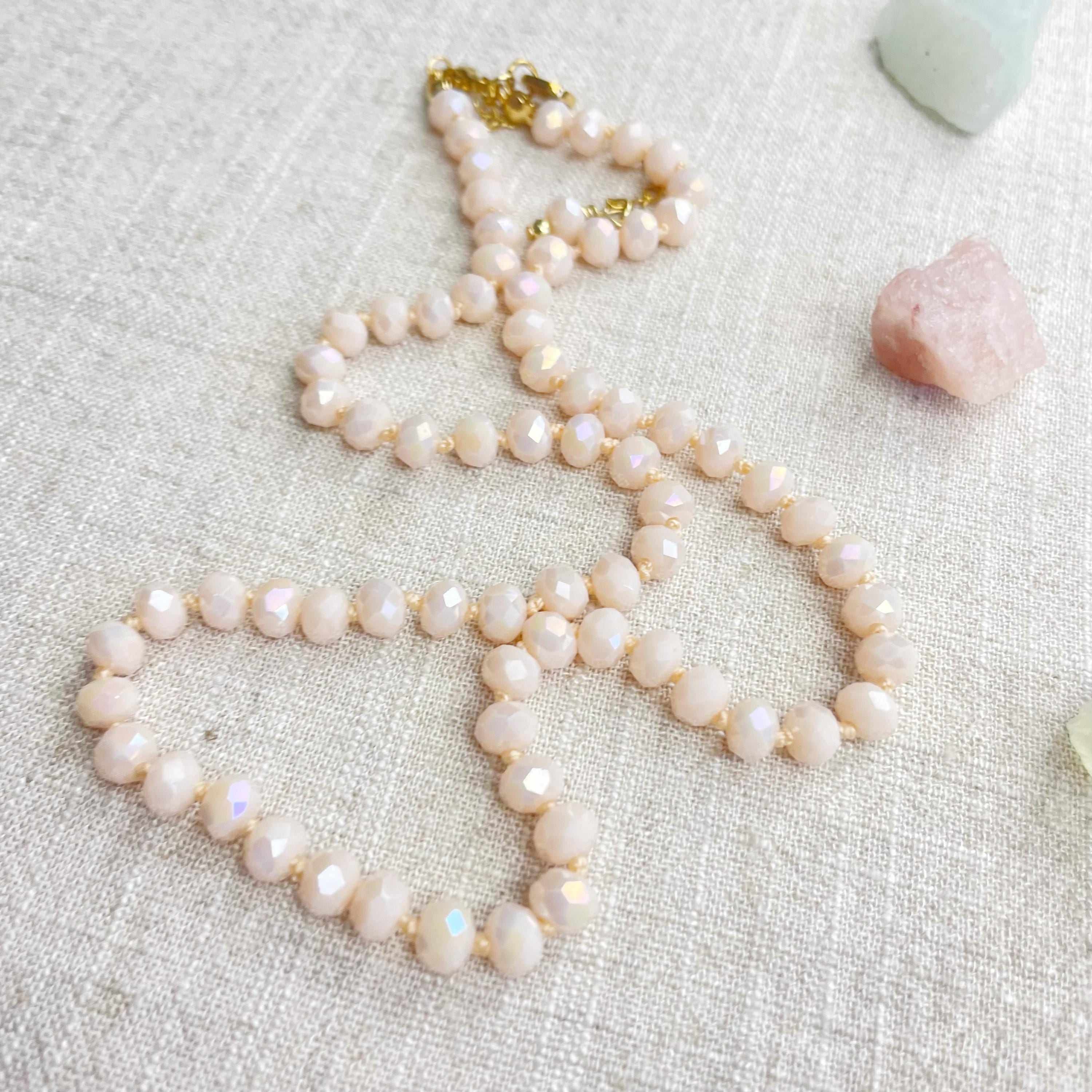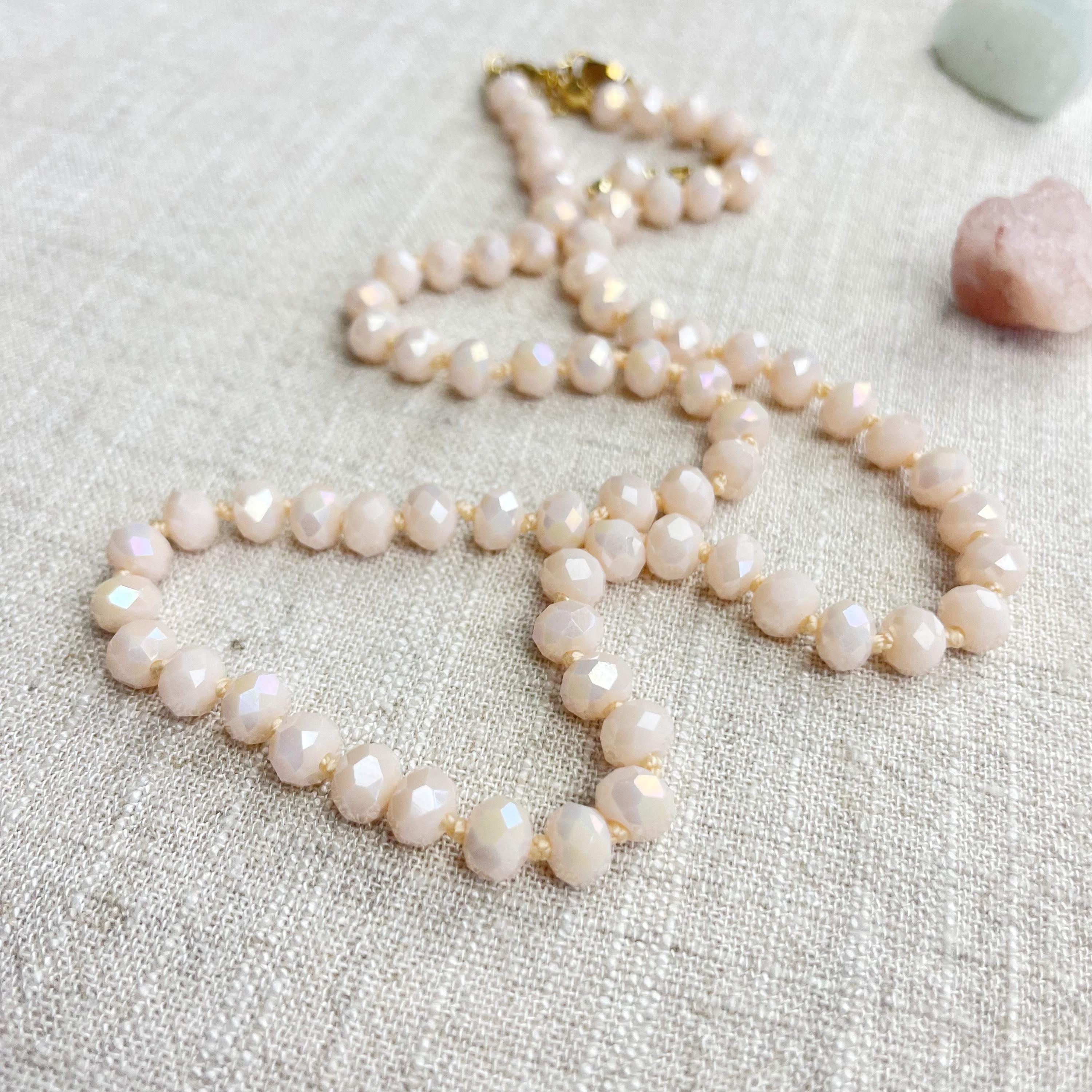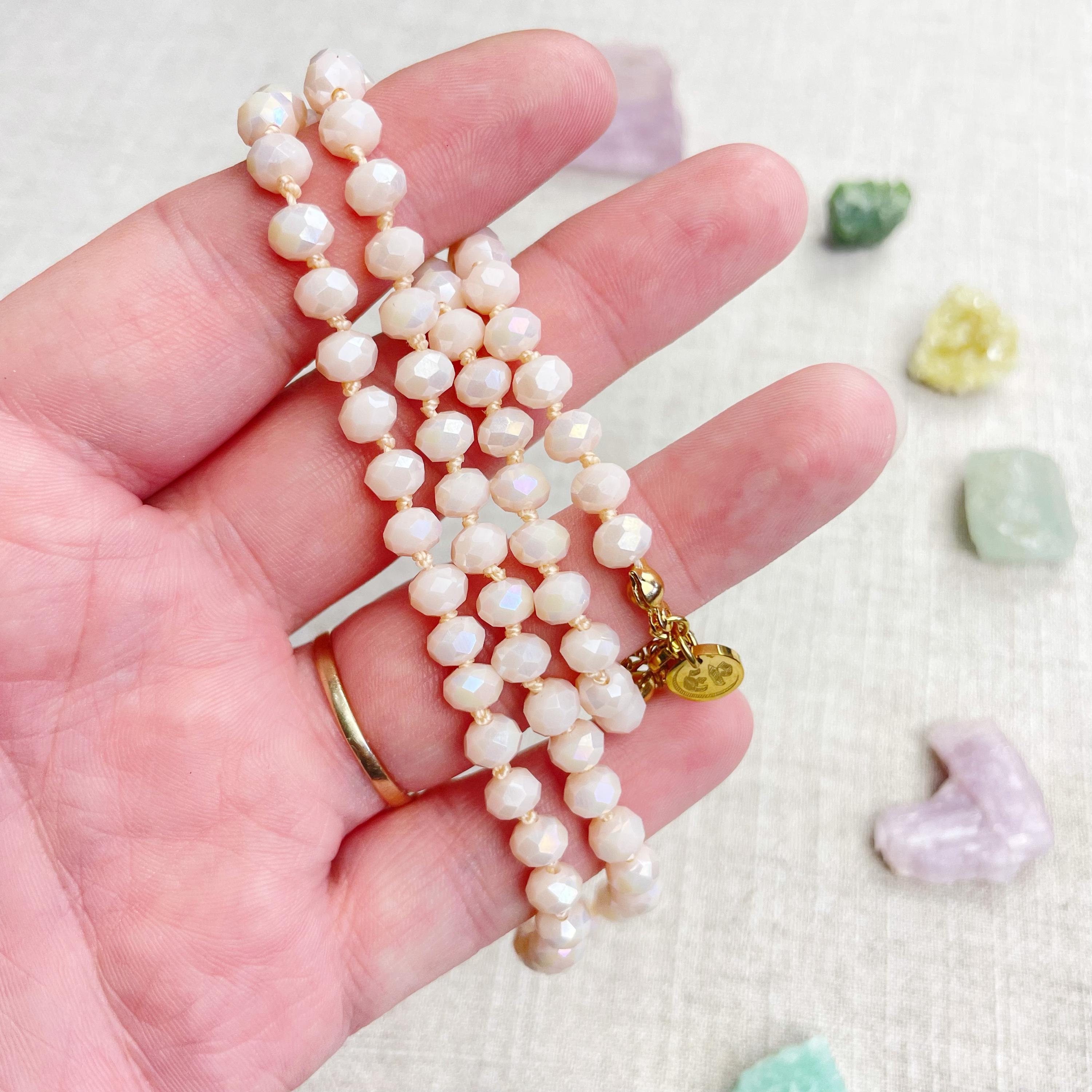 This necklace is made with glass crystal beads which are a cream color with an iridescent shiny coating. The beads are 6mm faceted rondelle beads. Each bead is hand knotted with 100% nylon cord. The hand knotting in between each beads takes time to do but looks gorgeous making the necklace also very easy to wear. The necklace is finished off with a gold plated stainless steel chain, clasp and logo charm.