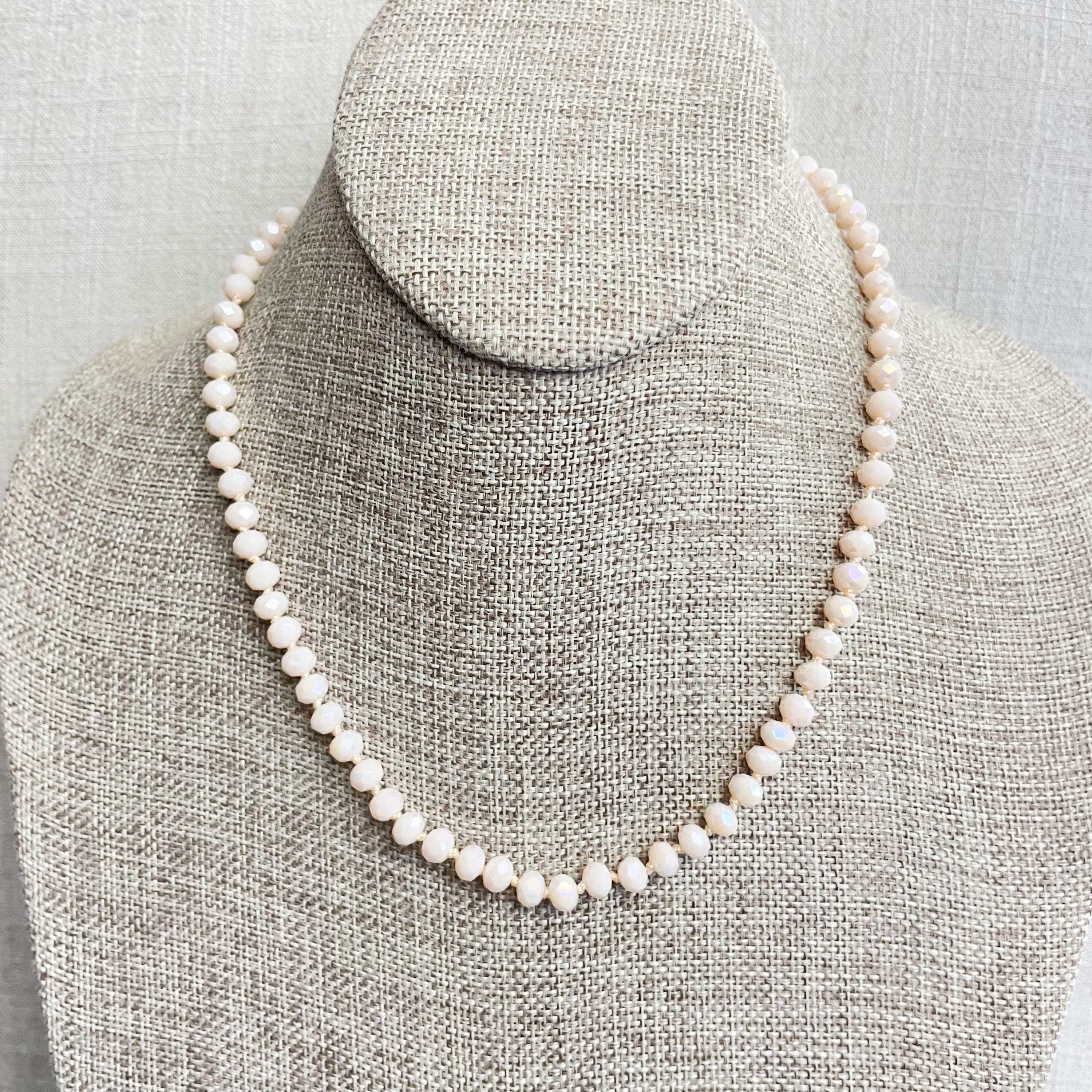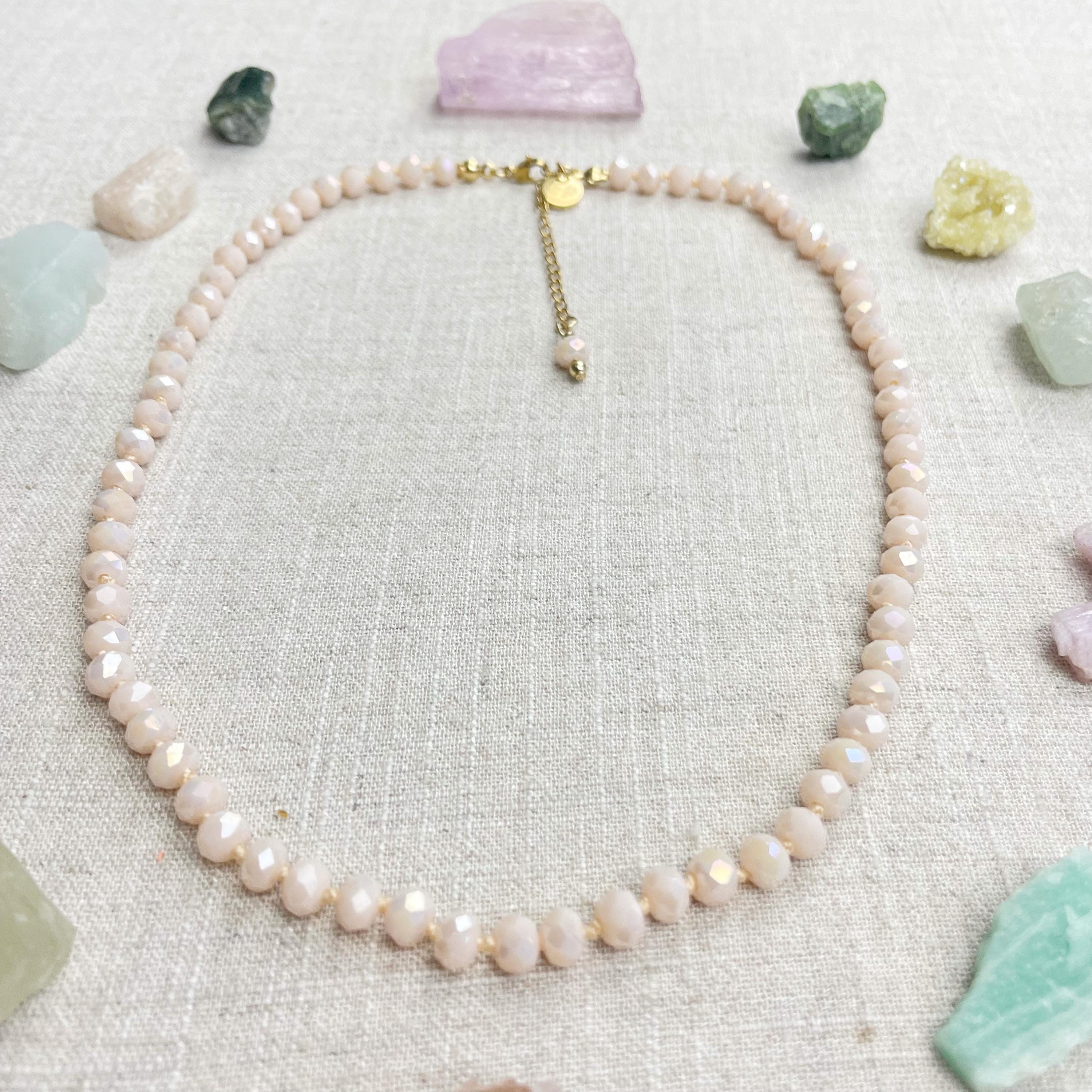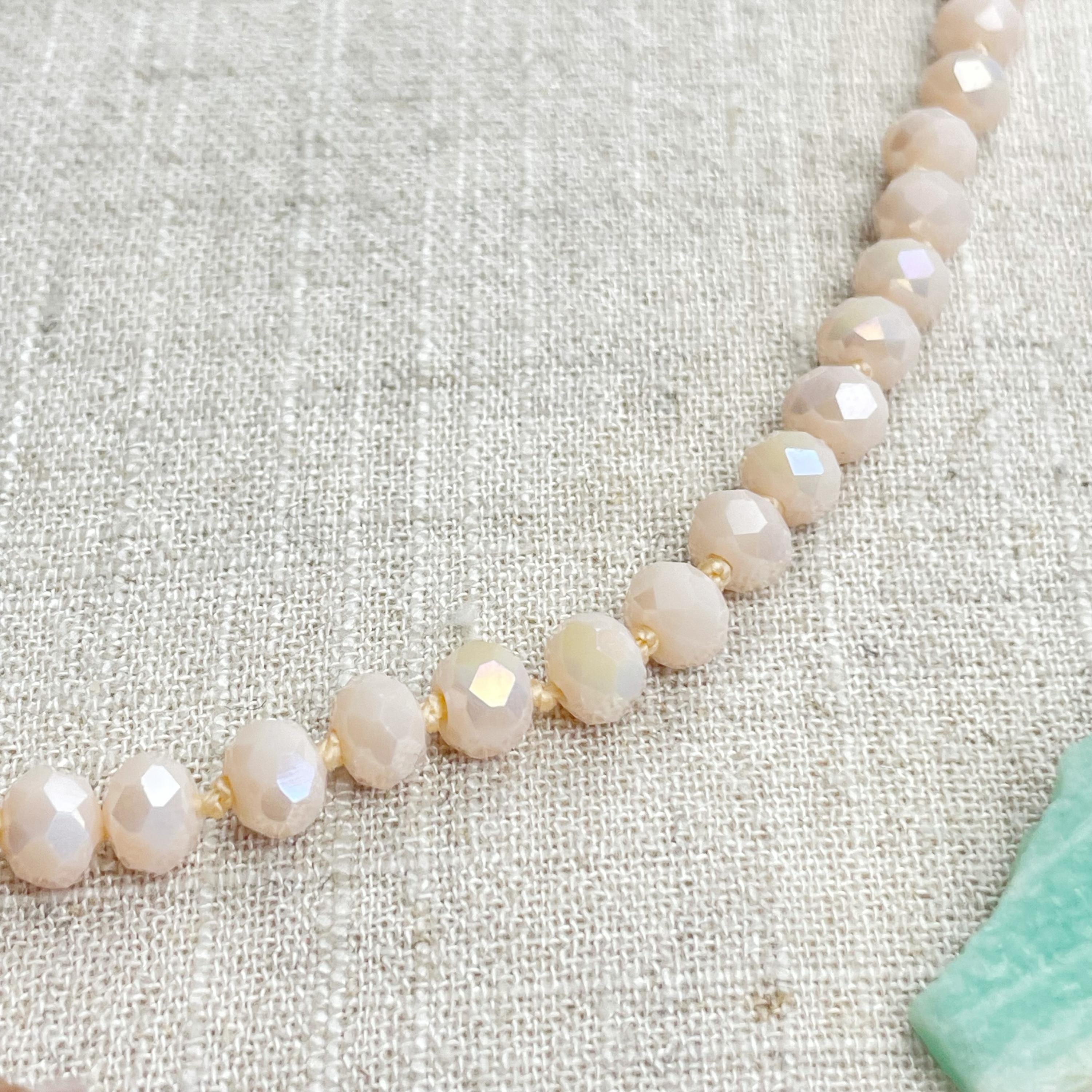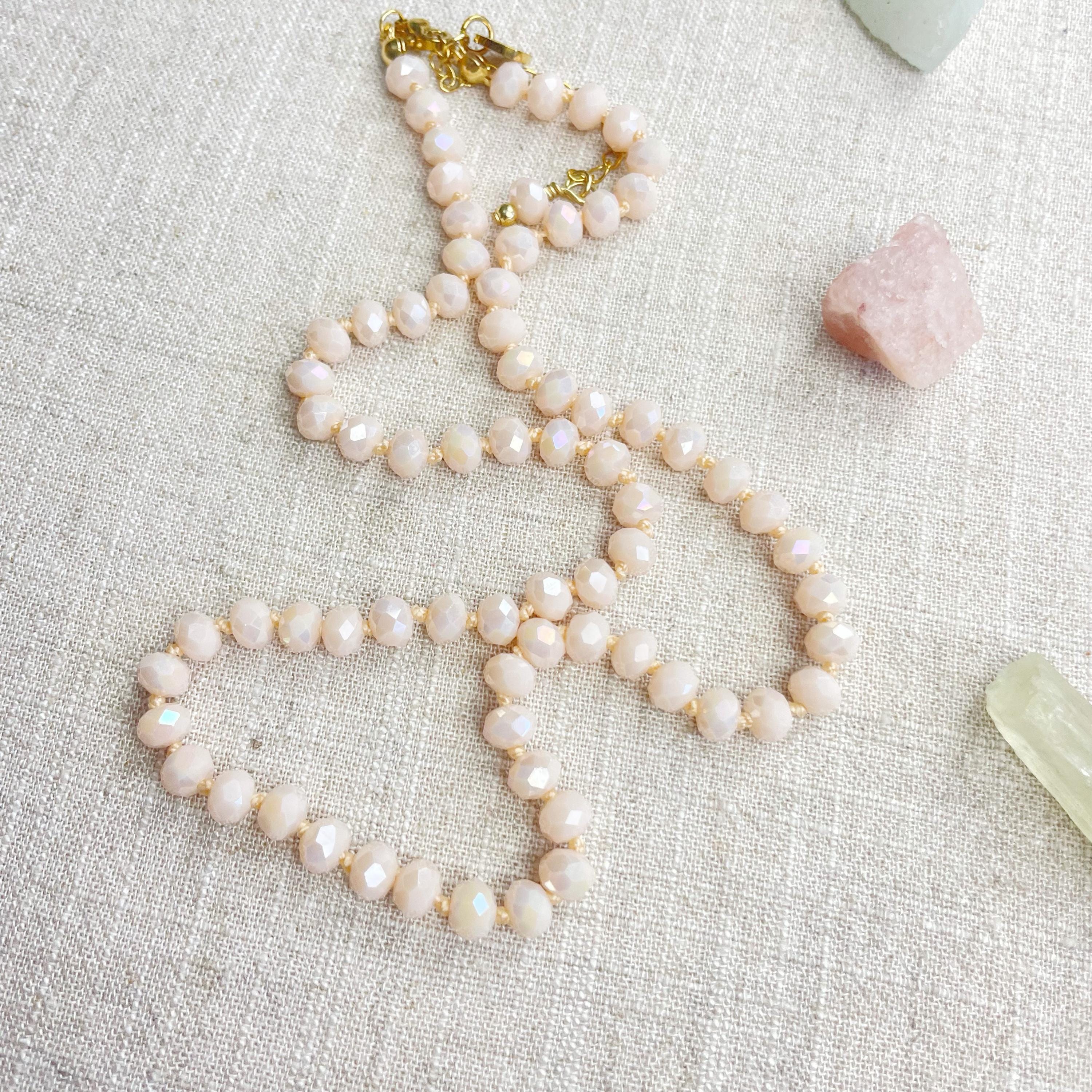 This necklace is made with glass crystal beads which are a cream color with an iridescent shiny coating. The beads are 6mm faceted rondelle beads. Each bead is hand knotted with 100% nylon cord. The hand knotting in between each beads takes time to do but looks gorgeous making the necklace also very easy to wear. The necklace is finished off with a gold plated stainless steel chain, clasp and logo charm.