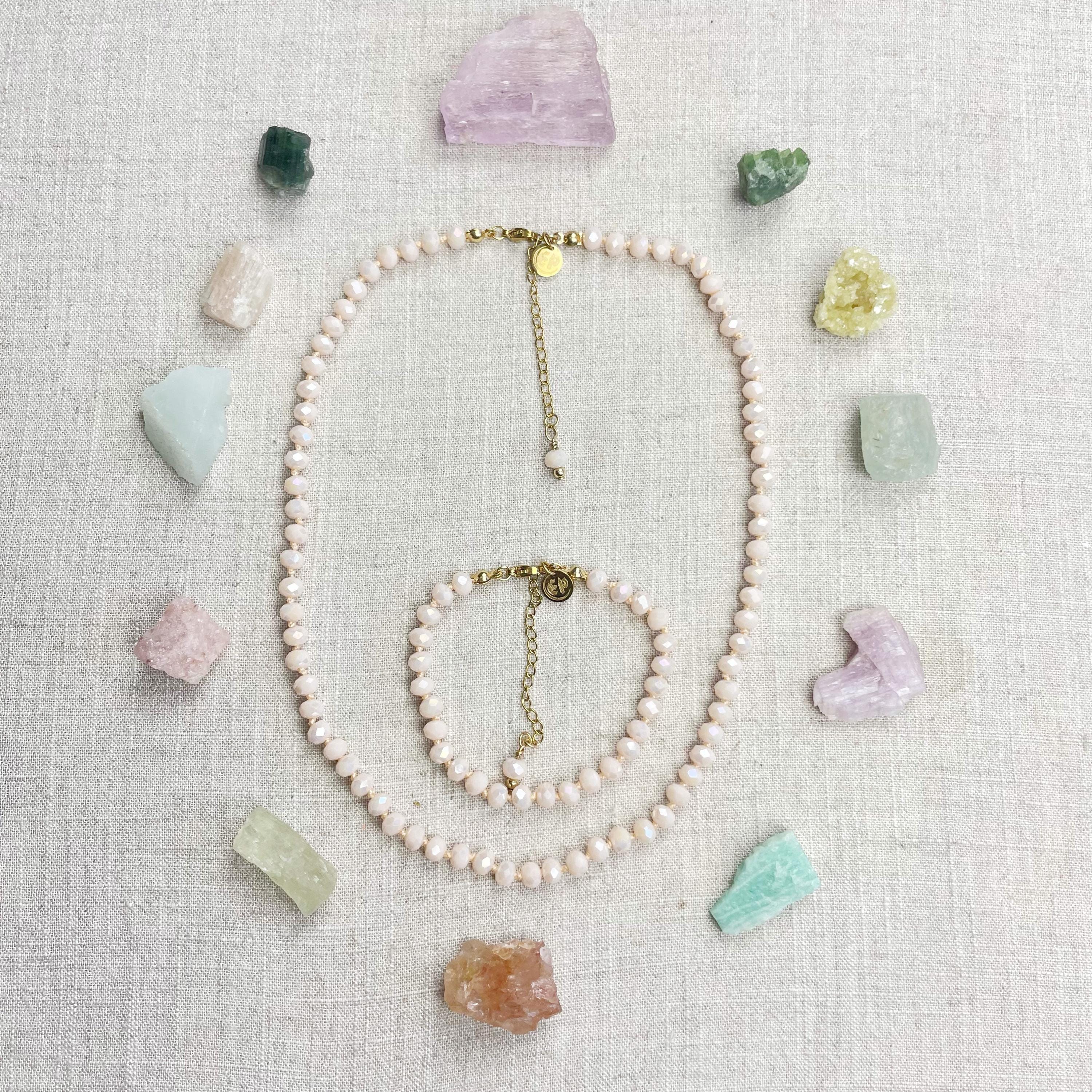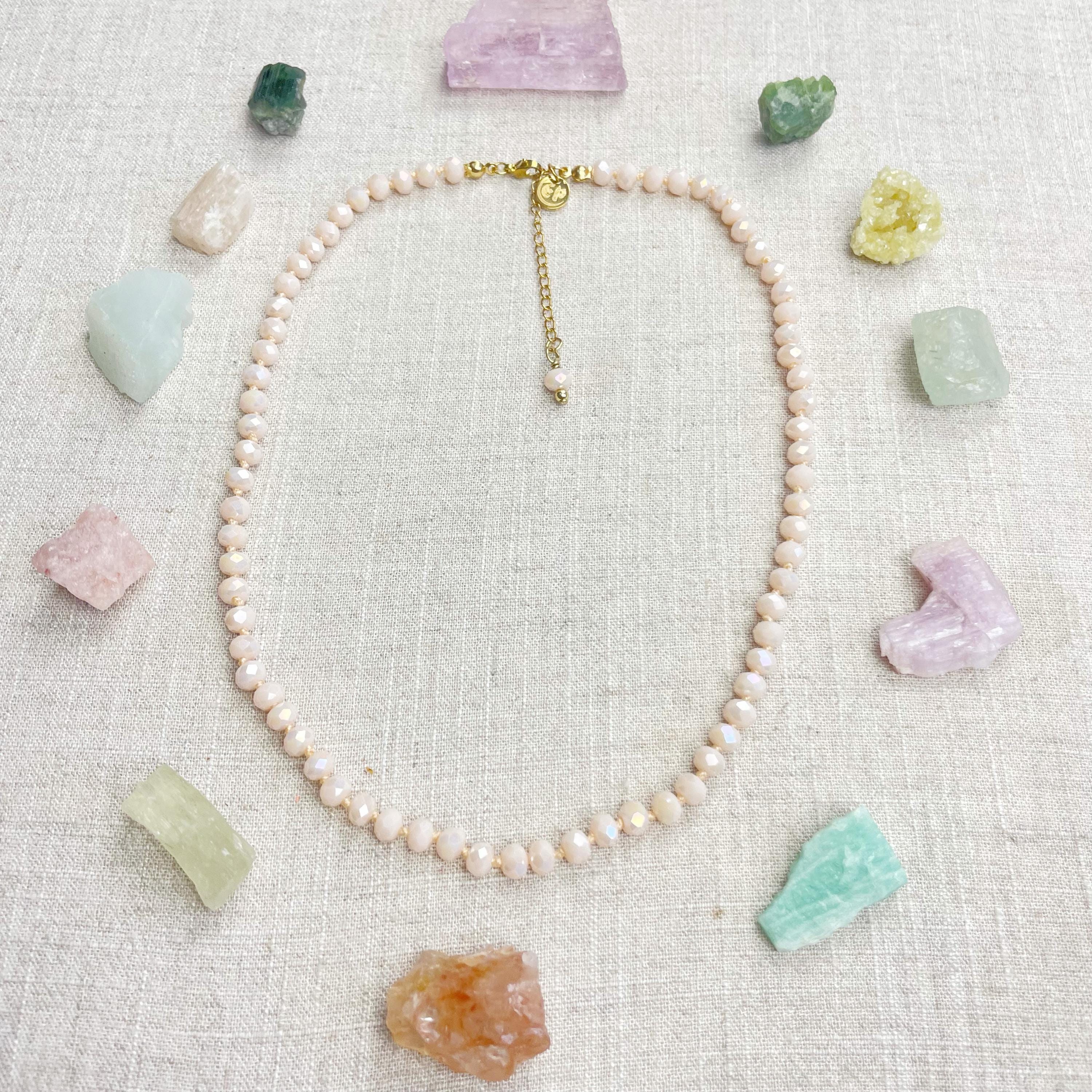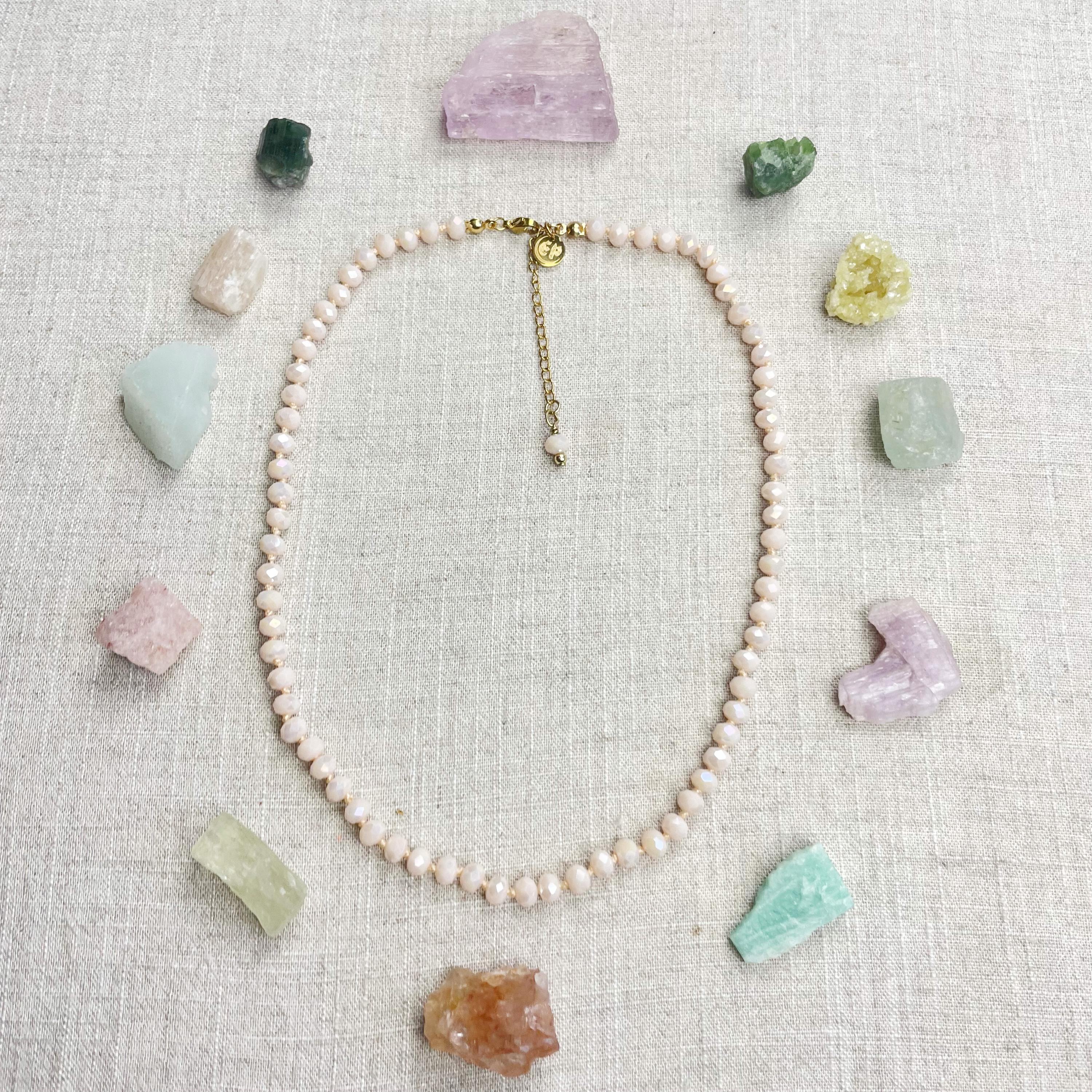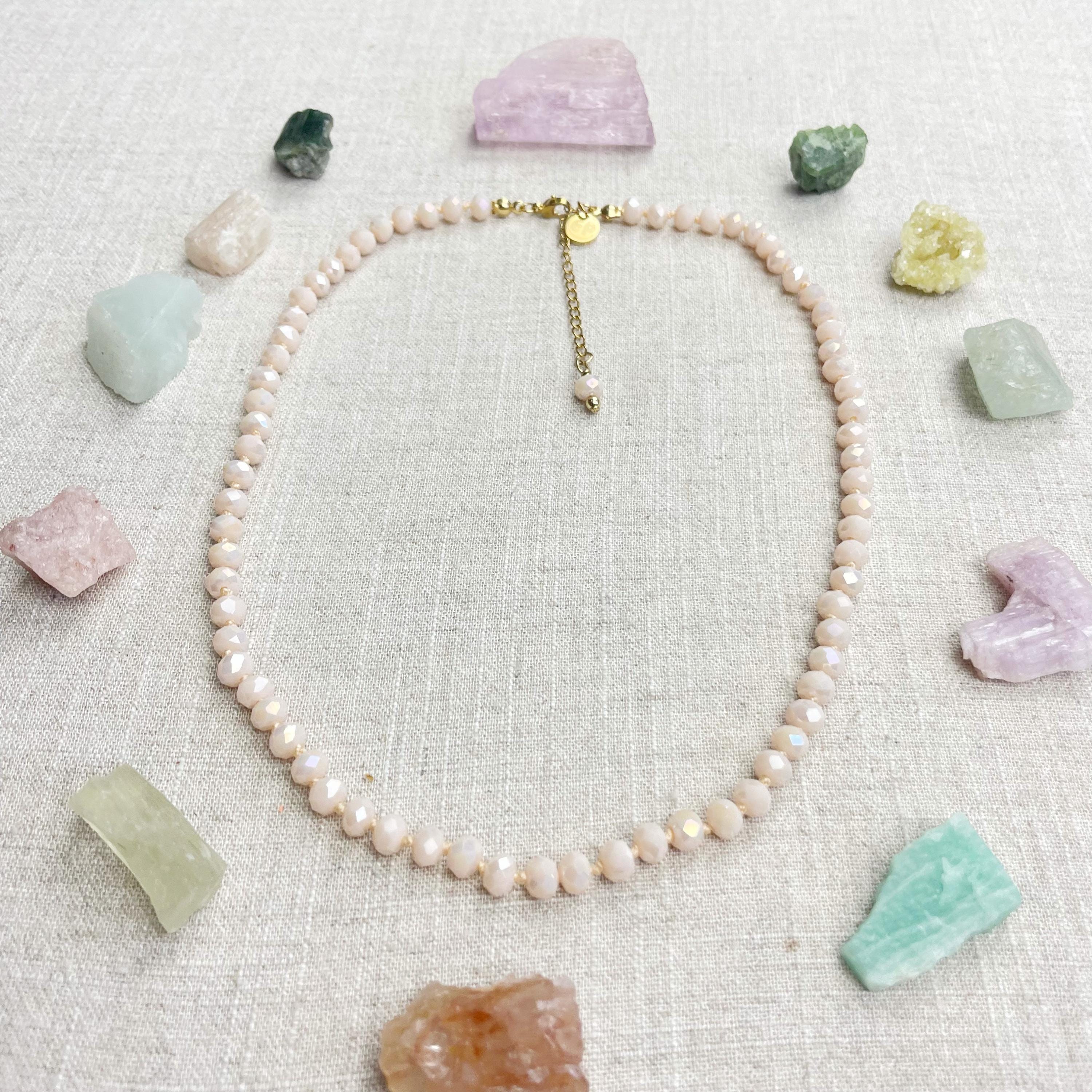 This necklace is made with glass crystal beads which are a cream color with an iridescent shiny coating. The beads are 6mm faceted rondelle beads. Each bead is hand knotted with 100% nylon cord. The hand knotting in between each beads takes time to do but looks gorgeous making the necklace also very easy to wear. The necklace is finished off with a gold plated stainless steel chain, clasp and logo charm.
